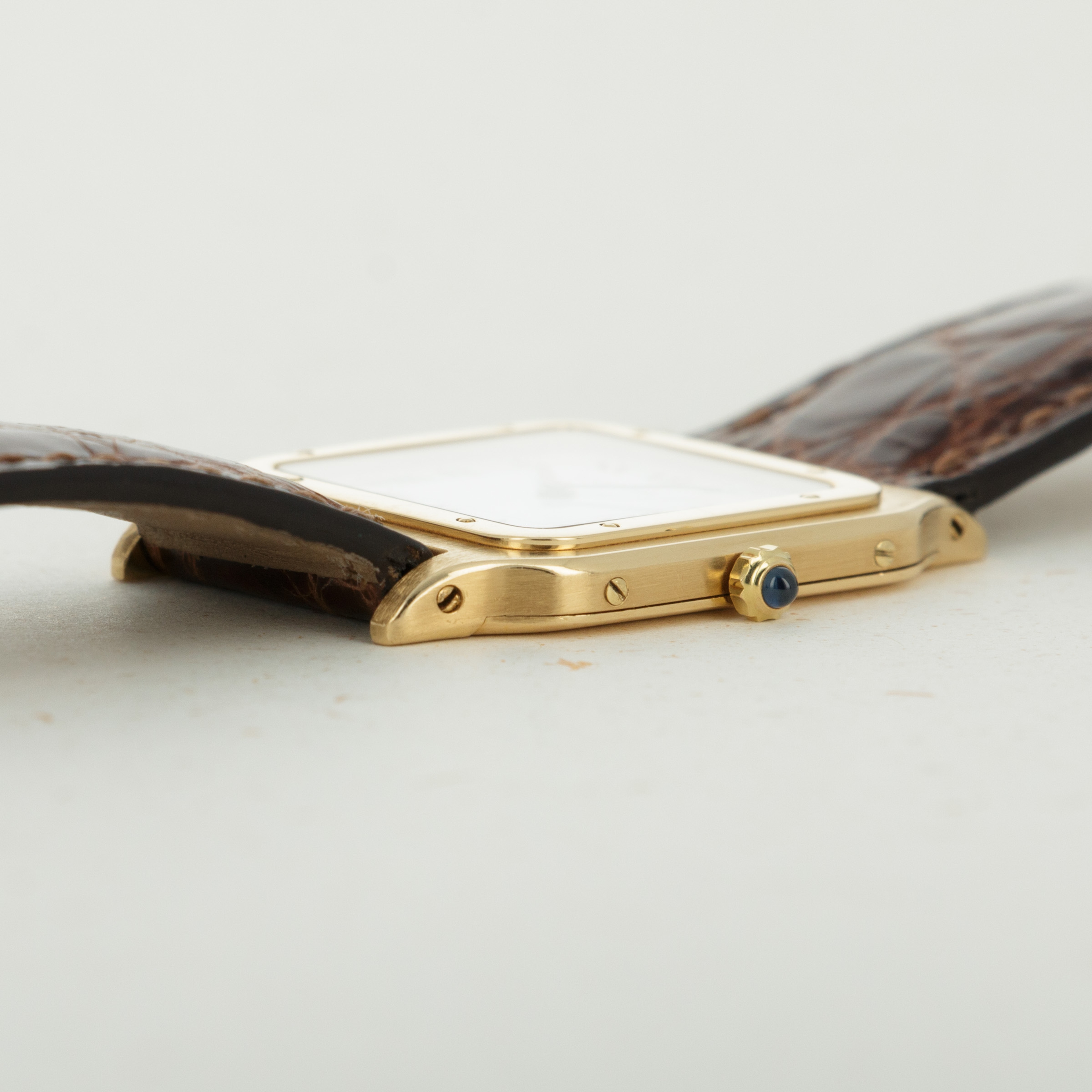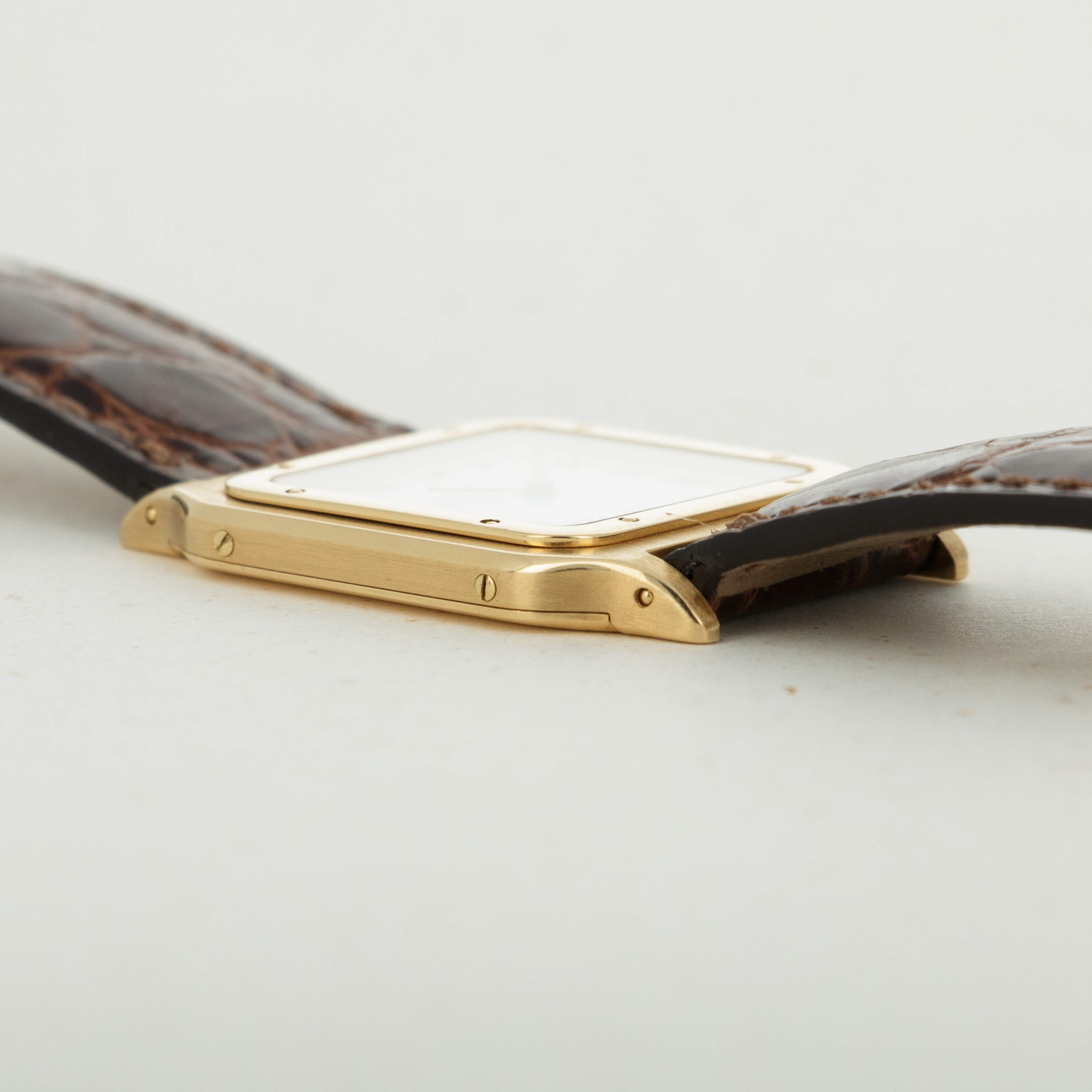 Featuring its iconic square shape, screw-studded bezel, and angular cabochon-capped crown, the Santos Dumont's construction is among the most distinctive in the industry.