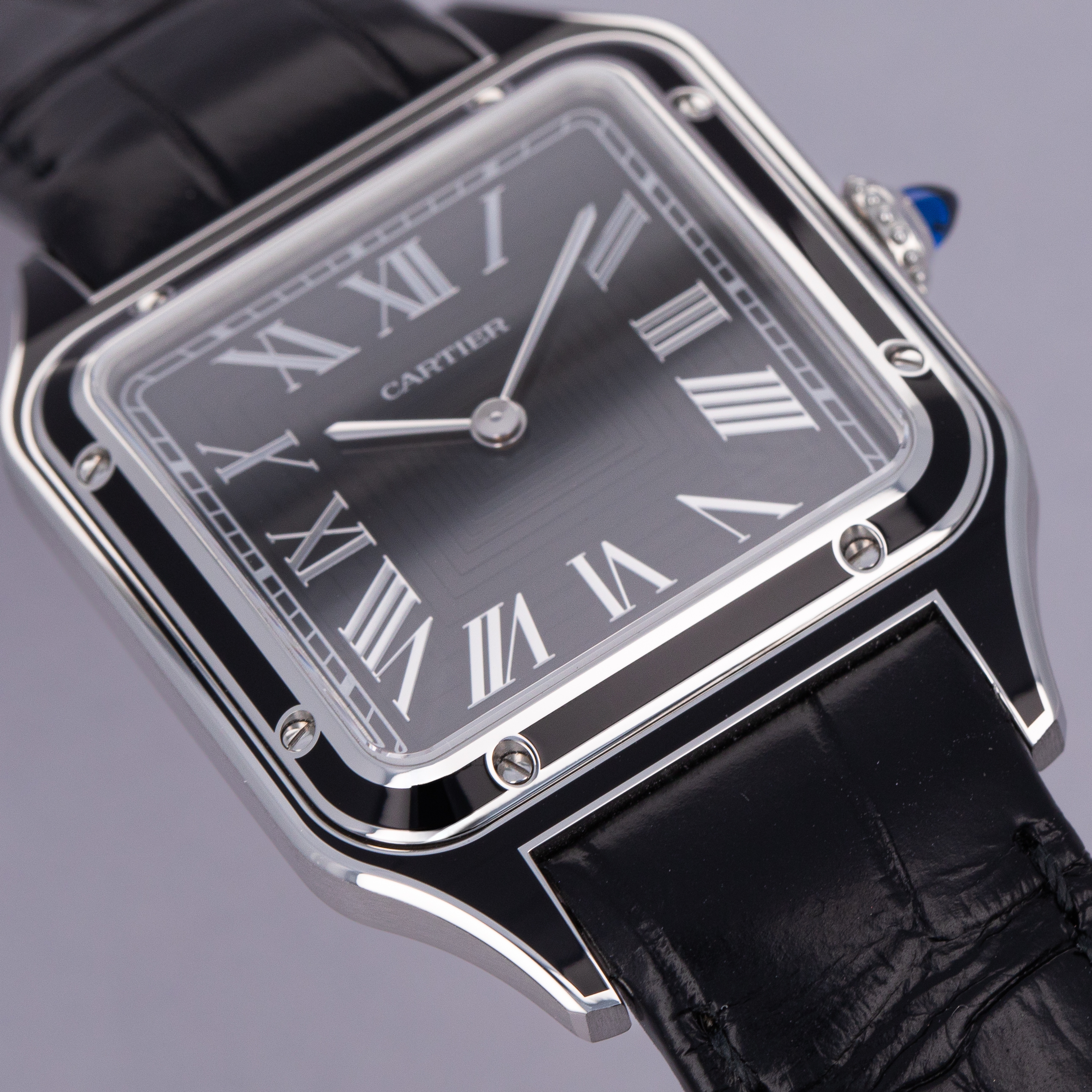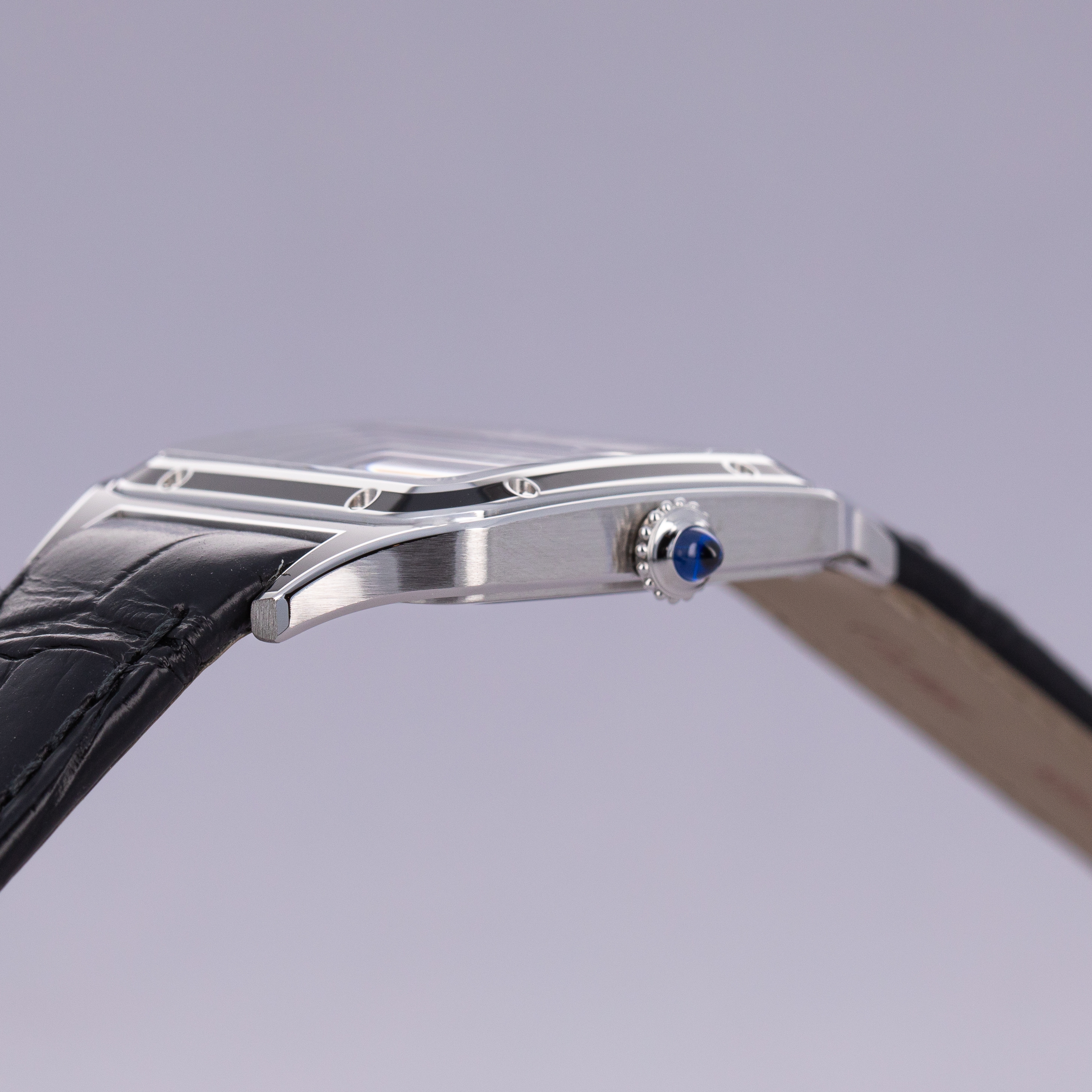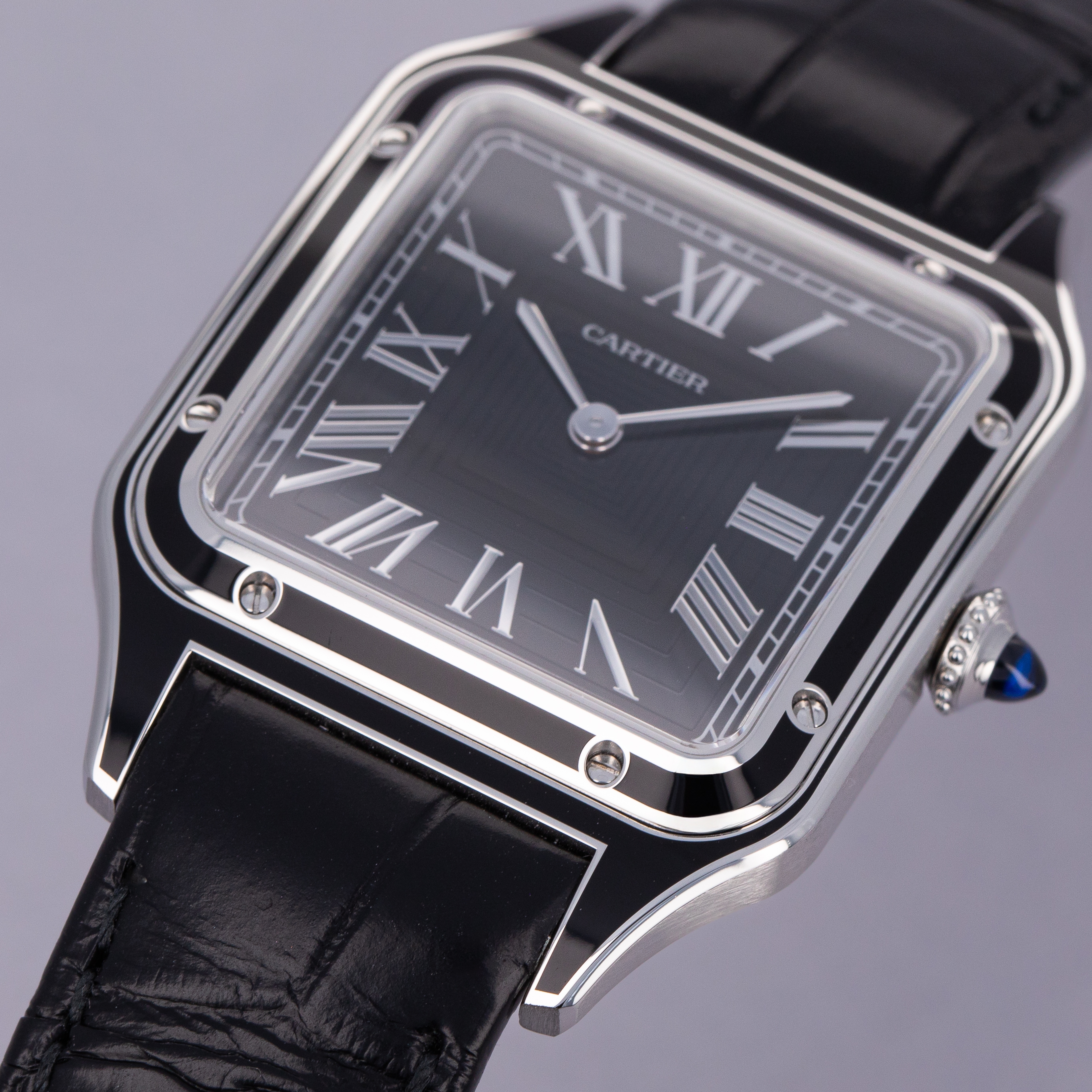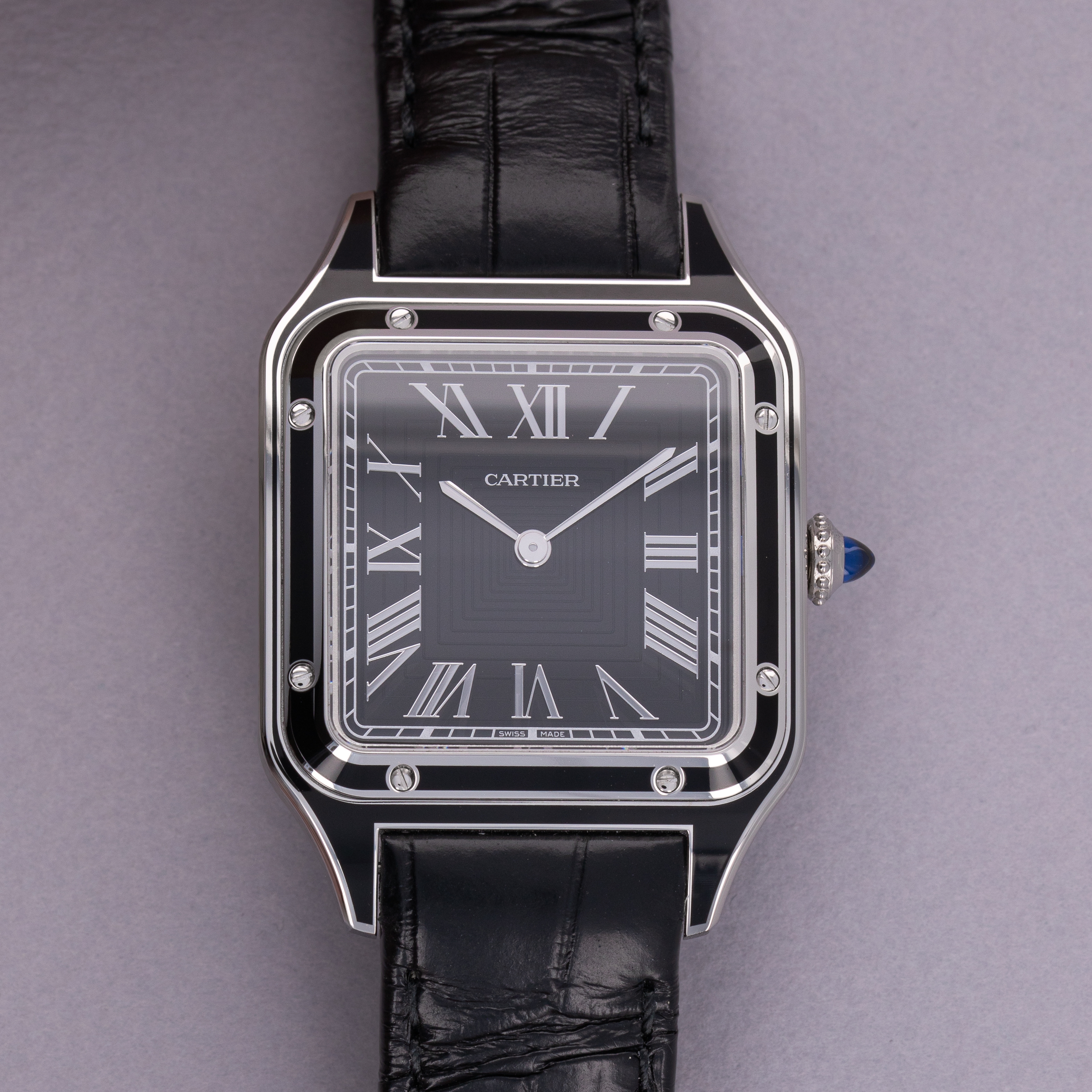 Originally inspired by Brazilian aviator Alberto Santos-Dumont, who requested a watch suitable for piloting his flying machines in 1904, the Cartier Santos collection has a rich history dating back over a century. As one of Cartier's oldest and most significant collections dedicated to men, the Santos-Dumont is a pioneering wristwatch, designed from scratch to be worn on the wrist, not a converted pocket watch like many of its contemporaries. Offered here we have the highly anticipated Cartier Santos Dumont "Lacquered Case" ref. WSSA0046 in stainless steel with a striking black lacquer-filled case. A stunning re-interpretation of the iconic Santos-Dumont unveiled at the Watches & Wonders 2022 event, this reference and two more, one in rose gold and another in platinum set Cartier fans into overdrive. Although not a numbered limited edition model, this stainless steel variant is made in very limited numbers and demand far outstrips supply. This timepiece captivates with its striking aesthetics and impeccable geometry. The lacquer, expertly applied to the engraved bezel and lugs, accentuates the sleek silhouette of the 31.5mm case, perfectly complementing its edges, contours and proportions. Featuring an engraved solid caseback reveals the stylish signature of Alberto Santos-Dumont, filled with color-matching lacquer. Beneath this elegant exterior beats the hand-wound cal. 430MC movement, based on the ultra-thin Piaget Cal. 430P. A masterful balance of contemporary design, respect for brand heritage, and exquisite craftsmanship, this stainless steel and black lacquer configuration ensures exclusivity and makes it a coveted reference for discerning collectors.