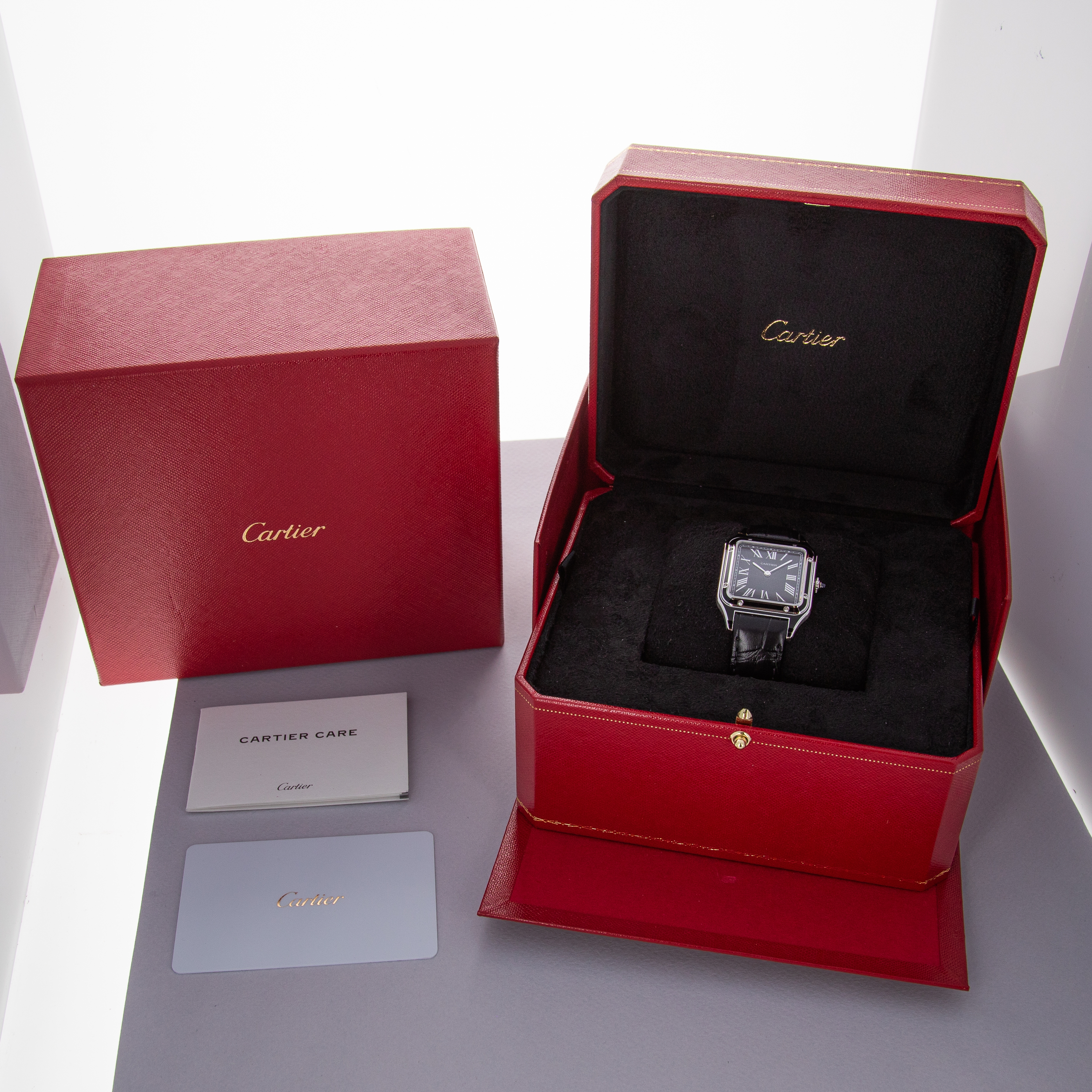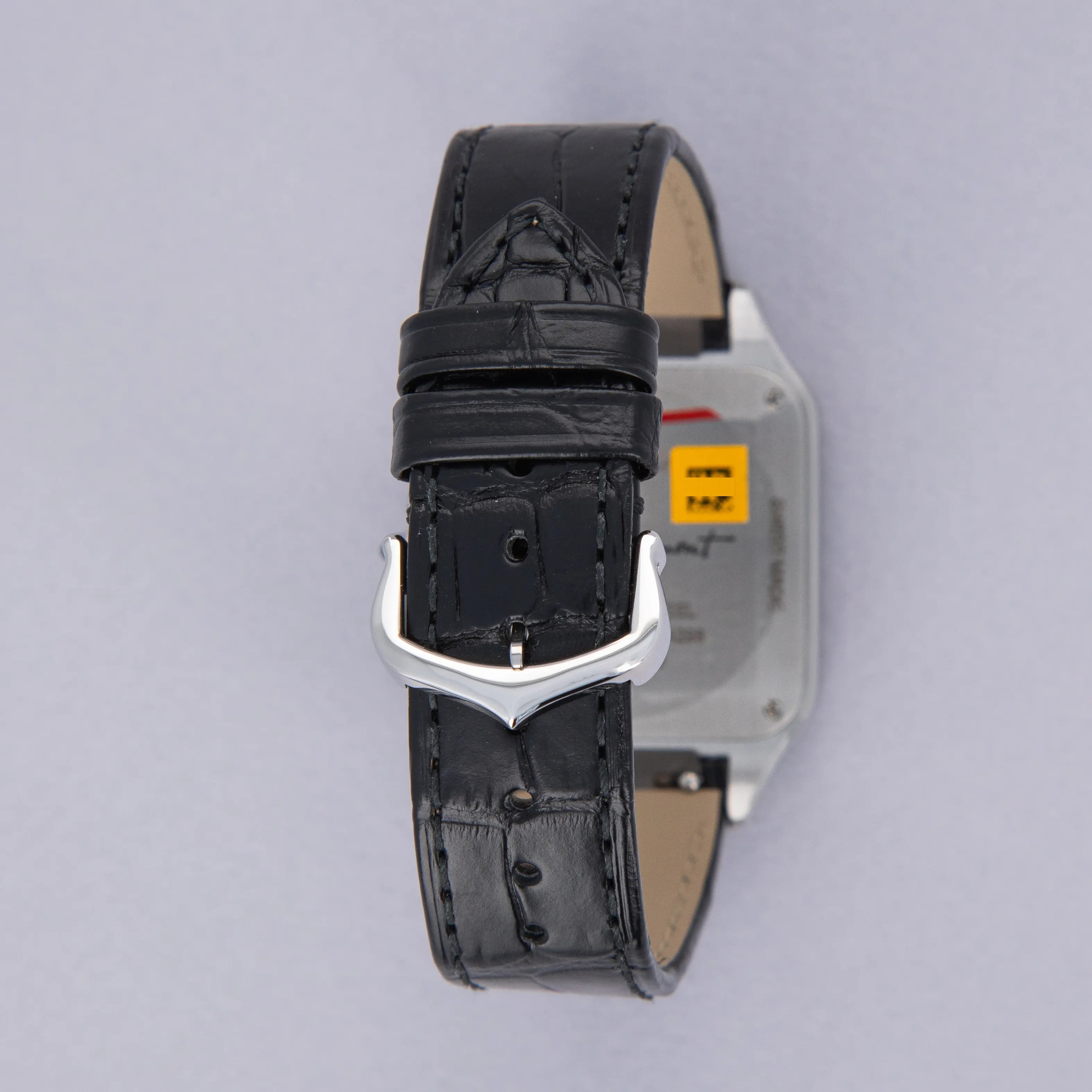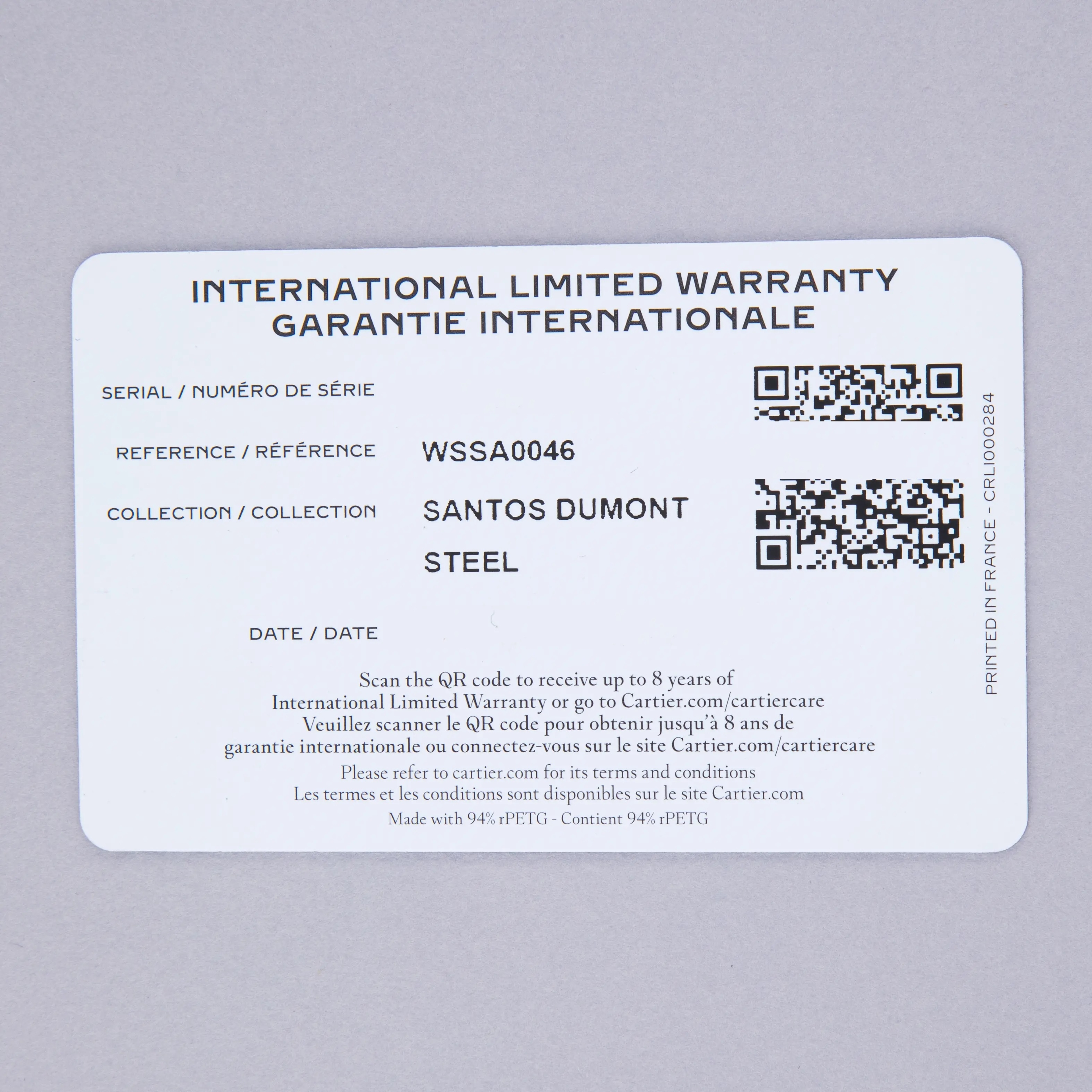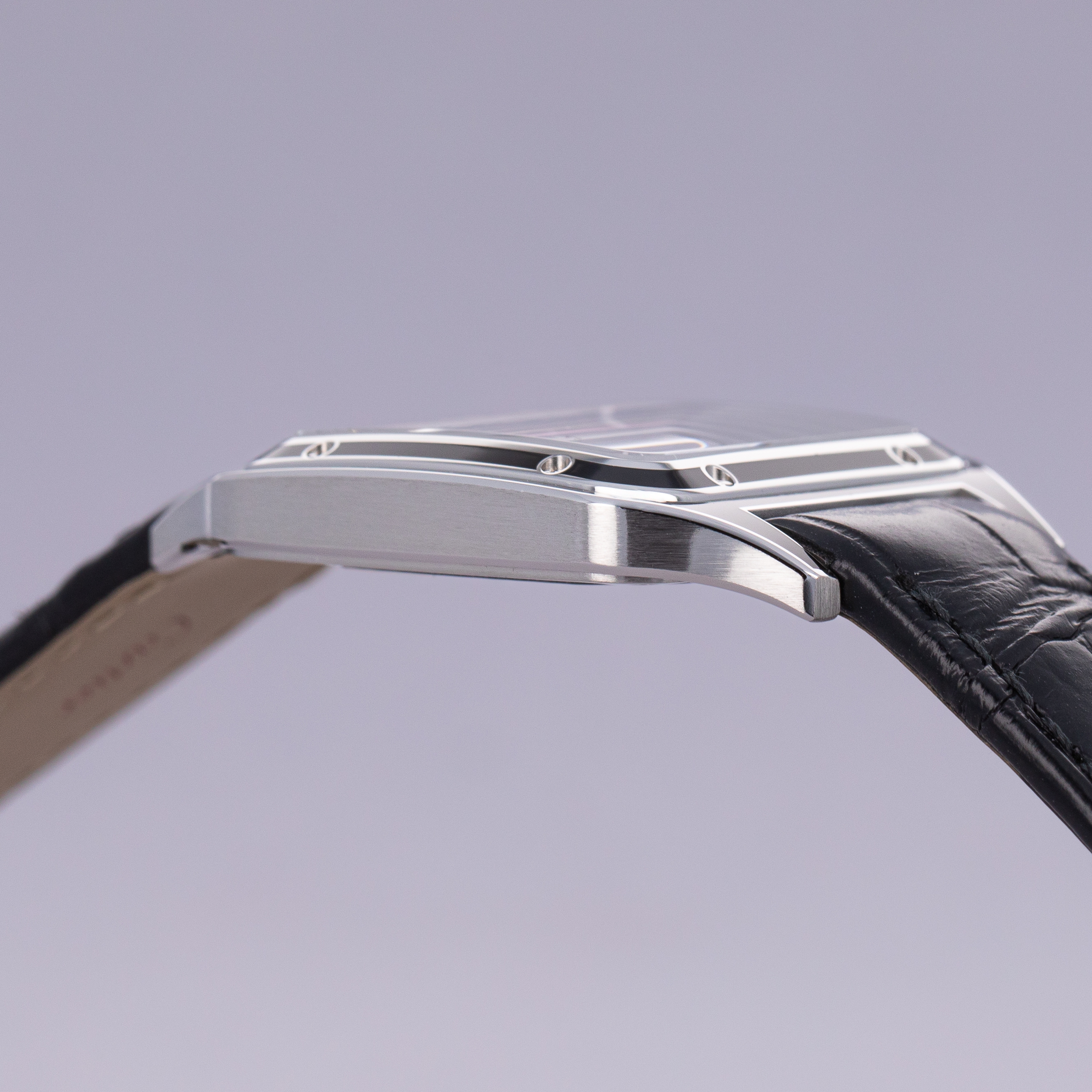 Originally inspired by Brazilian aviator Alberto Santos-Dumont, who requested a watch suitable for piloting his flying machines in 1904, the Cartier Santos collection has a rich history dating back over a century. As one of Cartier's oldest and most significant collections dedicated to men, the Santos-Dumont is a pioneering wristwatch, designed from scratch to be worn on the wrist, not a converted pocket watch like many of its contemporaries. Offered here we have the highly anticipated Cartier Santos Dumont "Lacquered Case" ref. WSSA0046 in stainless steel with a striking black lacquer-filled case. A stunning re-interpretation of the iconic Santos-Dumont unveiled at the Watches & Wonders 2022 event, this reference and two more, one in rose gold and another in platinum set Cartier fans into overdrive. Although not a numbered limited edition model, this stainless steel variant is made in very limited numbers and demand far outstrips supply. This timepiece captivates with its striking aesthetics and impeccable geometry. The lacquer, expertly applied to the engraved bezel and lugs, accentuates the sleek silhouette of the 31.5mm case, perfectly complementing its edges, contours and proportions. Featuring an engraved solid caseback reveals the stylish signature of Alberto Santos-Dumont, filled with color-matching lacquer. Beneath this elegant exterior beats the hand-wound cal. 430MC movement, based on the ultra-thin Piaget Cal. 430P. A masterful balance of contemporary design, respect for brand heritage, and exquisite craftsmanship, this stainless steel and black lacquer configuration ensures exclusivity and makes it a coveted reference for discerning collectors.