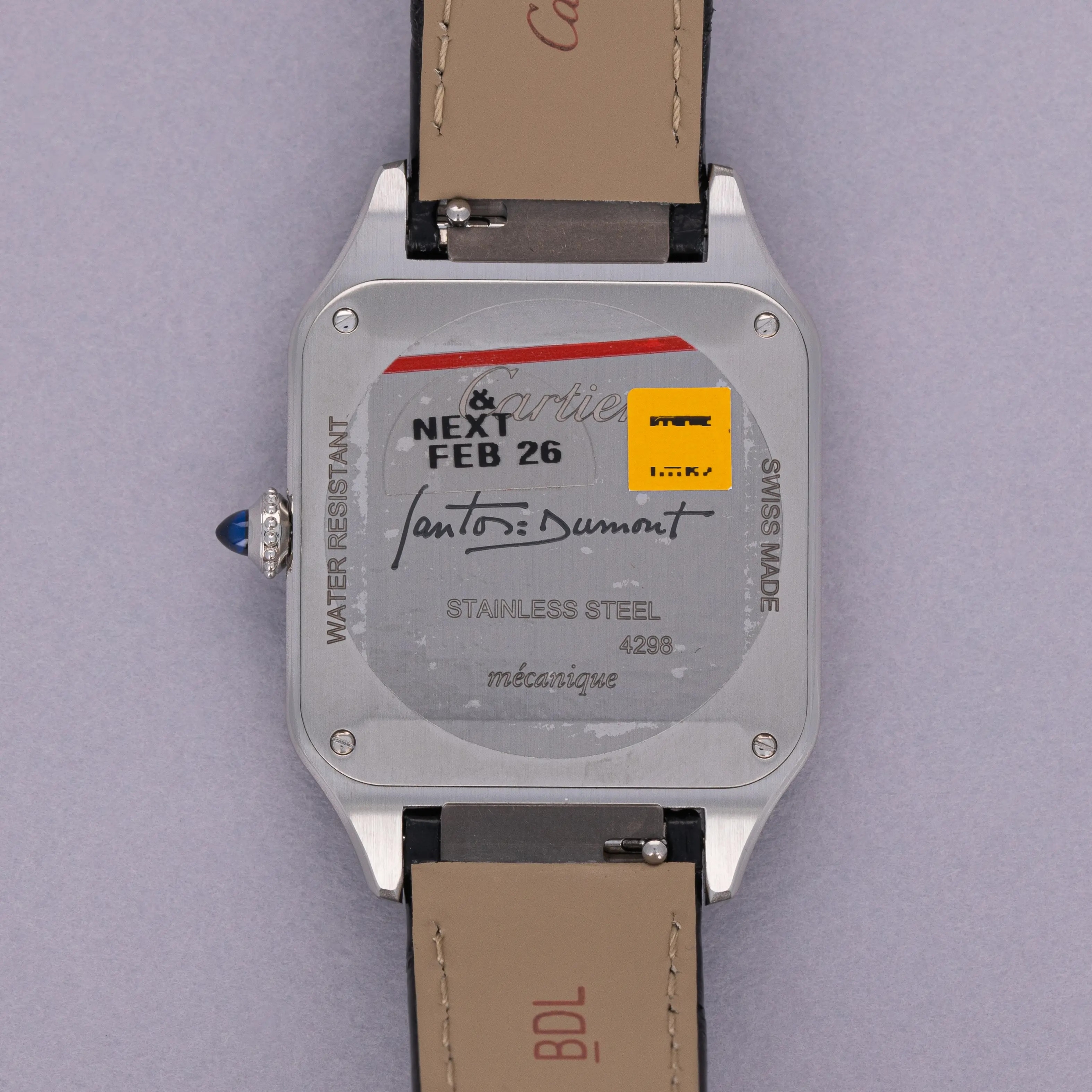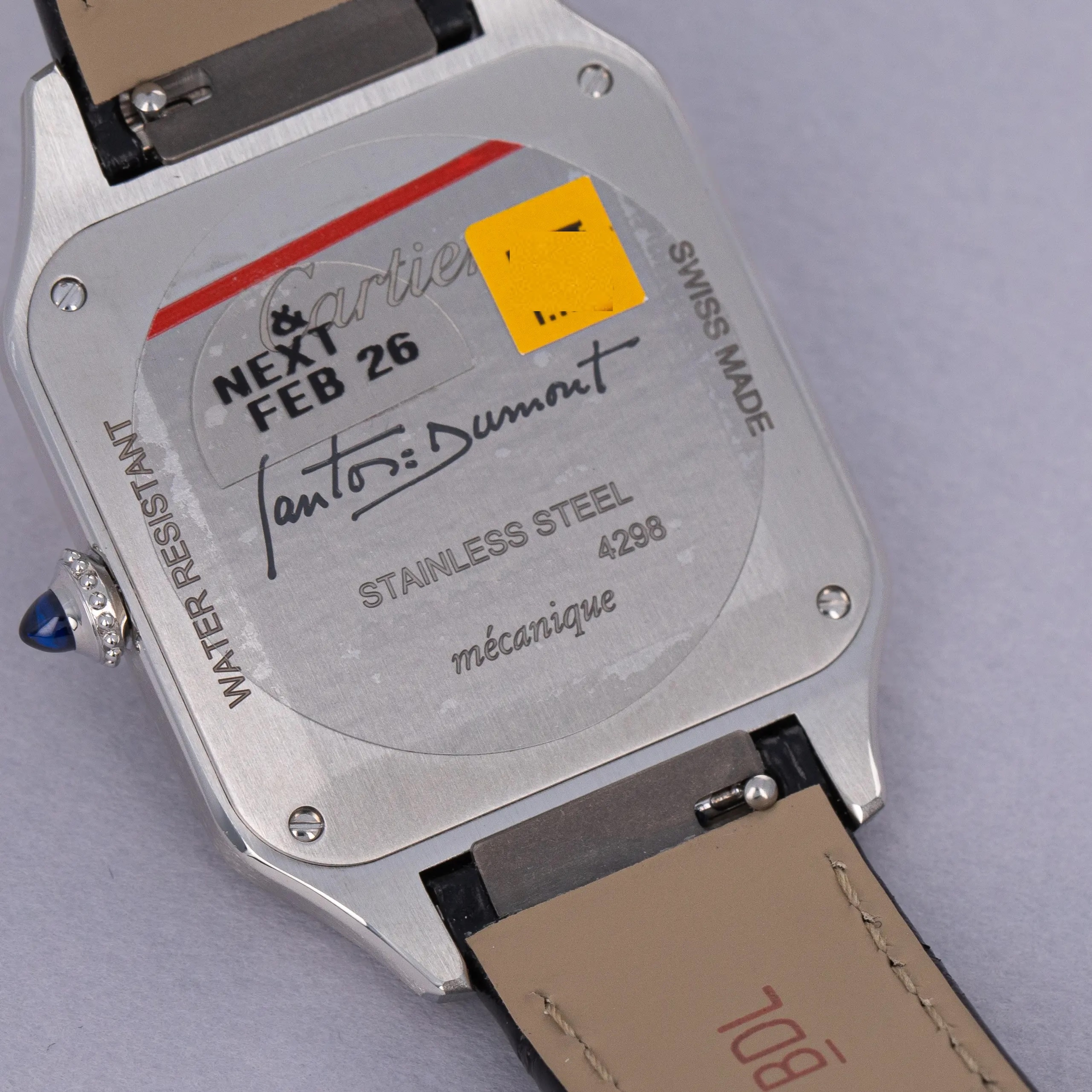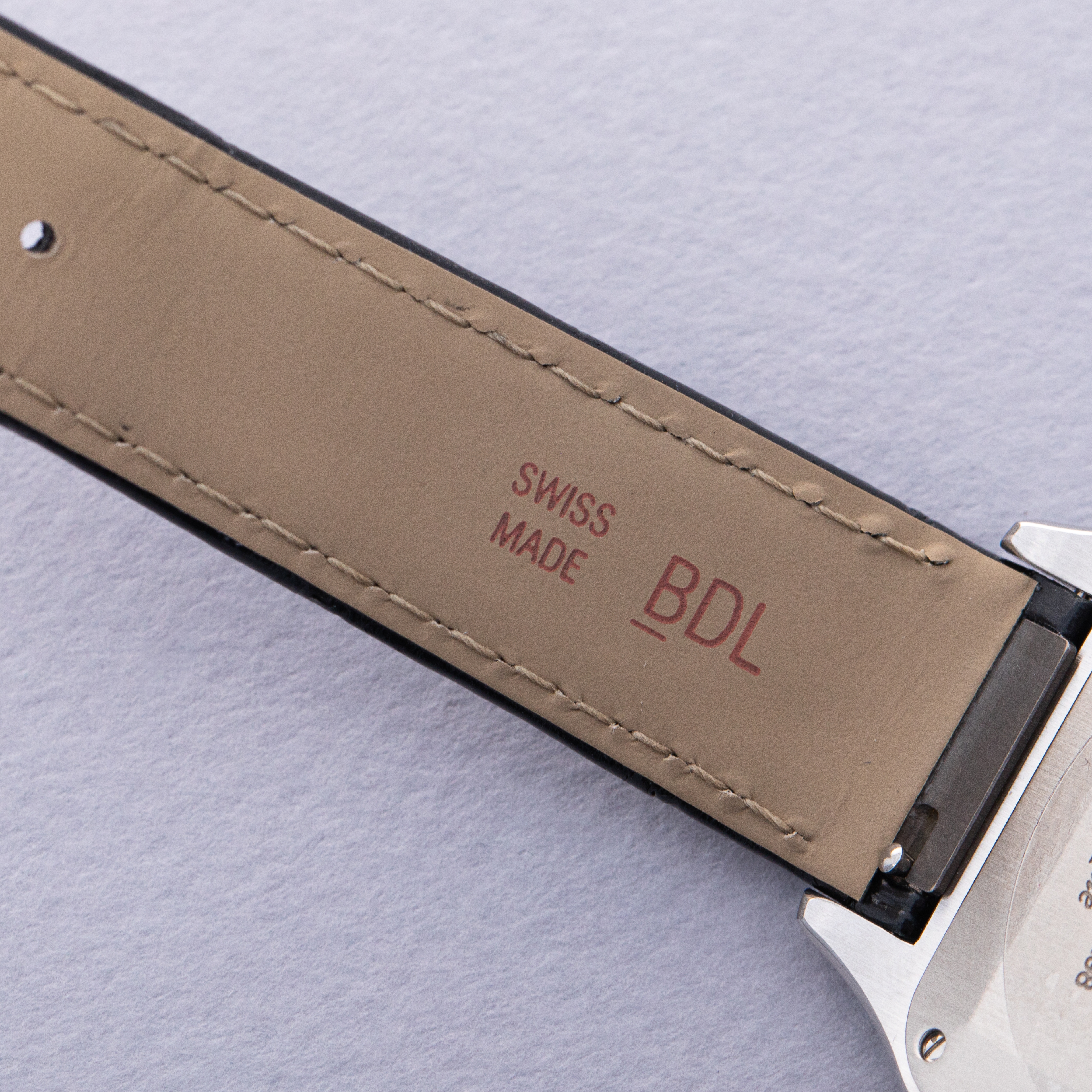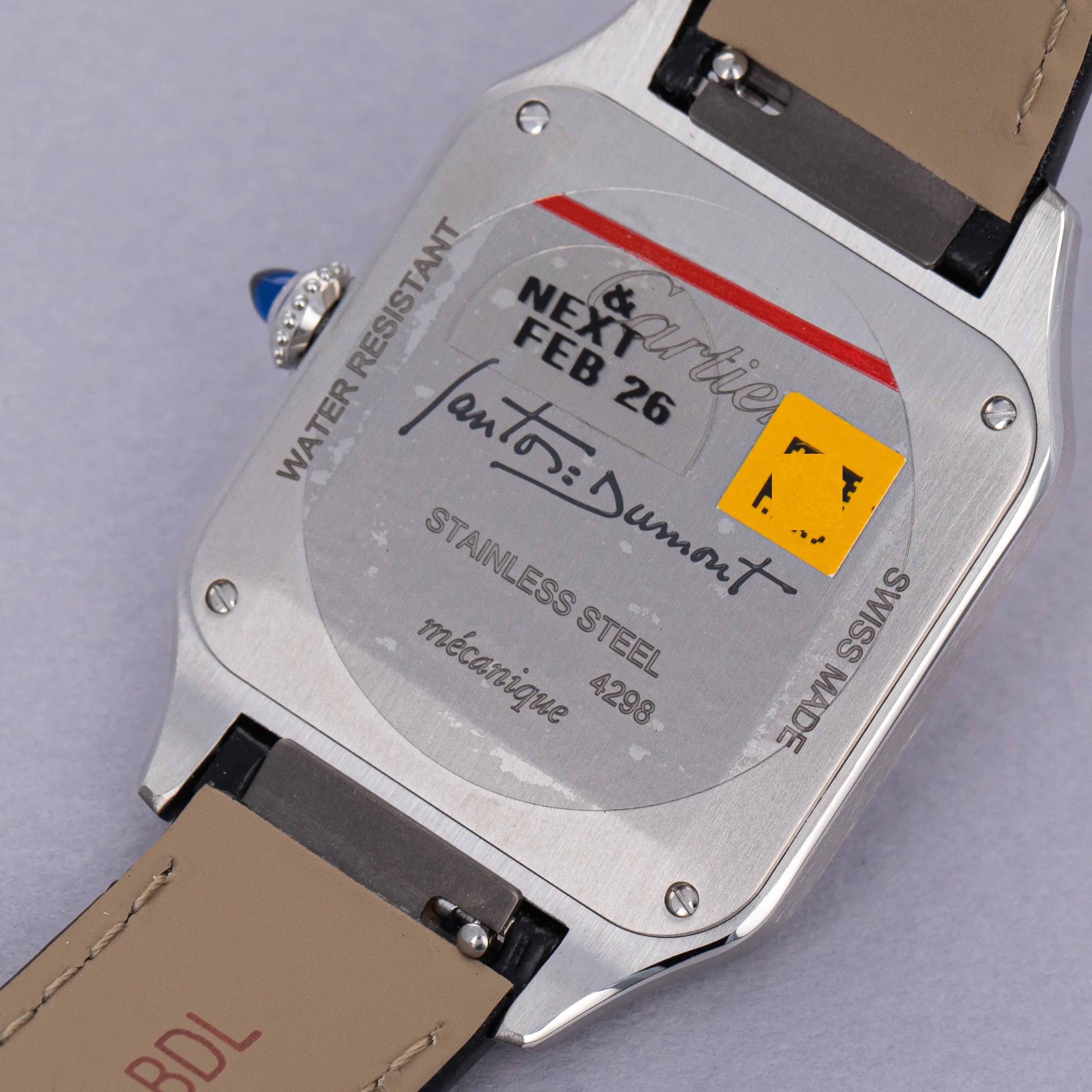 Originally inspired by Brazilian aviator Alberto Santos-Dumont, who requested a watch suitable for piloting his flying machines in 1904, the Cartier Santos collection has a rich history dating back over a century. As one of Cartier's oldest and most significant collections dedicated to men, the Santos-Dumont is a pioneering wristwatch, designed from scratch to be worn on the wrist, not a converted pocket watch like many of its contemporaries. Offered here we have the highly anticipated Cartier Santos Dumont "Lacquered Case" ref. WSSA0046 in stainless steel with a striking black lacquer-filled case. A stunning re-interpretation of the iconic Santos-Dumont unveiled at the Watches & Wonders 2022 event, this reference and two more, one in rose gold and another in platinum set Cartier fans into overdrive. Although not a numbered limited edition model, this stainless steel variant is made in very limited numbers and demand far outstrips supply. This timepiece captivates with its striking aesthetics and impeccable geometry. The lacquer, expertly applied to the engraved bezel and lugs, accentuates the sleek silhouette of the 31.5mm case, perfectly complementing its edges, contours and proportions. Featuring an engraved solid caseback reveals the stylish signature of Alberto Santos-Dumont, filled with color-matching lacquer. Beneath this elegant exterior beats the hand-wound cal. 430MC movement, based on the ultra-thin Piaget Cal. 430P. A masterful balance of contemporary design, respect for brand heritage, and exquisite craftsmanship, this stainless steel and black lacquer configuration ensures exclusivity and makes it a coveted reference for discerning collectors.