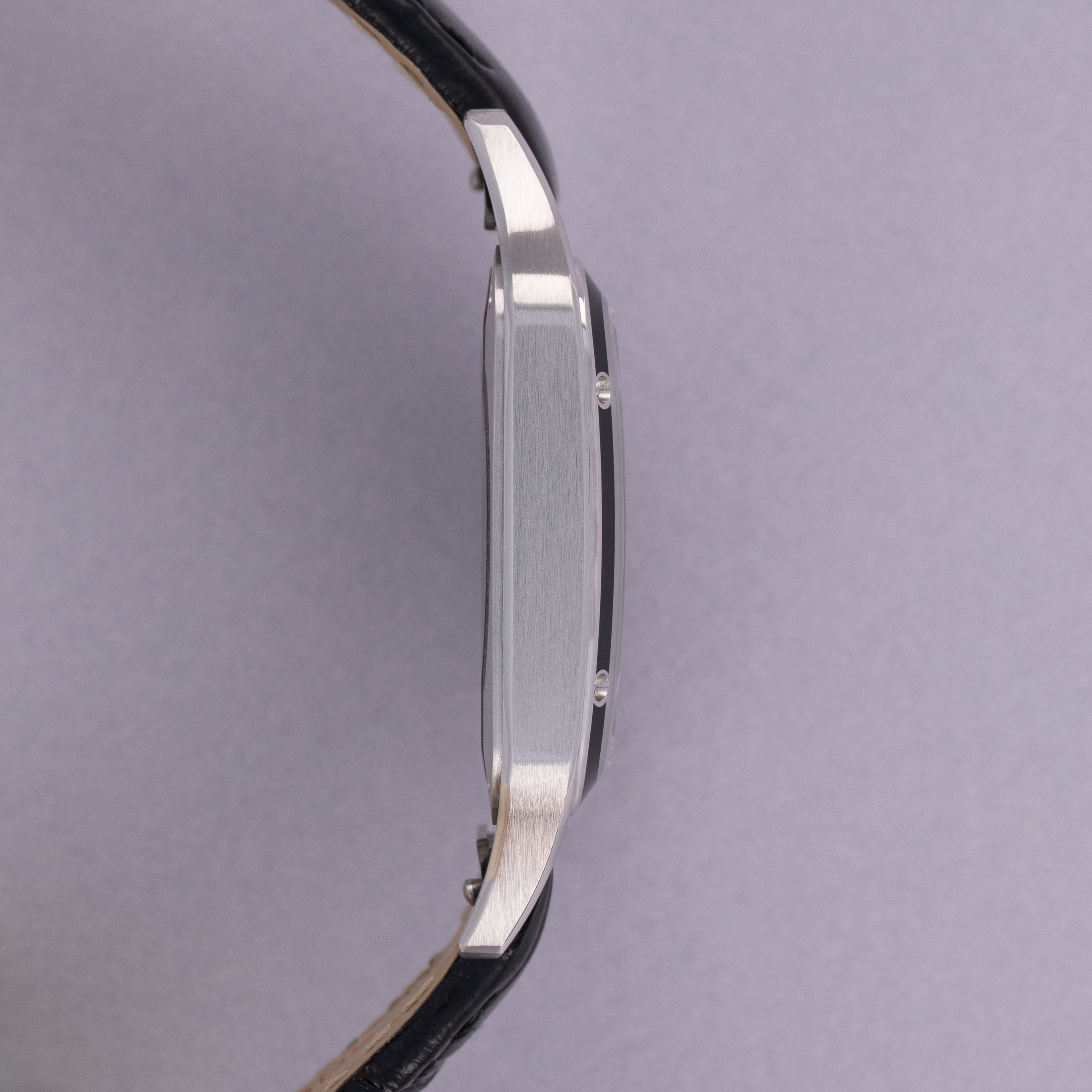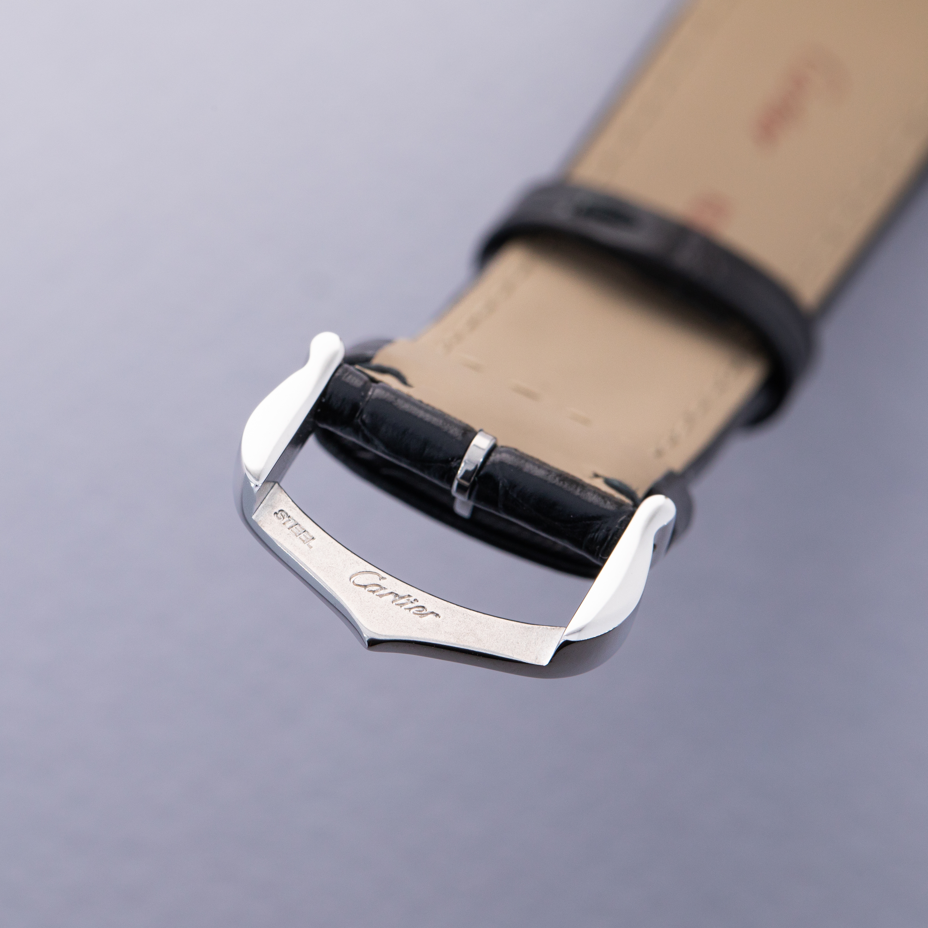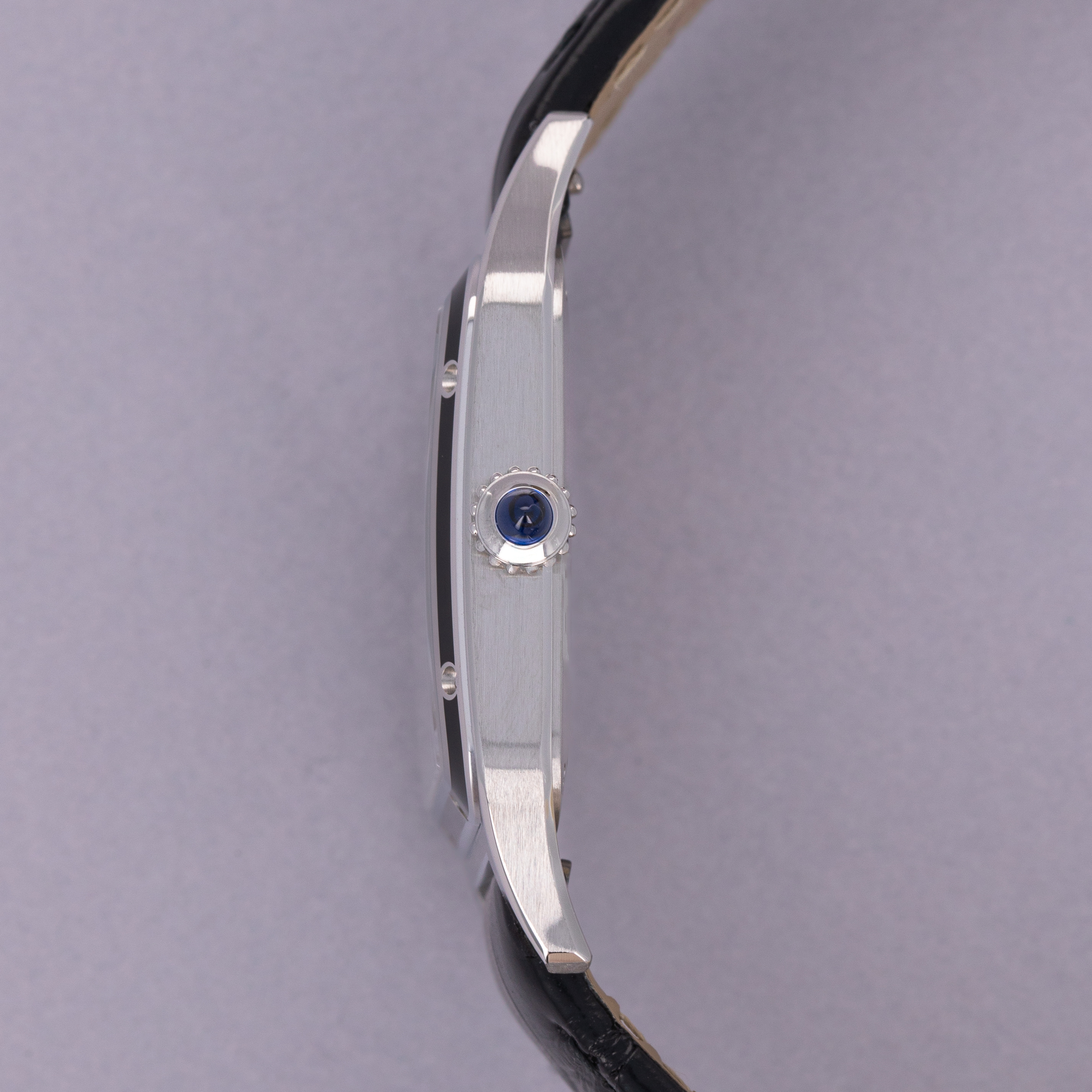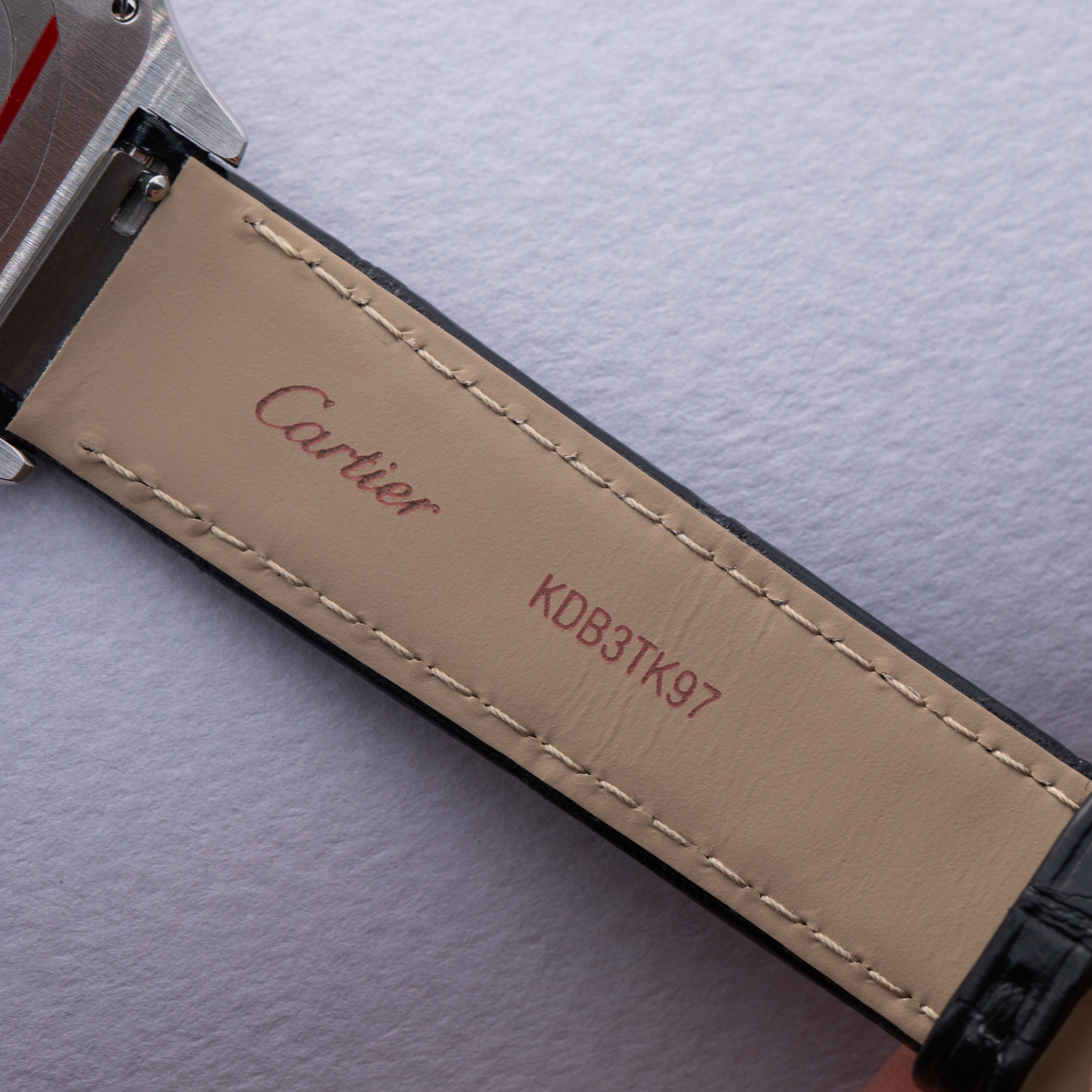 Originally inspired by Brazilian aviator Alberto Santos-Dumont, who requested a watch suitable for piloting his flying machines in 1904, the Cartier Santos collection has a rich history dating back over a century. As one of Cartier's oldest and most significant collections dedicated to men, the Santos-Dumont is a pioneering wristwatch, designed from scratch to be worn on the wrist, not a converted pocket watch like many of its contemporaries. Offered here we have the highly anticipated Cartier Santos Dumont "Lacquered Case" ref. WSSA0046 in stainless steel with a striking black lacquer-filled case. A stunning re-interpretation of the iconic Santos-Dumont unveiled at the Watches & Wonders 2022 event, this reference and two more, one in rose gold and another in platinum set Cartier fans into overdrive. Although not a numbered limited edition model, this stainless steel variant is made in very limited numbers and demand far outstrips supply. This timepiece captivates with its striking aesthetics and impeccable geometry. The lacquer, expertly applied to the engraved bezel and lugs, accentuates the sleek silhouette of the 31.5mm case, perfectly complementing its edges, contours and proportions. Featuring an engraved solid caseback reveals the stylish signature of Alberto Santos-Dumont, filled with color-matching lacquer. Beneath this elegant exterior beats the hand-wound cal. 430MC movement, based on the ultra-thin Piaget Cal. 430P. A masterful balance of contemporary design, respect for brand heritage, and exquisite craftsmanship, this stainless steel and black lacquer configuration ensures exclusivity and makes it a coveted reference for discerning collectors.