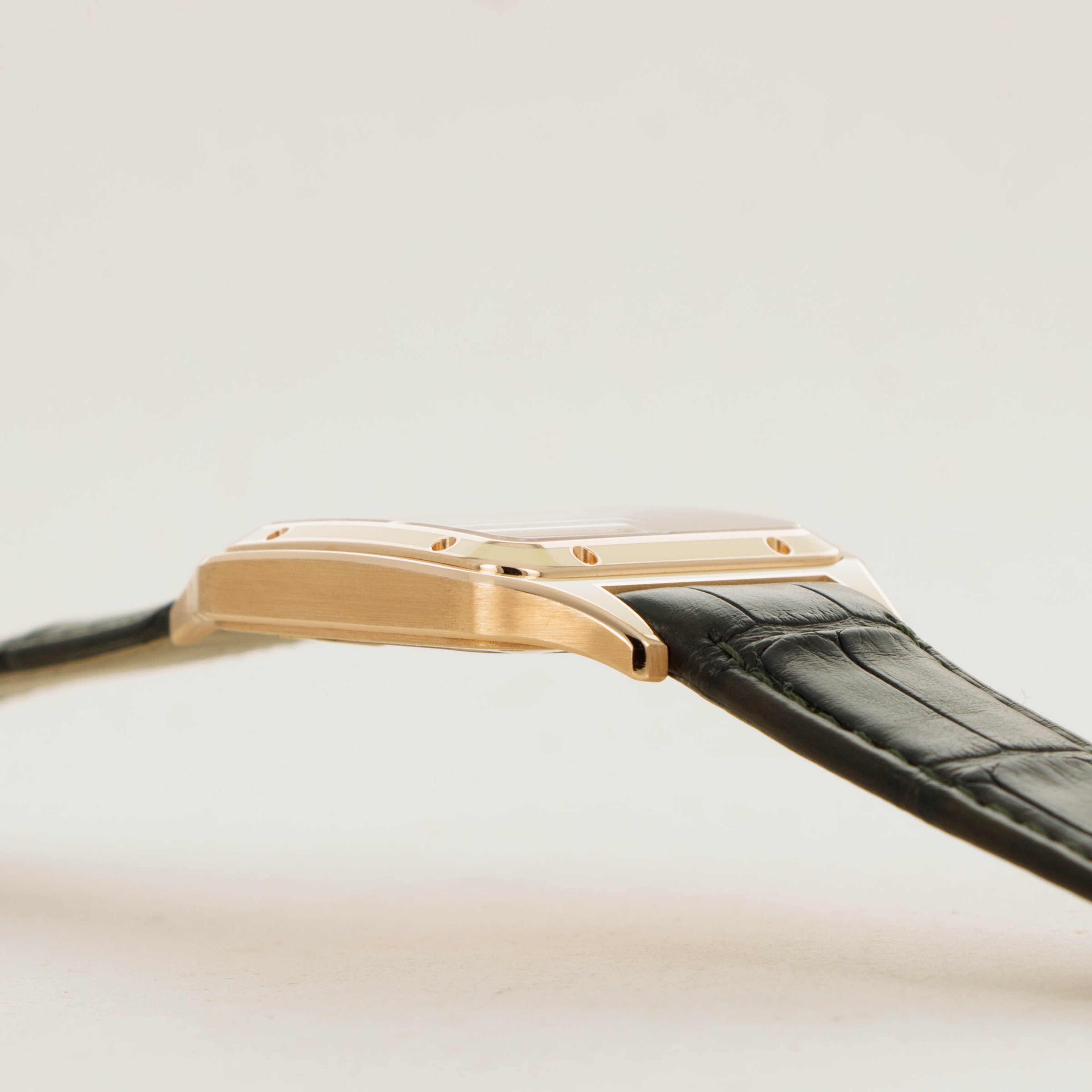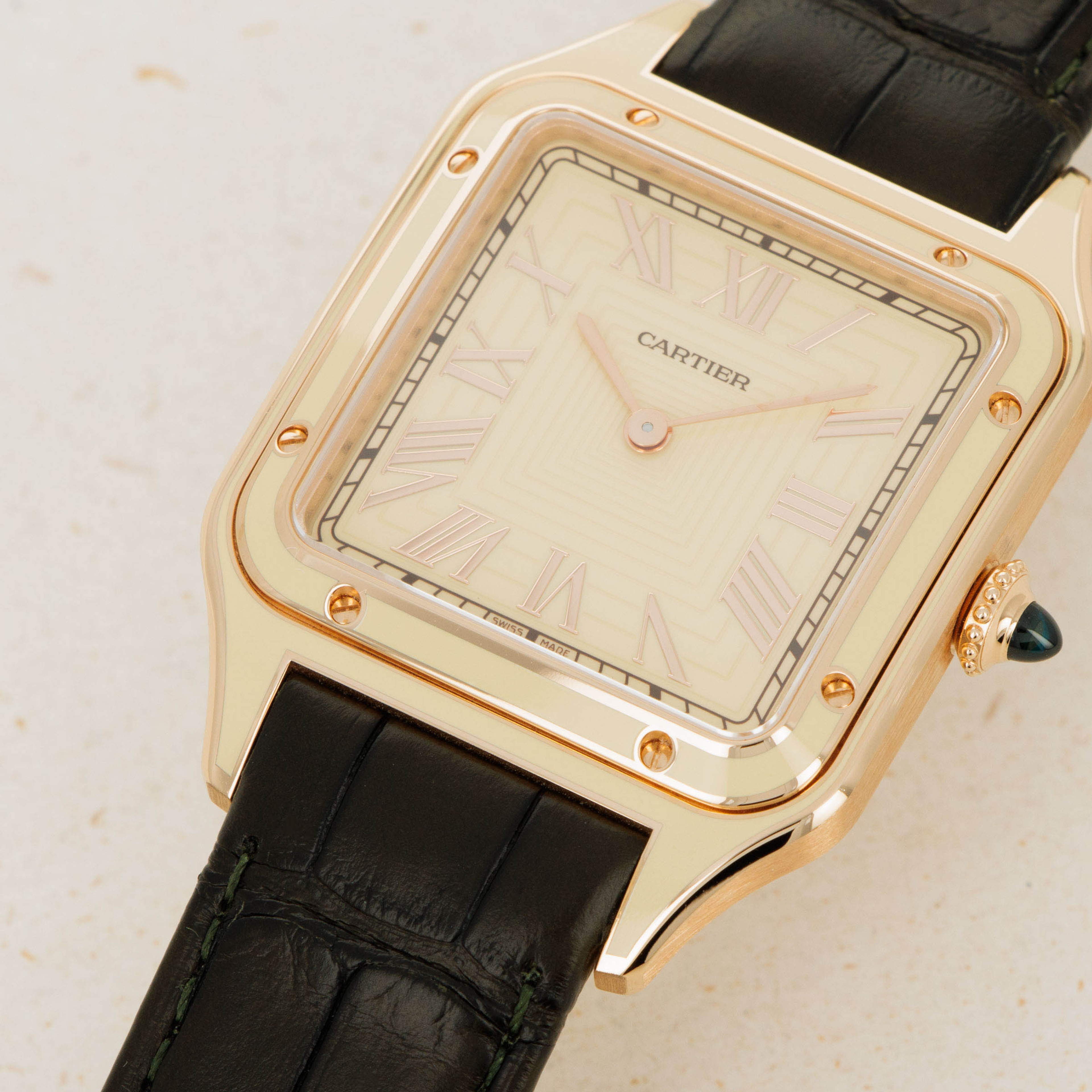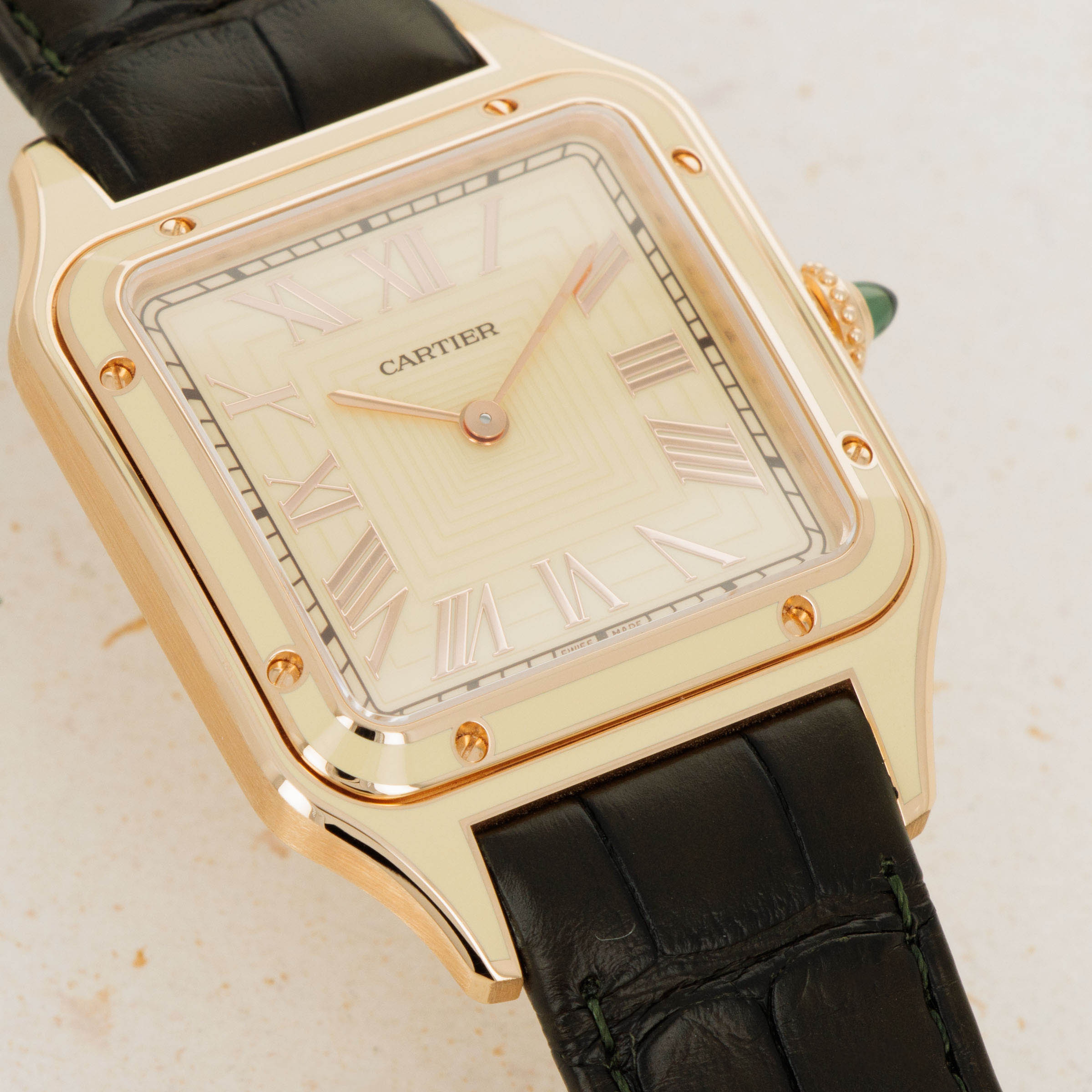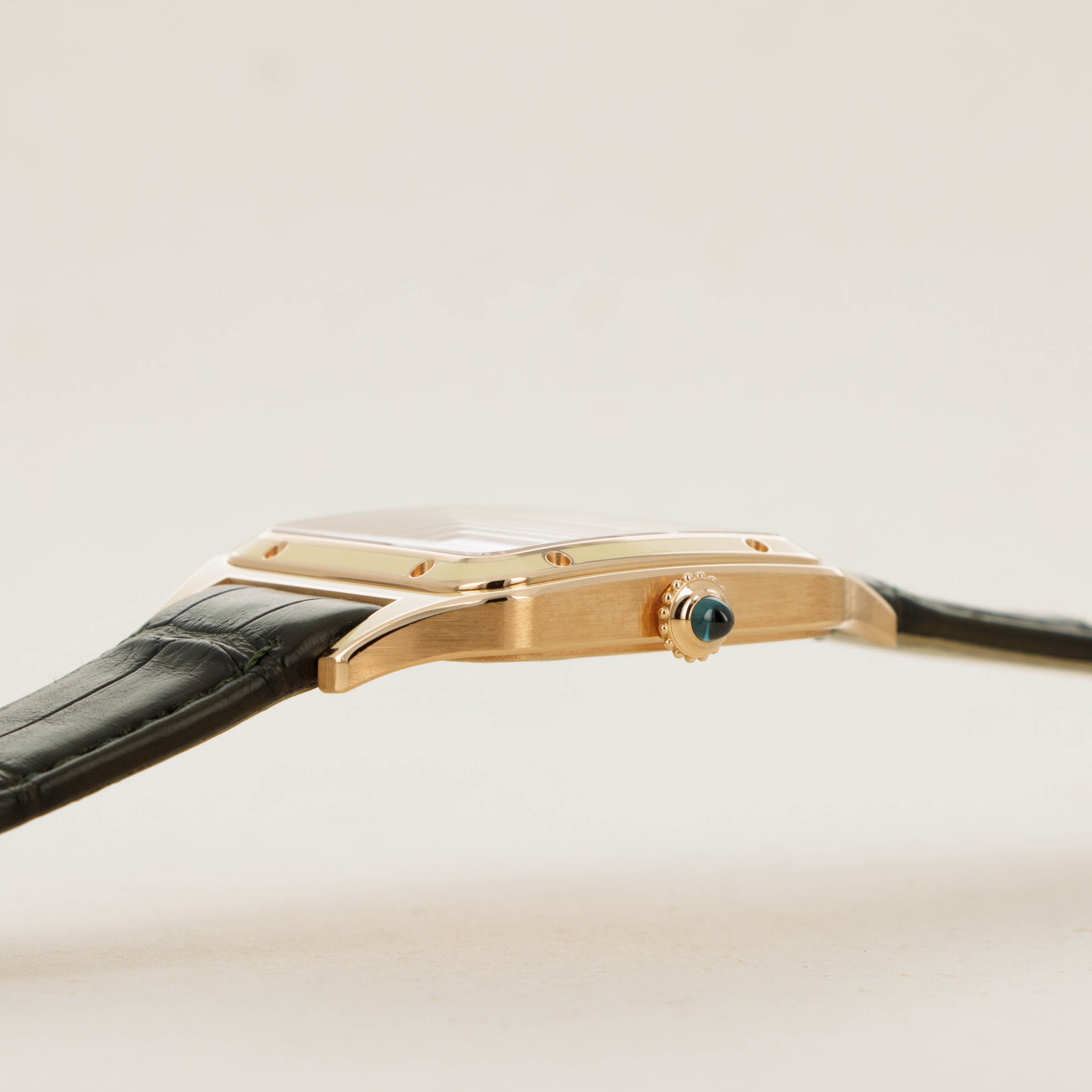 Originally inspired by Brazilian aviator Alberto Santos-Dumont, who requested a watch suitable for piloting his flying machines in 1904, the Cartier Santos collection has a rich history dating back over a century. As one of Cartier's oldest and most significant collections dedicated to men, the Santos-Dumont is a pioneering wristwatch, designed from scratch to be worn on the wrist, not a converted pocket watch like many of its contemporaries. Offered here we have the highly anticipated Cartier Santos Dumont "Lacquered Case" ref. CRWGS0054 in 18kt rose gold with a striking cream lacquer-filled case. A stunning re-interpretation of the iconic Santos-Dumont unveiled at the Watches & Wonders 2022 event, this reference and two more, one in platinum and another in steel set Cartier fans into overdrive. Limited to just 250 pieces and crafted in 18kt rose gold and adorned with alluring creamy beige lacquer, this timepiece captivates with its striking aesthetics and impeccable geometry. The lacquer, expertly applied to the engraved bezel and lugs, accentuates the sleek silhouette of the 31.5mm case, perfectly complementing its edges, contours and proportions. Featuring an engraved solid caseback reveals the stylish signature of Alberto Santos-Dumont, filled with color-matching lacquer. Beneath this elegant exterior beats the hand-wound cal. 430MC movement, based on the ultra-thin Piaget Cal. 430P. A masterful balance of contemporary design, respect for brand heritage, and exquisite craftsmanship, this rose gold and beige lacquer configuration ensures exclusivity and makes it a coveted reference for discerning collectors.