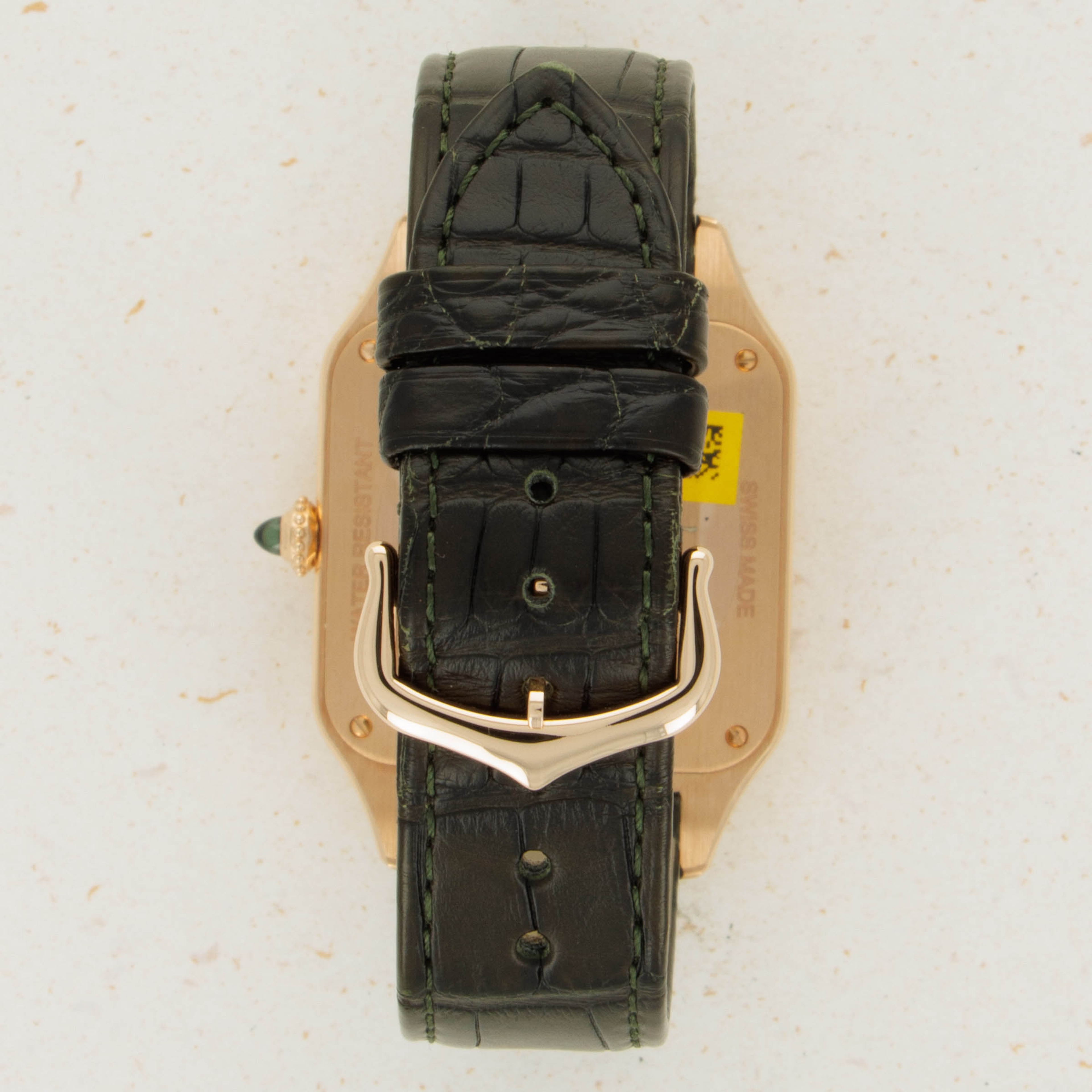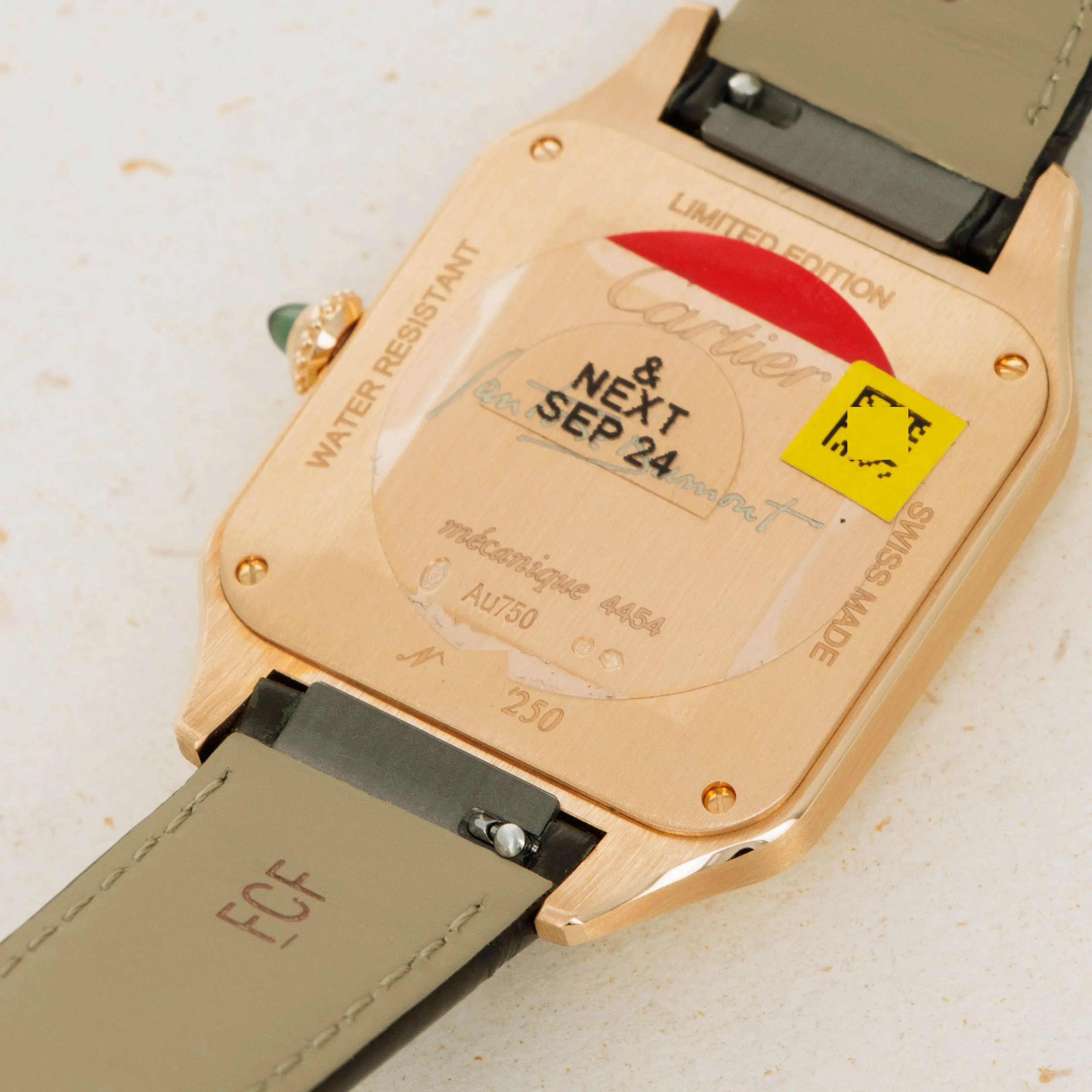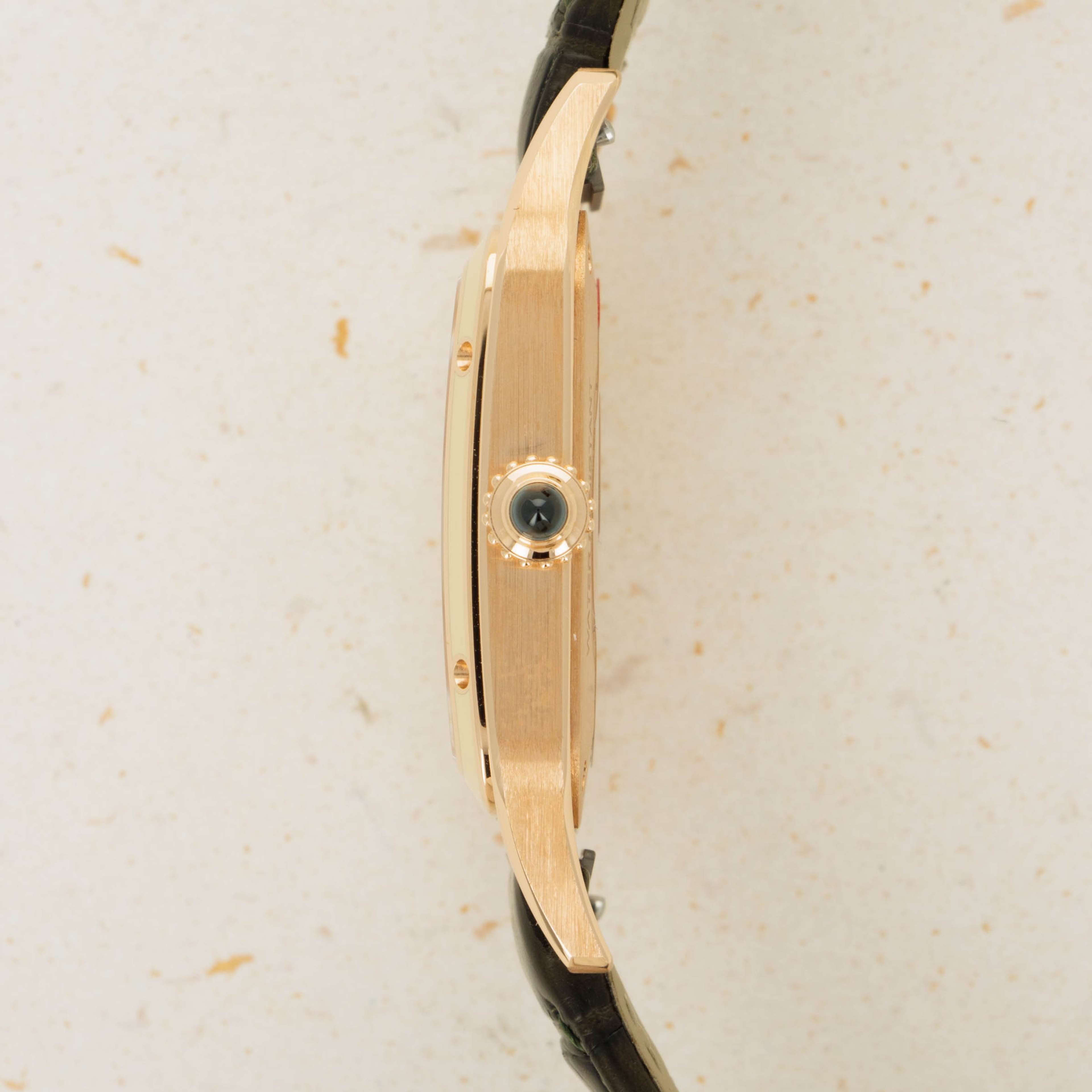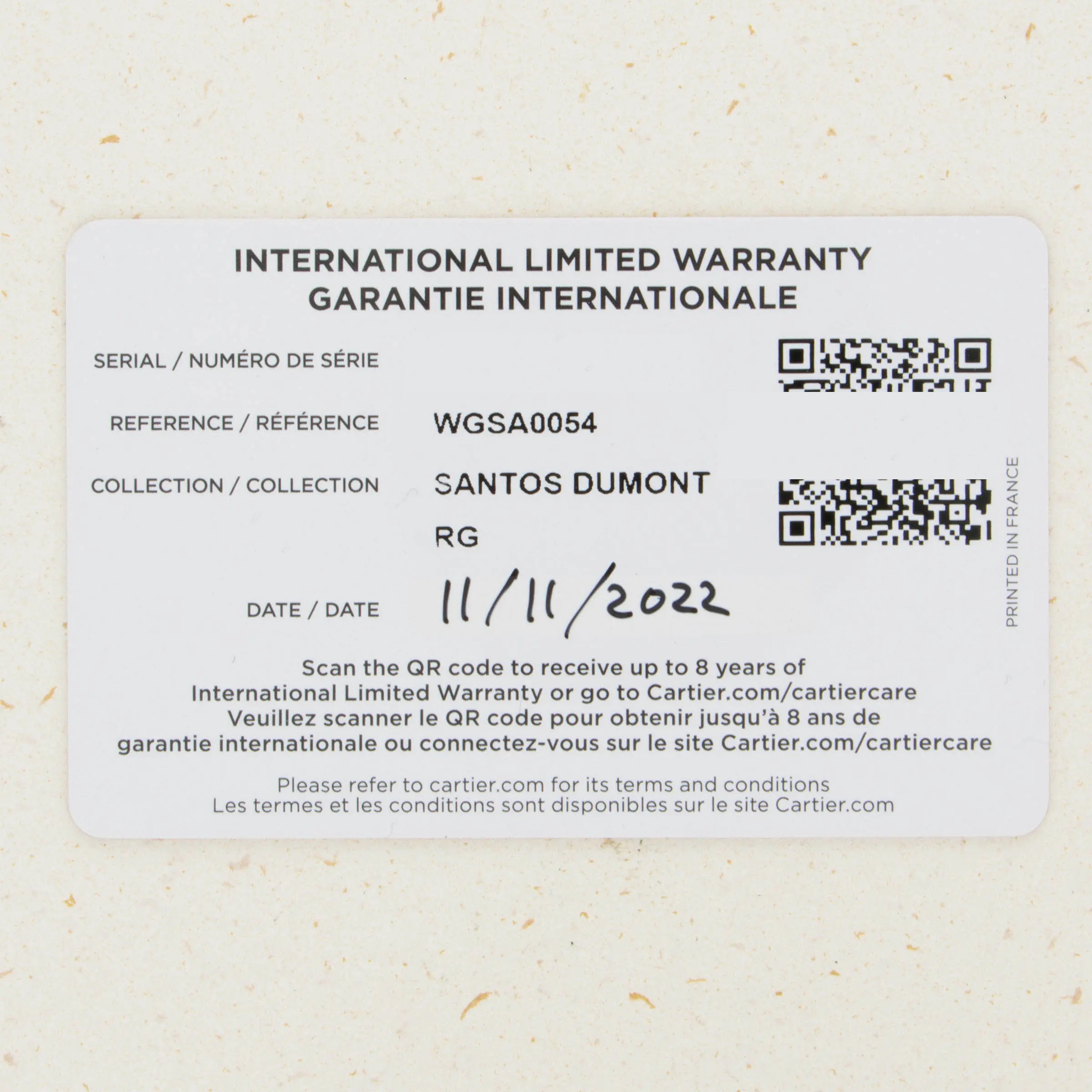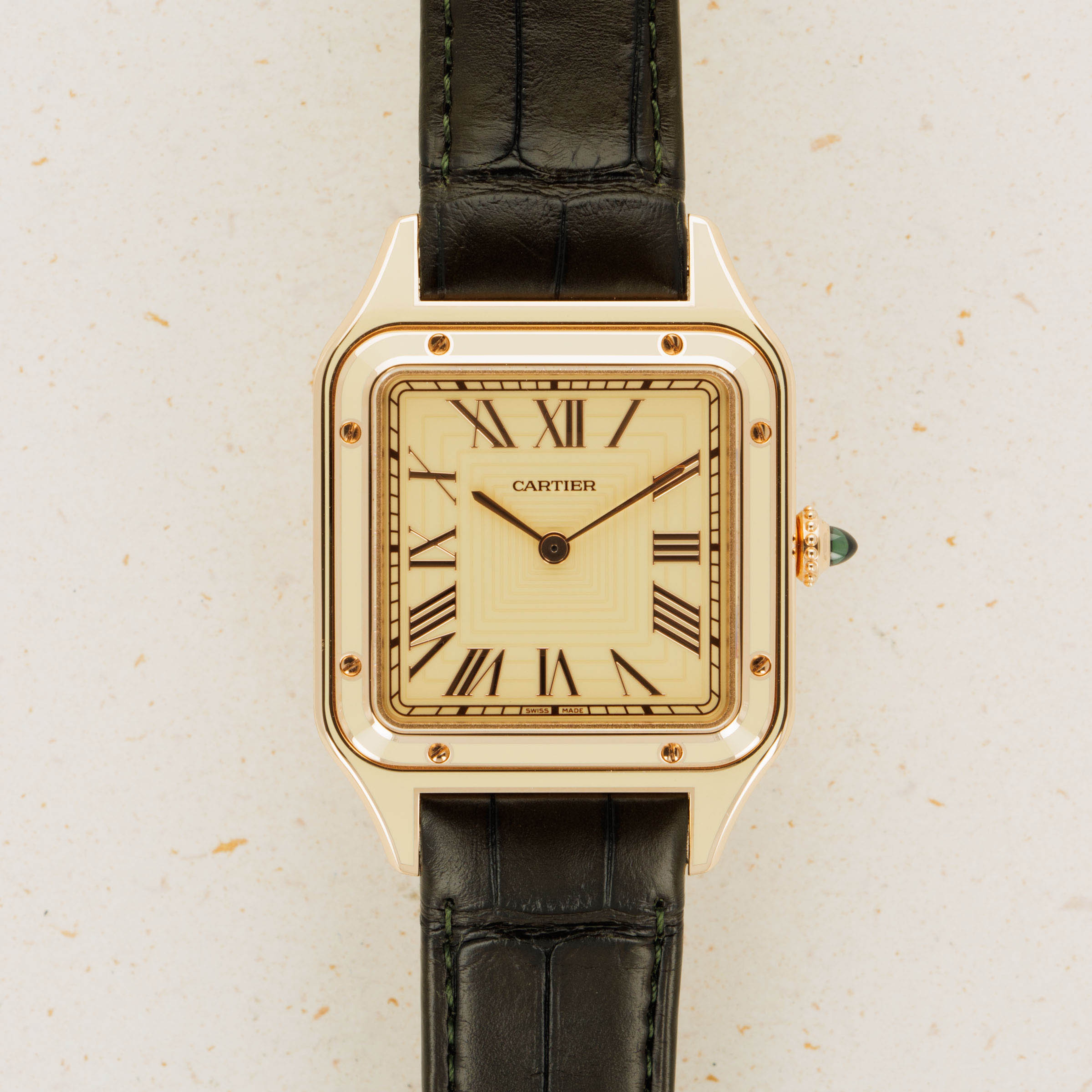 Originally inspired by Brazilian aviator Alberto Santos-Dumont, who requested a watch suitable for piloting his flying machines in 1904, the Cartier Santos collection has a rich history dating back over a century. As one of Cartier's oldest and most significant collections dedicated to men, the Santos-Dumont is a pioneering wristwatch, designed from scratch to be worn on the wrist, not a converted pocket watch like many of its contemporaries. Offered here we have the highly anticipated Cartier Santos Dumont "Lacquered Case" ref. CRWGS0054 in 18kt rose gold with a striking cream lacquer-filled case. A stunning re-interpretation of the iconic Santos-Dumont unveiled at the Watches & Wonders 2022 event, this reference and two more, one in platinum and another in steel set Cartier fans into overdrive. Limited to just 250 pieces and crafted in 18kt rose gold and adorned with alluring creamy beige lacquer, this timepiece captivates with its striking aesthetics and impeccable geometry. The lacquer, expertly applied to the engraved bezel and lugs, accentuates the sleek silhouette of the 31.5mm case, perfectly complementing its edges, contours and proportions. Featuring an engraved solid caseback reveals the stylish signature of Alberto Santos-Dumont, filled with color-matching lacquer. Beneath this elegant exterior beats the hand-wound cal. 430MC movement, based on the ultra-thin Piaget Cal. 430P. A masterful balance of contemporary design, respect for brand heritage, and exquisite craftsmanship, this rose gold and beige lacquer configuration ensures exclusivity and makes it a coveted reference for discerning collectors.