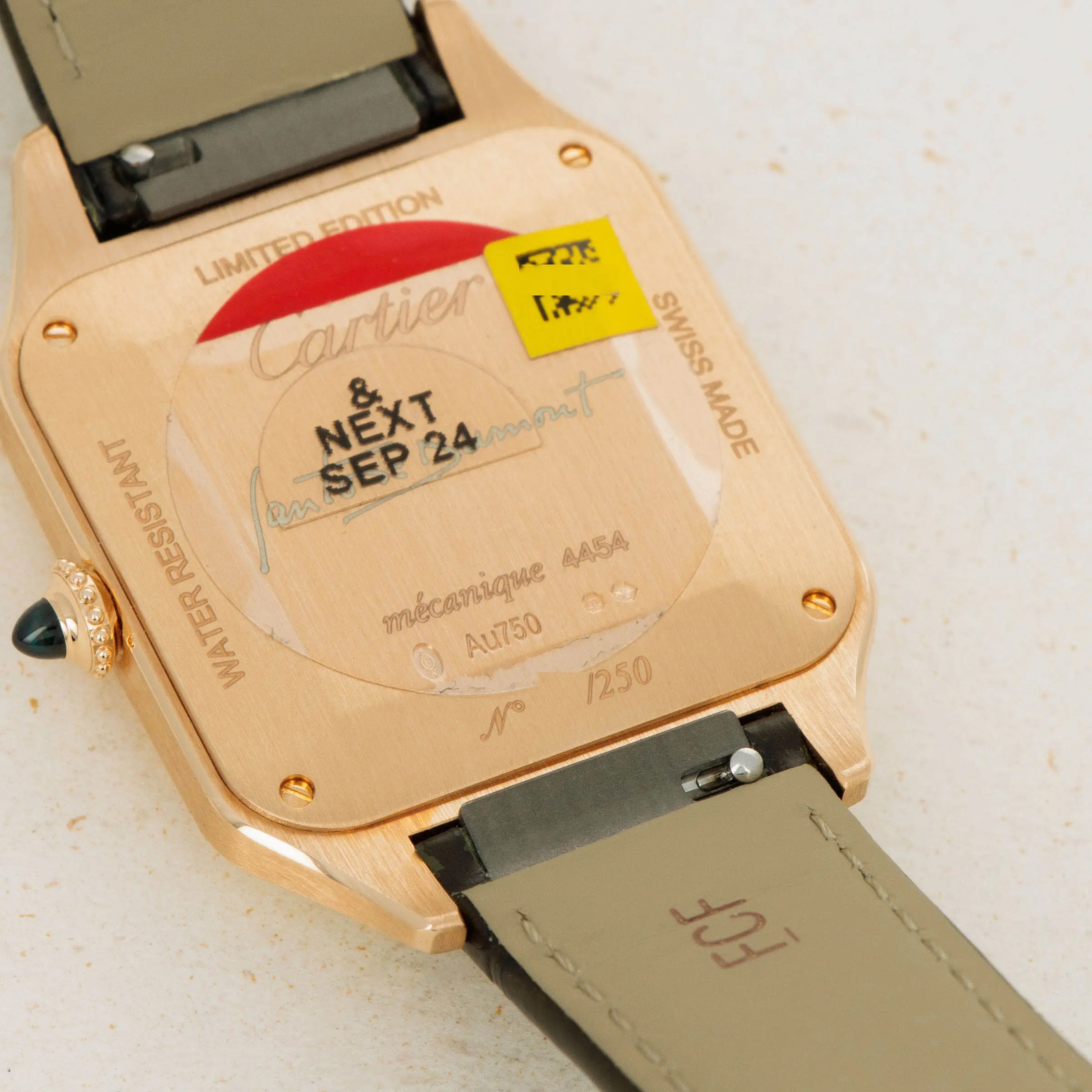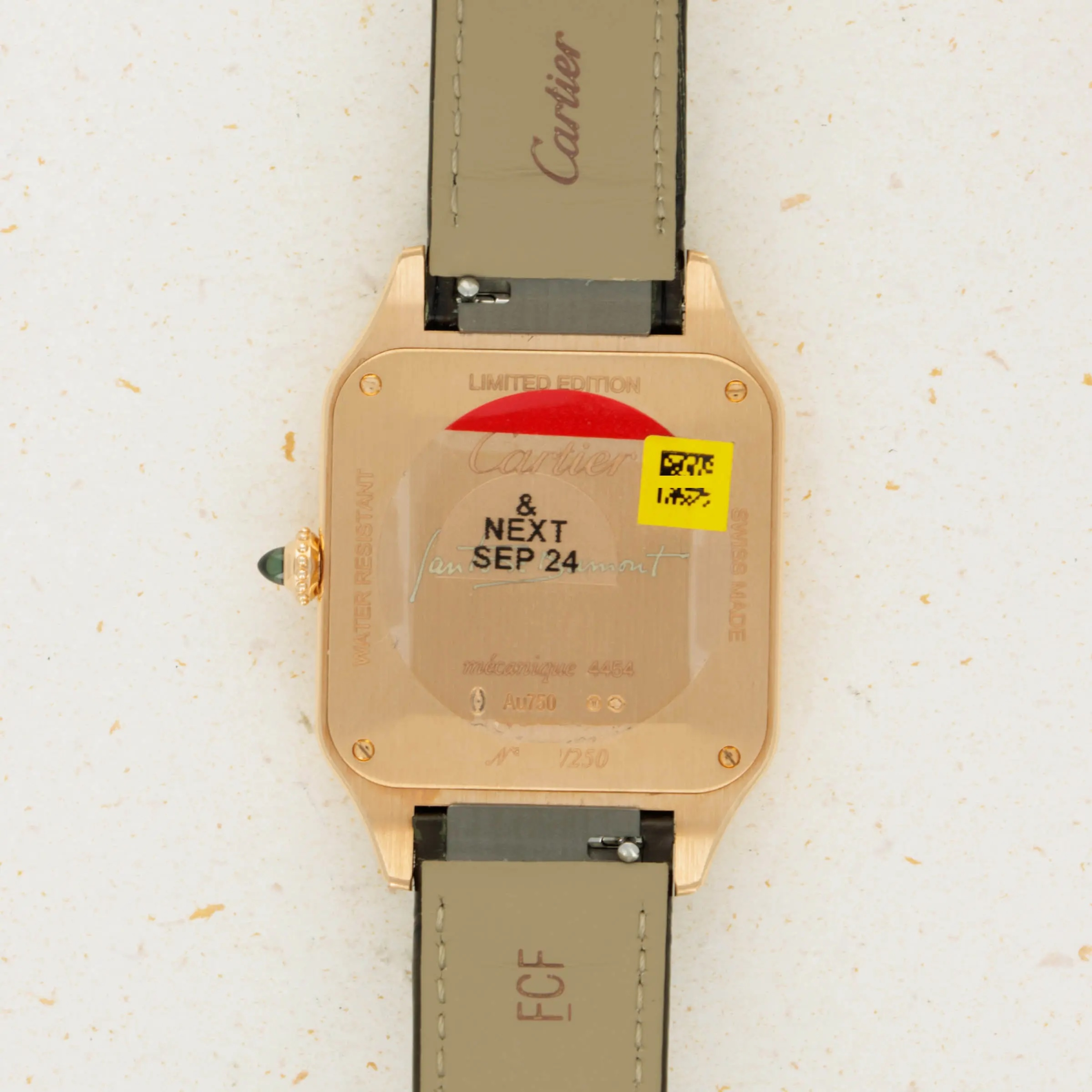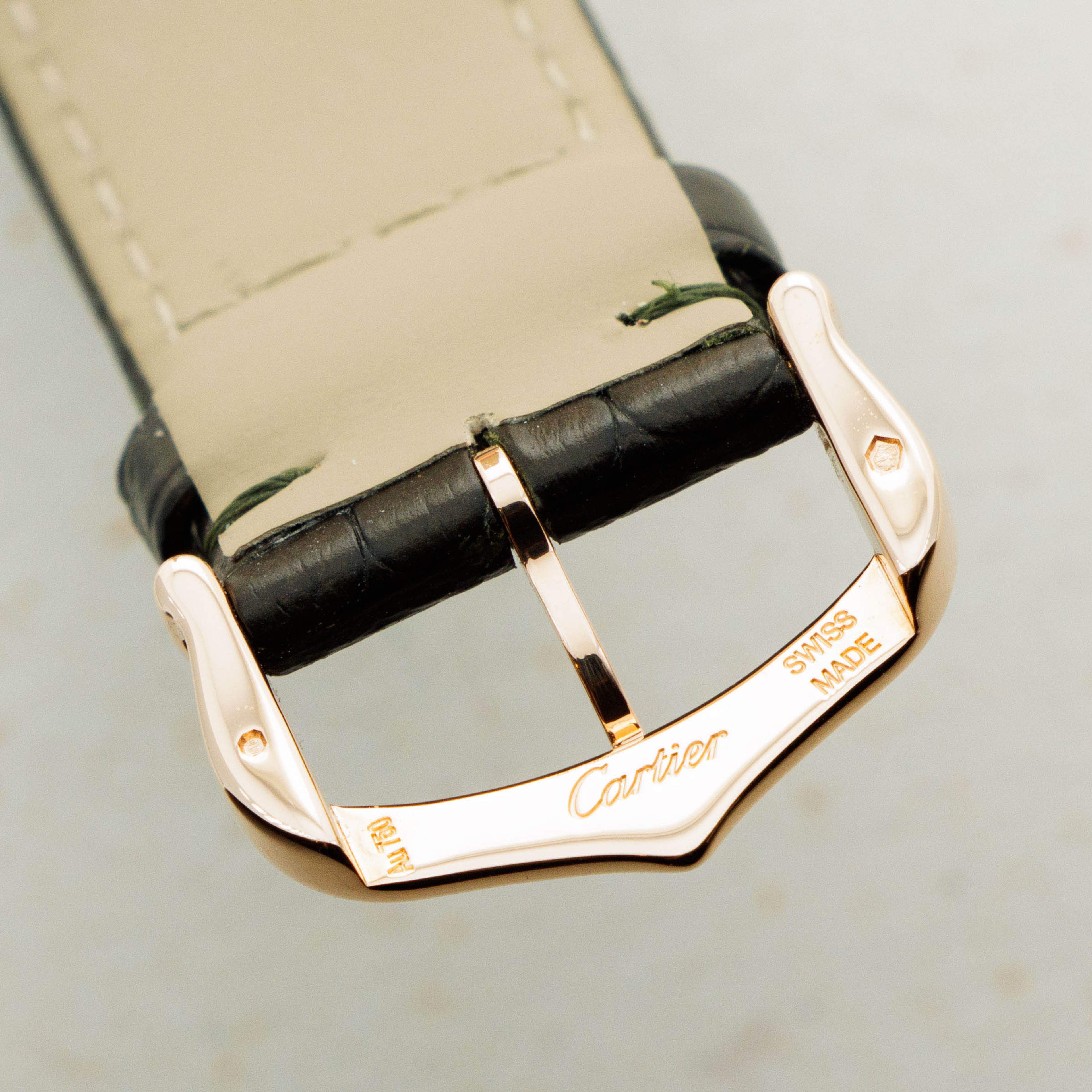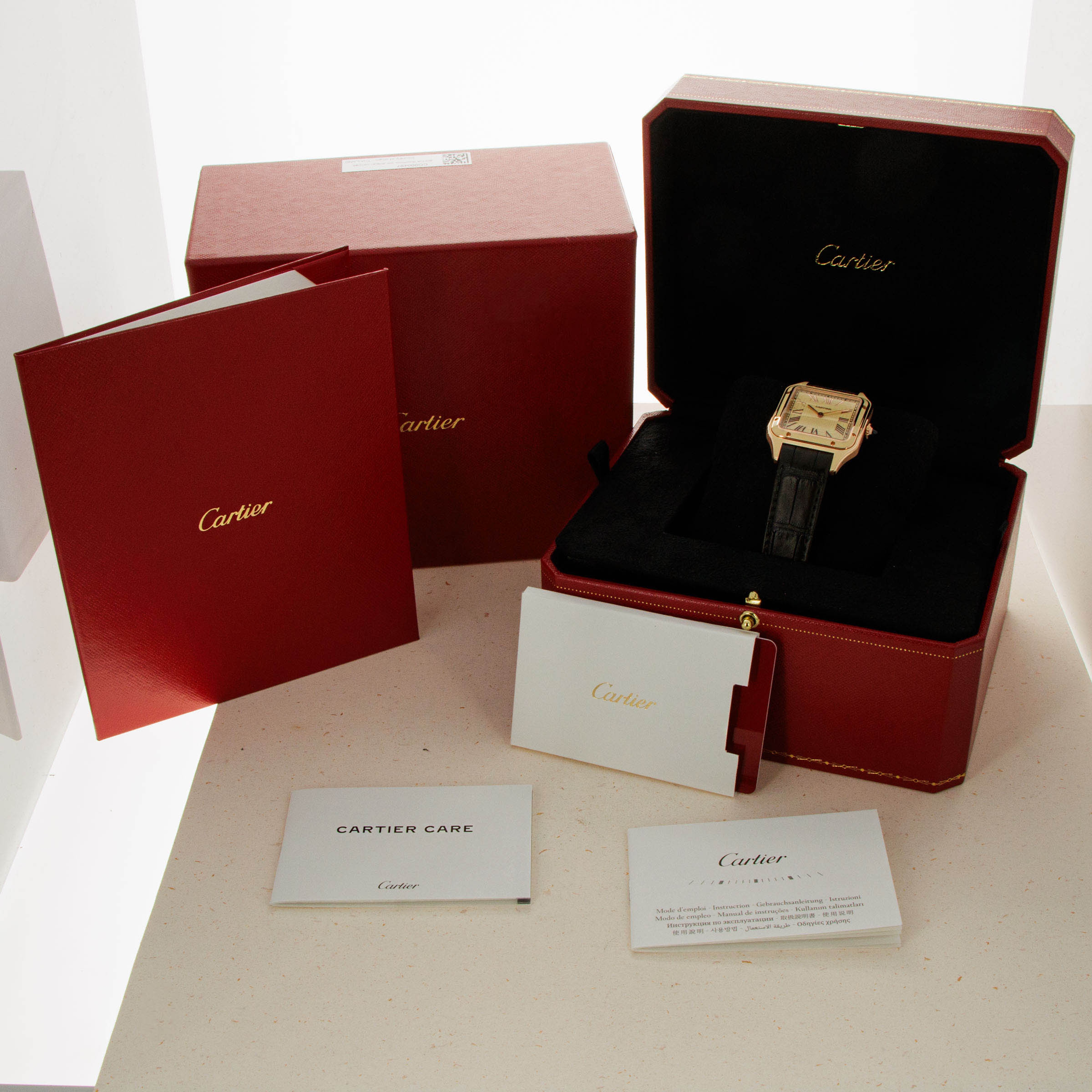 Originally inspired by Brazilian aviator Alberto Santos-Dumont, who requested a watch suitable for piloting his flying machines in 1904, the Cartier Santos collection has a rich history dating back over a century. As one of Cartier's oldest and most significant collections dedicated to men, the Santos-Dumont is a pioneering wristwatch, designed from scratch to be worn on the wrist, not a converted pocket watch like many of its contemporaries. Offered here we have the highly anticipated Cartier Santos Dumont "Lacquered Case" ref. CRWGS0054 in 18kt rose gold with a striking cream lacquer-filled case. A stunning re-interpretation of the iconic Santos-Dumont unveiled at the Watches & Wonders 2022 event, this reference and two more, one in platinum and another in steel set Cartier fans into overdrive. Limited to just 250 pieces and crafted in 18kt rose gold and adorned with alluring creamy beige lacquer, this timepiece captivates with its striking aesthetics and impeccable geometry. The lacquer, expertly applied to the engraved bezel and lugs, accentuates the sleek silhouette of the 31.5mm case, perfectly complementing its edges, contours and proportions. Featuring an engraved solid caseback reveals the stylish signature of Alberto Santos-Dumont, filled with color-matching lacquer. Beneath this elegant exterior beats the hand-wound cal. 430MC movement, based on the ultra-thin Piaget Cal. 430P. A masterful balance of contemporary design, respect for brand heritage, and exquisite craftsmanship, this rose gold and beige lacquer configuration ensures exclusivity and makes it a coveted reference for discerning collectors.