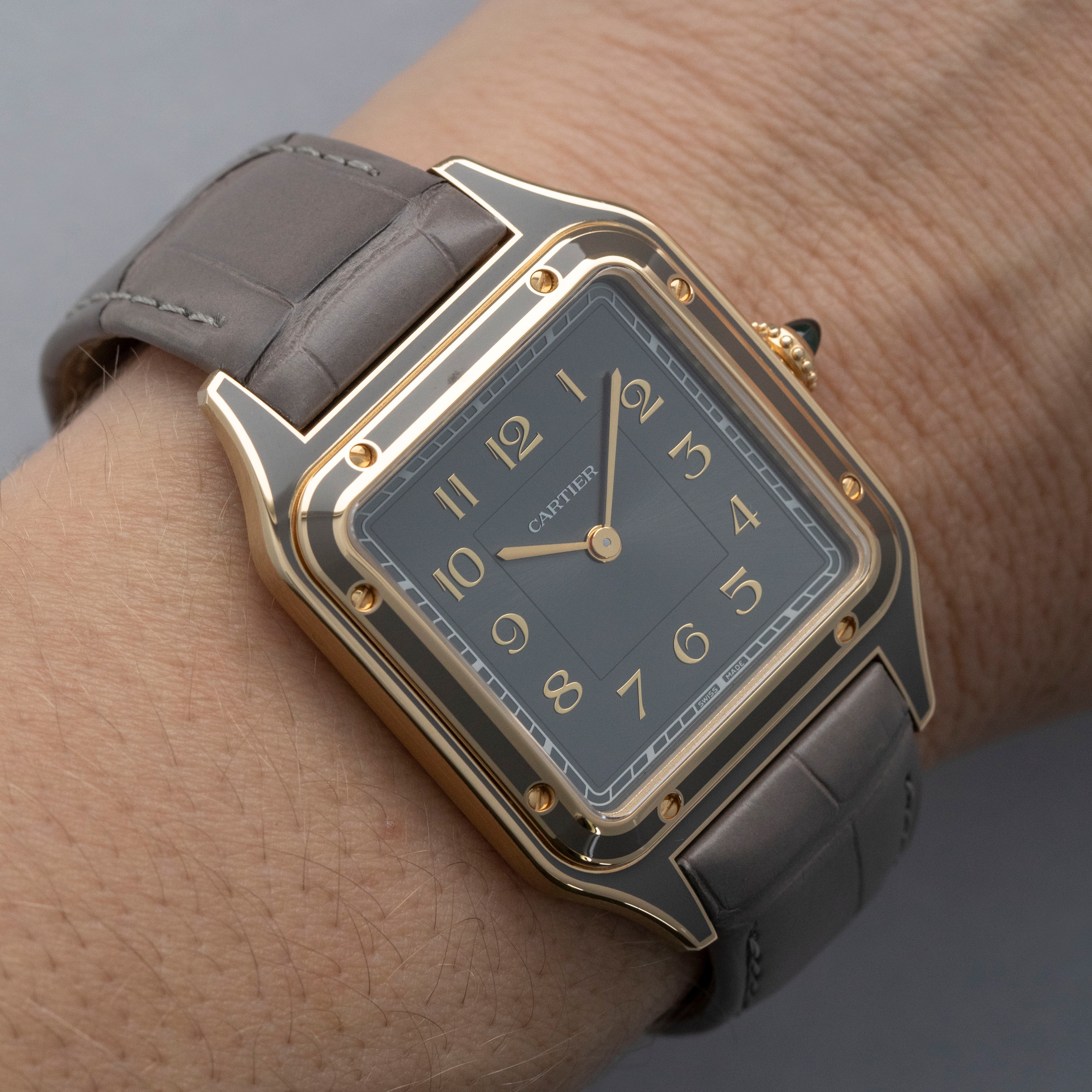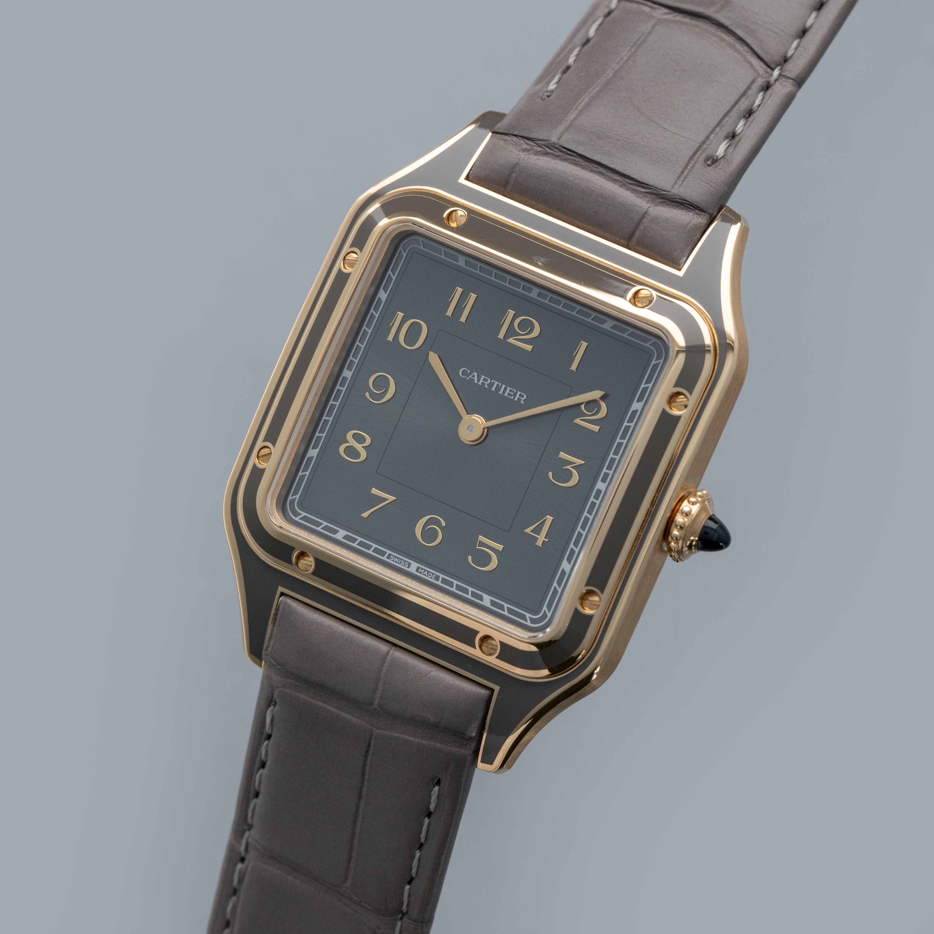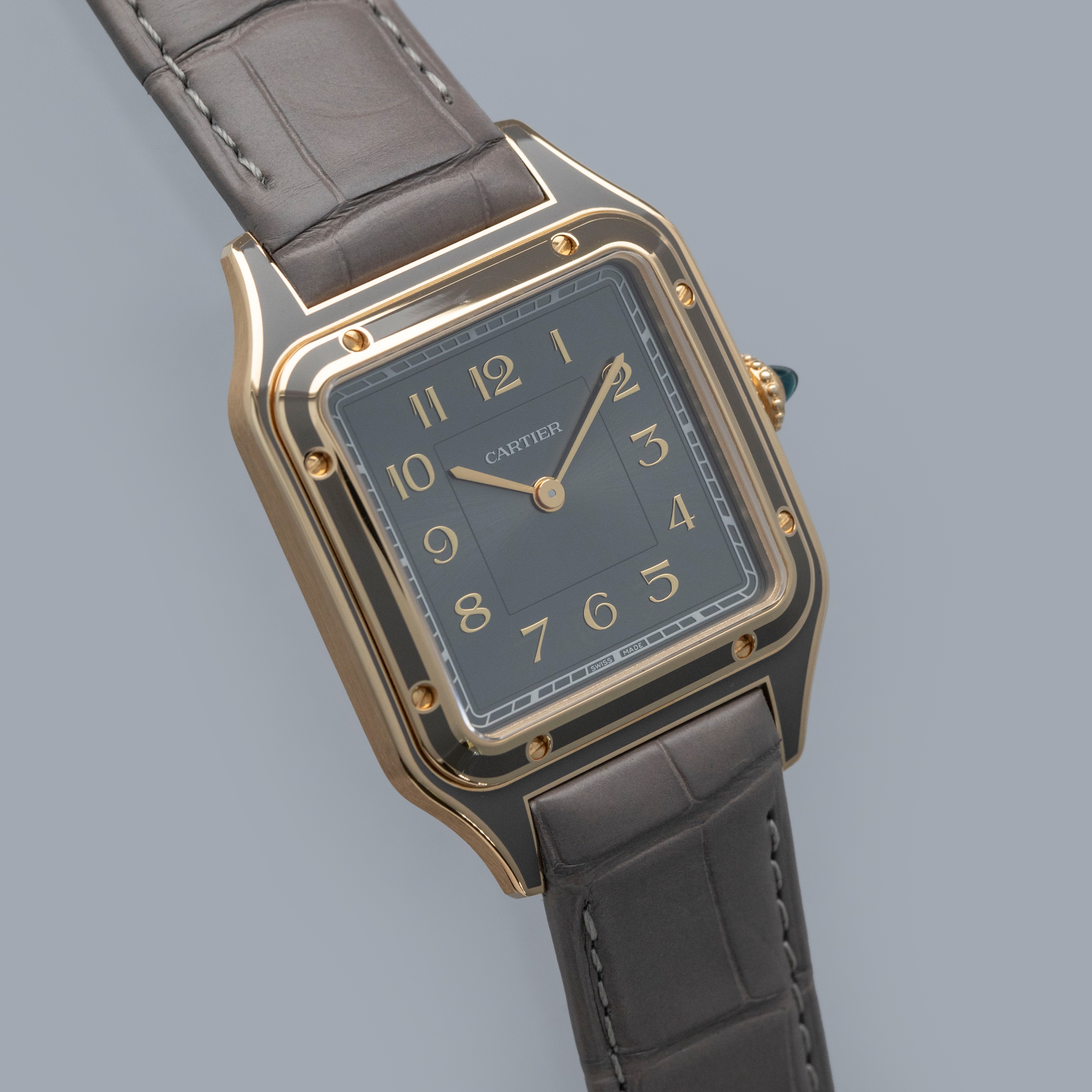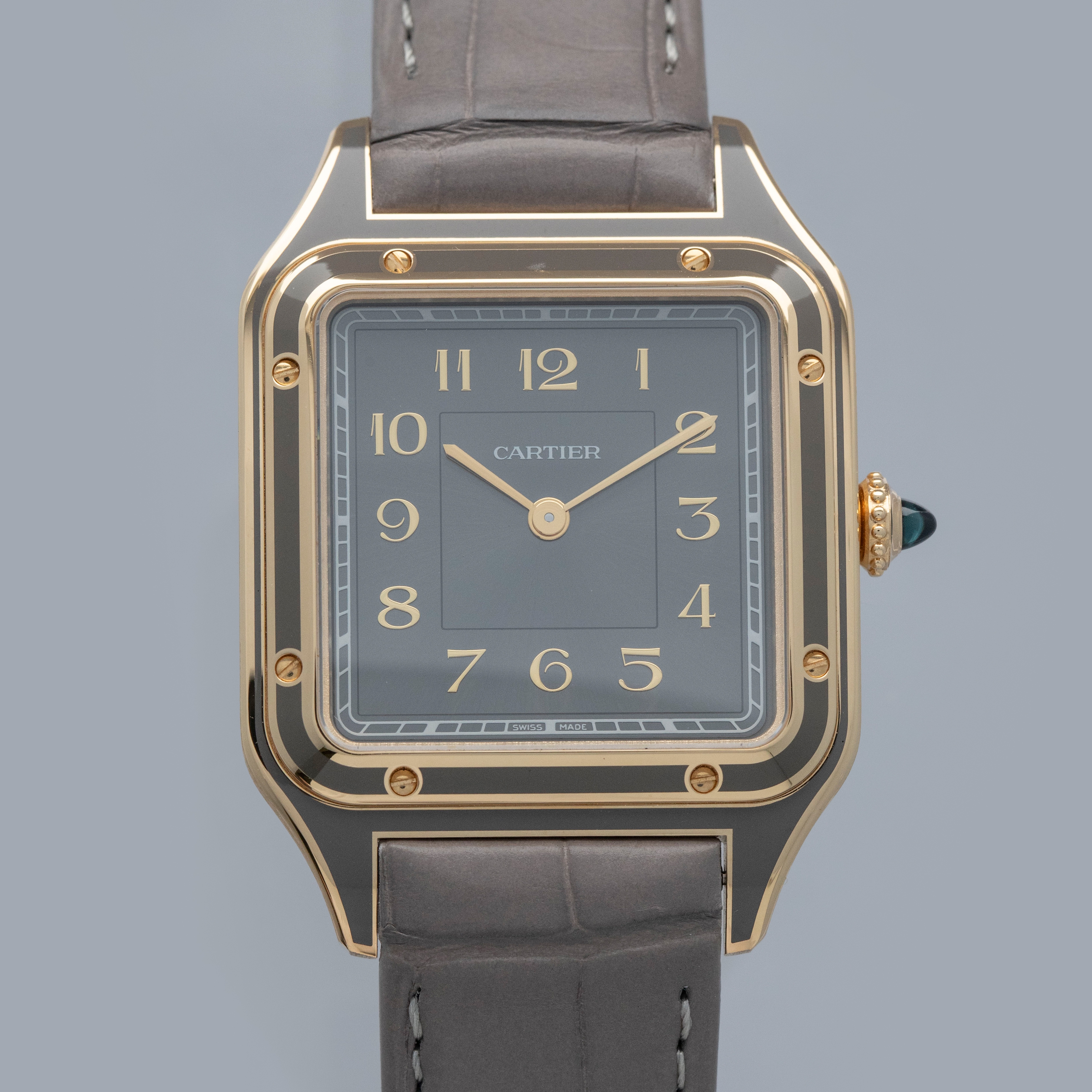 Originally inspired by Brazilian aviator Alberto Santos-Dumont, who requested a watch suitable for piloting his flying machines in 1904, the Cartier Santos collection has a rich history dating back over a century. As one of Cartier's oldest and most significant collections dedicated to men, the Santos-Dumont is a pioneering wristwatch, designed from scratch to be worn on the wrist, not a converted pocket watch like many of its contemporaries. Offered here we have the stunning Cartier Santos Dumont "Lacquered Case" ref. WGSA0097 in 18kt yellow gold with a striking grey lacquer-filled case. An expansion of the stunning re-interpretation of the iconic Santos-Dumont unveiled at the Watches & Wonders 2022 event, this reference is one of the handful of lacquer-filled offerings that set Cartier fans into overdrive. Crafted in 18kt yellow gold and adorned with alluring taupe grey lacquer, this timepiece captivates with its striking aesthetics and impeccable geometry. The lacquer, expertly applied to the engraved bezel and lugs, accentuates the sleek silhouette of the 31.5mm case, perfectly complementing its edges, contours and proportions. Featuring an engraved solid caseback reveals the stylish signature of Alberto Santos-Dumont, filled with color-matching lacquer. Beneath this elegant exterior beats the hand-wound cal. 430MC movement, based on the ultra-thin Piaget Cal. 430P. A masterful balance of contemporary design, respect for brand heritage, and exquisite craftsmanship, this yellow gold and grey lacquer configuration ensures exclusivity and makes it a coveted reference for discerning collectors.
