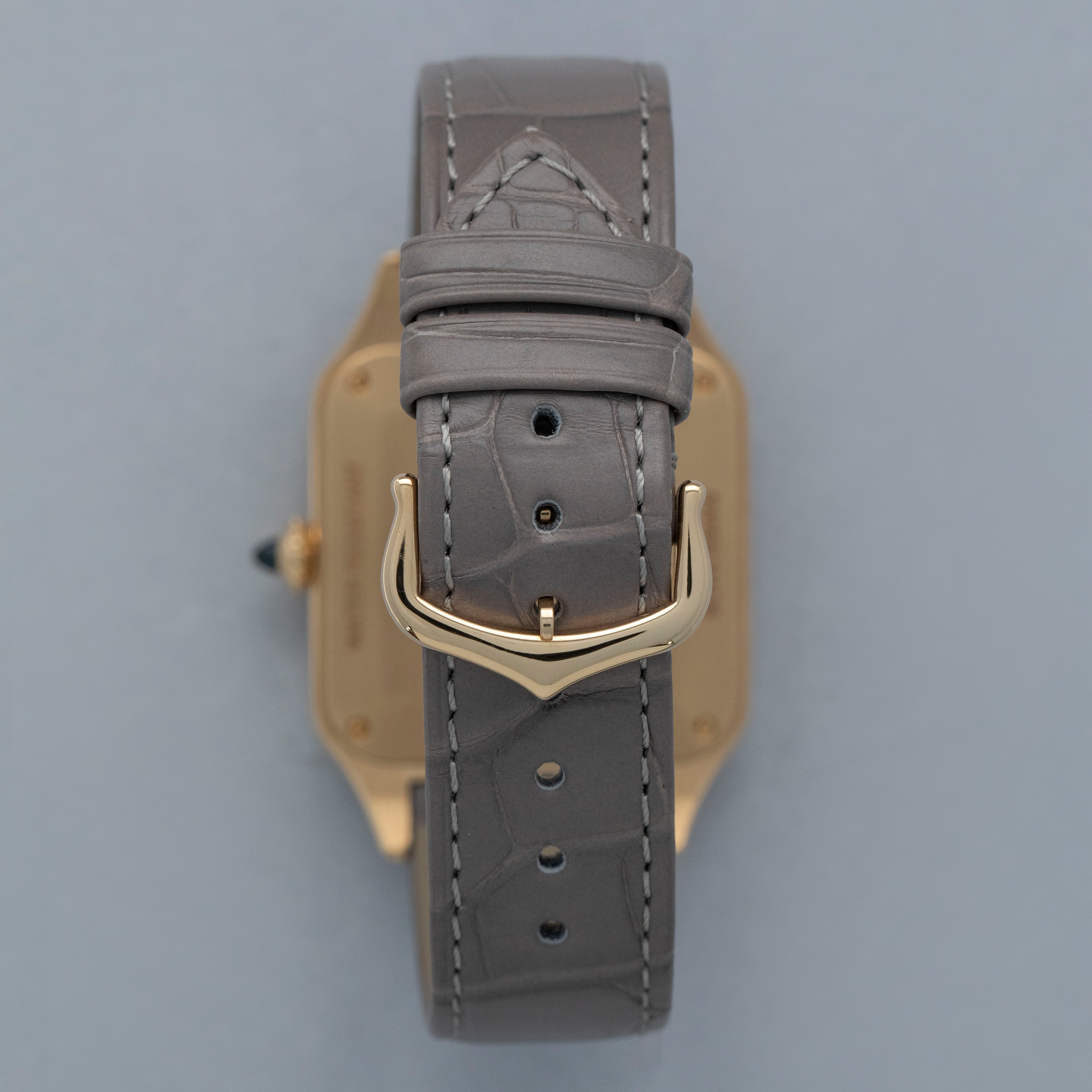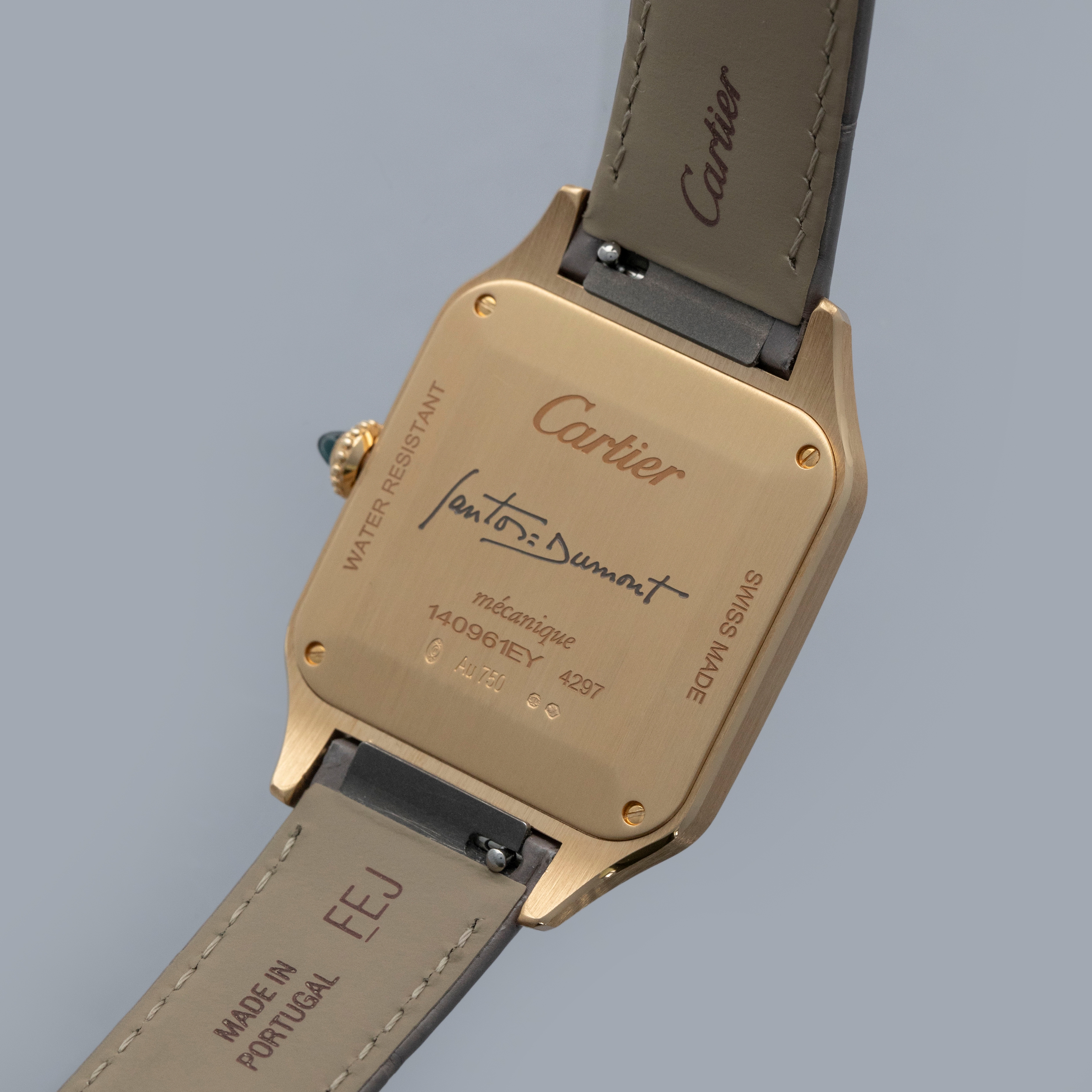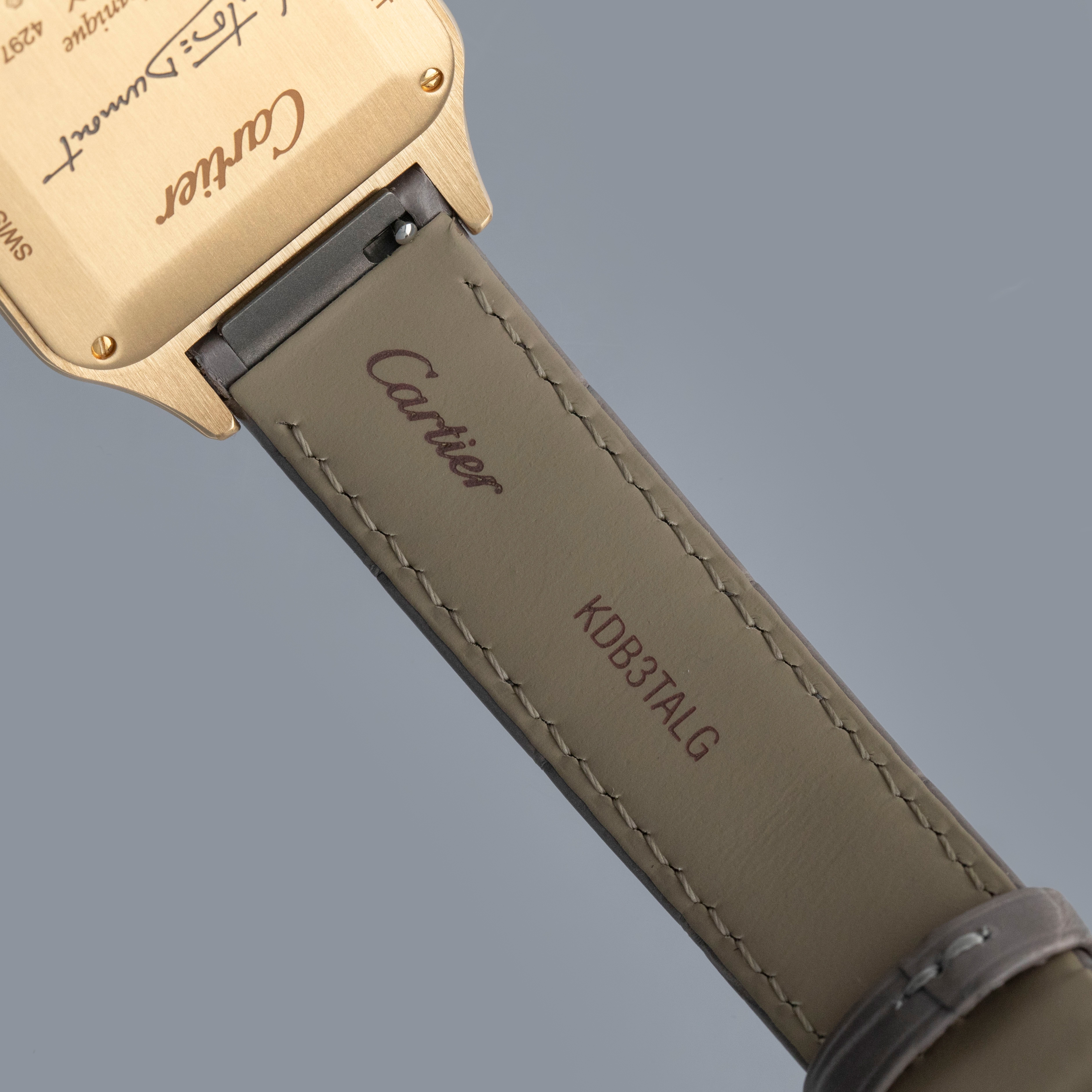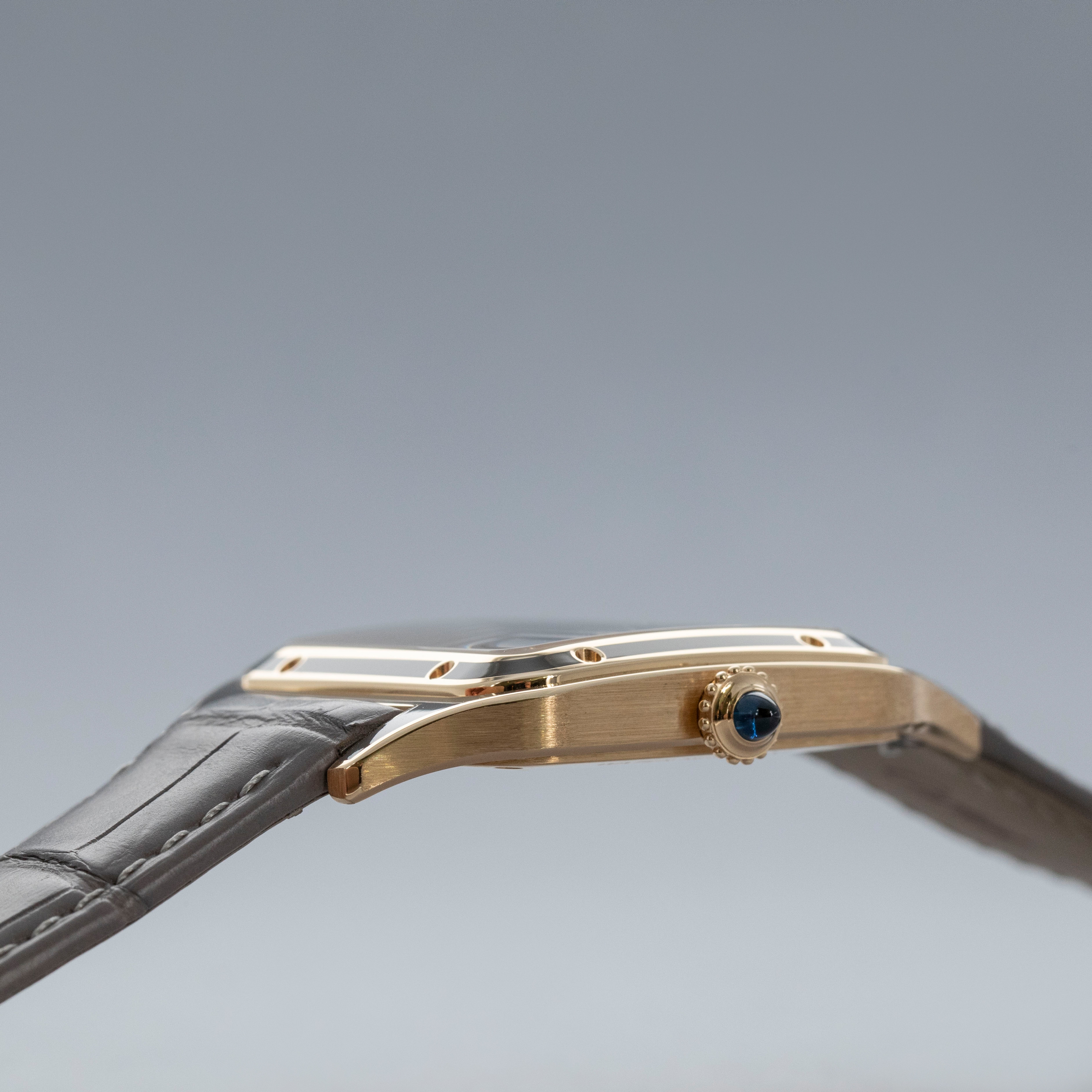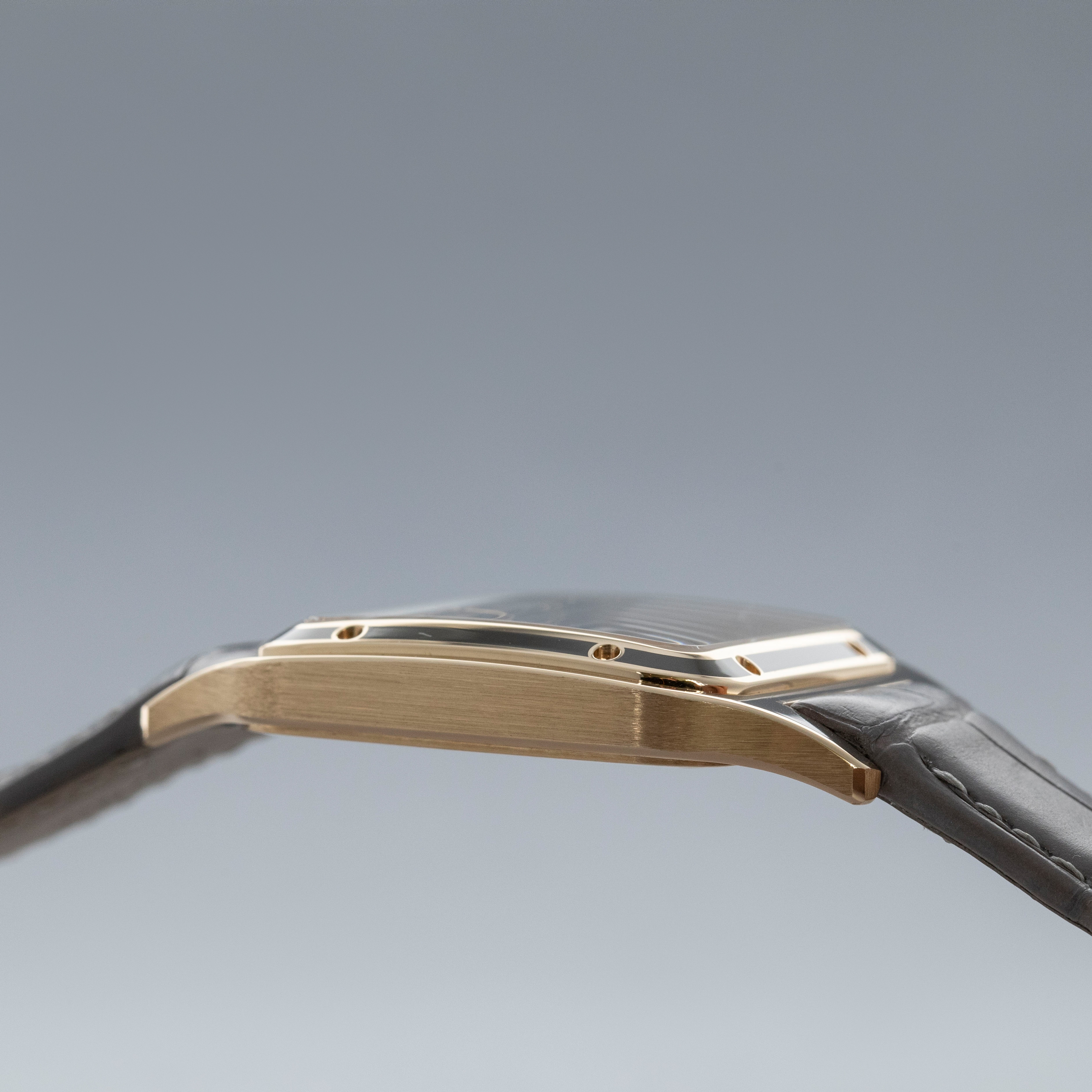 Originally inspired by Brazilian aviator Alberto Santos-Dumont, who requested a watch suitable for piloting his flying machines in 1904, the Cartier Santos collection has a rich history dating back over a century. As one of Cartier's oldest and most significant collections dedicated to men, the Santos-Dumont is a pioneering wristwatch, designed from scratch to be worn on the wrist, not a converted pocket watch like many of its contemporaries. Offered here we have the stunning Cartier Santos Dumont "Lacquered Case" ref. WGSA0097 in 18kt yellow gold with a striking grey lacquer-filled case. An expansion of the stunning re-interpretation of the iconic Santos-Dumont unveiled at the Watches & Wonders 2022 event, this reference is one of the handful of lacquer-filled offerings that set Cartier fans into overdrive. Crafted in 18kt yellow gold and adorned with alluring taupe grey lacquer, this timepiece captivates with its striking aesthetics and impeccable geometry. The lacquer, expertly applied to the engraved bezel and lugs, accentuates the sleek silhouette of the 31.5mm case, perfectly complementing its edges, contours and proportions. Featuring an engraved solid caseback reveals the stylish signature of Alberto Santos-Dumont, filled with color-matching lacquer. Beneath this elegant exterior beats the hand-wound cal. 430MC movement, based on the ultra-thin Piaget Cal. 430P. A masterful balance of contemporary design, respect for brand heritage, and exquisite craftsmanship, this yellow gold and grey lacquer configuration ensures exclusivity and makes it a coveted reference for discerning collectors.