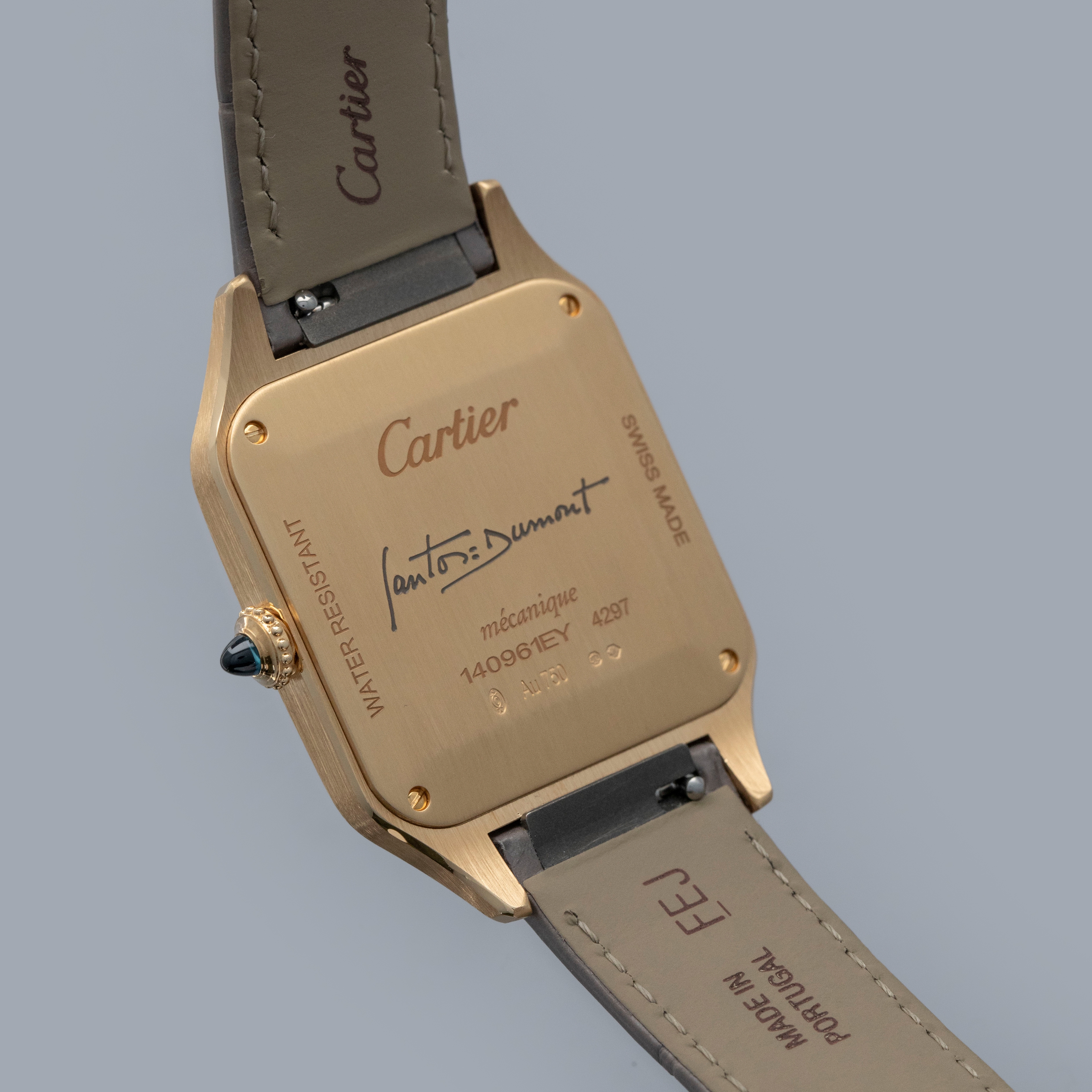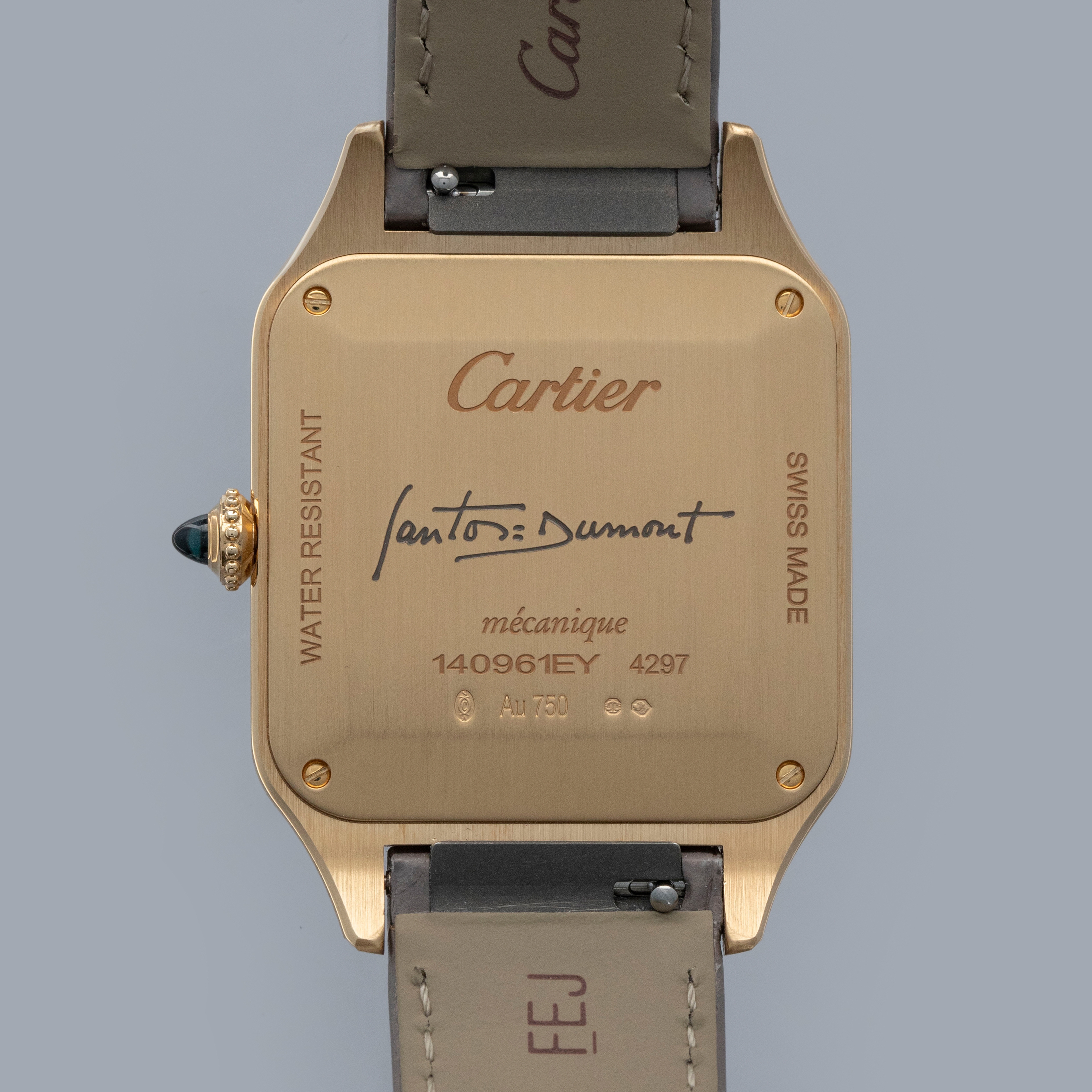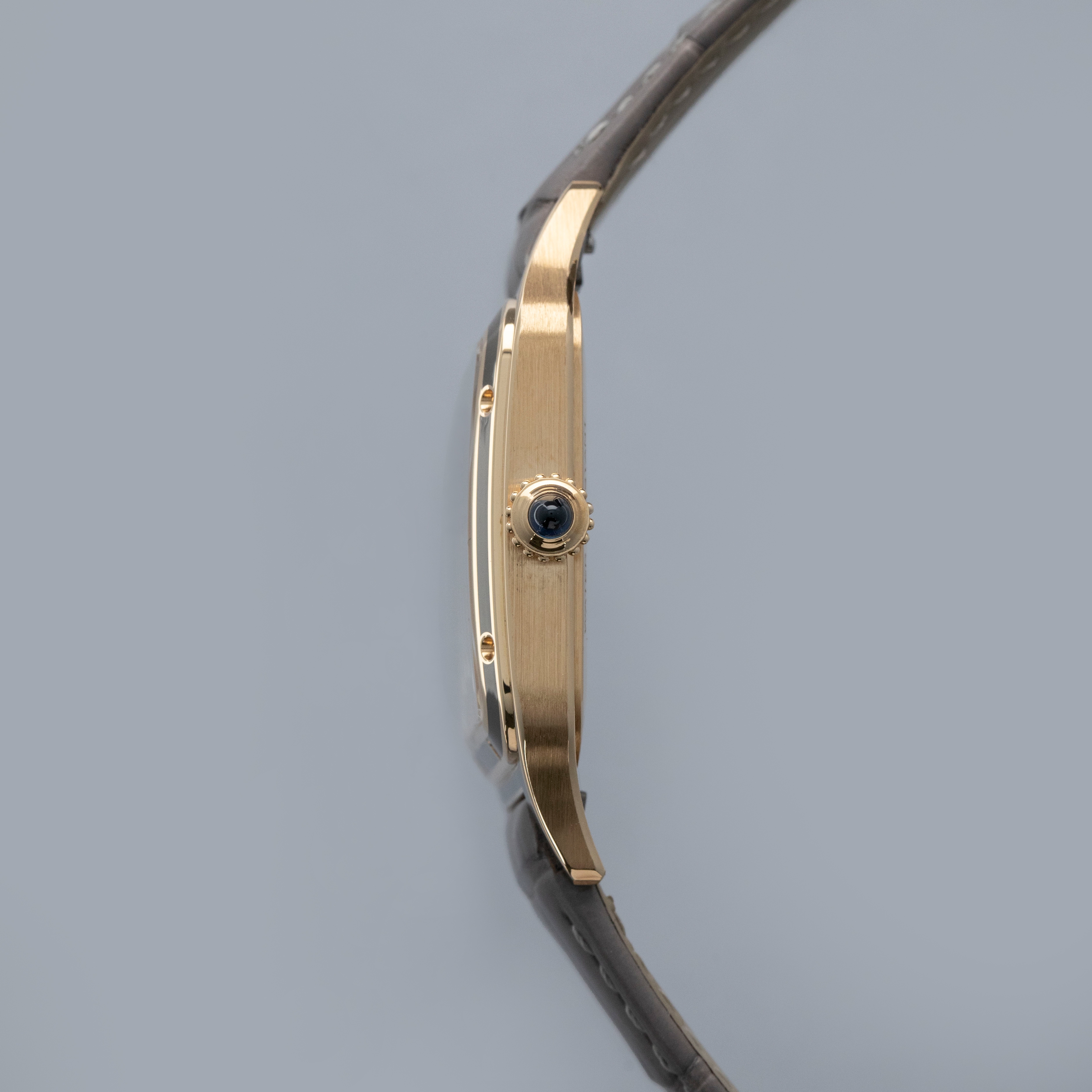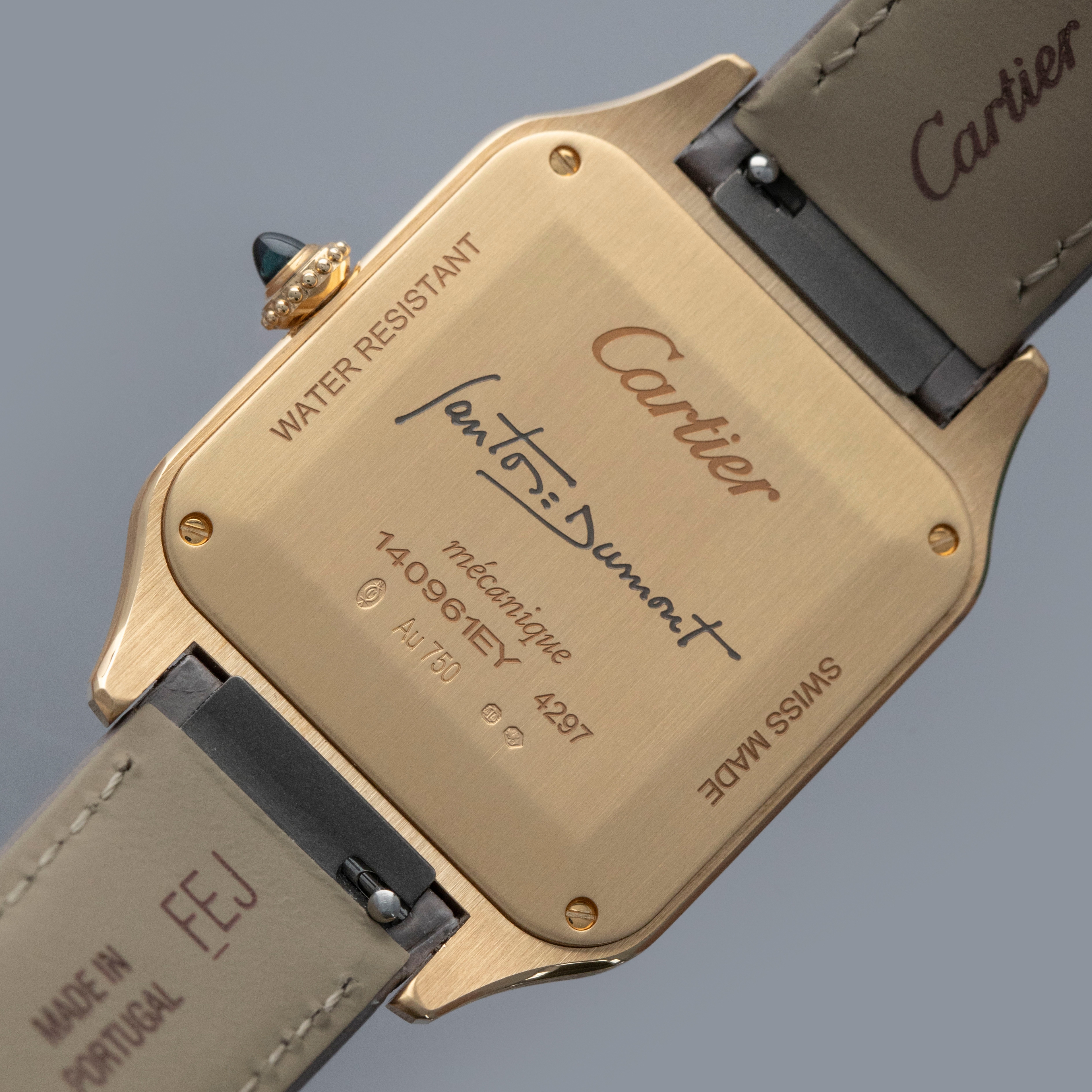 Originally inspired by Brazilian aviator Alberto Santos-Dumont, who requested a watch suitable for piloting his flying machines in 1904, the Cartier Santos collection has a rich history dating back over a century. As one of Cartier's oldest and most significant collections dedicated to men, the Santos-Dumont is a pioneering wristwatch, designed from scratch to be worn on the wrist, not a converted pocket watch like many of its contemporaries. Offered here we have the stunning Cartier Santos Dumont "Lacquered Case" ref. WGSA0097 in 18kt yellow gold with a striking grey lacquer-filled case. An expansion of the stunning re-interpretation of the iconic Santos-Dumont unveiled at the Watches & Wonders 2022 event, this reference is one of the handful of lacquer-filled offerings that set Cartier fans into overdrive. Crafted in 18kt yellow gold and adorned with alluring taupe grey lacquer, this timepiece captivates with its striking aesthetics and impeccable geometry. The lacquer, expertly applied to the engraved bezel and lugs, accentuates the sleek silhouette of the 31.5mm case, perfectly complementing its edges, contours and proportions. Featuring an engraved solid caseback reveals the stylish signature of Alberto Santos-Dumont, filled with color-matching lacquer. Beneath this elegant exterior beats the hand-wound cal. 430MC movement, based on the ultra-thin Piaget Cal. 430P. A masterful balance of contemporary design, respect for brand heritage, and exquisite craftsmanship, this yellow gold and grey lacquer configuration ensures exclusivity and makes it a coveted reference for discerning collectors.