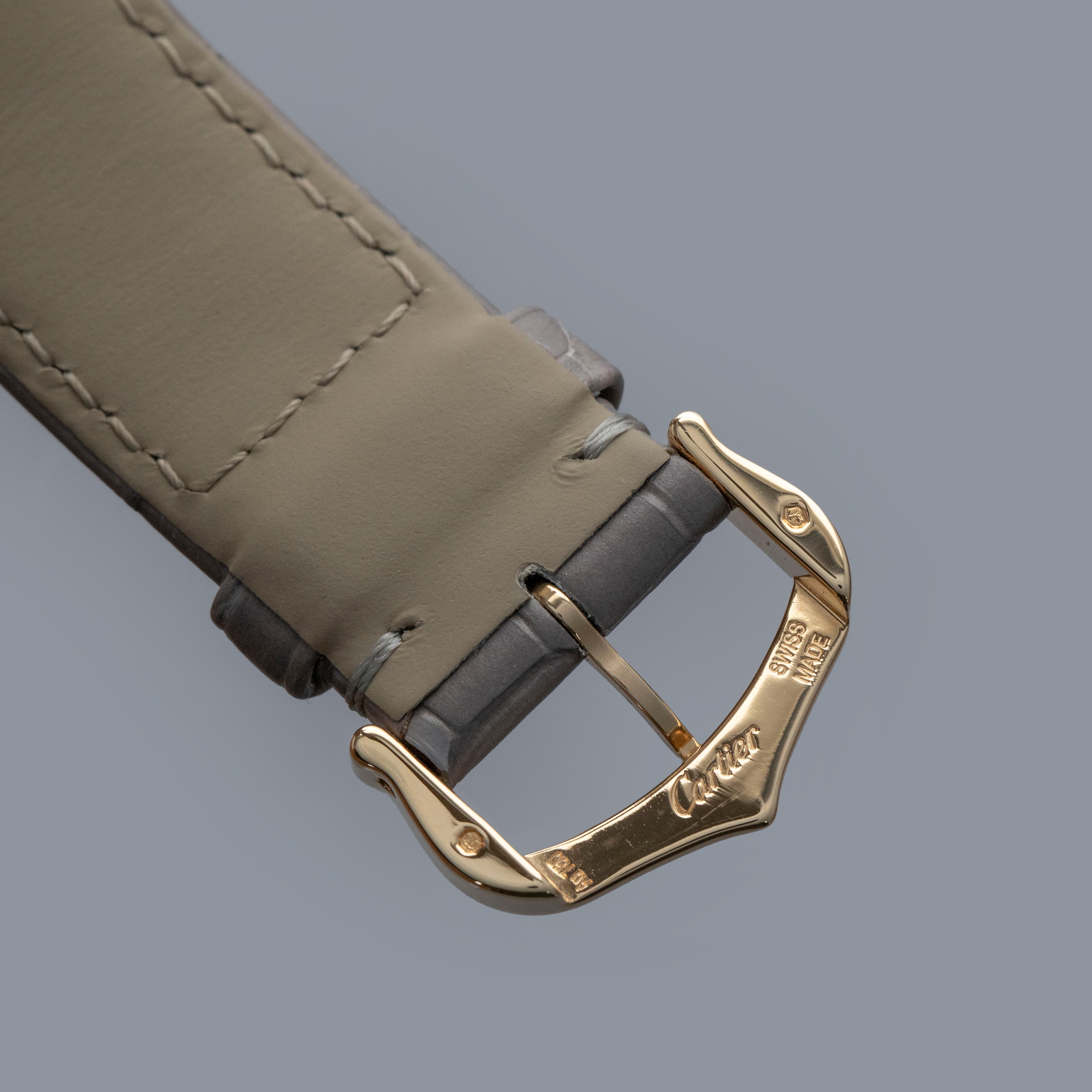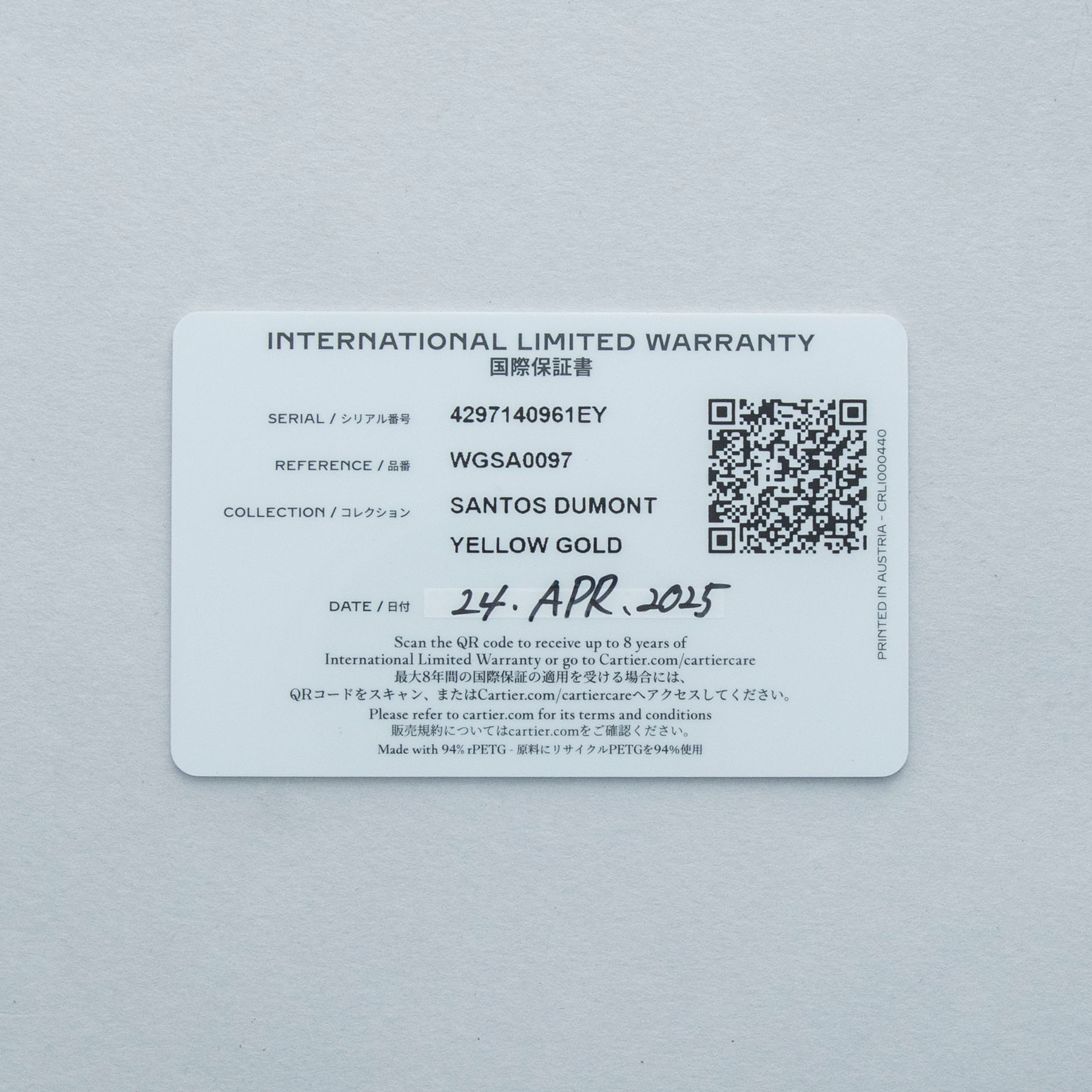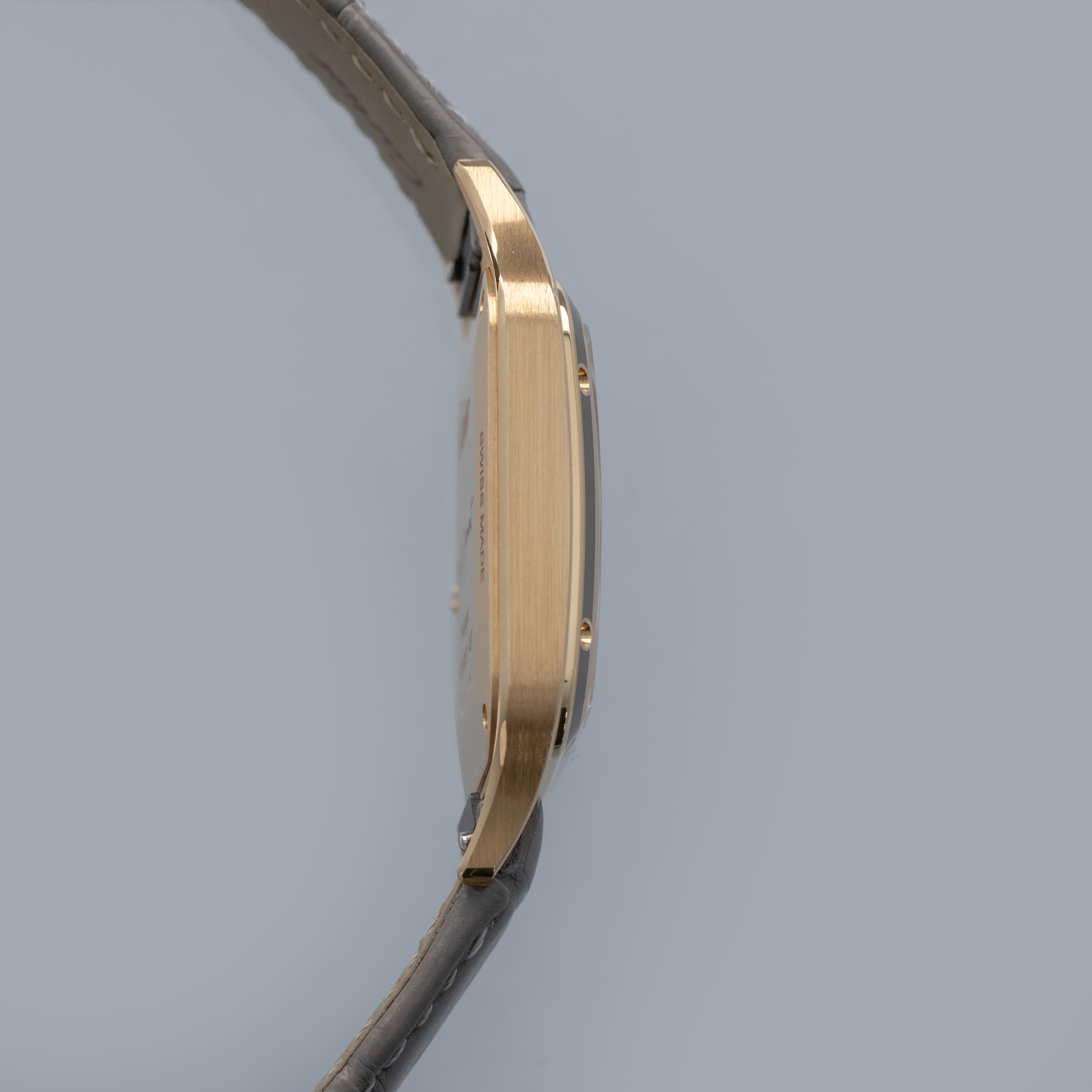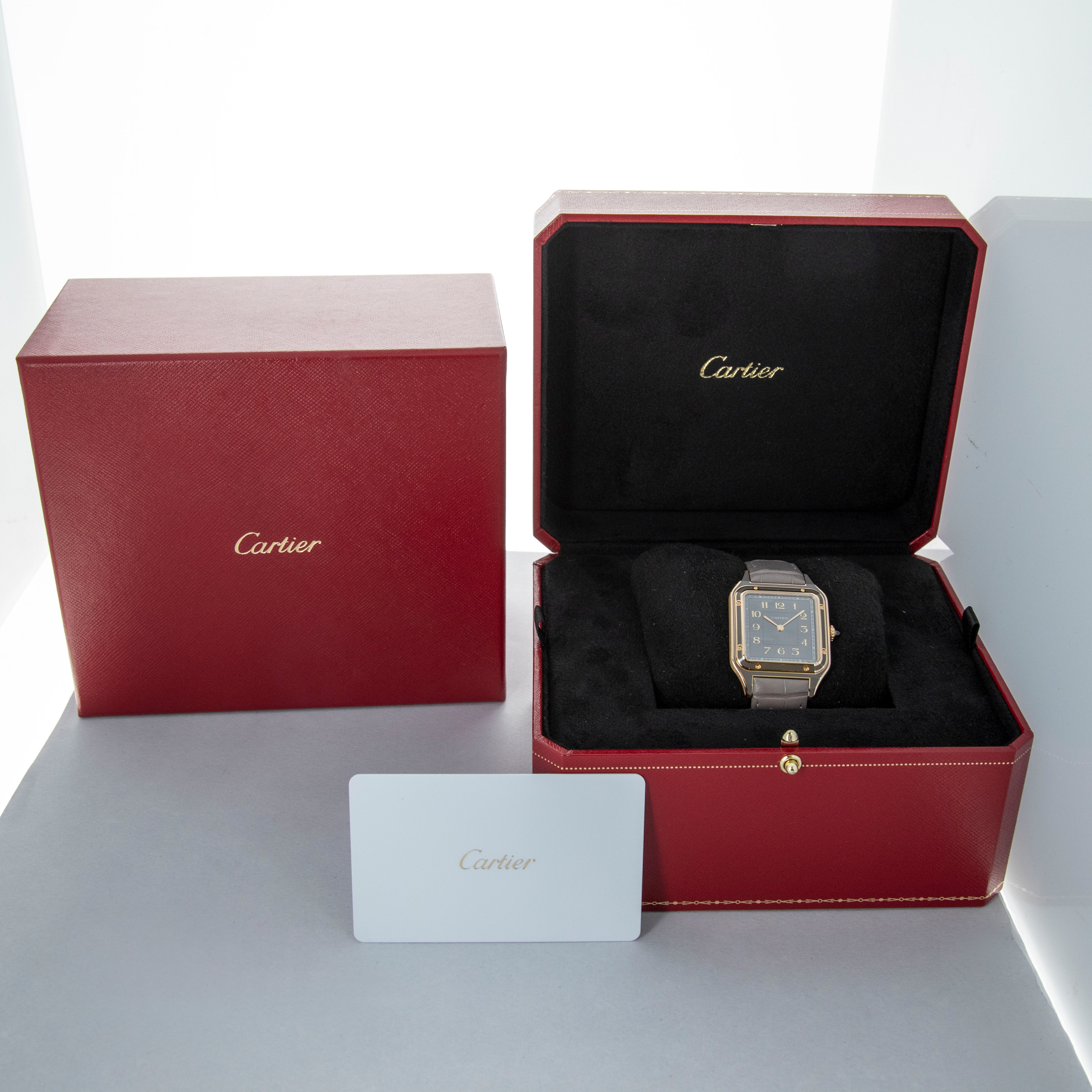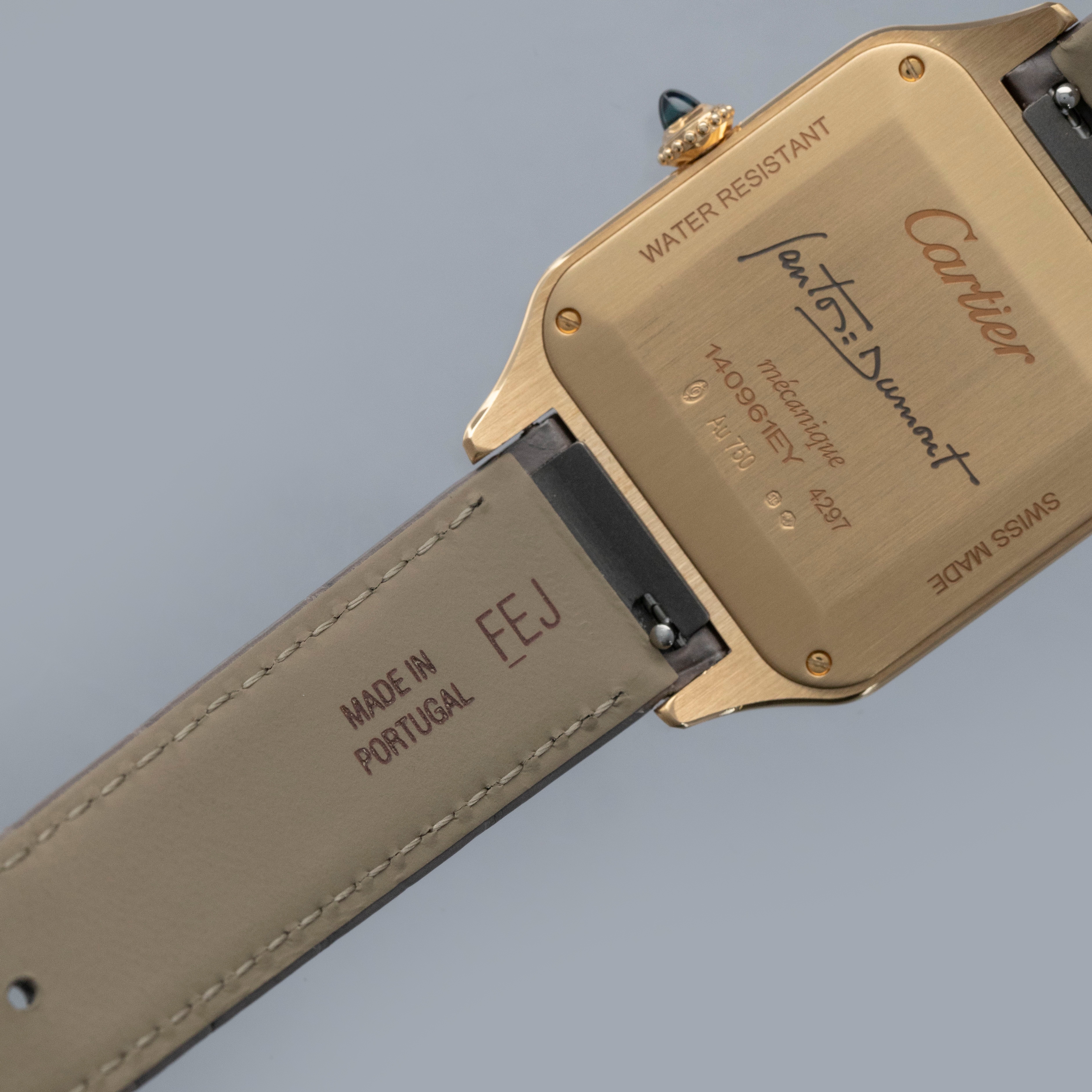Originally inspired by Brazilian aviator Alberto Santos-Dumont, who requested a watch suitable for piloting his flying machines in 1904, the Cartier Santos collection has a rich history dating back over a century. As one of Cartier's oldest and most significant collections dedicated to men, the Santos-Dumont is a pioneering wristwatch, designed from scratch to be worn on the wrist, not a converted pocket watch like many of its contemporaries. Offered here we have the stunning Cartier Santos Dumont "Lacquered Case" ref. WGSA0097 in 18kt yellow gold with a striking grey lacquer-filled case. An expansion of the stunning re-interpretation of the iconic Santos-Dumont unveiled at the Watches & Wonders 2022 event, this reference is one of the handful of lacquer-filled offerings that set Cartier fans into overdrive. Crafted in 18kt yellow gold and adorned with alluring taupe grey lacquer, this timepiece captivates with its striking aesthetics and impeccable geometry. The lacquer, expertly applied to the engraved bezel and lugs, accentuates the sleek silhouette of the 31.5mm case, perfectly complementing its edges, contours and proportions. Featuring an engraved solid caseback reveals the stylish signature of Alberto Santos-Dumont, filled with color-matching lacquer. Beneath this elegant exterior beats the hand-wound cal. 430MC movement, based on the ultra-thin Piaget Cal. 430P. A masterful balance of contemporary design, respect for brand heritage, and exquisite craftsmanship, this yellow gold and grey lacquer configuration ensures exclusivity and makes it a coveted reference for discerning collectors.