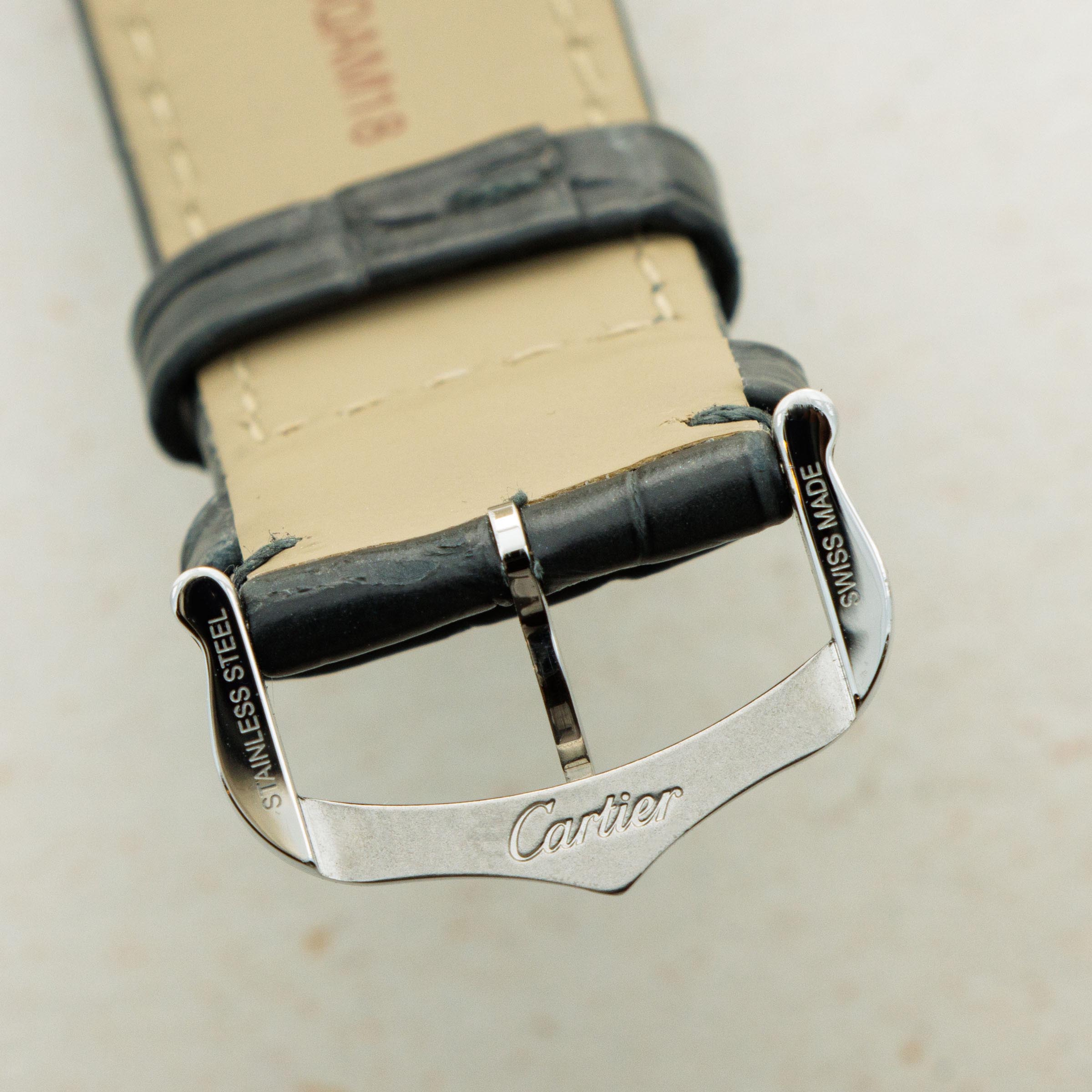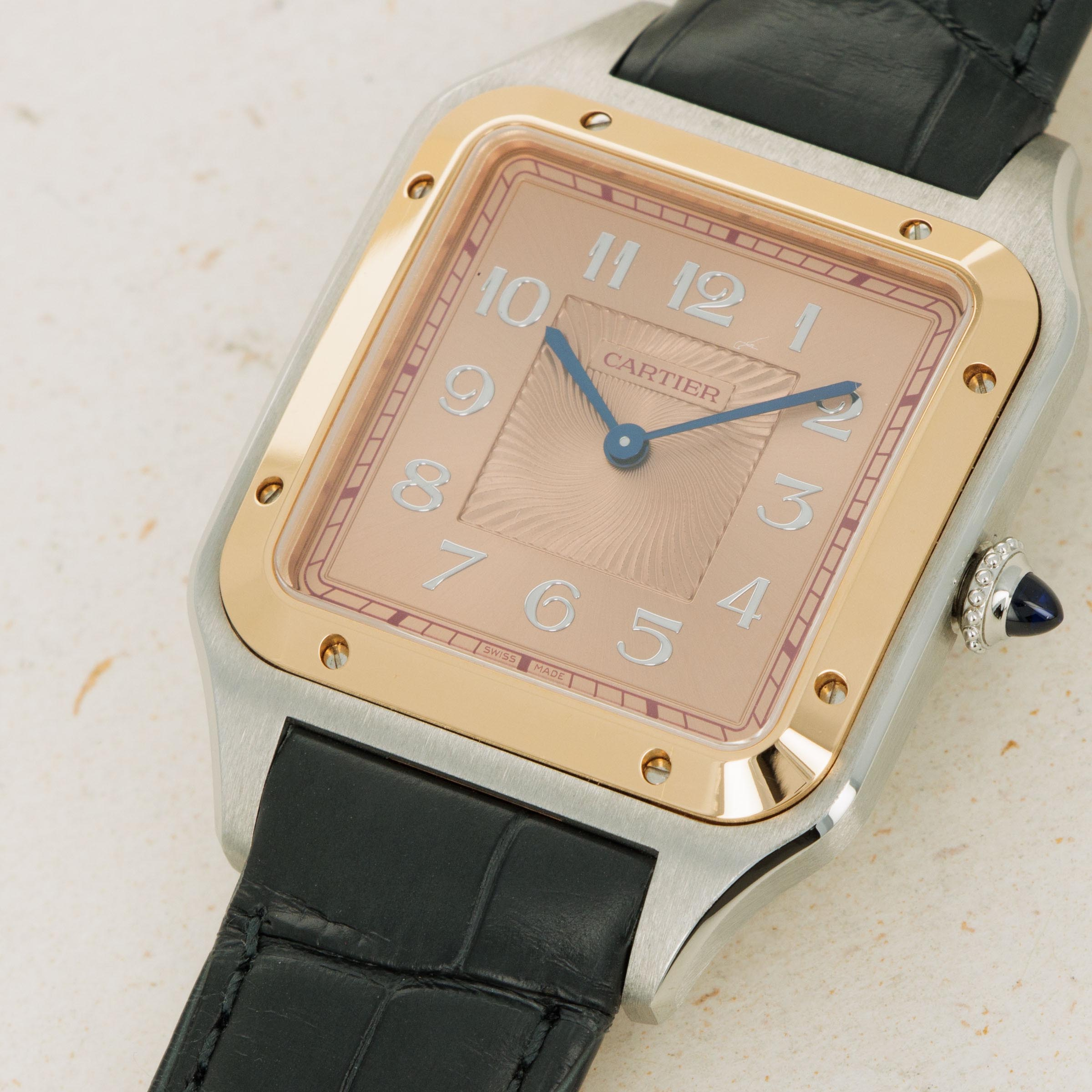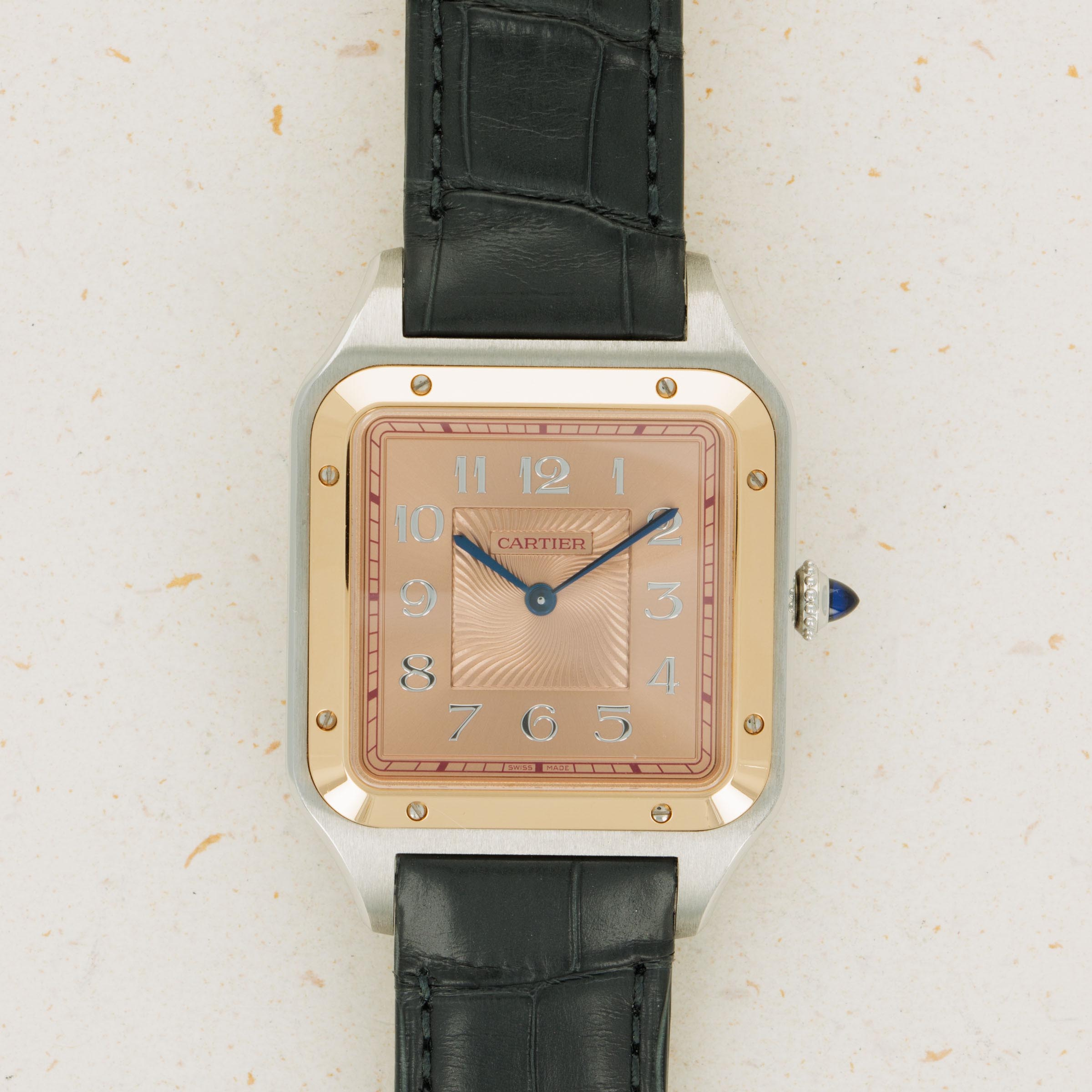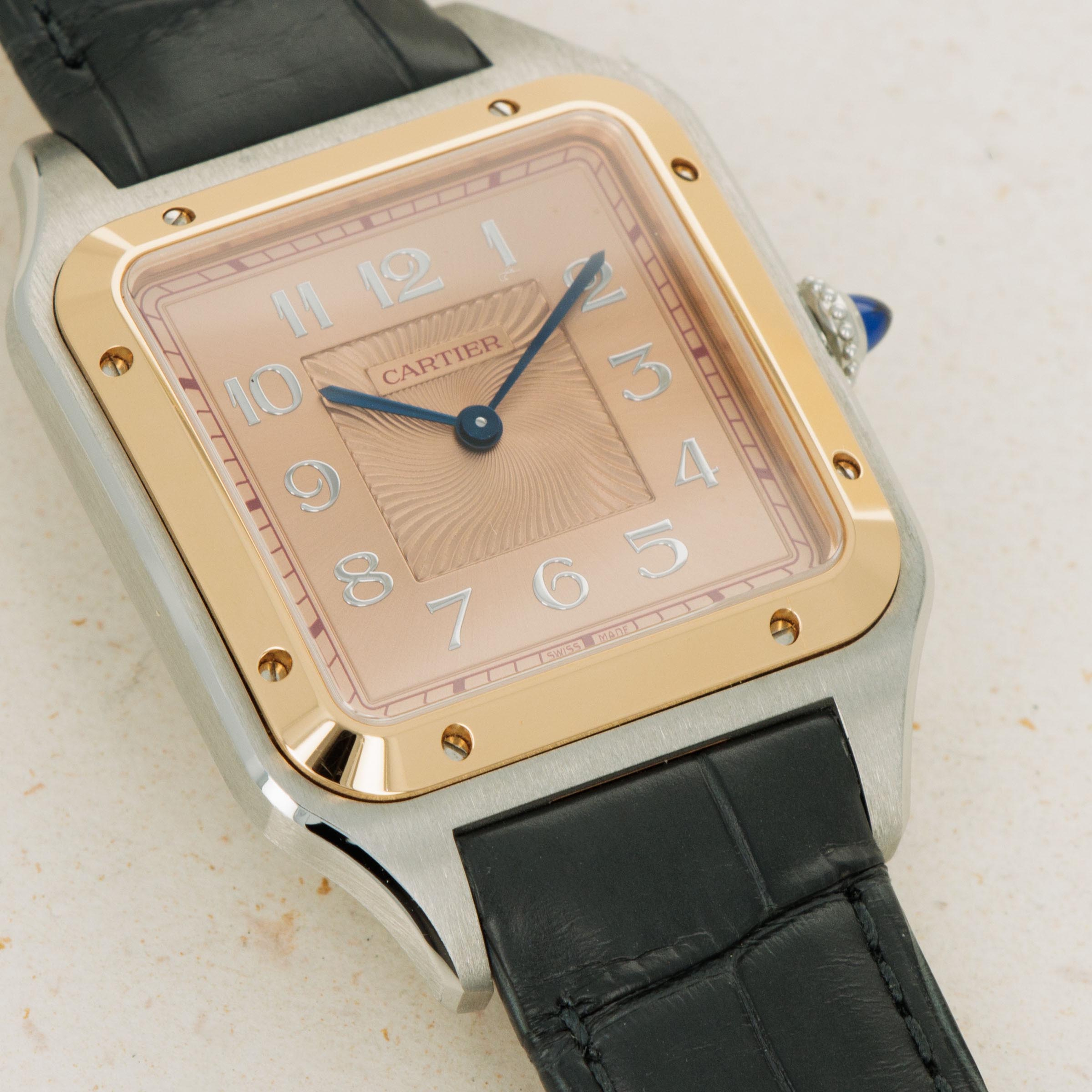 Boasting an incredibly unique display given Cartier's typically strict adherence to their own design language, the ref. W2SA0025 features a stunning salmon dial with a sunken wavy engraving and applied Arabic numerals that break from Cartier's typical painted Roman numerals in quite spectacular fashion.
