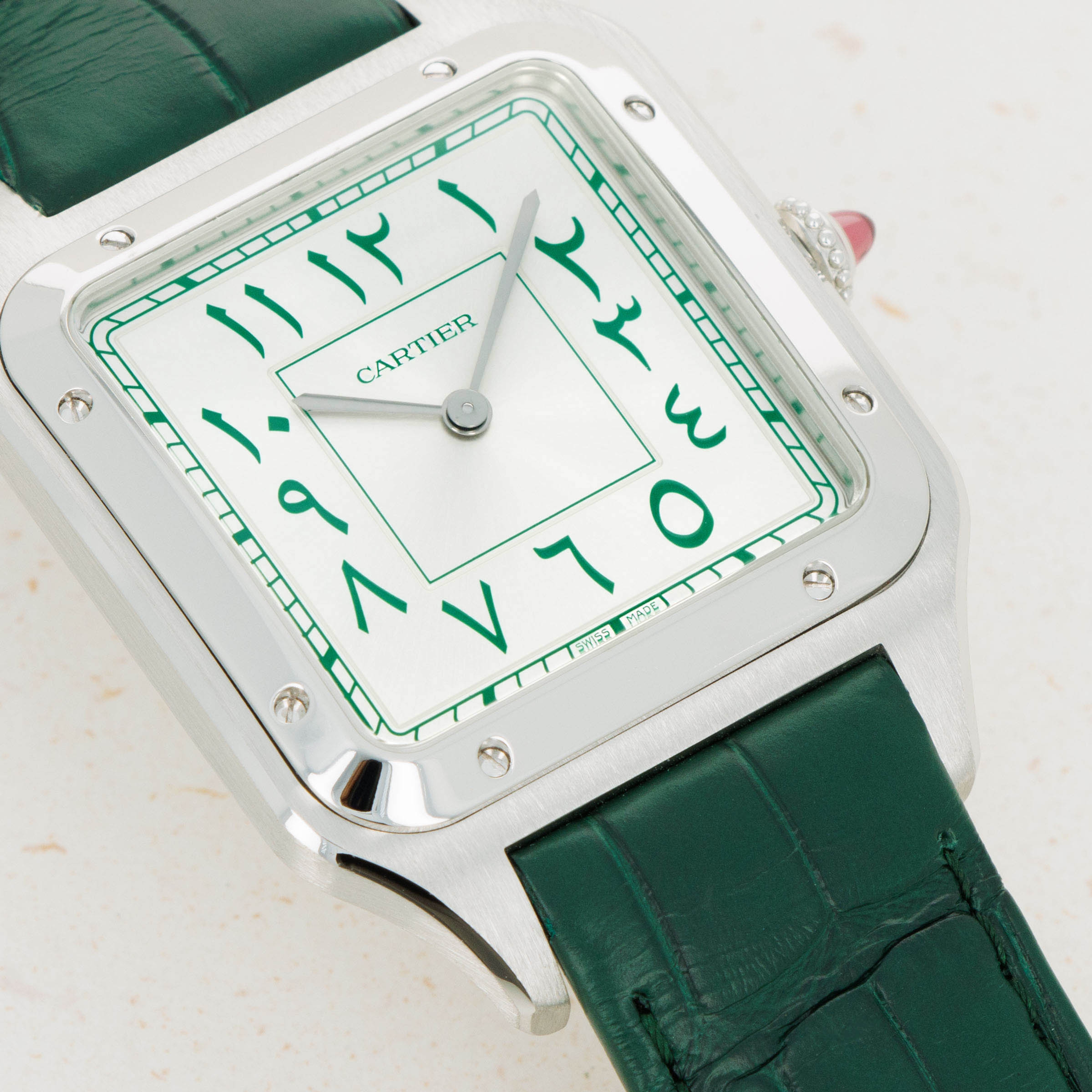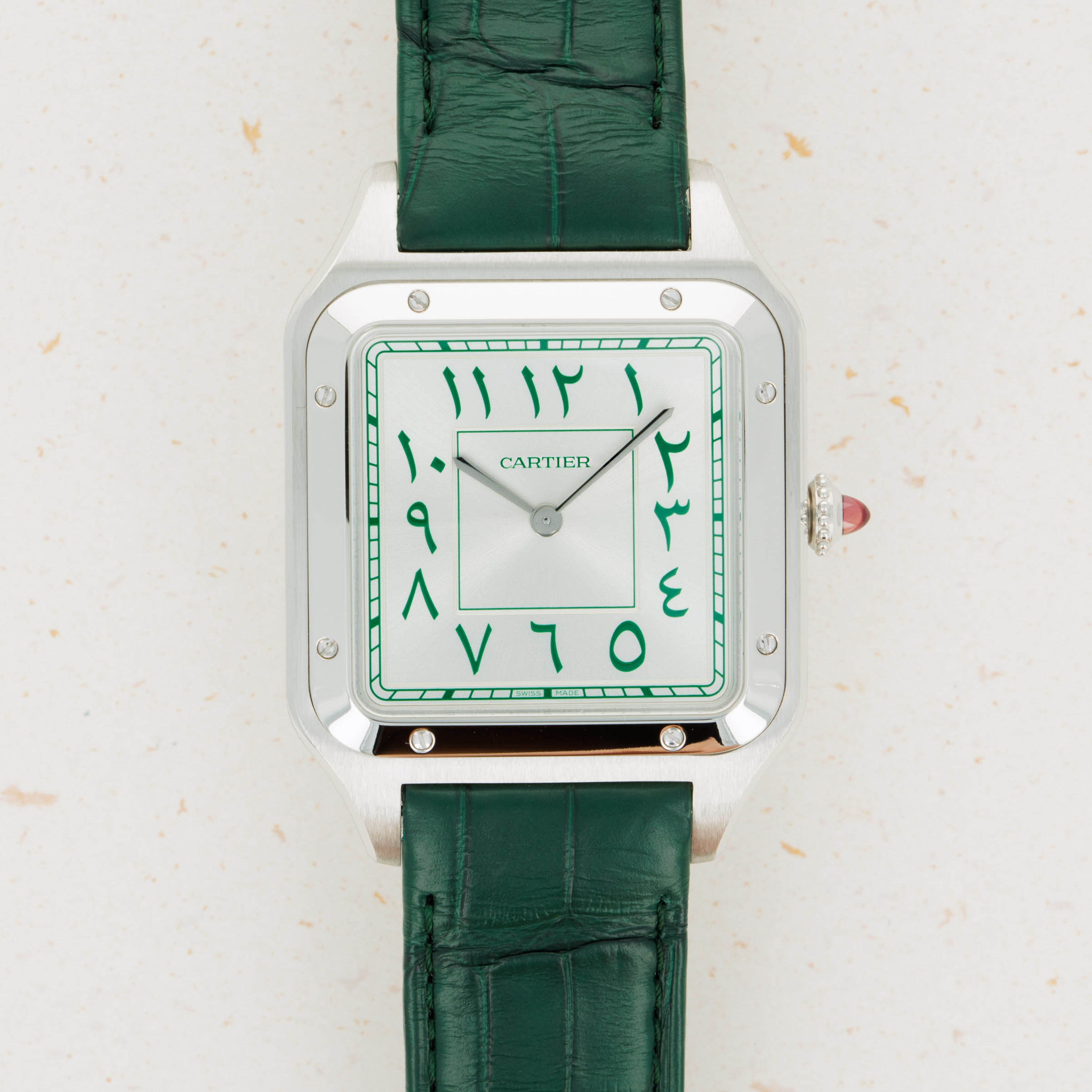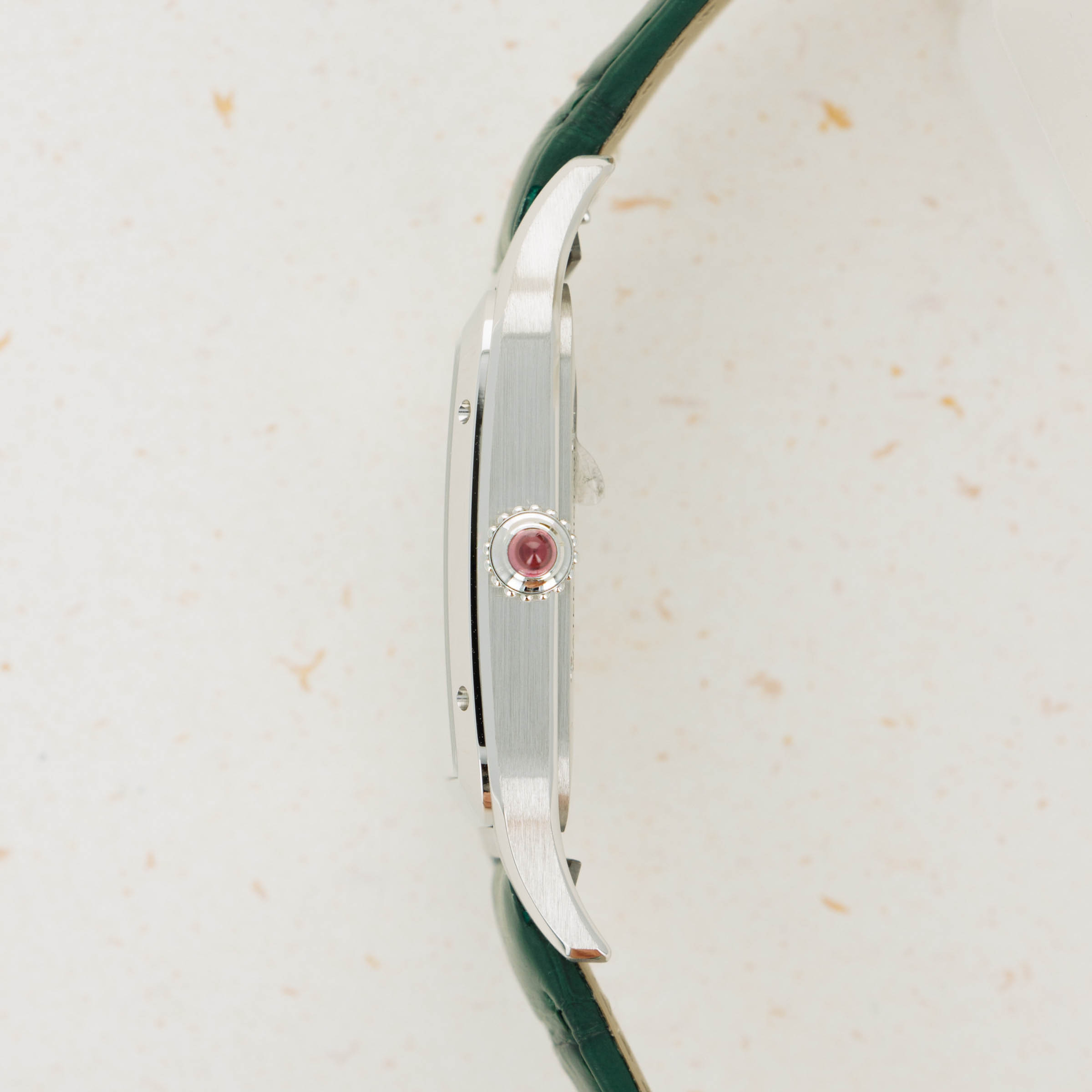 Imbued with Cartier's iconic design and its own heritage as the world's first tool watch, the Santos Dumont is important as the timepiece that set the entire industry as we know it today into motion. A limited-edition example of just 100 pieces, this variant tastefully pays homage to the Middle East through its platinum construction and tasteful use of green across its dial.