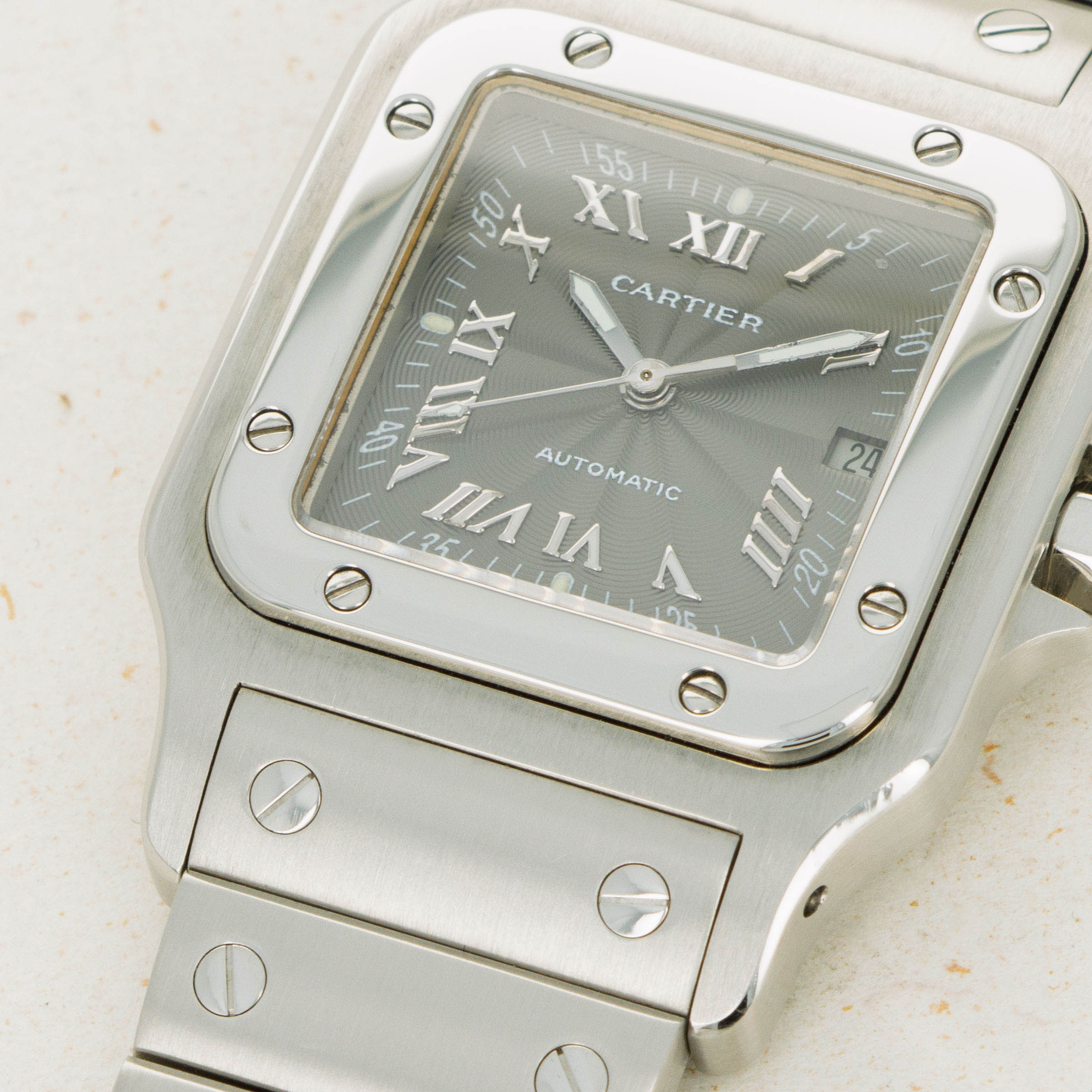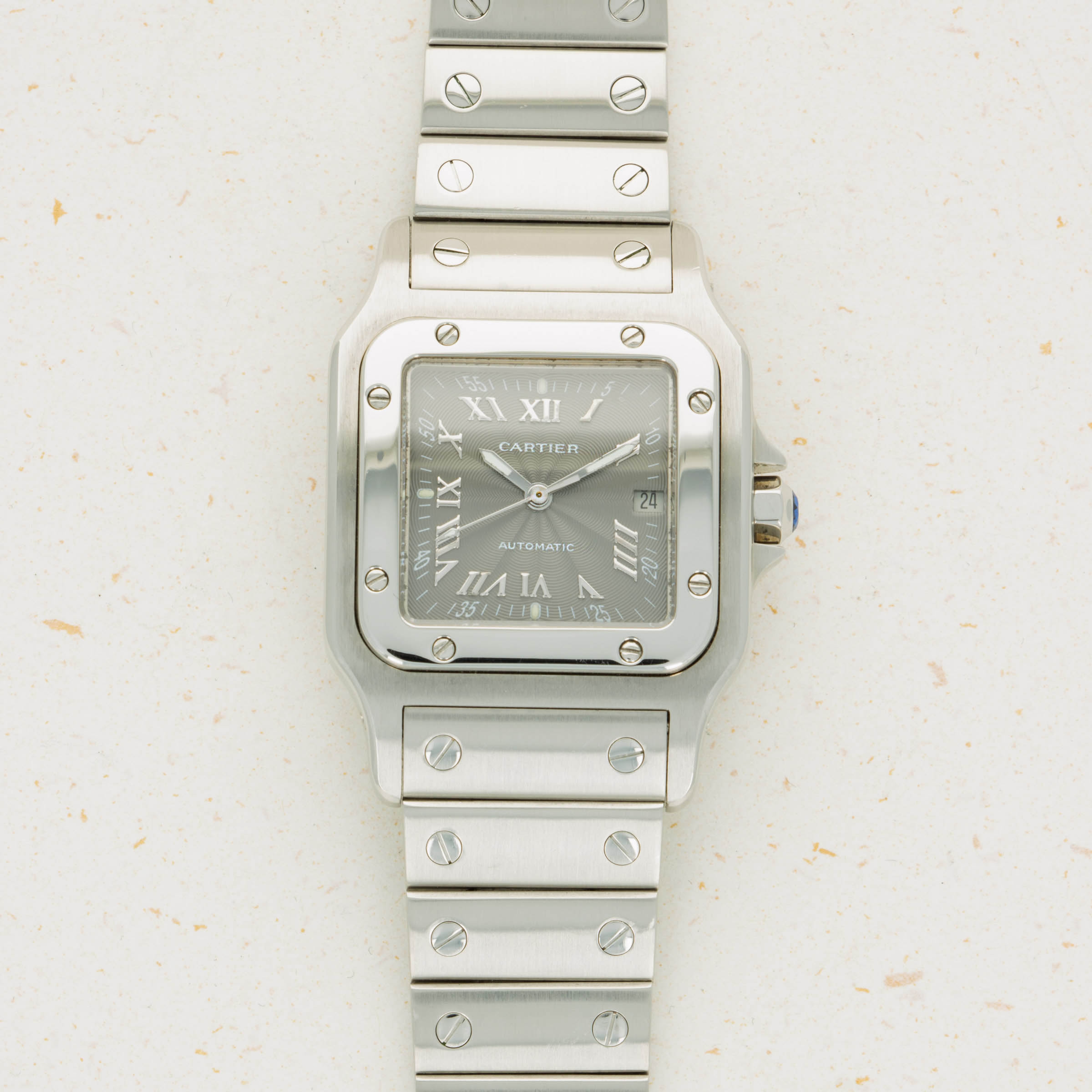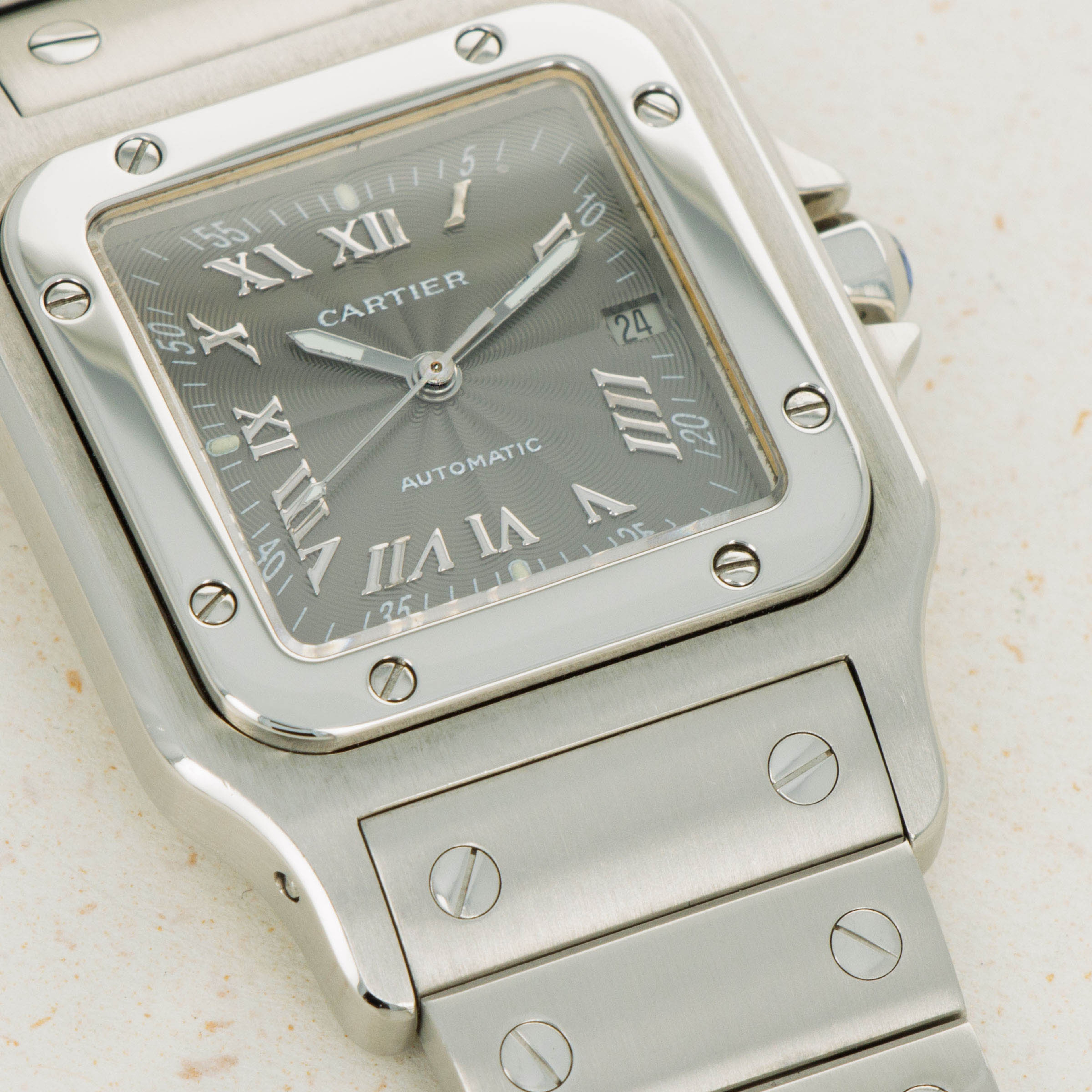 Offered as a monochromatic extension of the ref. 2319's stainless steel case, this example boasts a grey dial with rosette guilloche engraving, applied Roman numerals and Arabic numerals along its minute track, a rather rare sight for Cartier's timepieces.