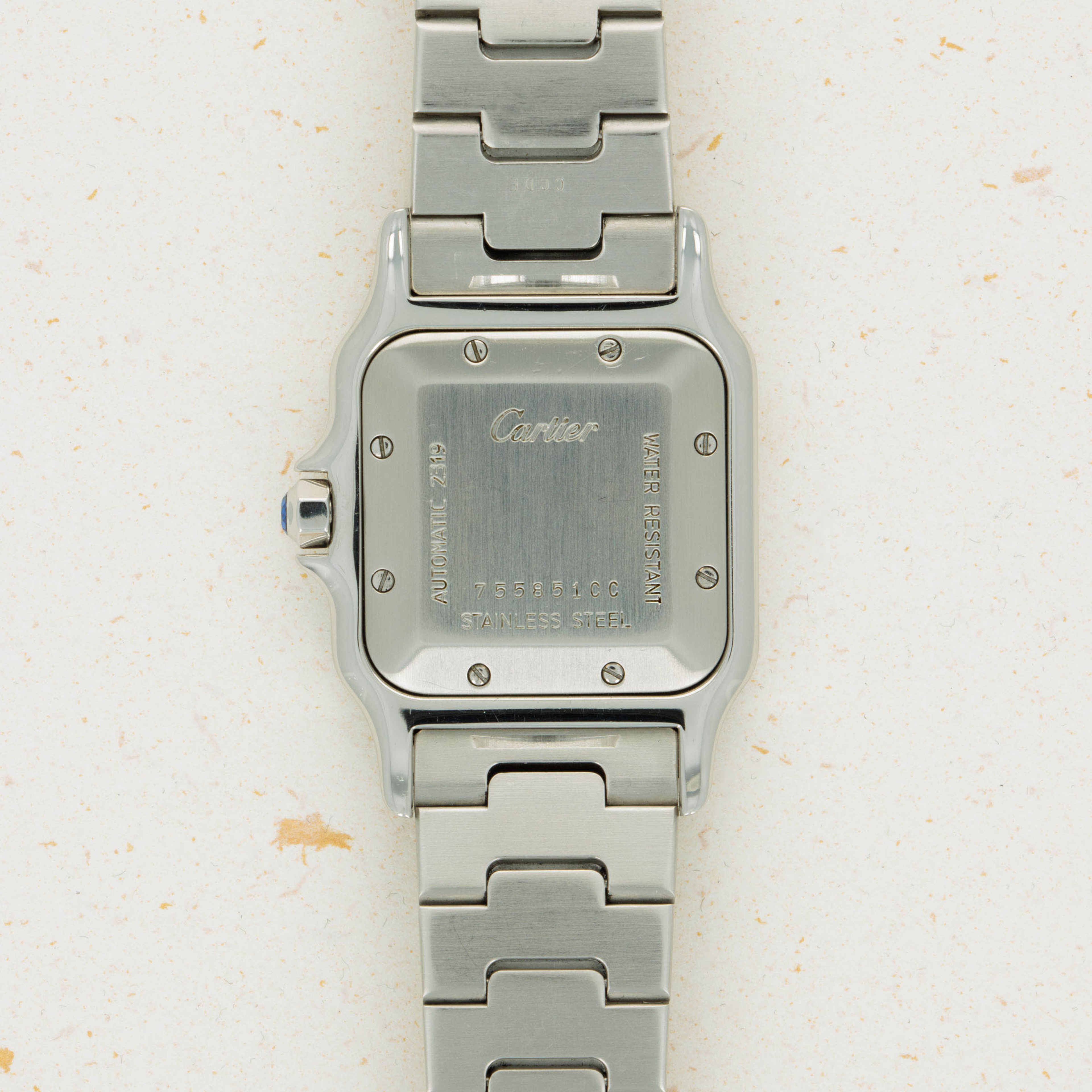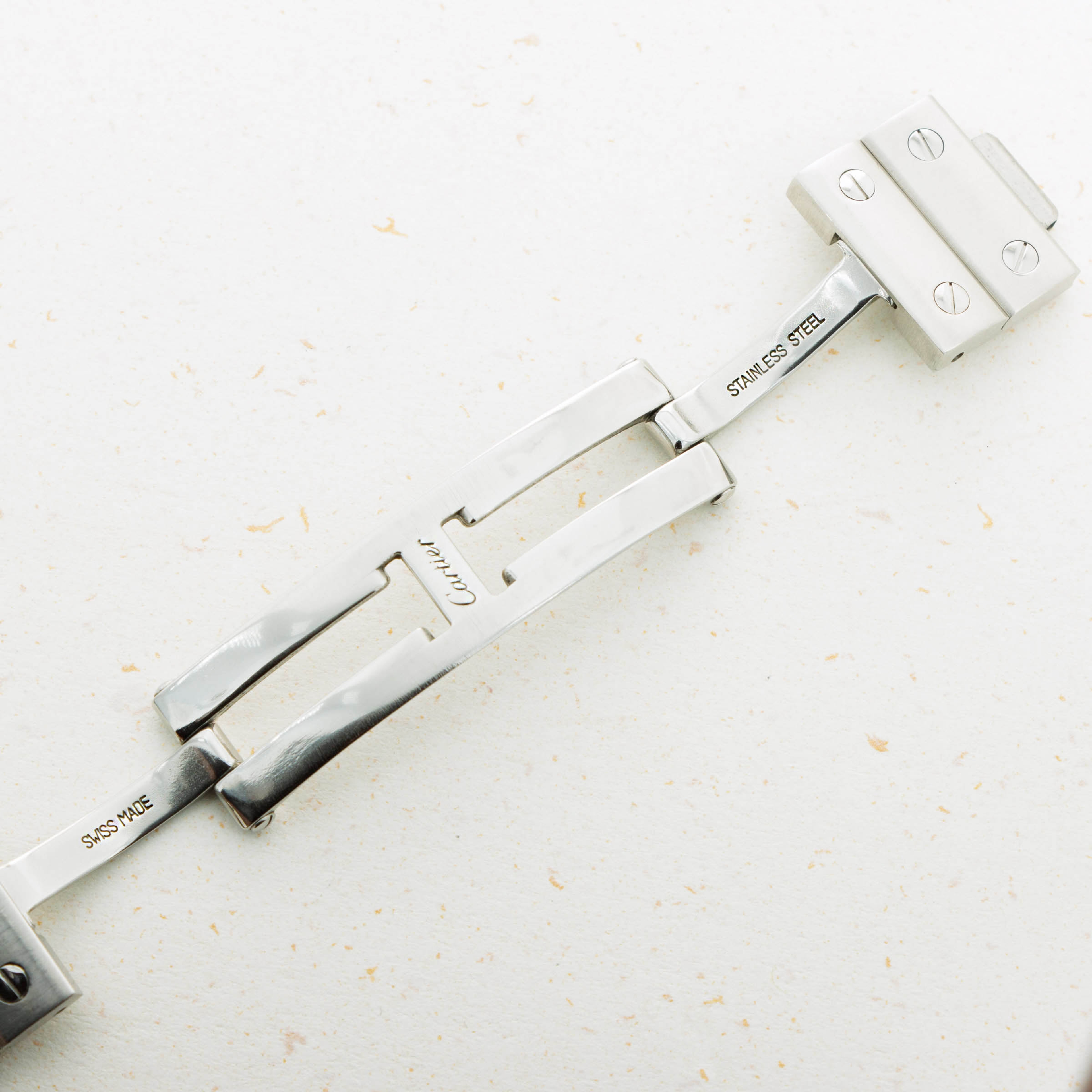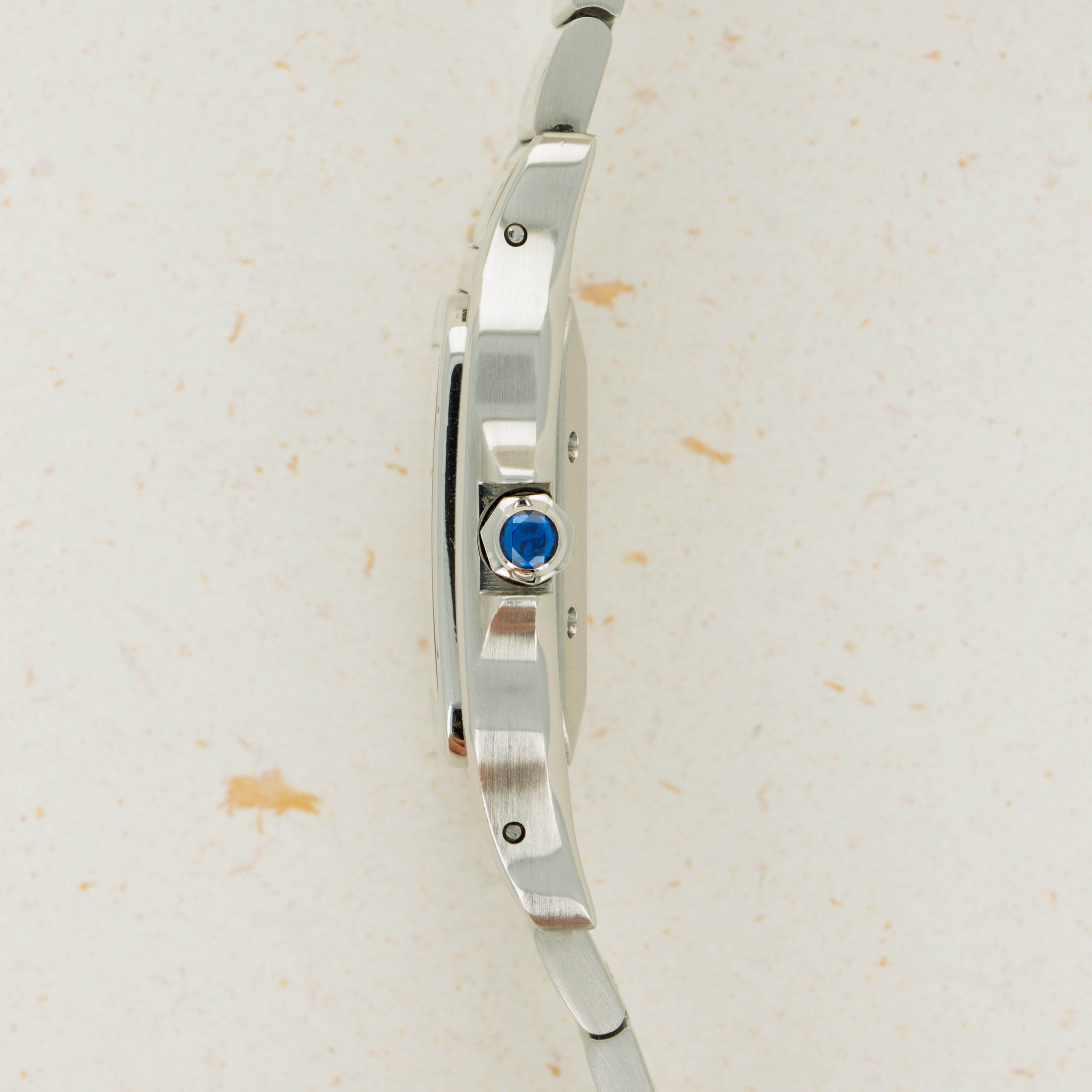 Offered as a monochromatic extension of the ref. 2319's stainless steel case, this example boasts a grey dial with rosette guilloche engraving, applied Roman numerals and Arabic numerals along its minute track, a rather rare sight for Cartier's timepieces.