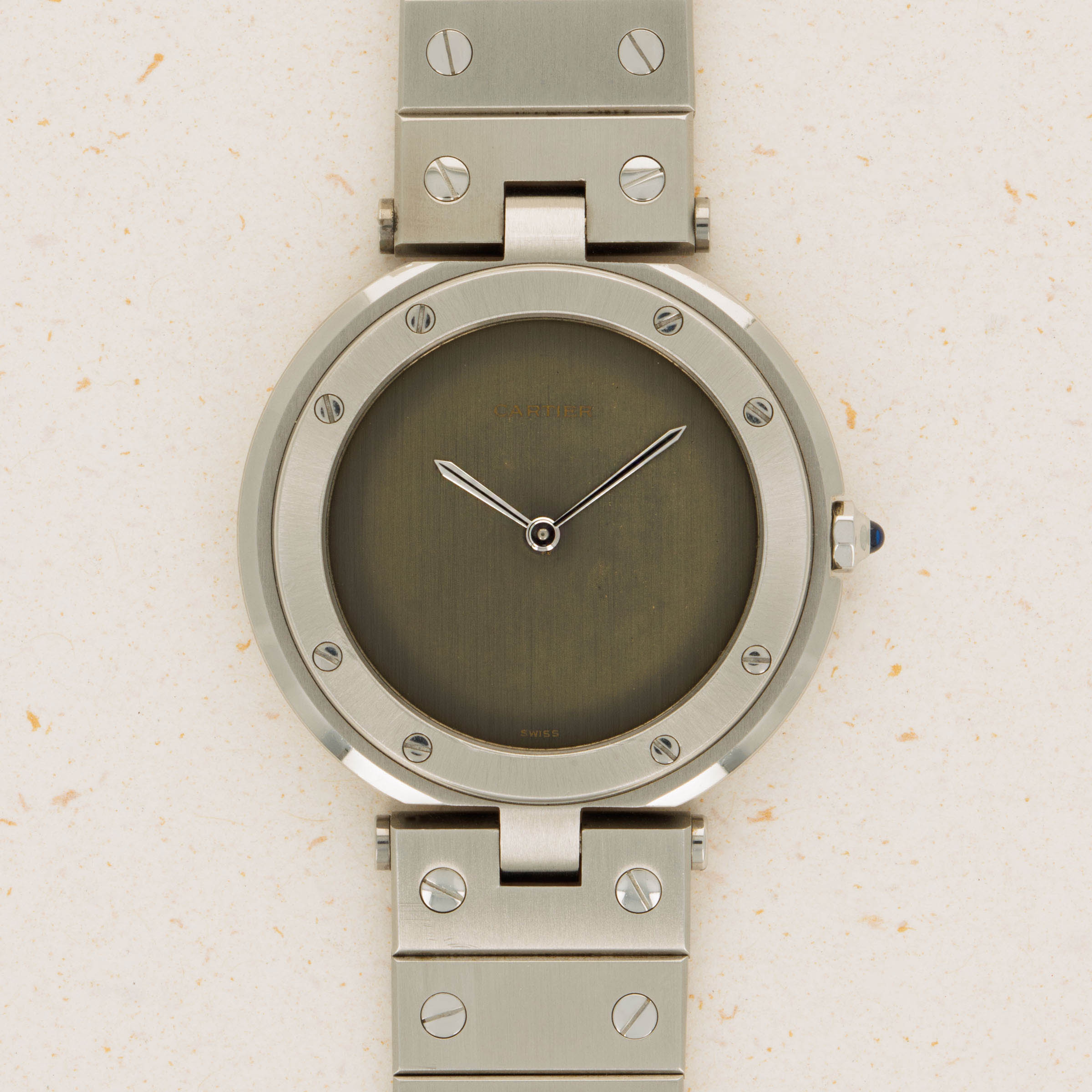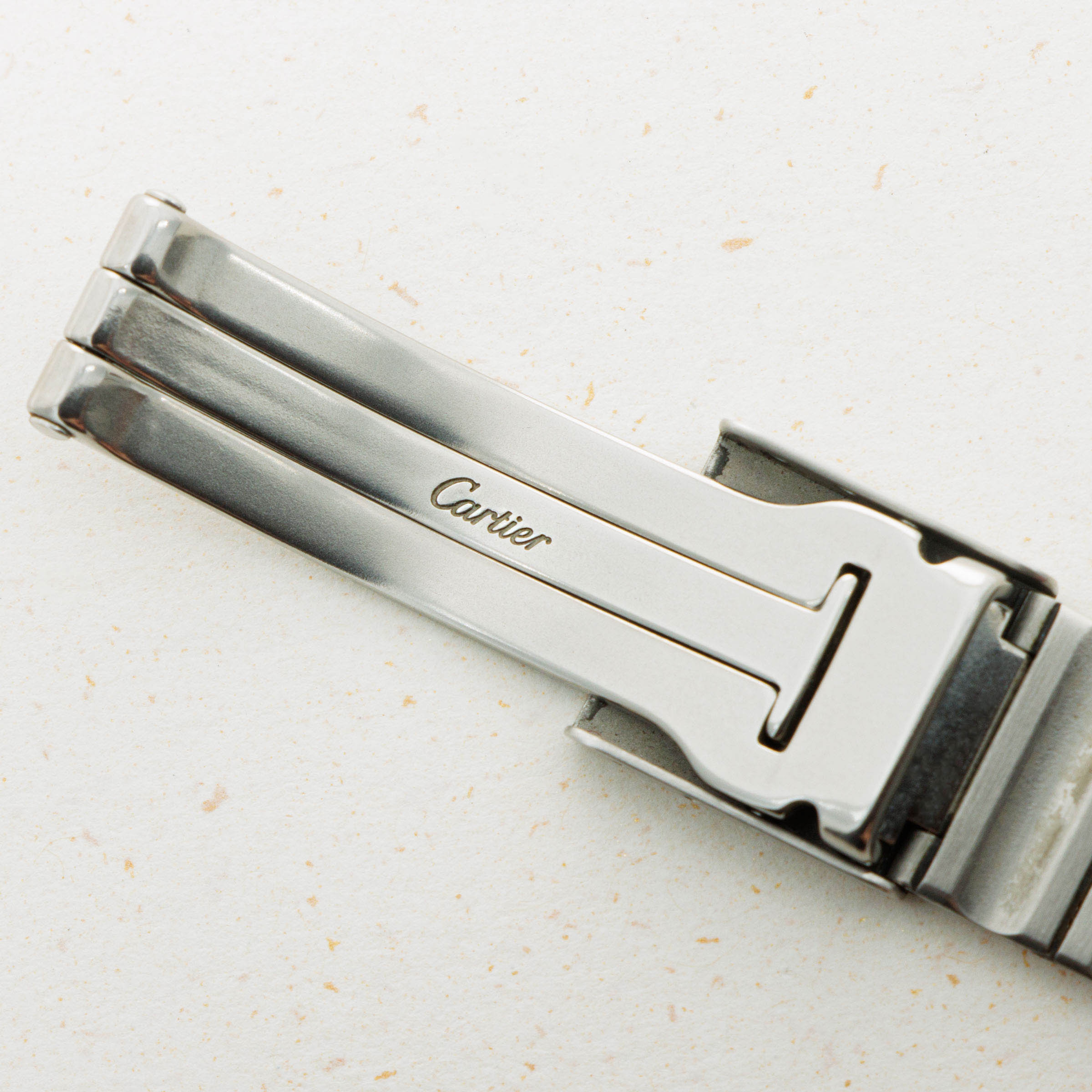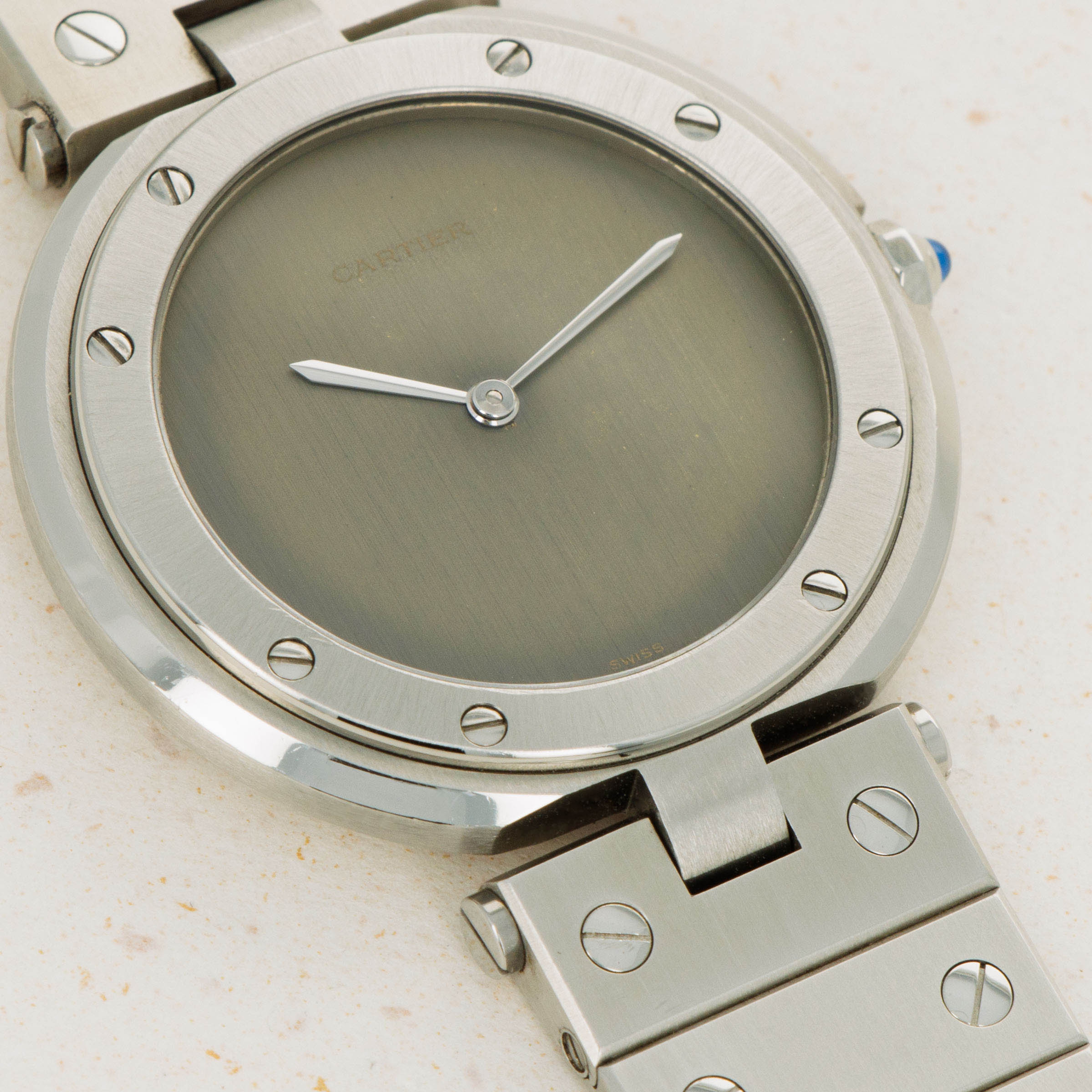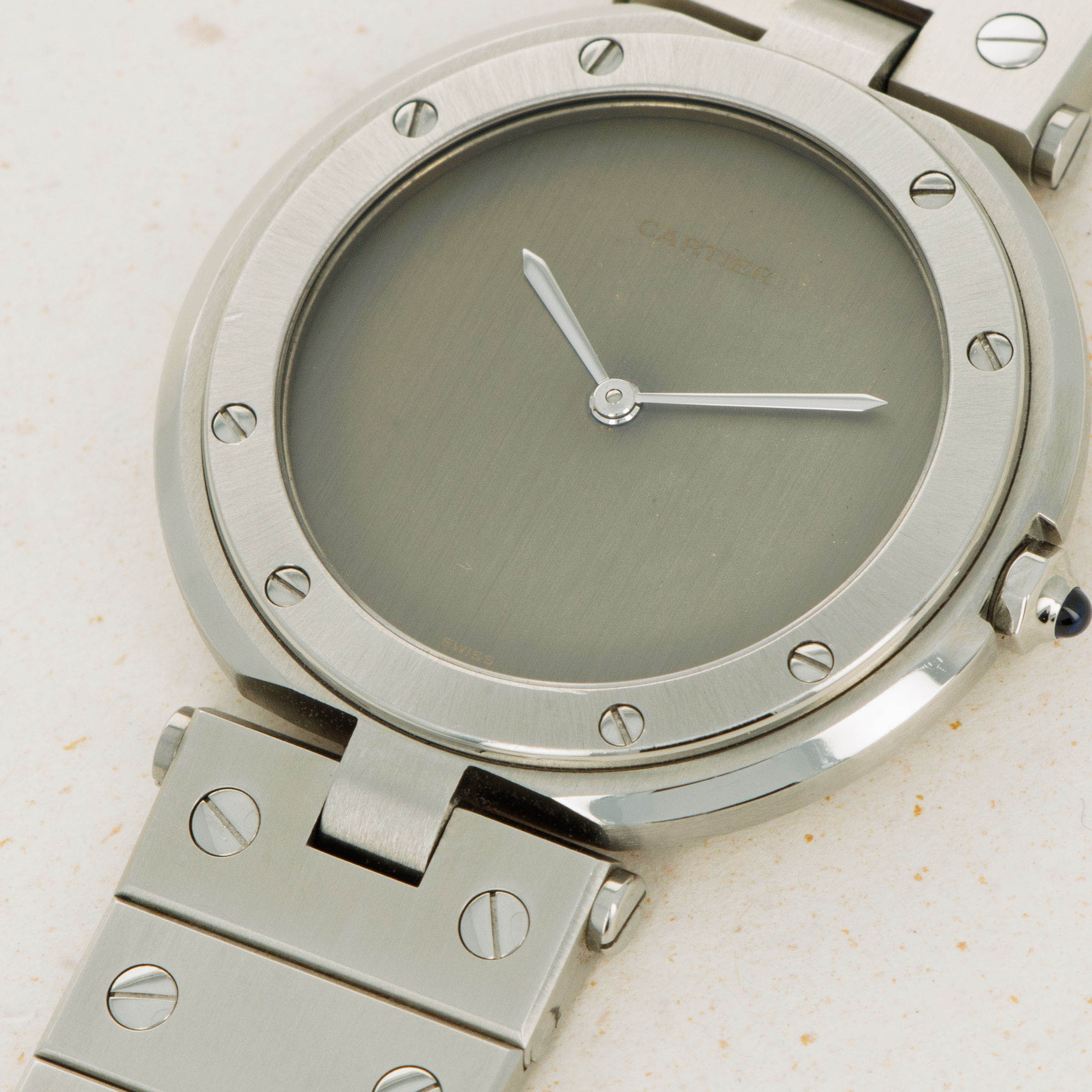 Featuring a grey dial with a vertical satin finish that matches the all-stainless steel construction, this example's perfectly monochromatic aesthetic is disrupted only by the subtle golden Cartier signature at 12 o'clock and the Swiss indication at 6 o'clock.