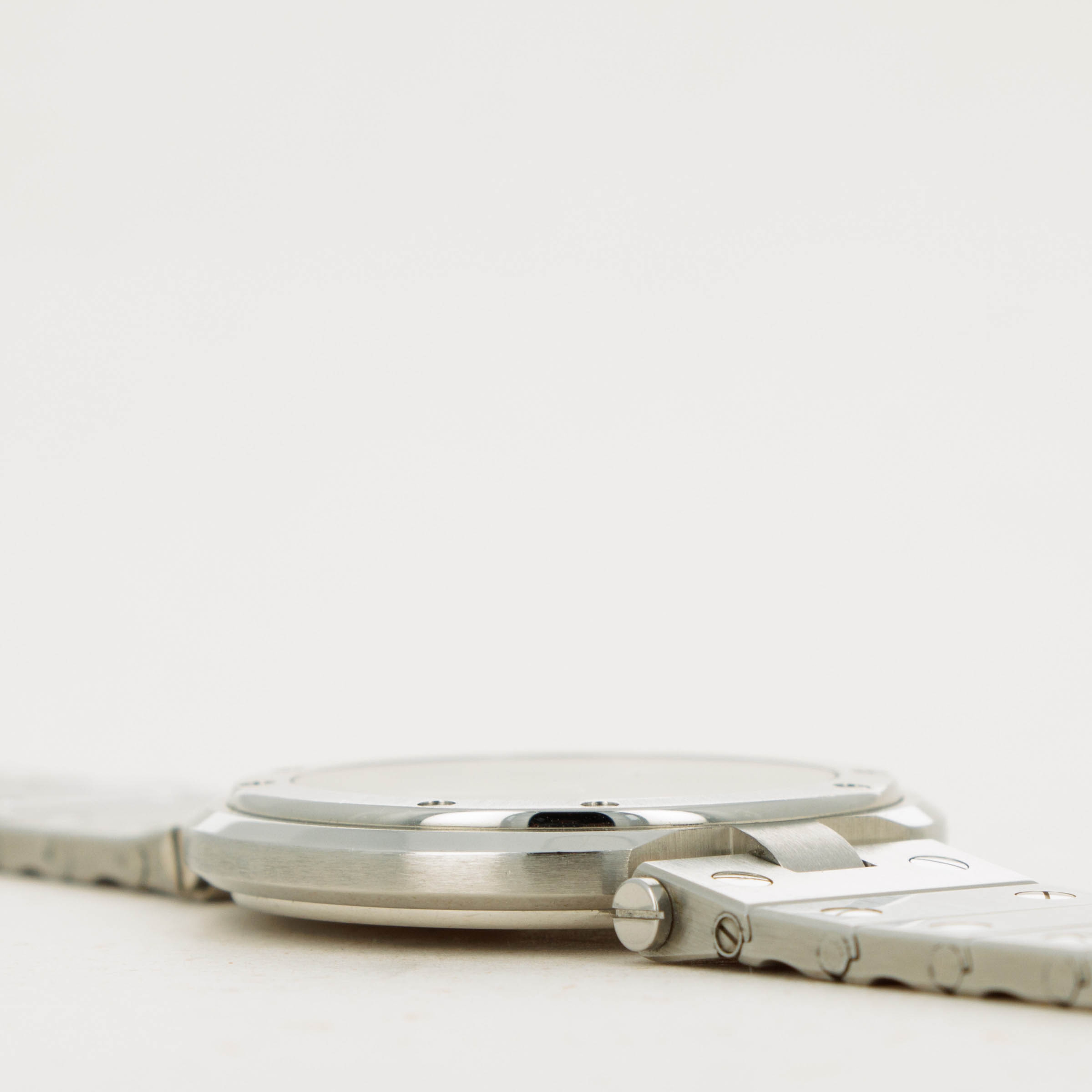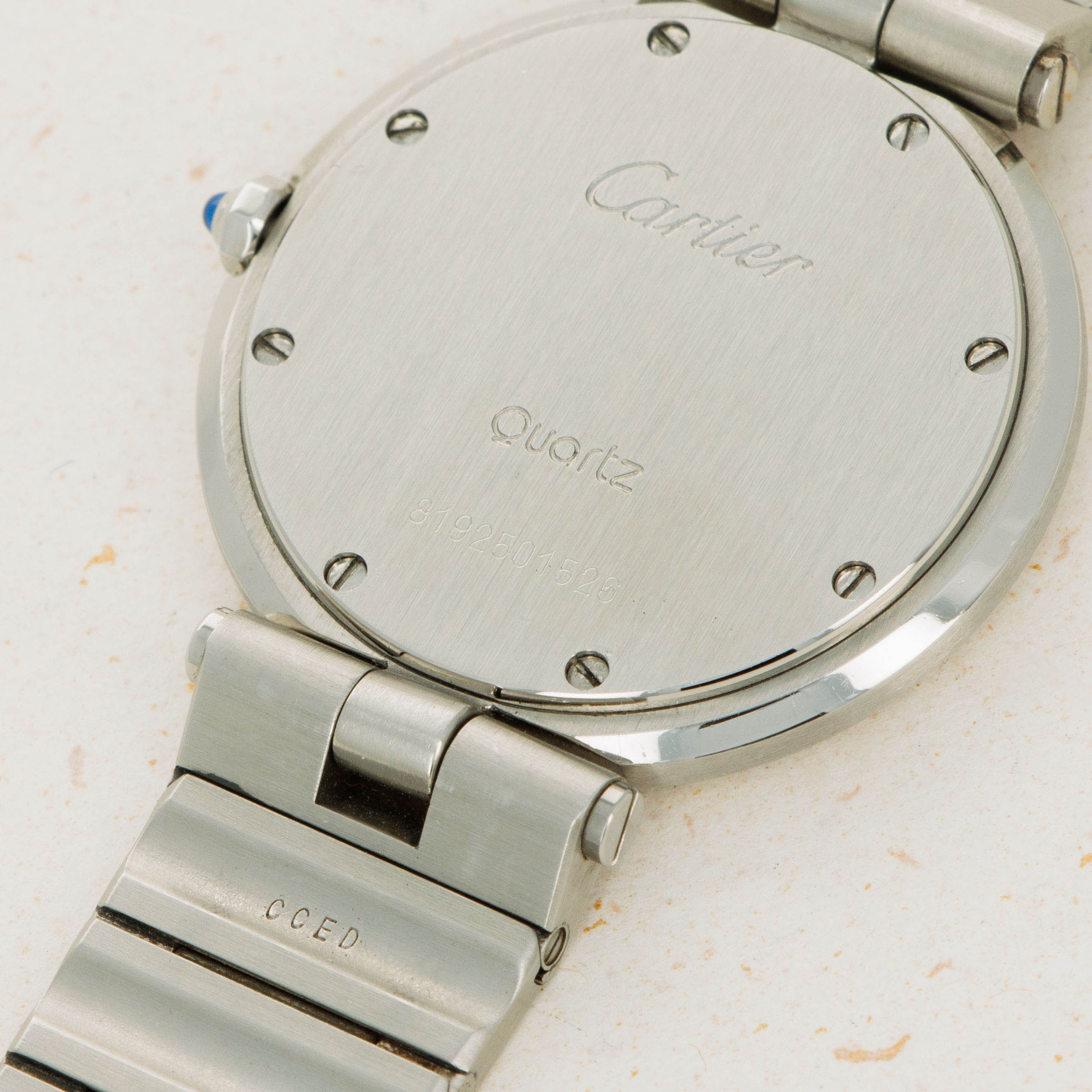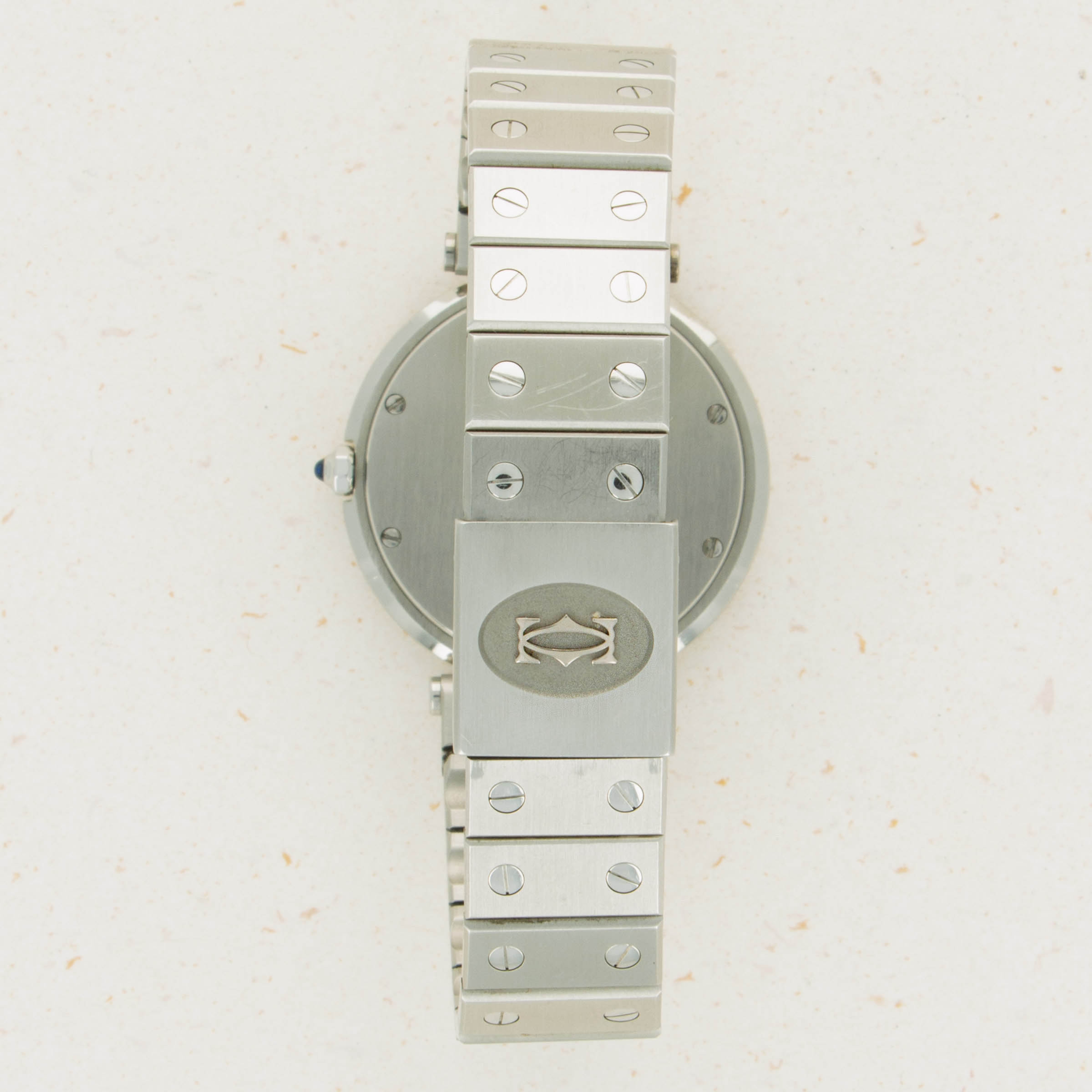 Featuring a grey dial with a vertical satin finish that matches the all-stainless steel construction, this example's perfectly monochromatic aesthetic is disrupted only by the subtle golden Cartier signature at 12 o'clock and the Swiss indication at 6 o'clock.