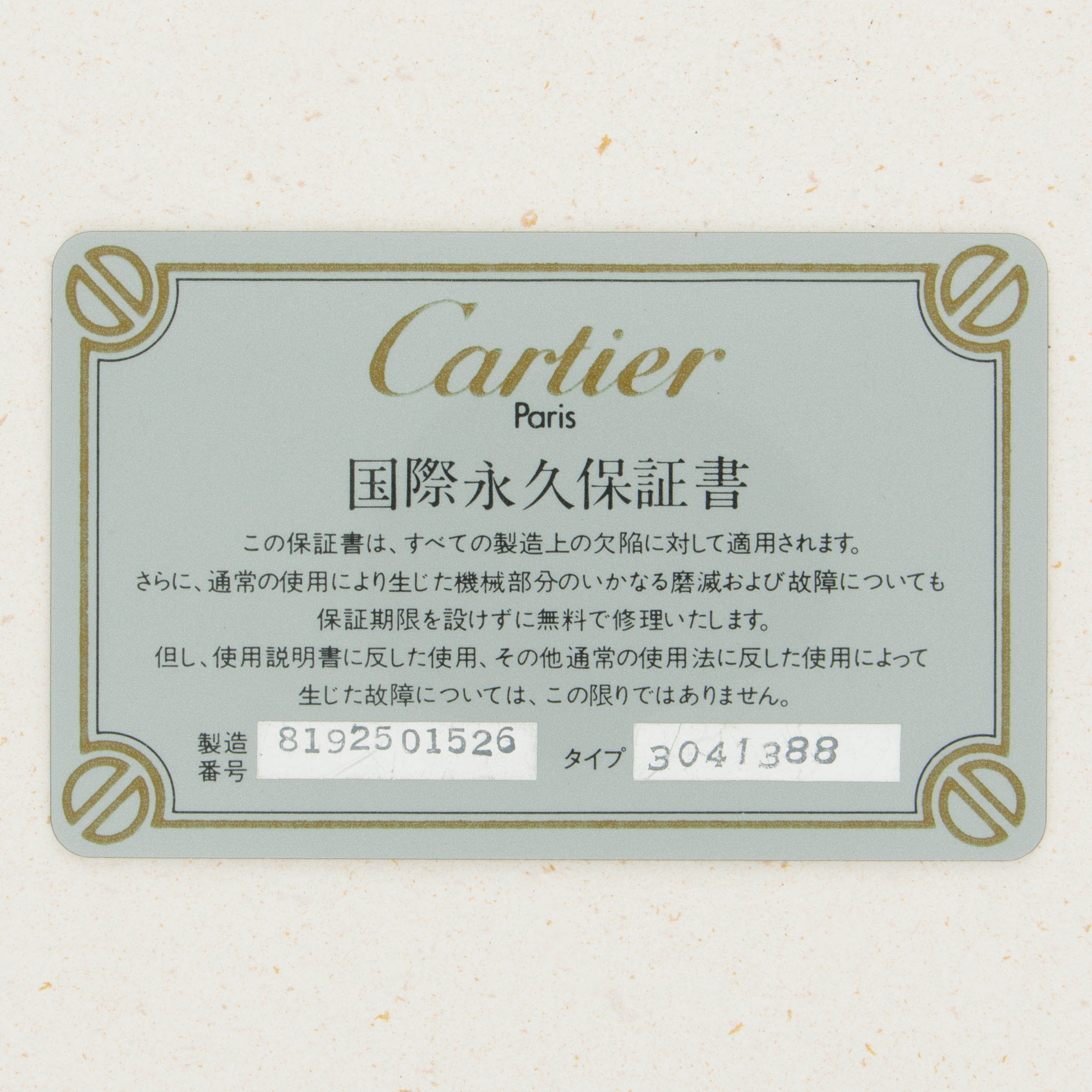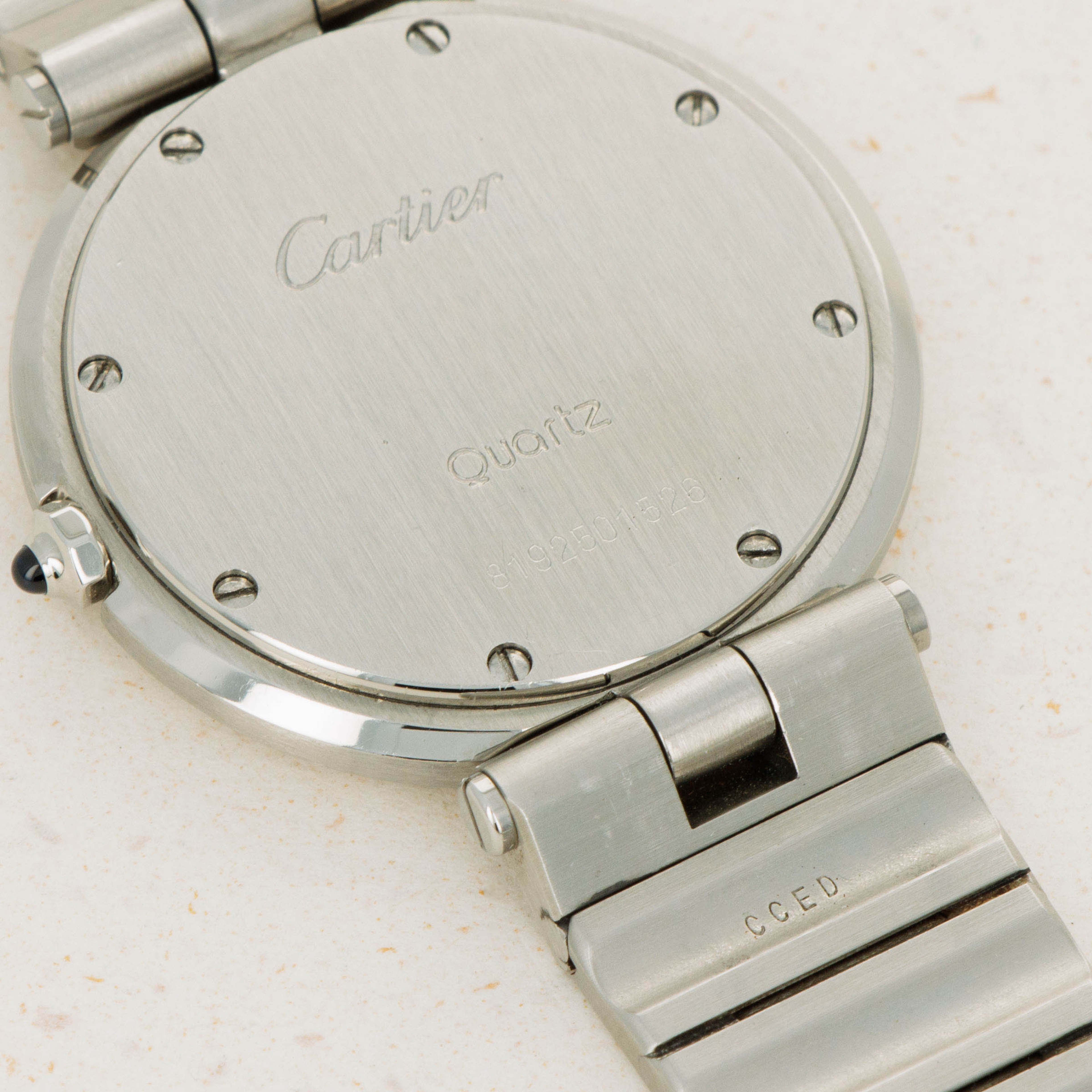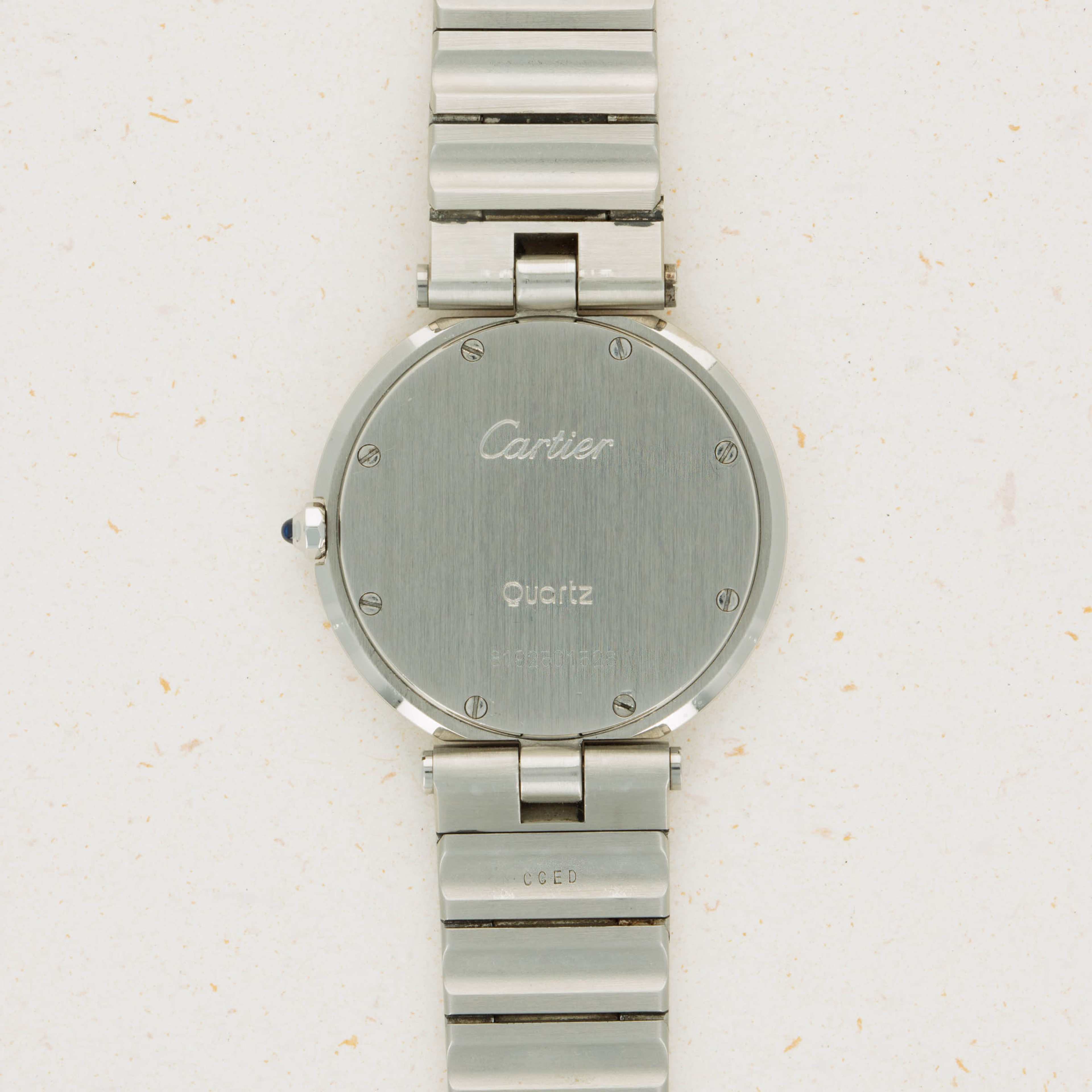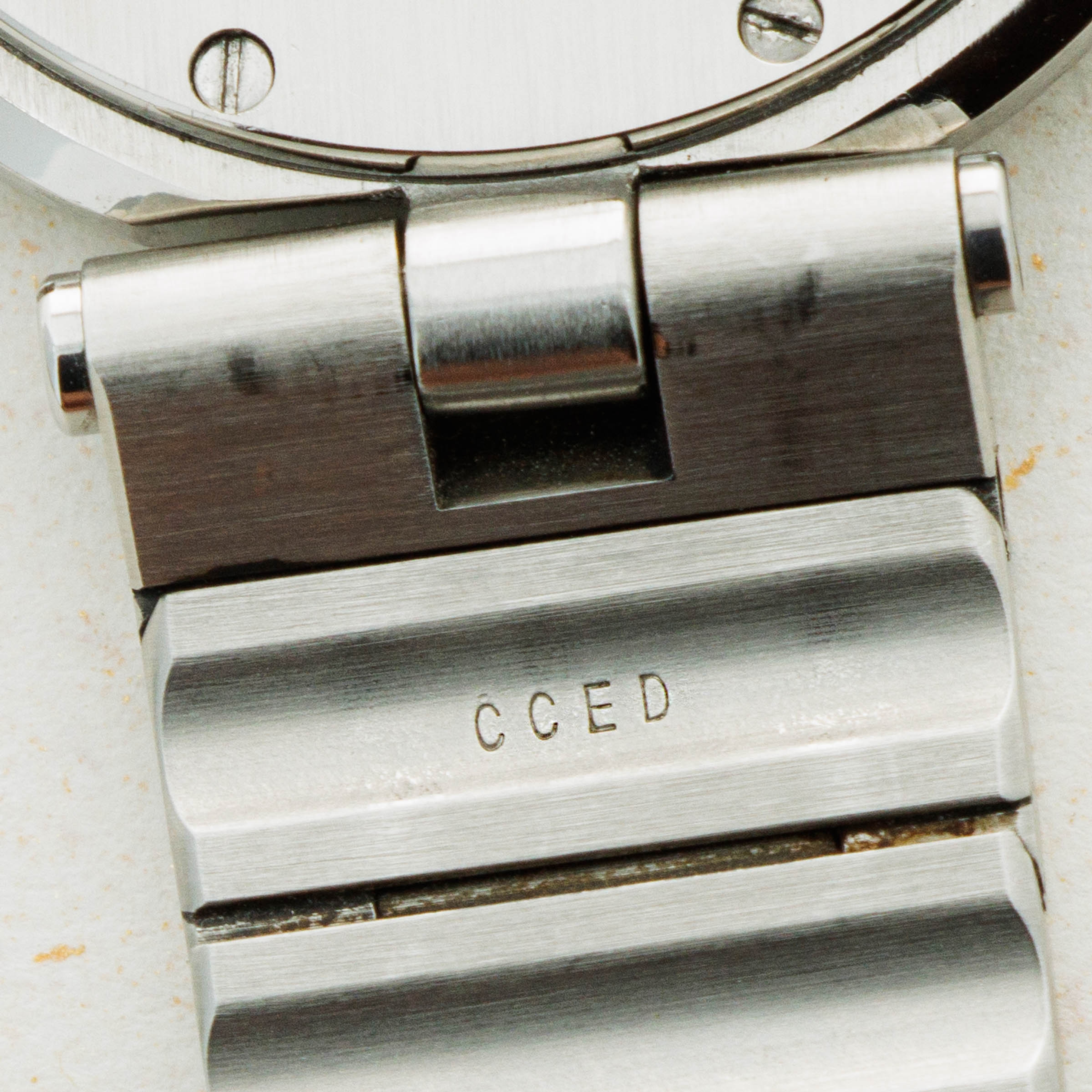 Featuring a grey dial with a vertical satin finish that matches the all-stainless steel construction, this example's perfectly monochromatic aesthetic is disrupted only by the subtle golden Cartier signature at 12 o'clock and the Swiss indication at 6 o'clock.