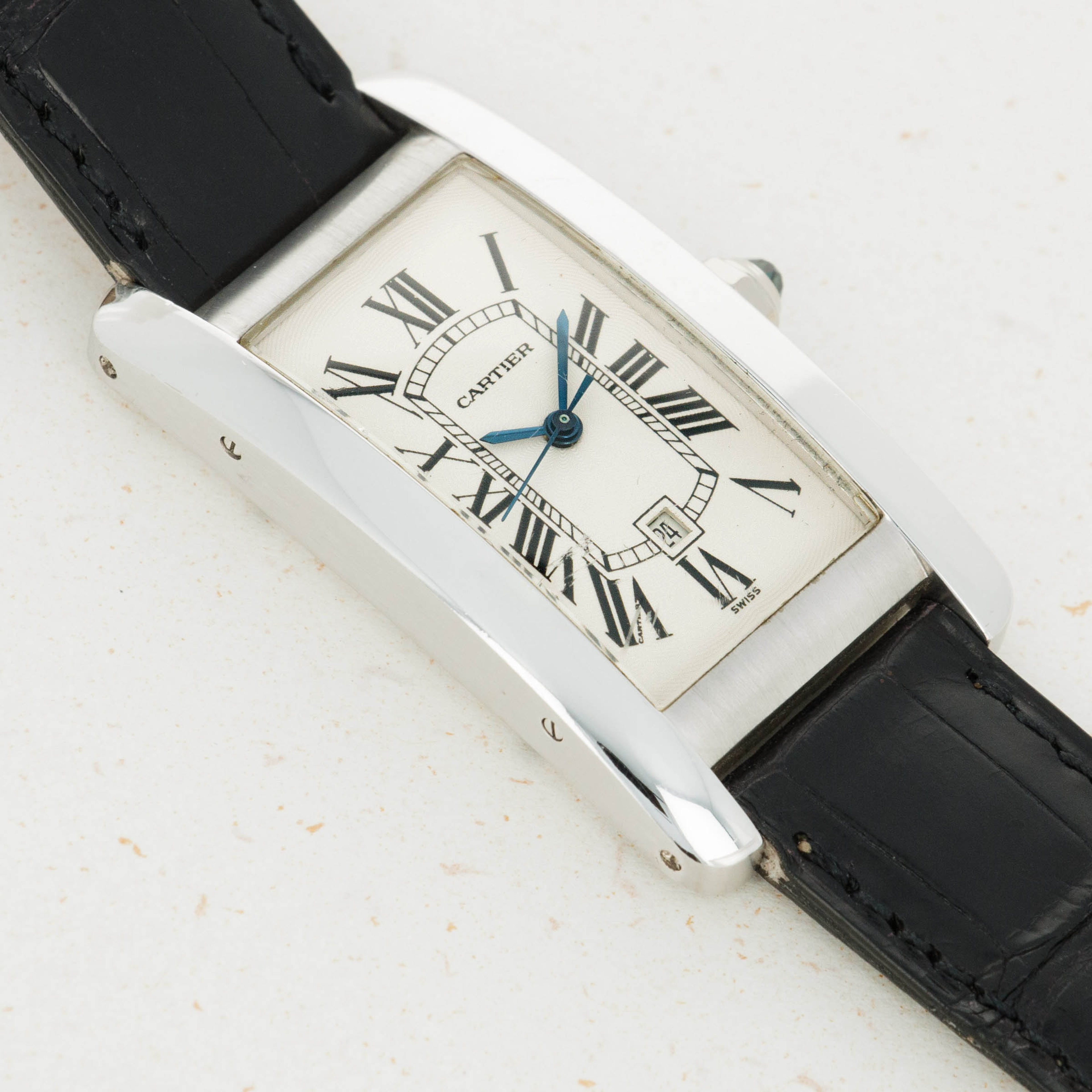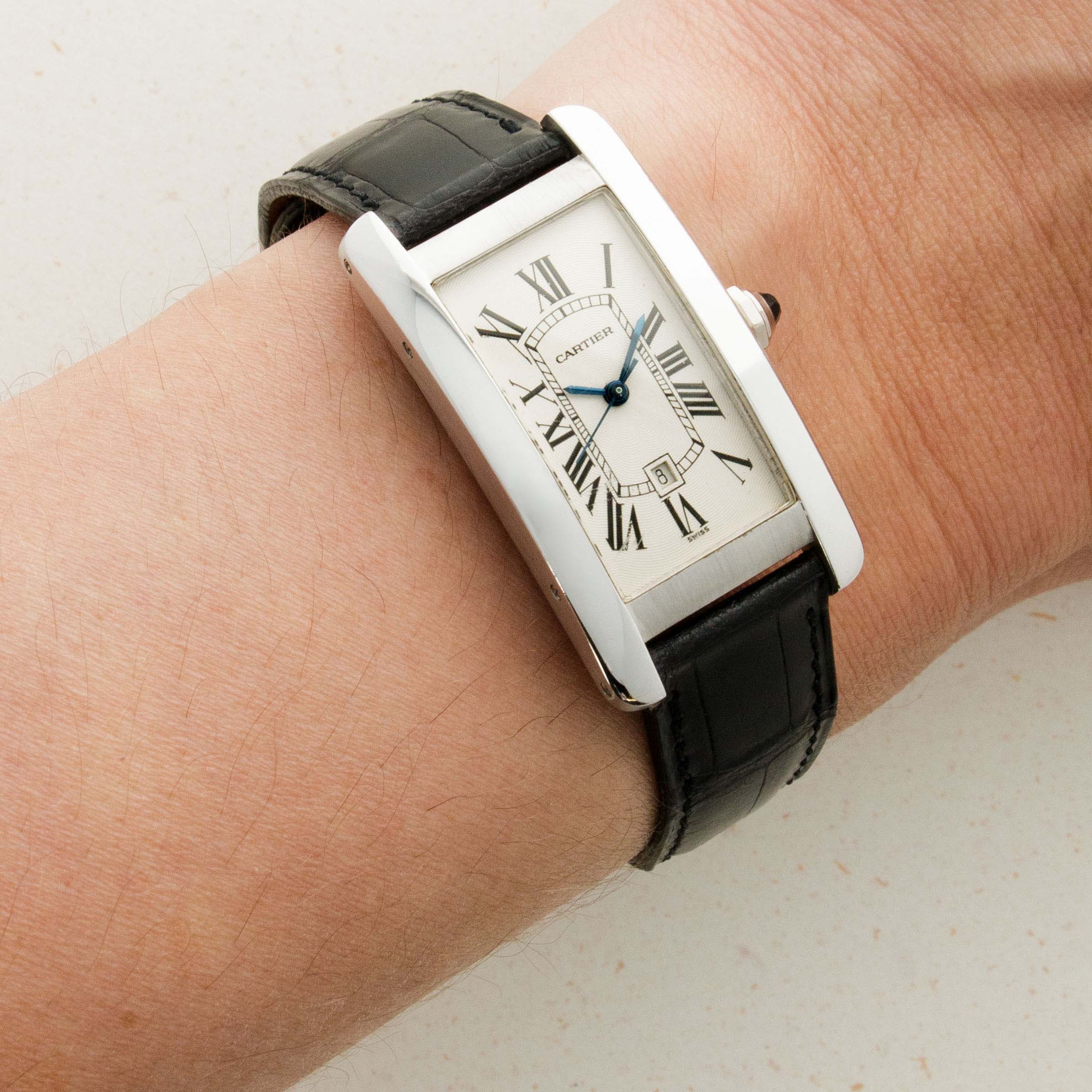 An iconic piece of Cartier's signature aesthetic, the Tank Americaine features the French watchmaker's legendary white dial with black Roman numerals, blued steel hands, and a railroad-style minute track.