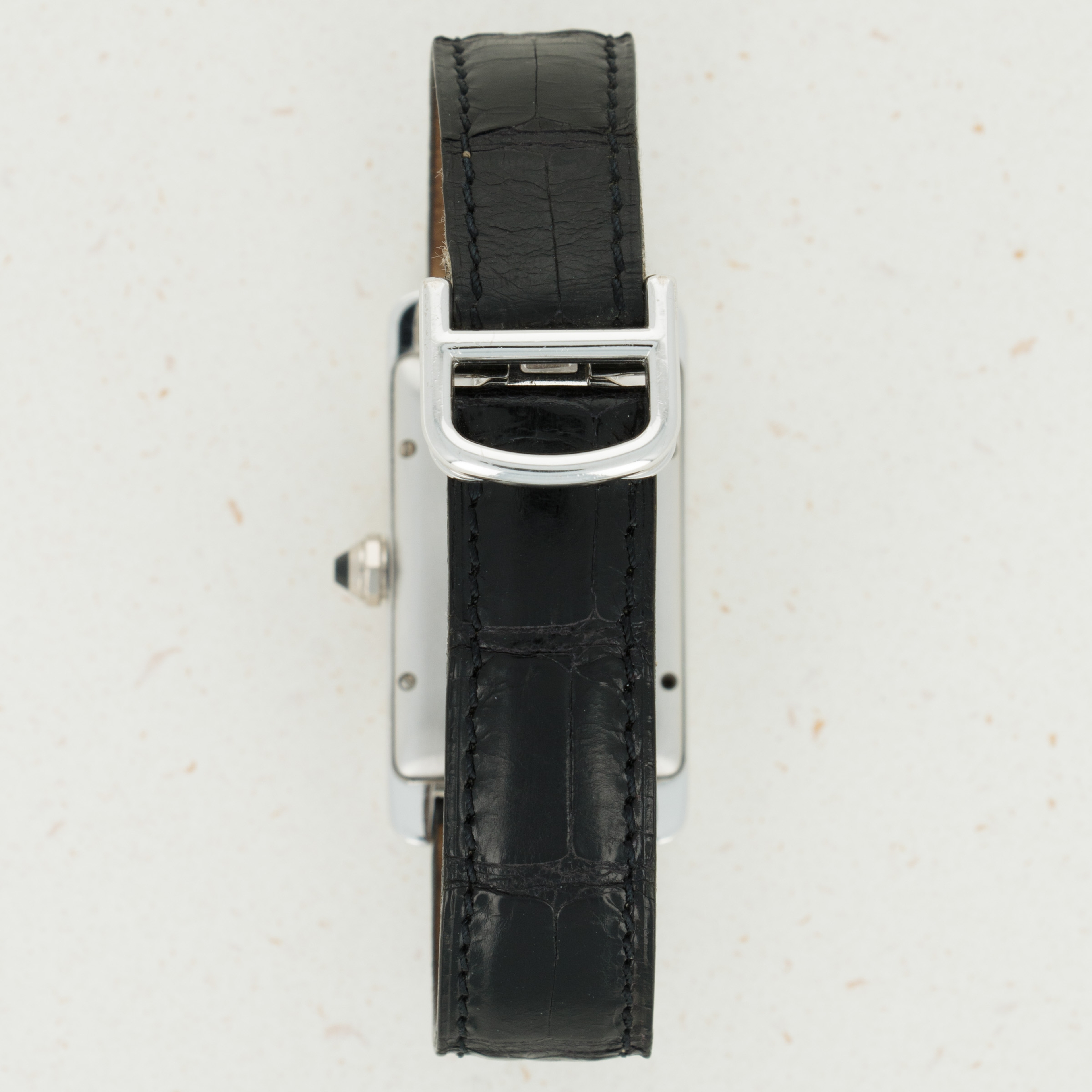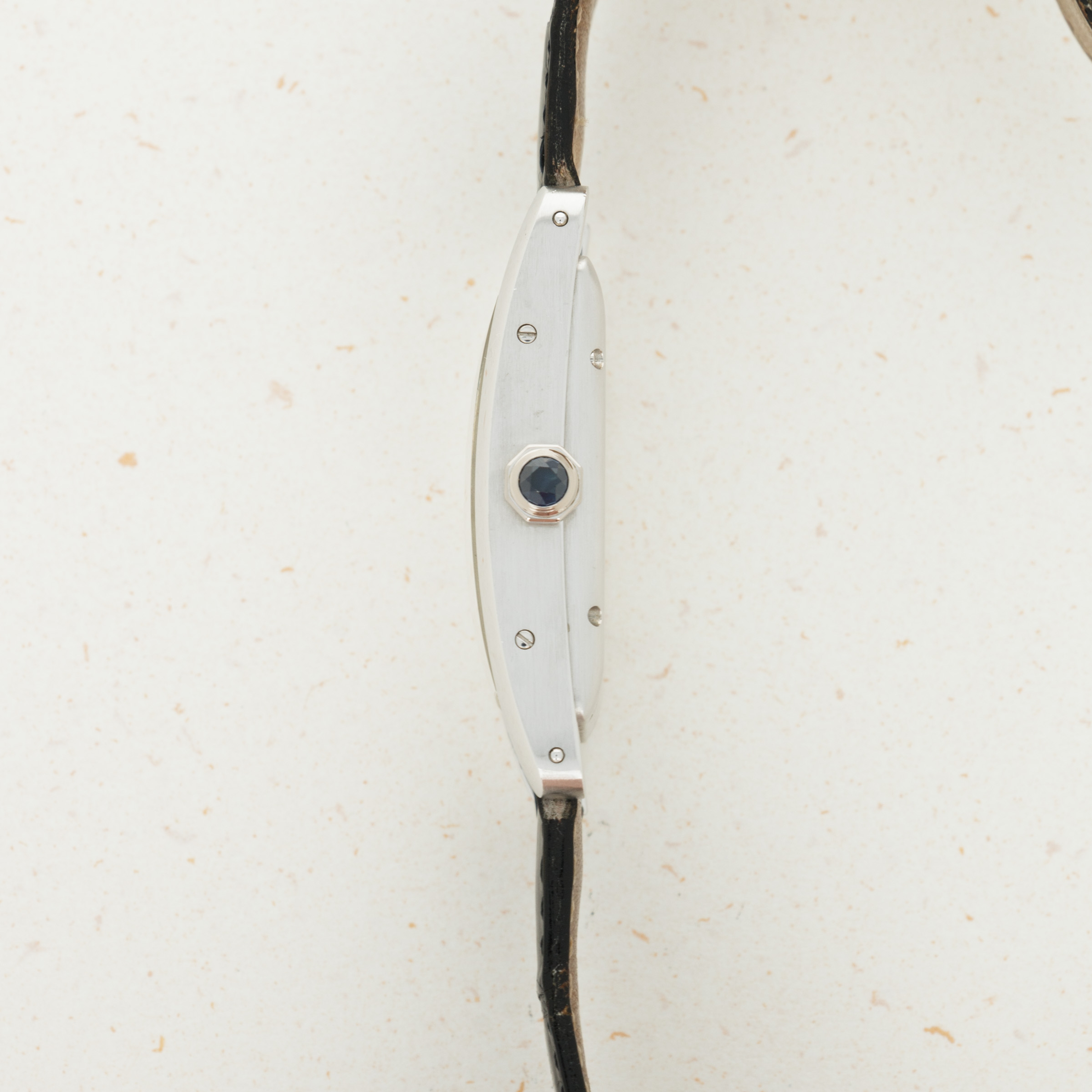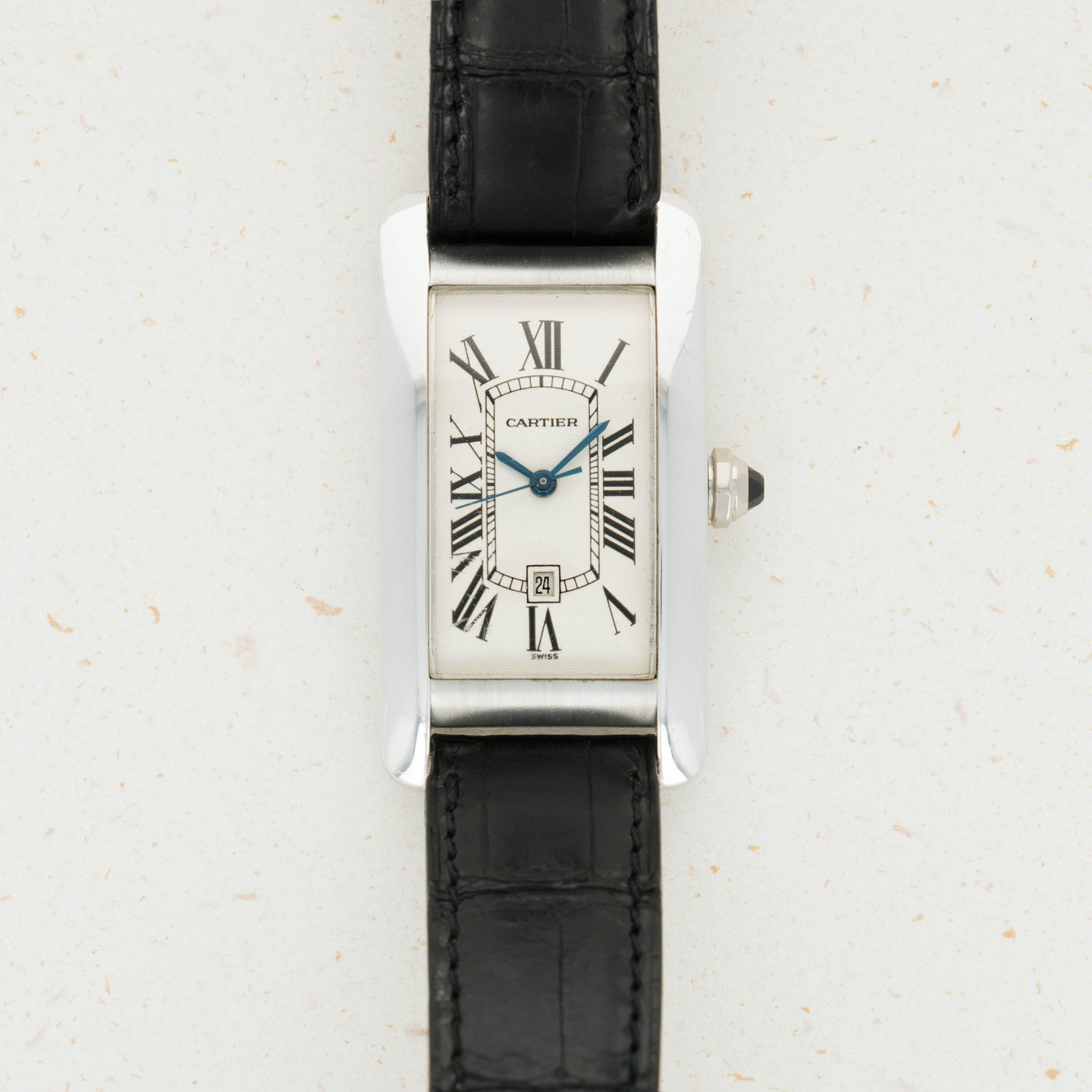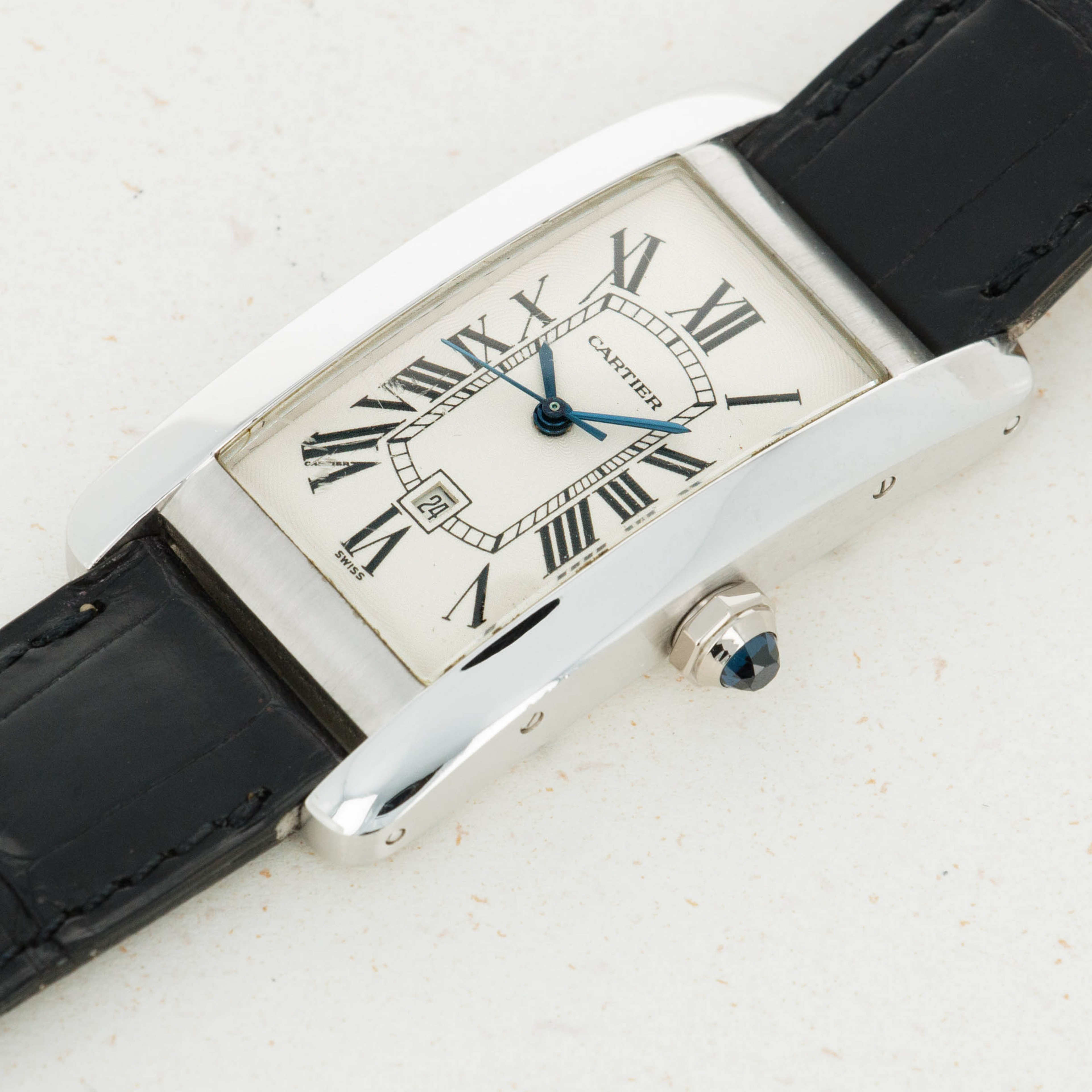 With its distinctive banana-shaped case and sapphire cabochon-set crown, the Tank Americaine has a distinctive presence on the wrist that adds to its iconic aesthetic.