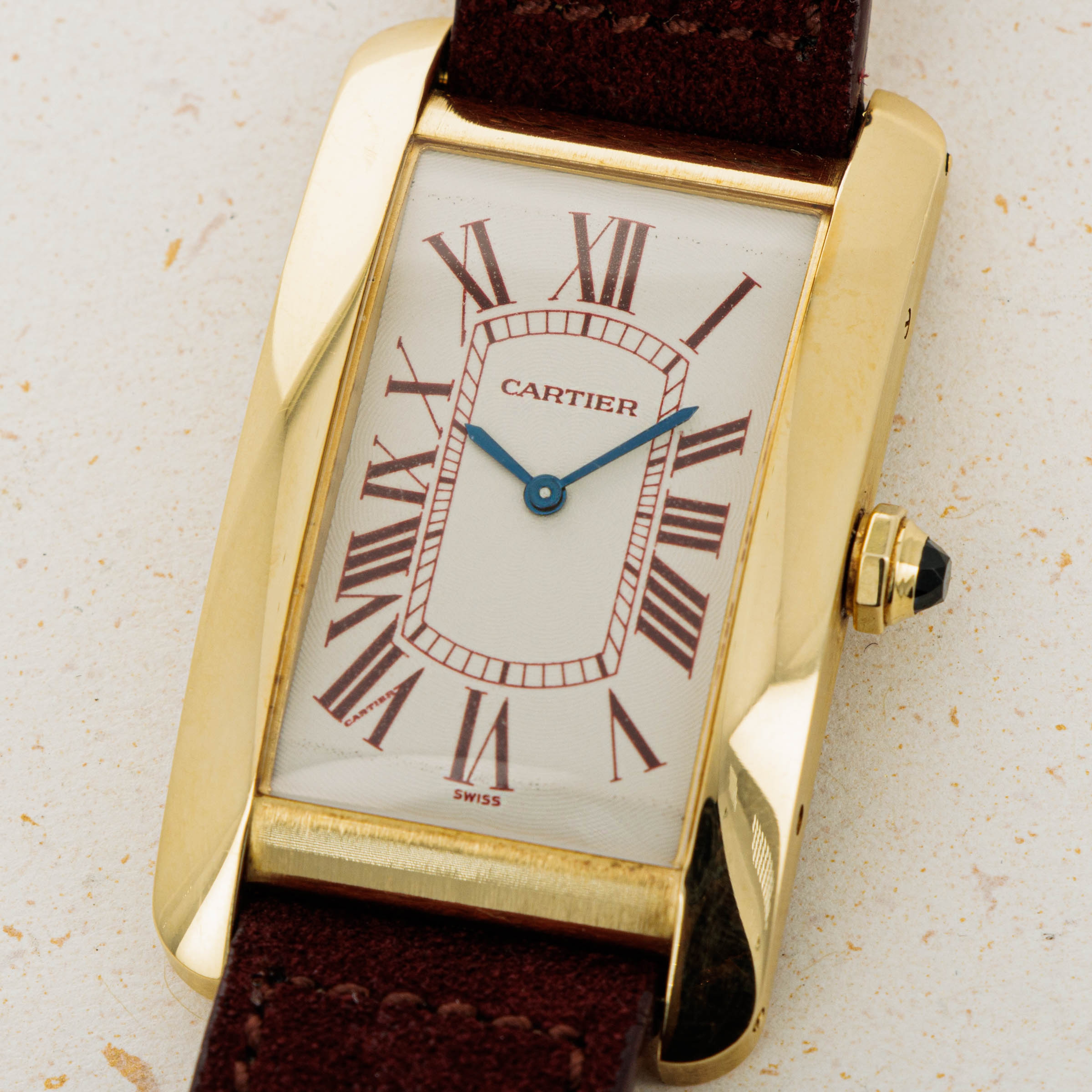 In 1917, Louis Cartier introduced the Tank- which has arguably become the brand's most iconic model. It is storied that the first prototype Tank was presented to the US General John Pershing a year later. Since then, Cartier has created many versions of the Tank design, including but not limited to, the Tank Louis, Tank Cintrée, and Tank Normale. The Tank Americaine was introduced in 1989 and immediately became a classic. Inspired by the lines of the Tank Cintrée, the Americaine features a slightly bolder and more athletic profile with an elongated case that curves rather dramatically with the curve of the wrist. Launched in the late 1990s as one of the few manual-wind Tank Americaine references that Cartier has ever produced, the ref. 1735B features the Americaine’s long curved case in bright 18kt yellow gold. Powered by the manual-wind cal. 430MC movement, which is based on the Piaget cal. 430P, it sports a stunning white dial. Additionally, this particular example boasts the ultra-rare burgundy Roman numerals (made as a limited edition for the Italian market in 170 pcs) which differ from the typical black Roman numerals that were usually offered. Additionally, it boasts blued steel hands and Cartier signature railroad-style minute track which is also in red, and Cartier's emblematic blue sapphire cabochon winding crown that completes its aesthetic and allows it to seamlessly slot into Cartier's incredibly wide-ranging array of Tank models as a true classic from the Americaine collection.