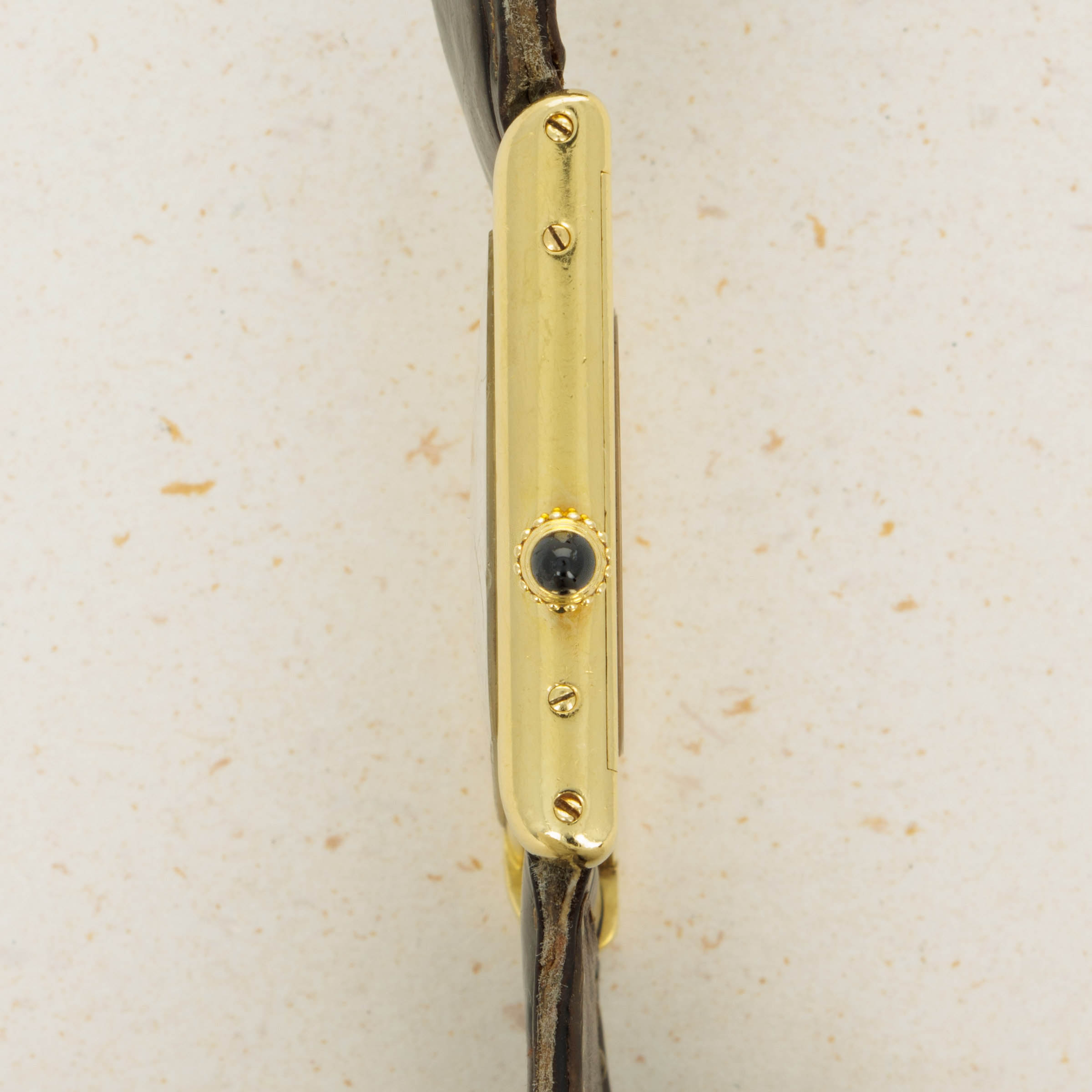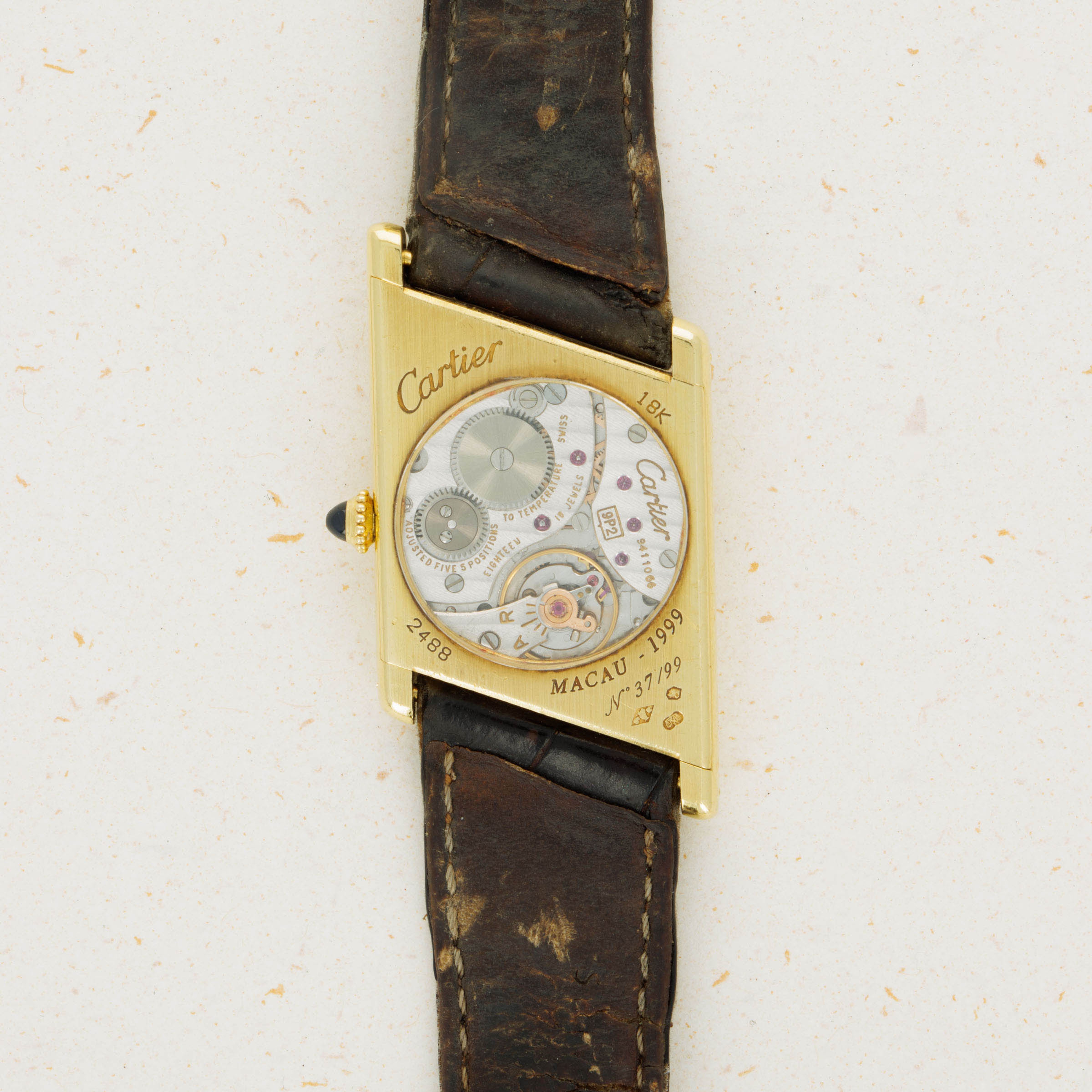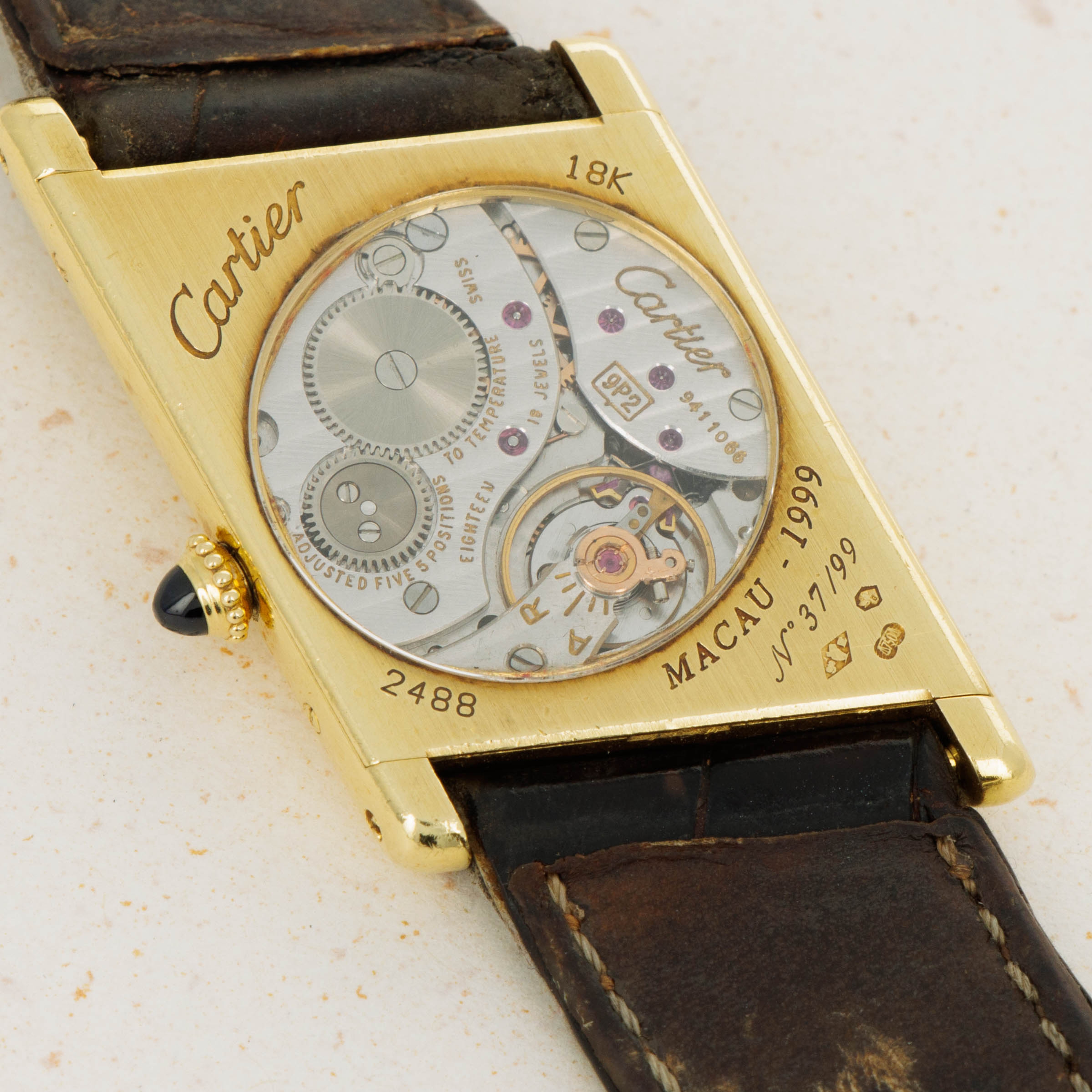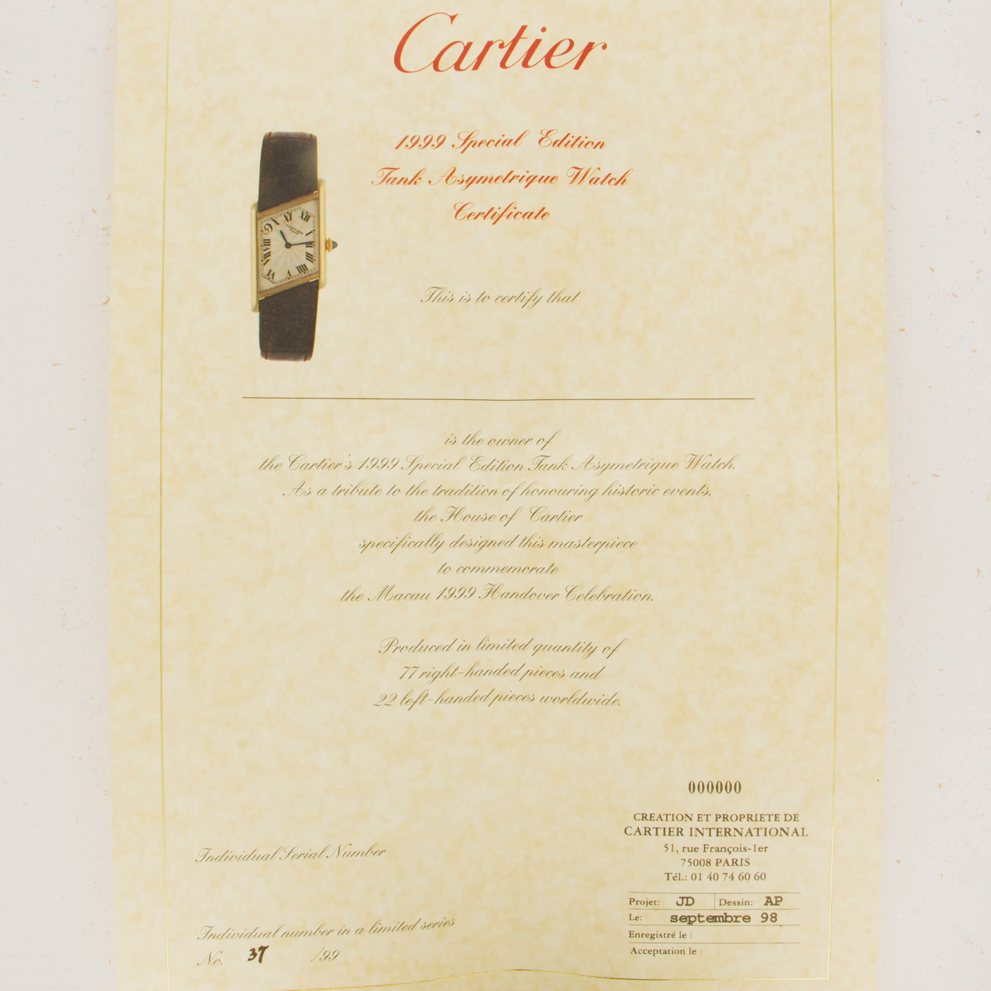 Launched in 1996, the Cartier Tank Asymètrique was released as a faithful and modern reinterpretation of Cartier’s 1936 Parallelogram design, which would then later become known as the Tank Asymètrique. With its eponymous asymmetric design, the Tank Asymètrique was created as a means to enable drivers to read the time easier while holding the wheel with outstretched arms. This modern re-release included 400 individually pieces, of which 300 examples were made of 18kt yellow gold, and 100 were made of platinum. However, Cartier again launched a limited edition variant of the Tank Asymètrique in 1999, limited to just 99 pieces to celebrate Macau’s handover from Portugal to the People's Republic of China. With Cartier’s signature dial aesthetics, but tilted to fit theTank Asymètrique’s offset dial, this ref. 2488 features black Roman numerals, blued steel hands, and a black chemin de fer railroad-style minute track atop its silver guilloche engraved dial. Additionally, it also features a single applied yellow gold Breguet numeral at 9 o’clock that sits beside another black-painted Arabic numeral that combines to read “99” – a clear link to the timepiece’s year of launch and another link to the historic event that it celebrates. Made as a set of 77 right-handed pieces and 22 left-handed pieces all featuring an exhibition caseback to showcase the manually-wound cal. 9P2 movement, the example we have here is a right-handed example that is offered with its box and papers