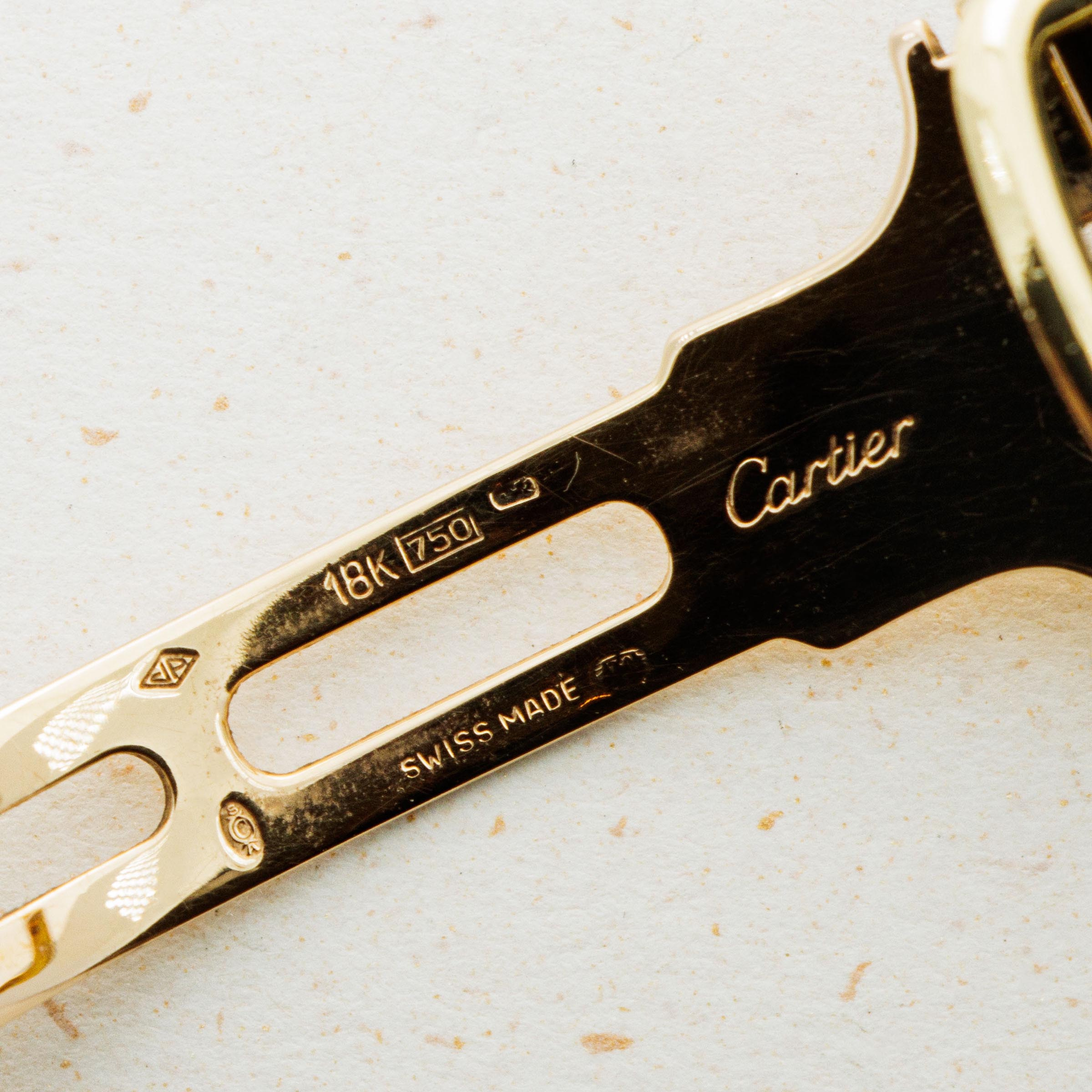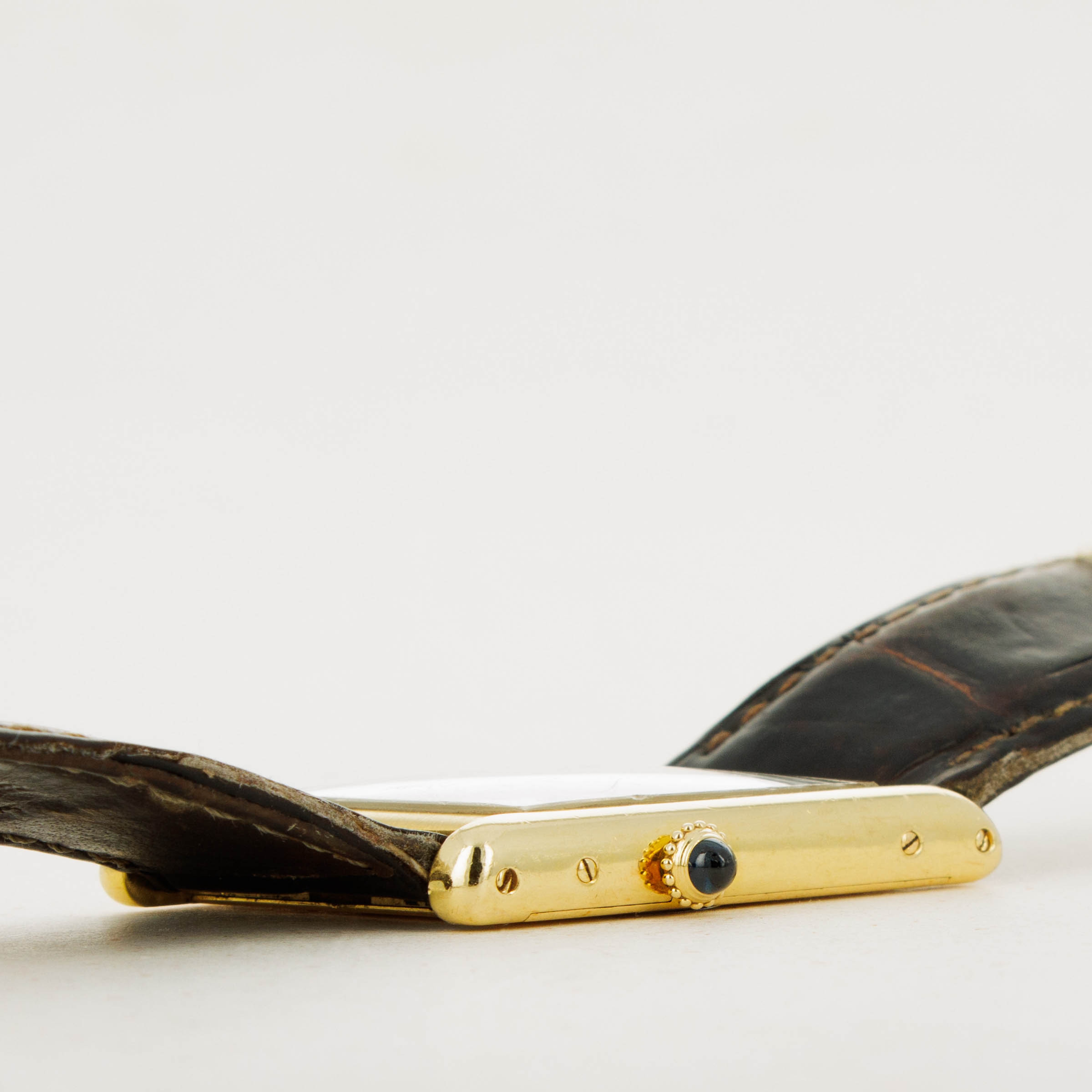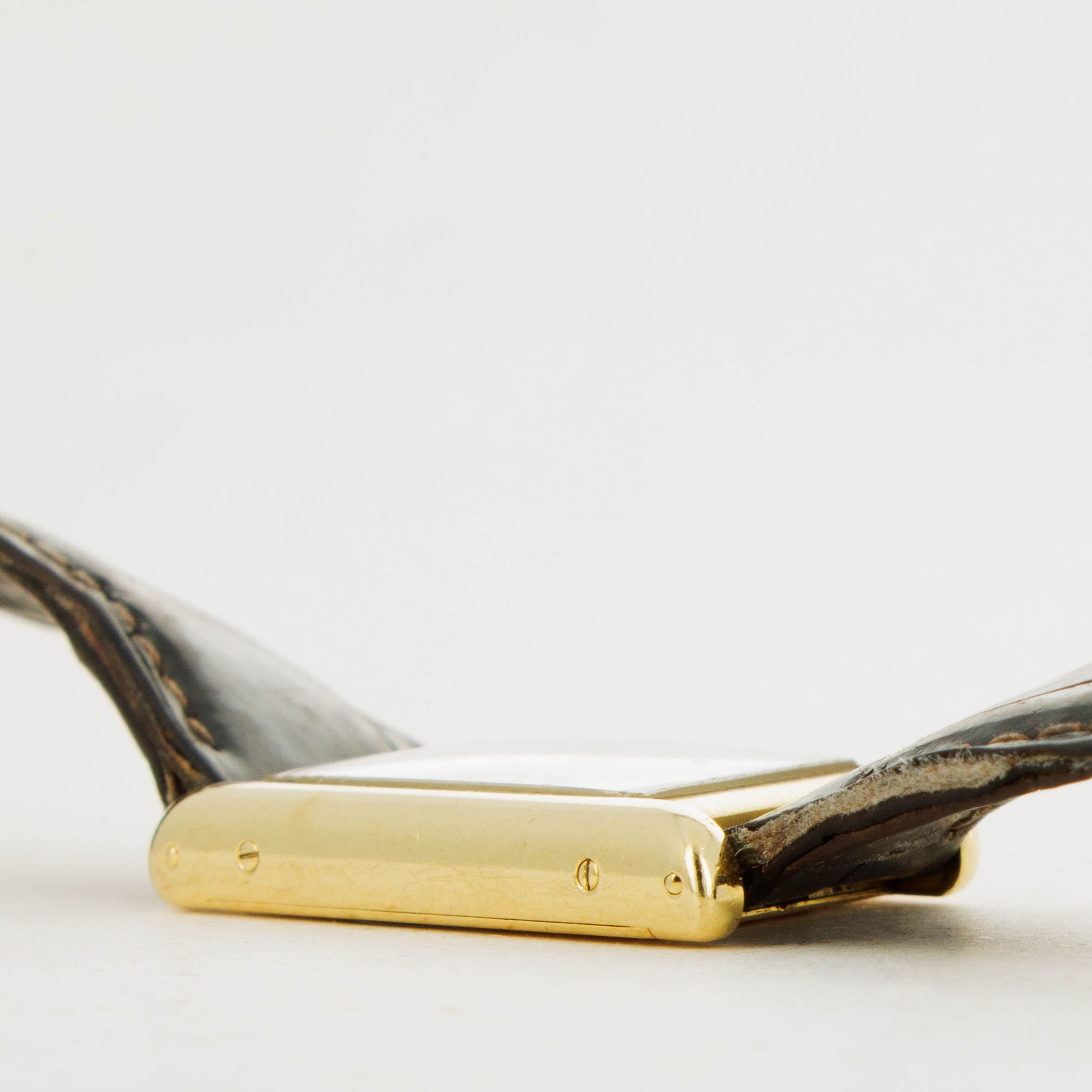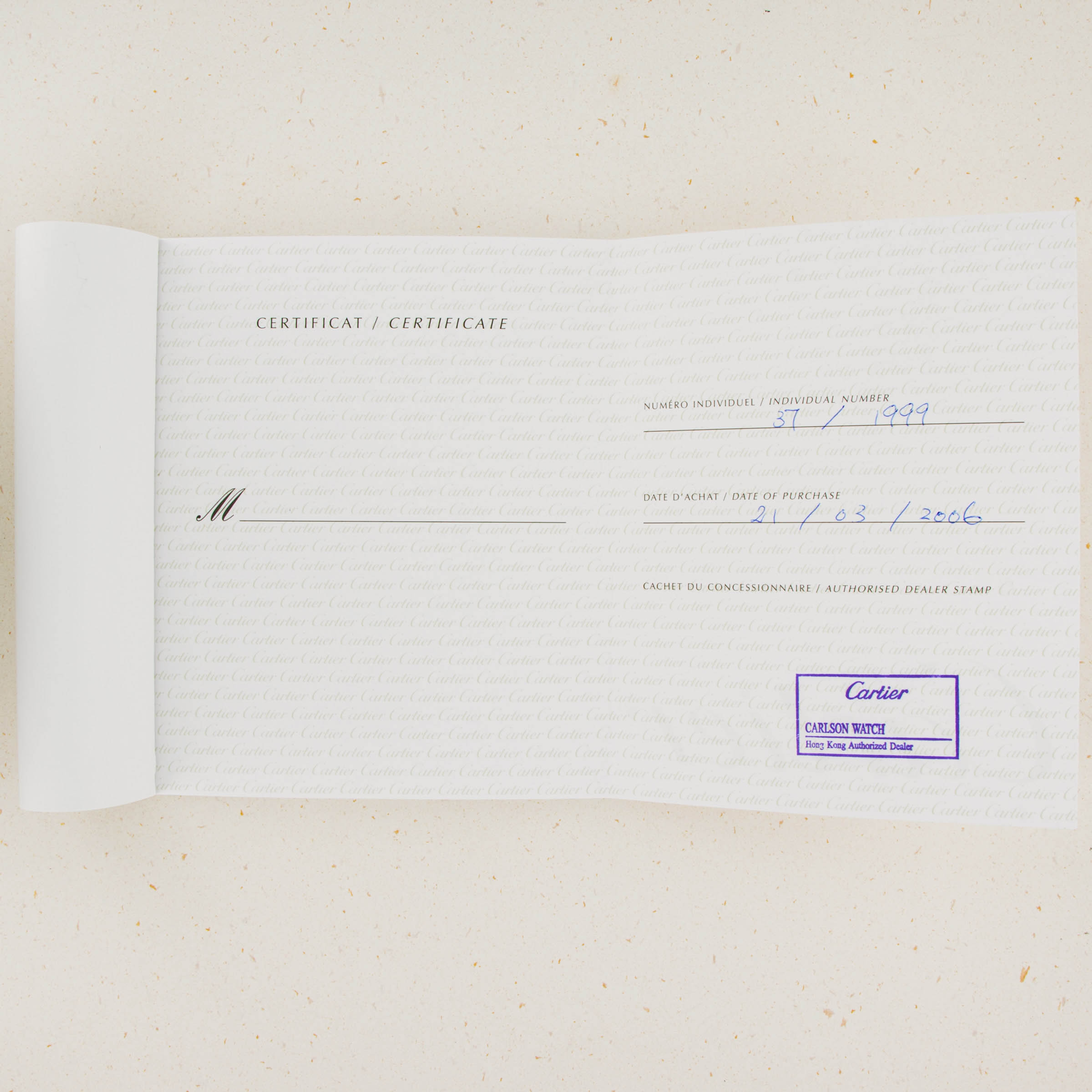 Watch is in very good overall condition. Case has many superficial scratches and marks along the surface. Dial is in excellent condition. There appears to be a tiny hair above the Cartier signature on the dial-it can be seen in the images. Crystal is has numerous scratches on the surface. Caseback engravings are crisp and fully visible, bur scratches and marks are visible on the surface and on the edges. Crocodile leather strap is very worn and needs to be replaced. It is fitted with the original 18kt yellow gold folding deployant clasp. Watch comes with an original dated certificate as well as limited edition paperwork.