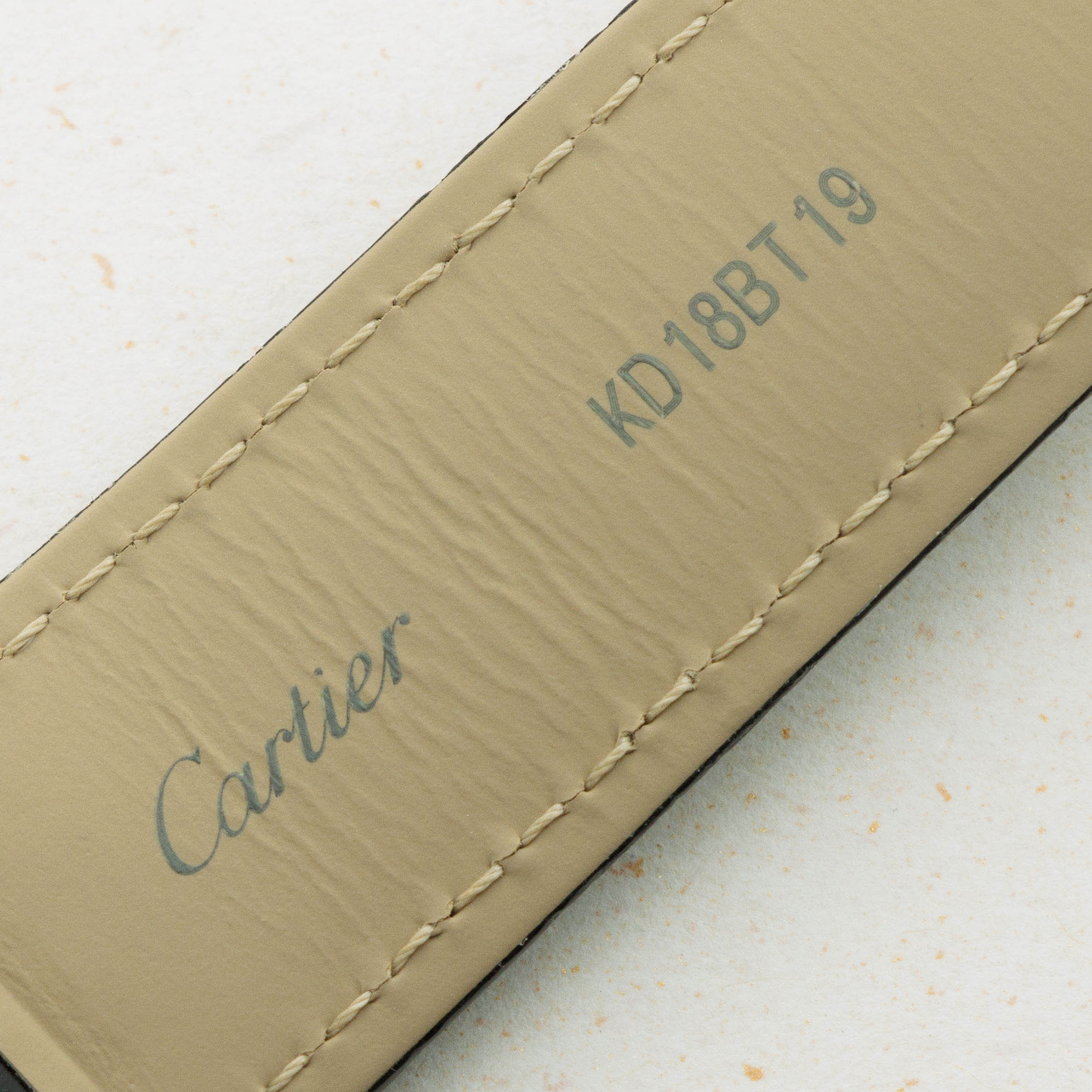 Fitted with a typical Cartier dial, the ref. 2390 features a white dial a subtle guilloche engraving, Cartier's signture black Roman numerals, blued steel hands and a black railroad-style minute track.