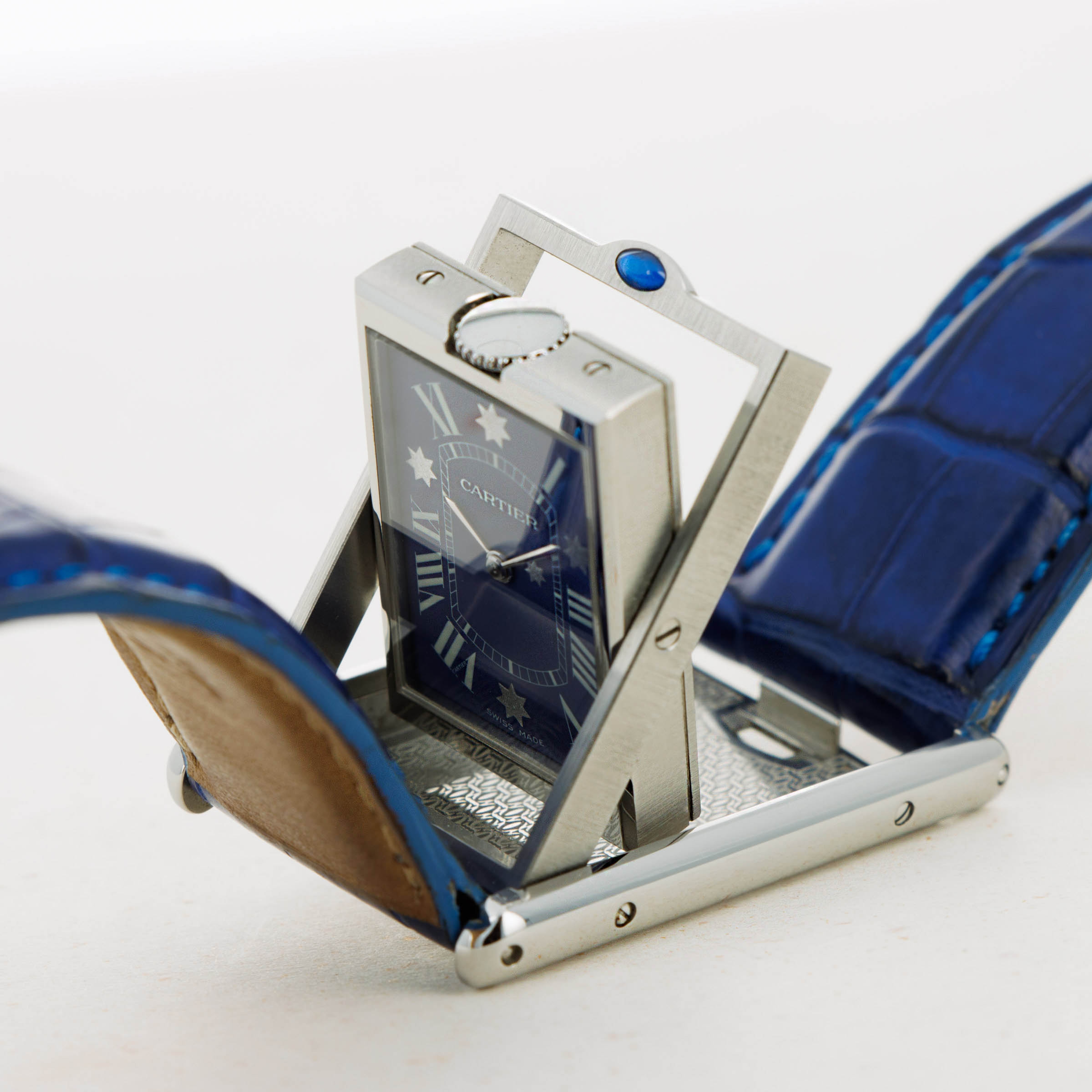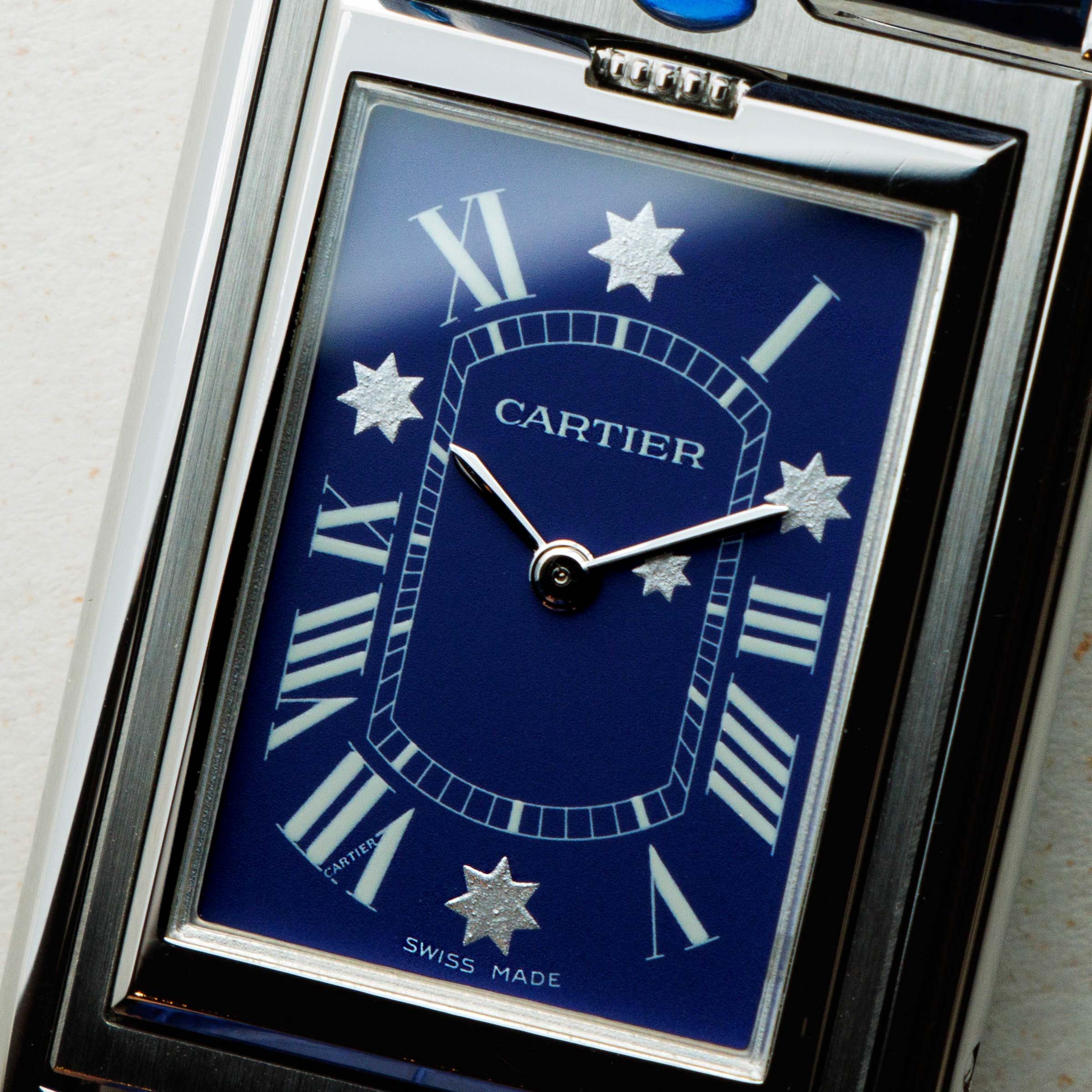 An incredibly iconic timepiece, the Cartier Tank features one of the most easily recognizable watch designs of all time. With its thin rectangle-shaped case and elegant dial, it remains as classical a timepiece today as when it was first released in 1917. Inspired by the Renault FT-17 Tank, the Cartier Tank is, somewhat ironically, a dress watch. Recognizing the need for a more robust variant, Cartier released the Tank Basculante. Launched in 1933, Cartier took inspiration from the JLC Reverso, another classically styled early sports watch that would rotate within its case, to create the Tank Basculante, a watch that would also rotate vertically over itself. As such, the Basculante rotates along the 12 to 6 axis within its case to protect its dial from damage caused during sports, and enabling it to double as a table clock if you so wished. A pillar of Cartier's elegant design, this Basculante Le Australia ref. 2390 was launched in 2001 as a limited edition series of 26 pieces to celebrate 100 years of the Australian Federation. Featuring a bright blue dial, the Basculante Le Australia features four stars mixed within Cartier's signature Roman numeral display and a fifth star at the 3 o’clock side of the central pinion, as it pays homage to the five stars of the Southern Cross on the Australian flag.