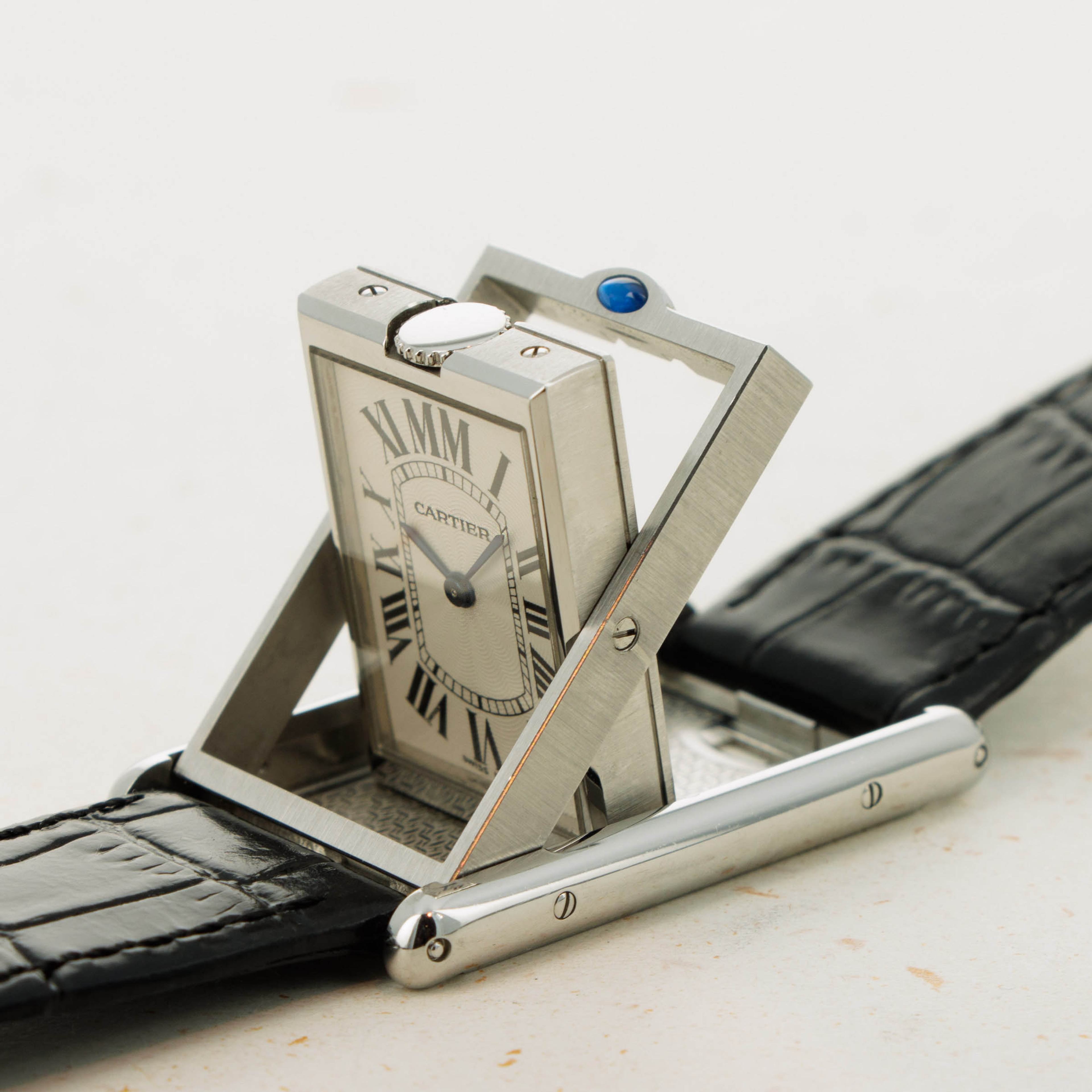 An incredibly iconic timepiece, the Cartier Tank features one of the most easily recognizable watch designs of all time. With its thin rectangle-shaped case and elegant dial, it remains as classical a timepiece today as when it was first released in 1917. Inspired by the Renault FT-17 Tank, the Cartier Tank is, somewhat ironically, a dress watch. Recognizing the need for a more robust variant, Cartier released the Tank Basculante. Launched in 1933, Cartier took inspiration from the JLC Reverso, another classically styled early sports watch that would rotate within its case, to create the Tank Basculante, a watch that would also turn in its case. As such, the Basculante rotates vertically along the 12 to 6 axis within its case to protect its dial from damage caused during sports, and enabling it to double as a table clock if you so wished. Special for its celebratory design, this ref. 2390 is perhaps the pinnacle of how reserved Cartier will make a watch that pays homage to something that comes around once every one thousand years. Launched as the Millennium edition variant, this ref. 2390 features a seemingly typical Cartier dial that boasts Cartier's signature black exploding Roman numerals with 'MM’ instead of the XII that should mark 12 o'clock – a direct reference to the year 2000, the new millennium. Additionaly, this is also referenced on its caseback whereby 1999 and 2001 stand on top and beneath the year 2000 like a vertical timeline.