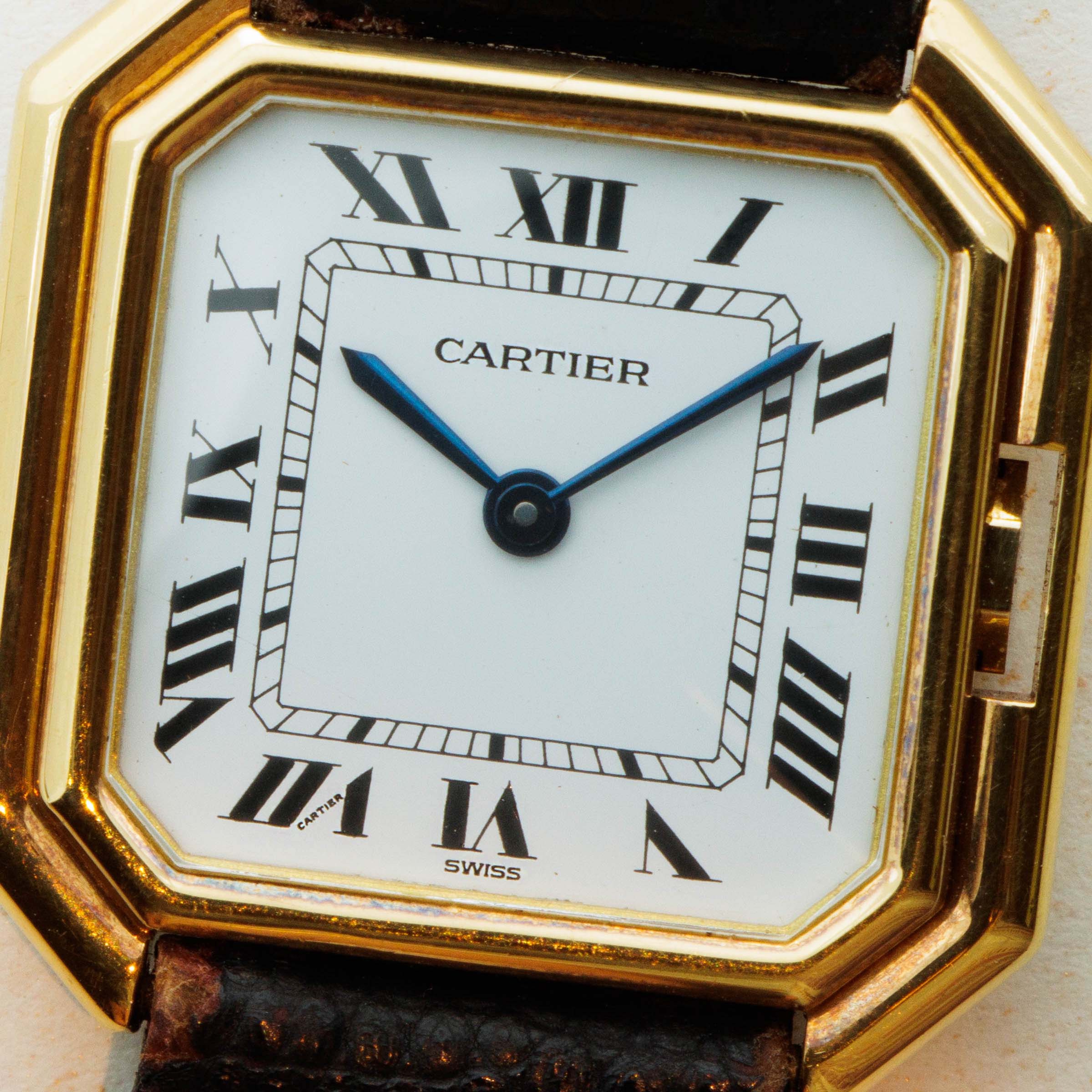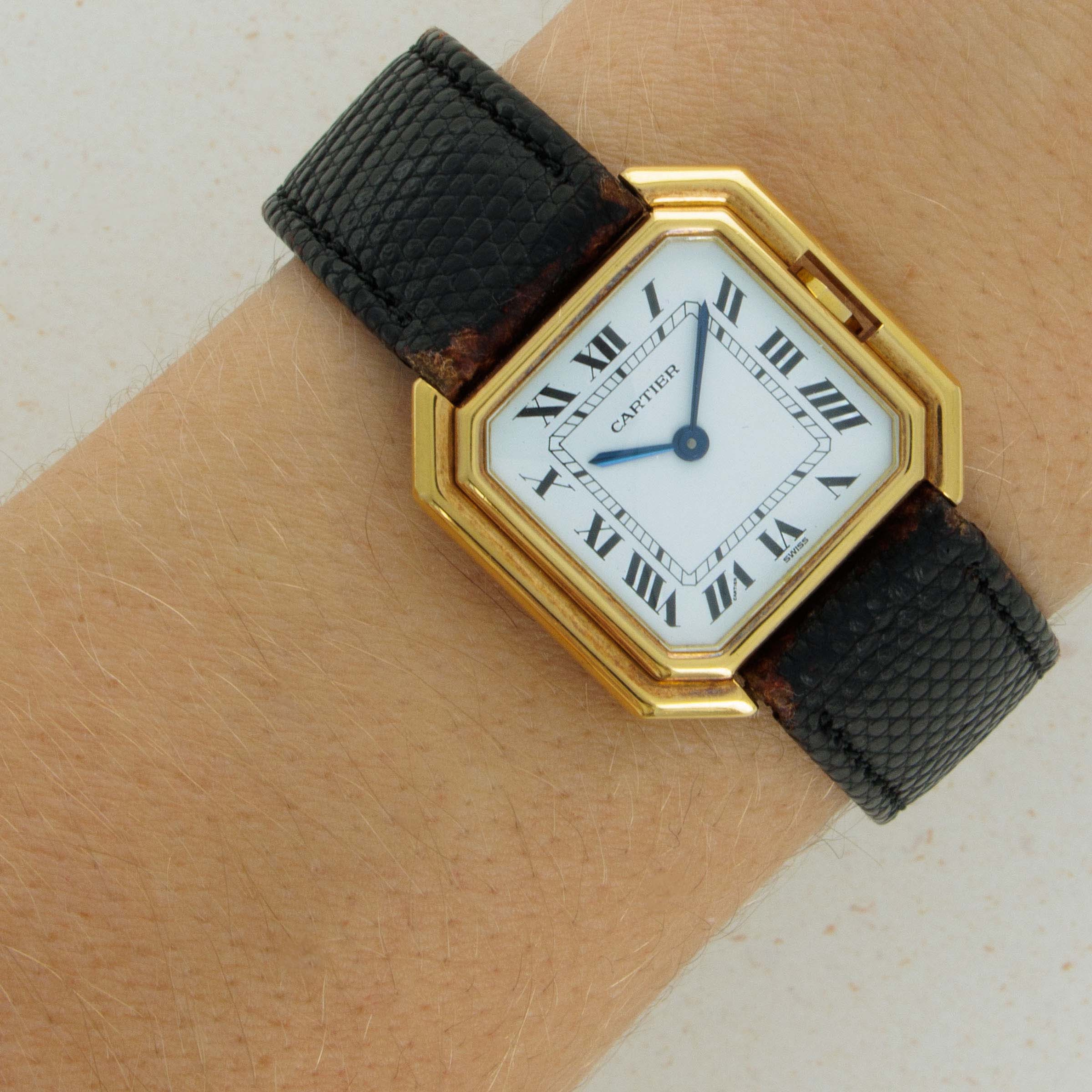 Famed for their iconic collections and classical styling, French jeweller and watchmaker Cartier hold a vital position within the horology industry. However, one such collection that flies under the radar is the Ceinture, first launched in 1927 but reintroduced to Cartier's line-up in the early 1970s, around 1973. First offered in two case sizes, 25mm and 27mm, until a larger 31mm variant was introduced, the Ceinture is a dynamic timepiece known for its unique twist on the Tank’s design. Powered by the manual wind cal. 78.1 movement, the model we have here is perhaps the variant that is truest to Cartier's ethos with its 18kt yellow gold case and bright white dial featuring black Roman numerals, a railroad minute track and blued steel hands. Of course, the Ceinture's most distinctive element is its unusual octagonal case. Somewhat reminiscent of a belt's buckle ('ceinture' means 'belt' in French afterall), the Ceinture resembles a square that has had its corners cut, which in turn allows the watch to wear more prominently on the wrist than one would assume judging solely on its dimensions. With its deep-stepped bezel design, the Ceinture is truly an interesting timepiece on the wrist. Feeding into this intrigue is the Ceinture's octagonal crown, which sits within its case and acts as an extension of the stepped bezel. Cartier also decided to forgo their signature sapphire cabochon crown so that the Ceinture's crown could sit within the bezel, a feature that Cartier calls "remontoir imperdable" (captive winding).