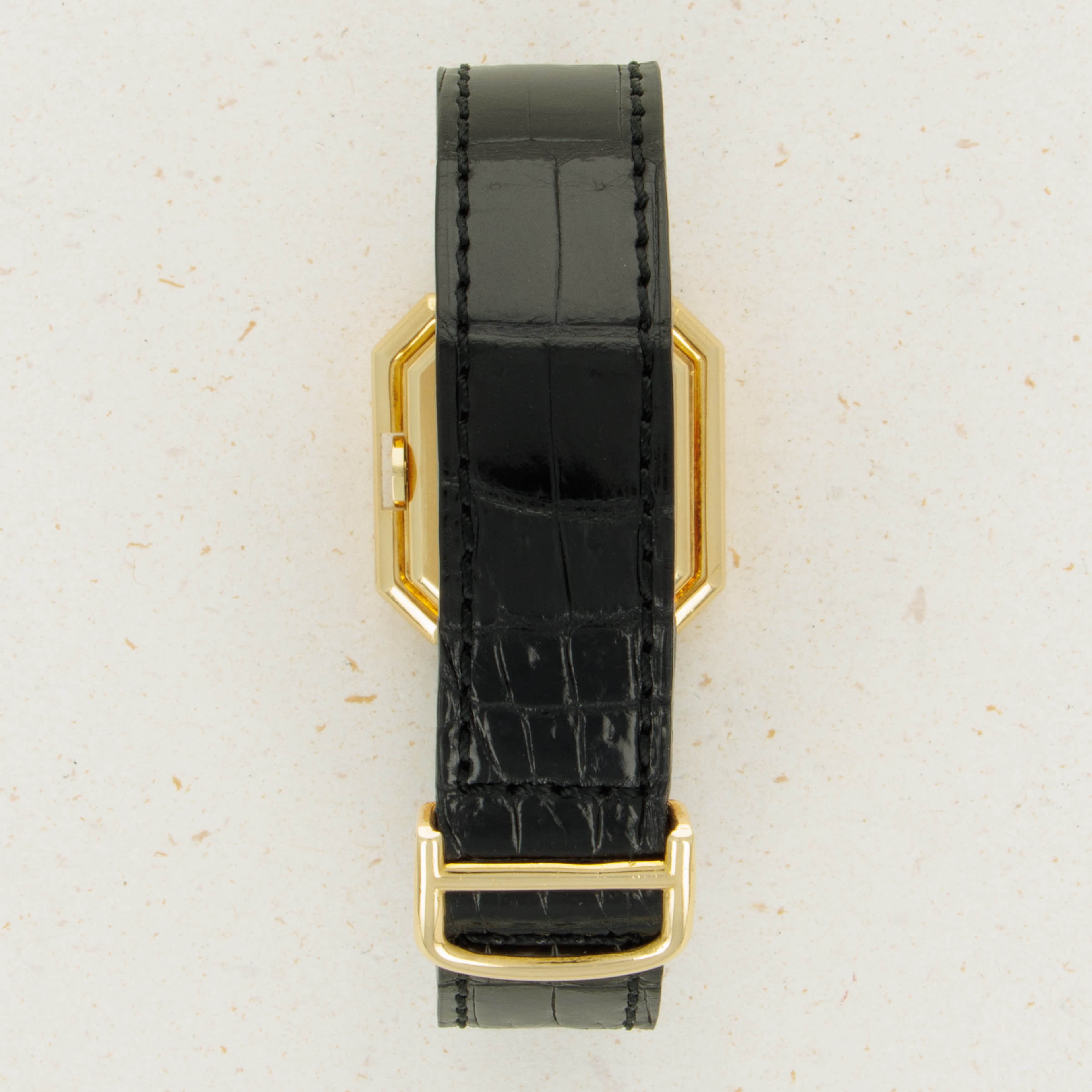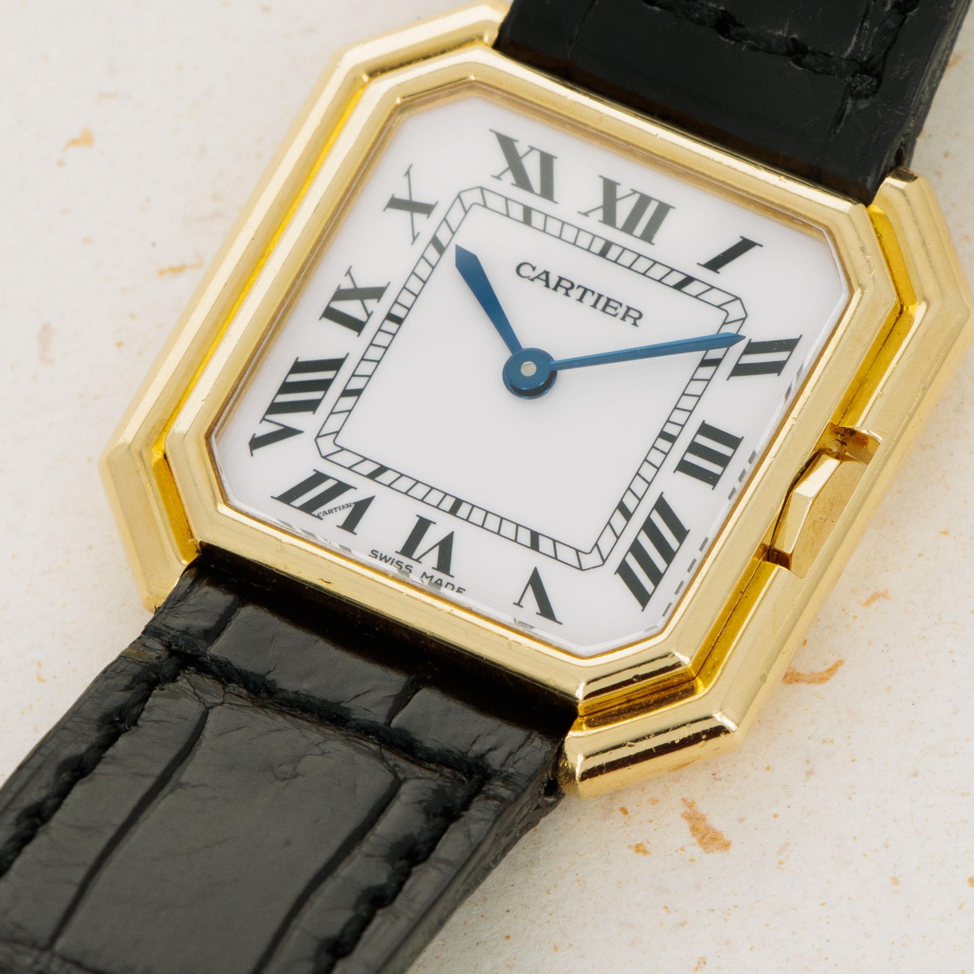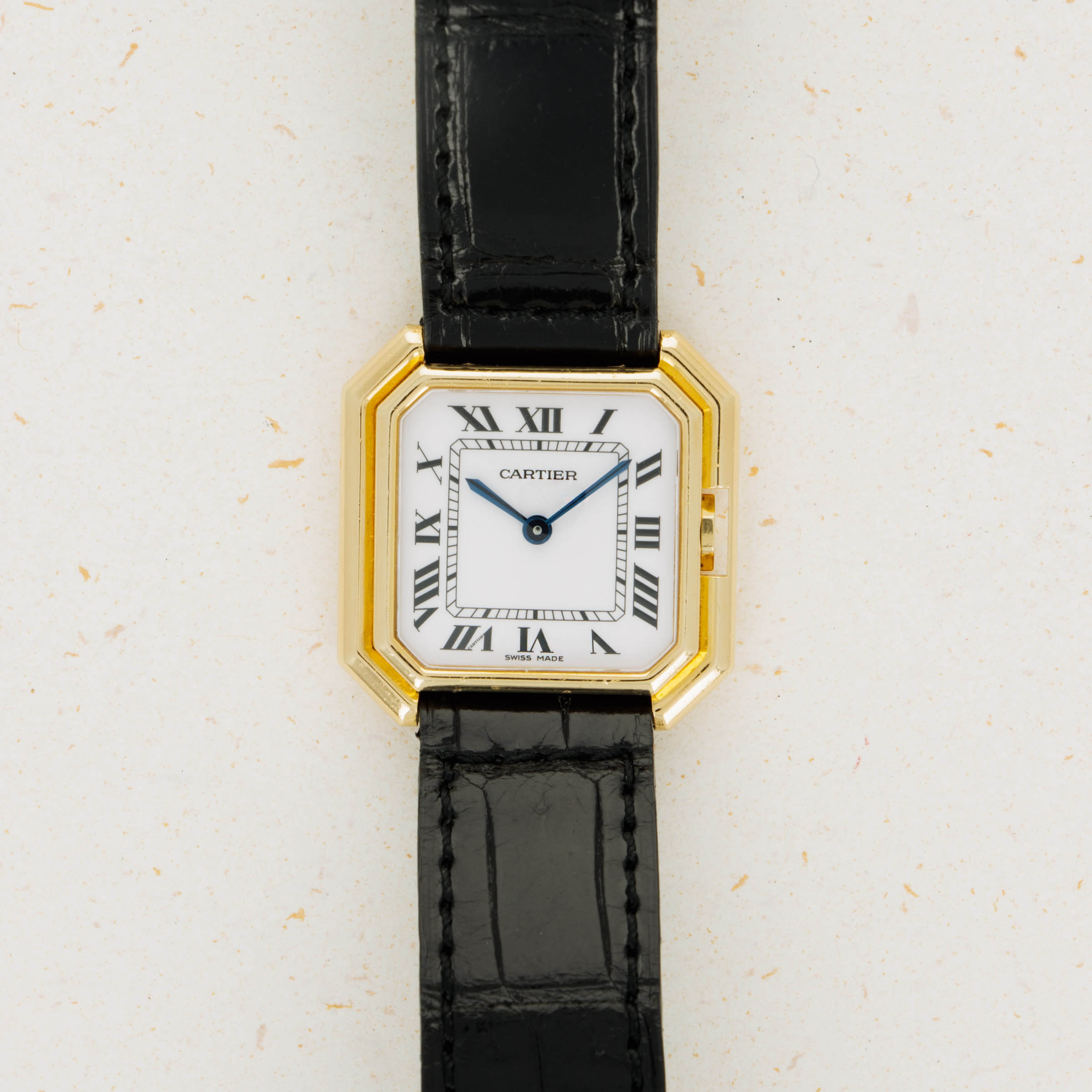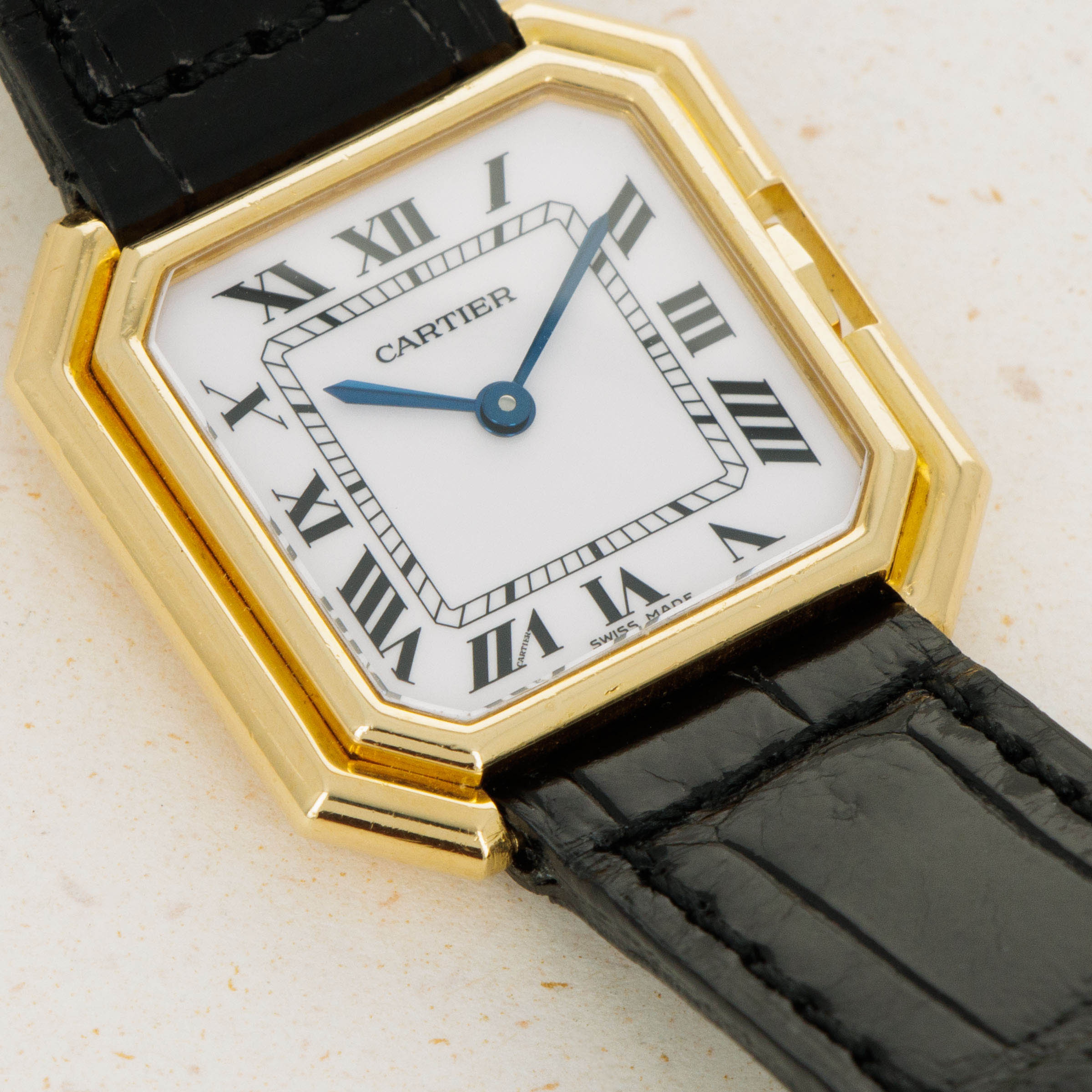 Famed for their iconic collections and classical styling, French jeweller and watchmaker Cartier hold a vital position within the horology industry. However, one such collection that flies under the radar is the Ceinture, first launched in 1927 but reintroduced to Cartier's line-up in the early 1970s, around 1973. First offered in two case sizes, 25mm and 27mm, until a larger 31mm variant was introduced, the Ceinture is a dynamic timepiece known for its unique twist on the Tank’s design. Powered by the manual wind cal. 78.1 movement, the model we have here is perhaps the variant that is truest to Cartier's ethos with its 18kt yellow gold case and bright white dial featuring black Roman numerals, a railroad minute track and blued steel hands. Of course, the Ceinture's most distinctive element is its unusual octagonal case. Somewhat reminiscent of a belt's buckle ('ceinture' means 'belt' in French afterall), the Ceinture resembles a square that has had its corners cut, which in turn allows the watch to wear more prominently on the wrist than one would assume judging solely on its dimensions. With its deep-stepped bezel design, the Ceinture is truly an interesting timepiece on the wrist. Feeding into this intrigue is the Ceinture's octagonal crown, which sits within its case and acts as an extension of the stepped bezel. Cartier also decided to forgo their signature sapphire cabochon crown so that the Ceinture's crown could sit within the bezel, a feature that Cartier calls "remontoir imperdable" (captive winding).