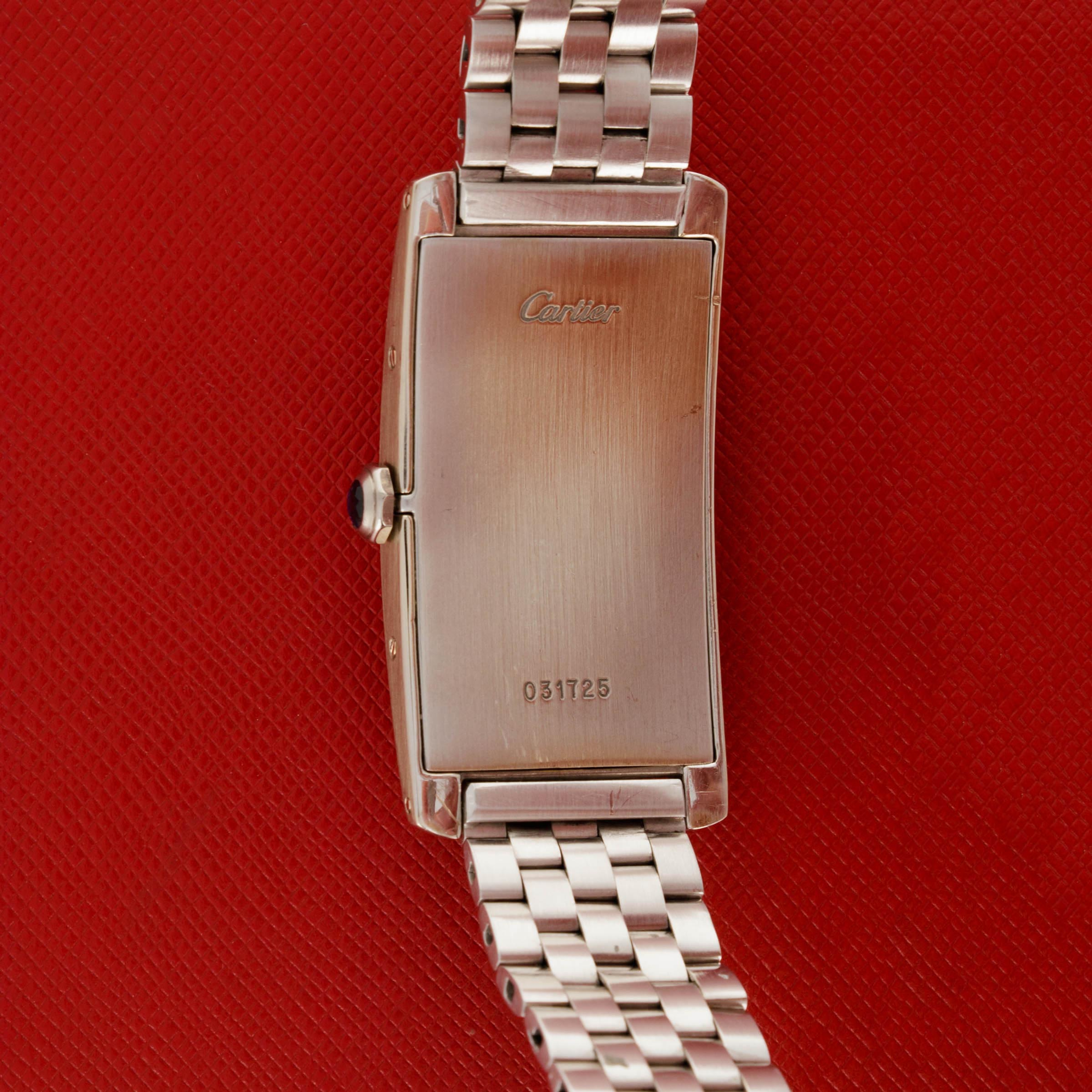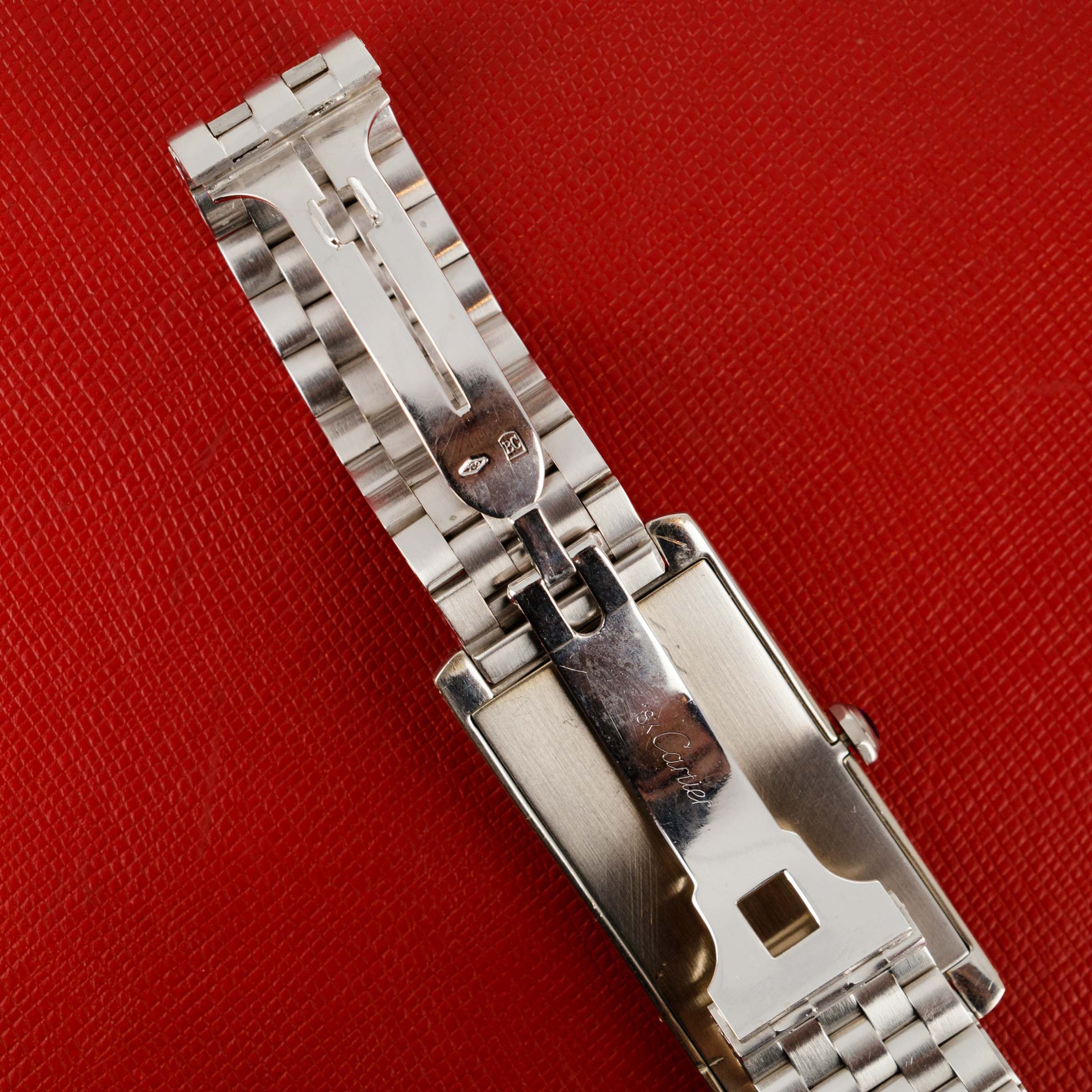 Featuring Cartier's signature dial design, this Cintree features a silver elongated dial with black explosive Roman numerals, blued steel hands, and Cartier's quintessential chemin de fer railroad-style minute track.