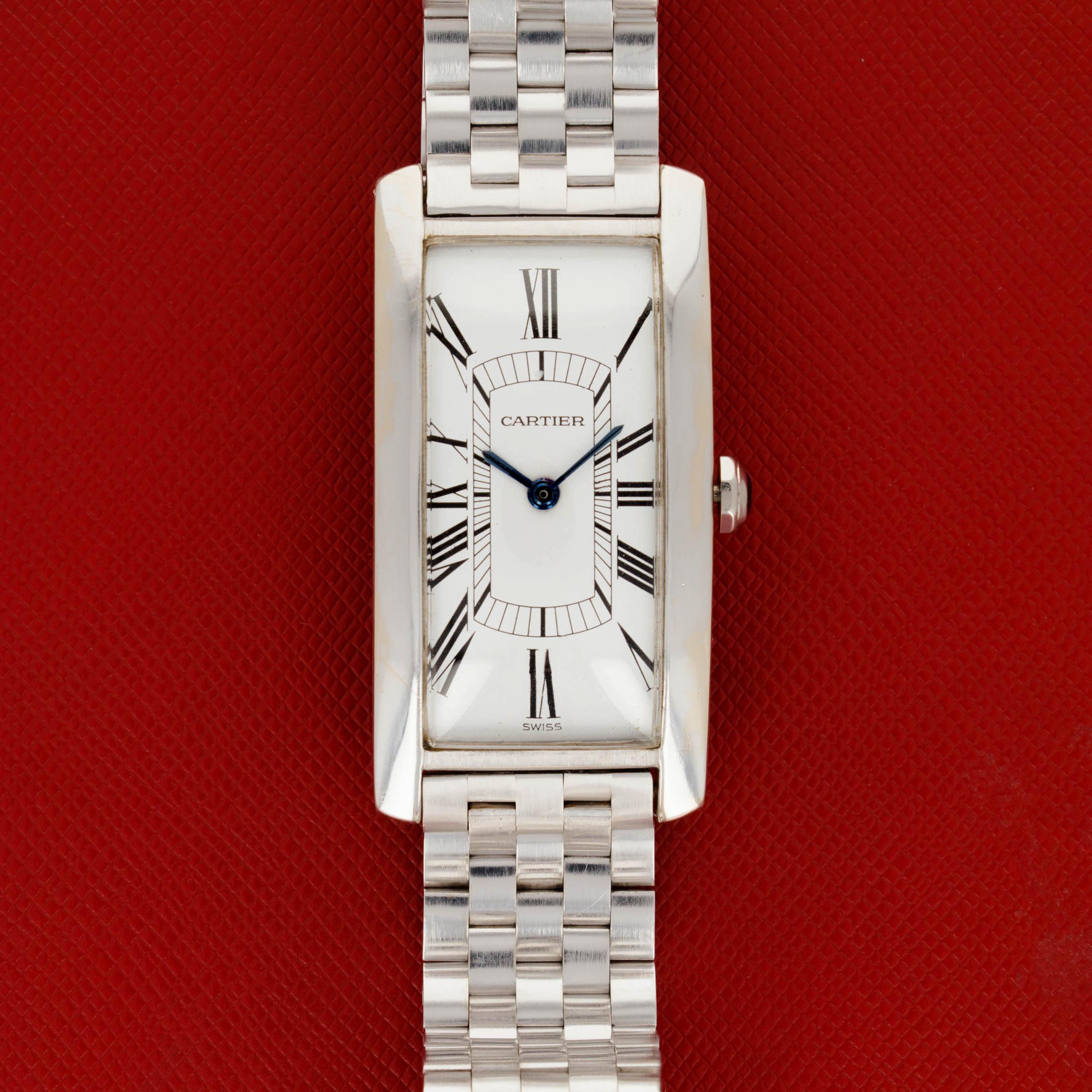 Launched in 1921, two years after the original Cartier Tank debuted in 1919, the slim and elongated Tank Cintree has remained in the brand’s repertoire intermittently ever since its launch all those years ago. Typically offered as a limited edition offering irrespective of variant, the Cintree is a special watch. Manually wound and featuring a beautiful curved dial, case, and crystal, the Cintree sits perfectly on the wearer as it wraps around the curvature of the wrist. With exploding Roman numerals and Cartier's signature chemin de fer railroad-style minute track, this Cintree remains entirely grounded in Cartier's quintessential design language, as the French watchmaker has endeavored to do since the Cintree was launched over 100 years ago. This 1970's Jumbo example is offered in wonderful condition. Already a rare specimen on account of its 18kt white gold Jumbo case, this example is also offered on an exceptionally rare white gold Cartier bracelet.