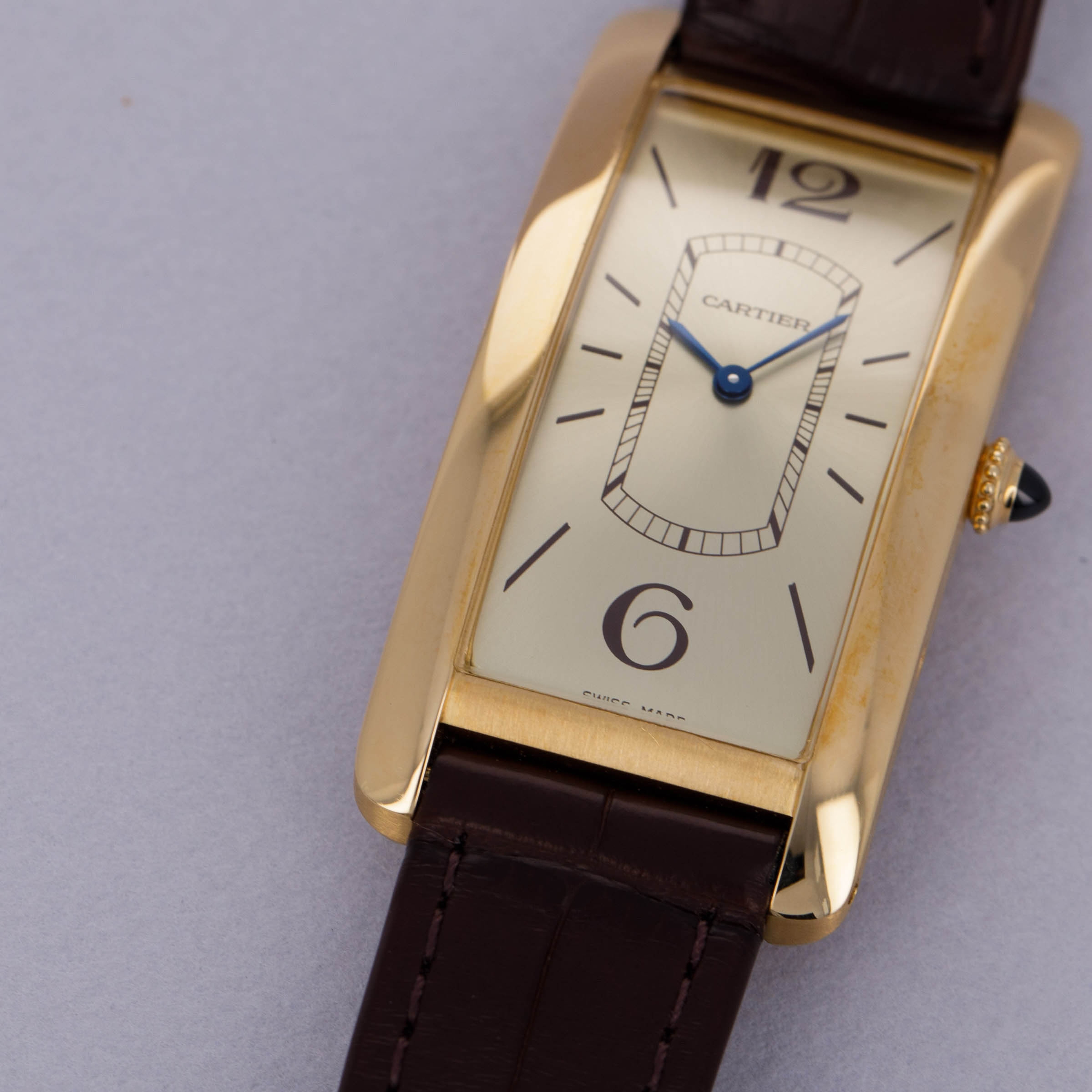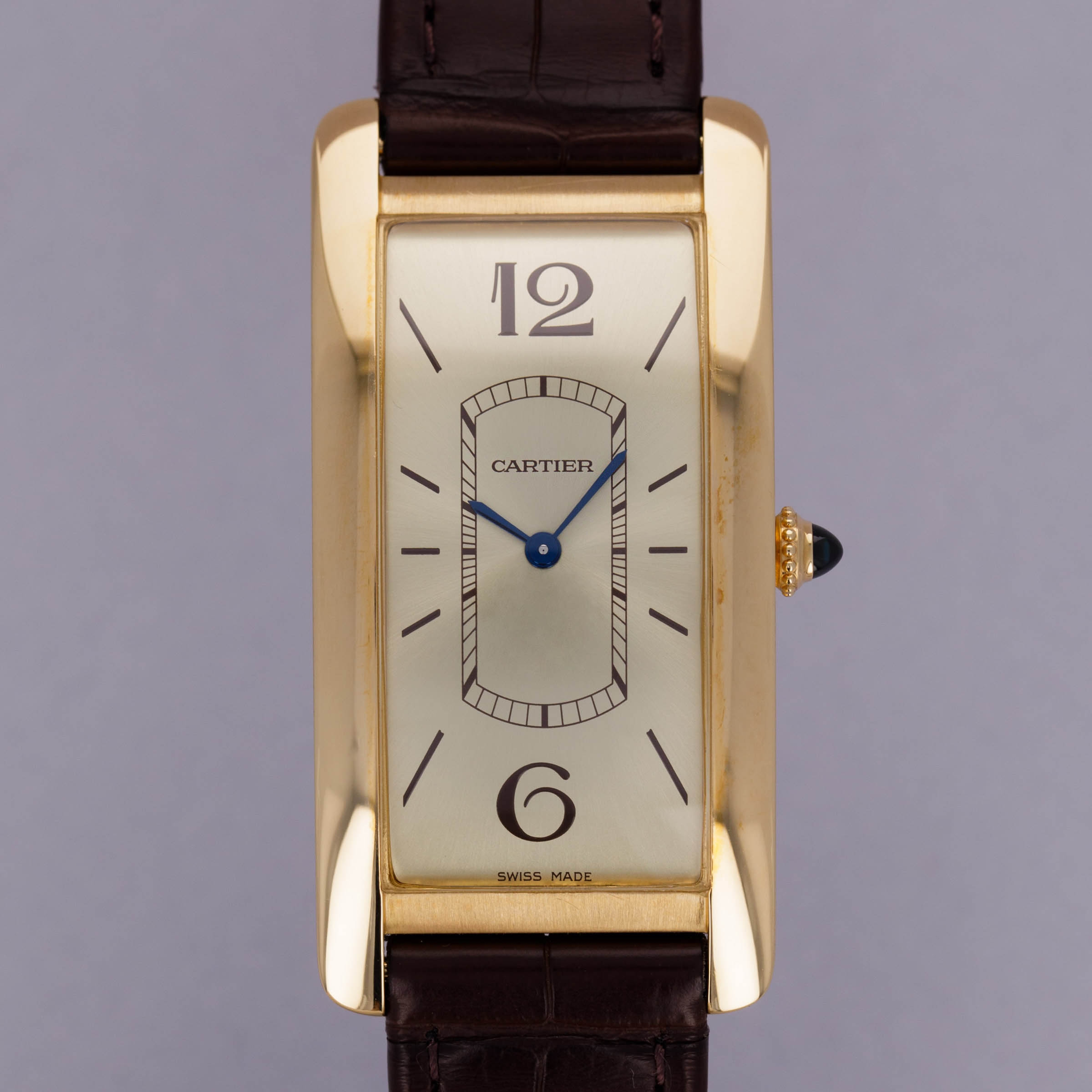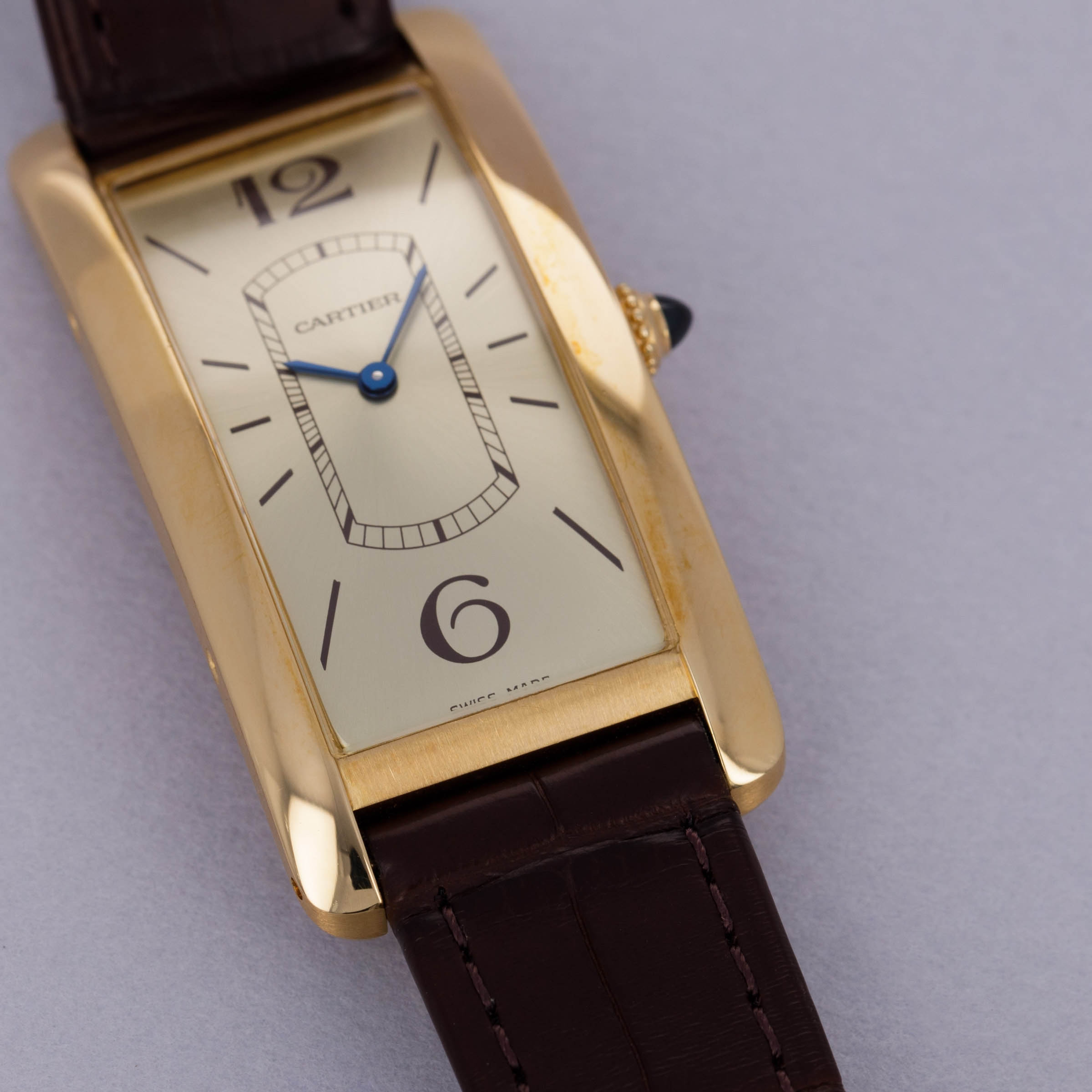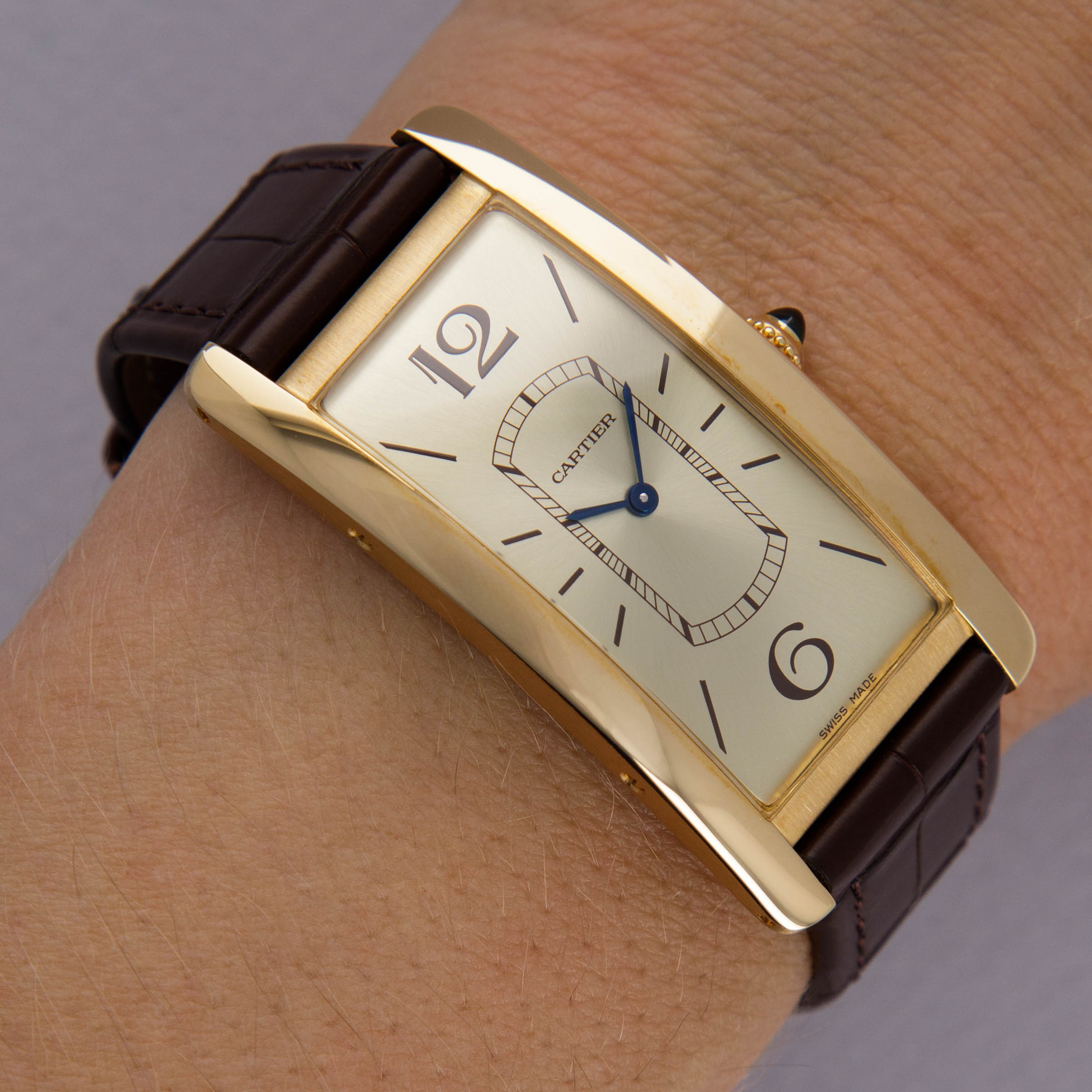 Launched in 1921, two years after the original Cartier Tank debuted in 1919, the slim and elongated Tank Cintree has remained in the brand’s repertoire intermittently ever since its launch all those years ago. Typically offered as a limited edition offering irrespective of variant, the example we have here is yet another of the collection's limited edition references, the ref. WSTA0026. Launched in 2020, this collection stays true to the Cintree’s aesthetic and heritage as a typically low-volume model. It thus retains the Cintree’s iconic standing amongst Cartier’s collectors and was offered only to select Cartier VIPs. Featuring the Cintree’s signature precious metal construction, this 18k yellow gold beauty spans 46.3mm lug to lug and is just 23mm wide. With its silver dial, blued steel hands, and black dial inscriptions, the ref. WGTA0026 retains the essence of Cartier in as classical a fashion as we have learned to expect from the French watchmaker but with a modern twist that is elegant, sophisticated and luxurious.
