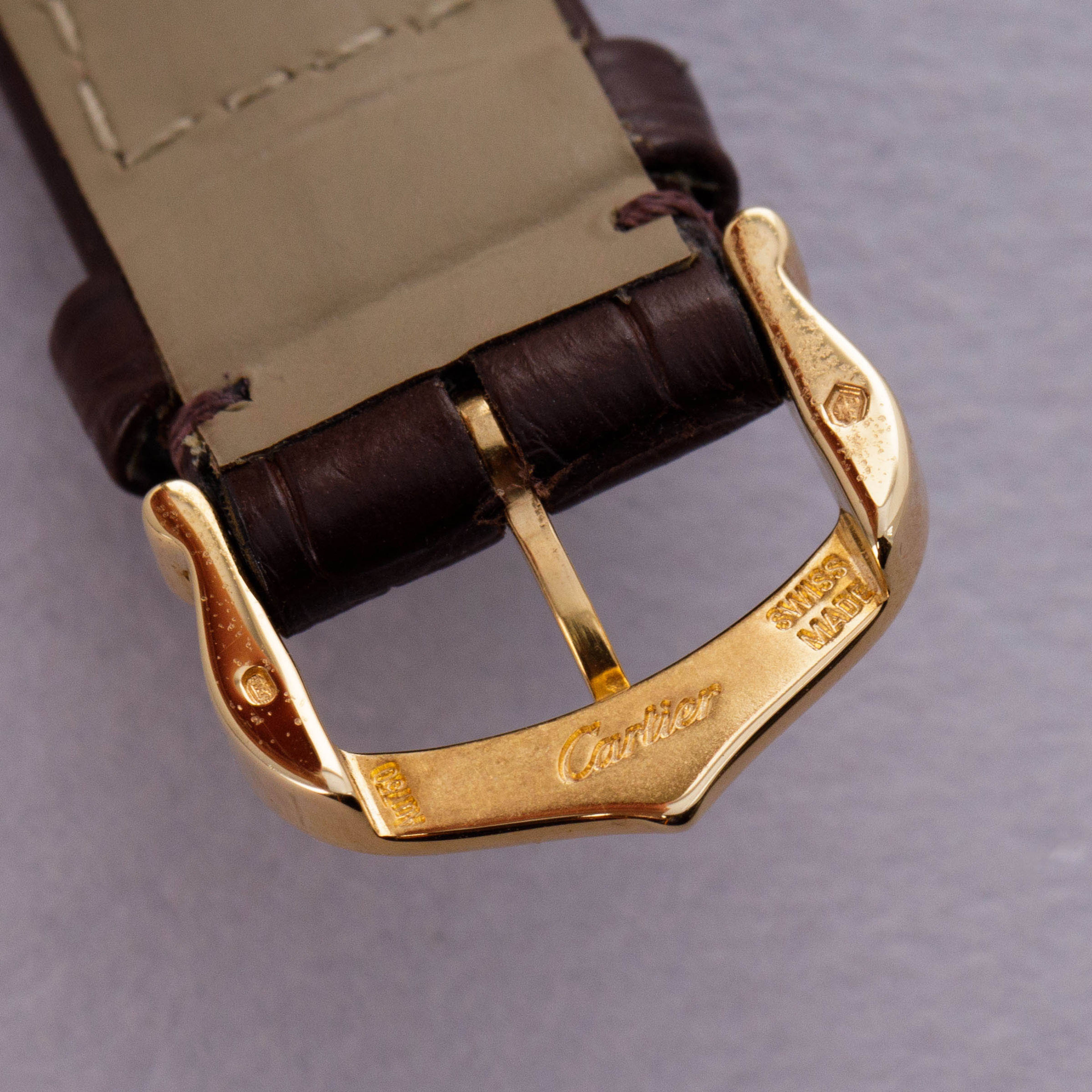 Boasting a contemporary take on the Cintrée's dial, the ref. WSTA0026 features a champagne display with blued steel sword-shaped hands and black inscriptions for its hour markers and Cartier's signature chemin-de-fer minute track.