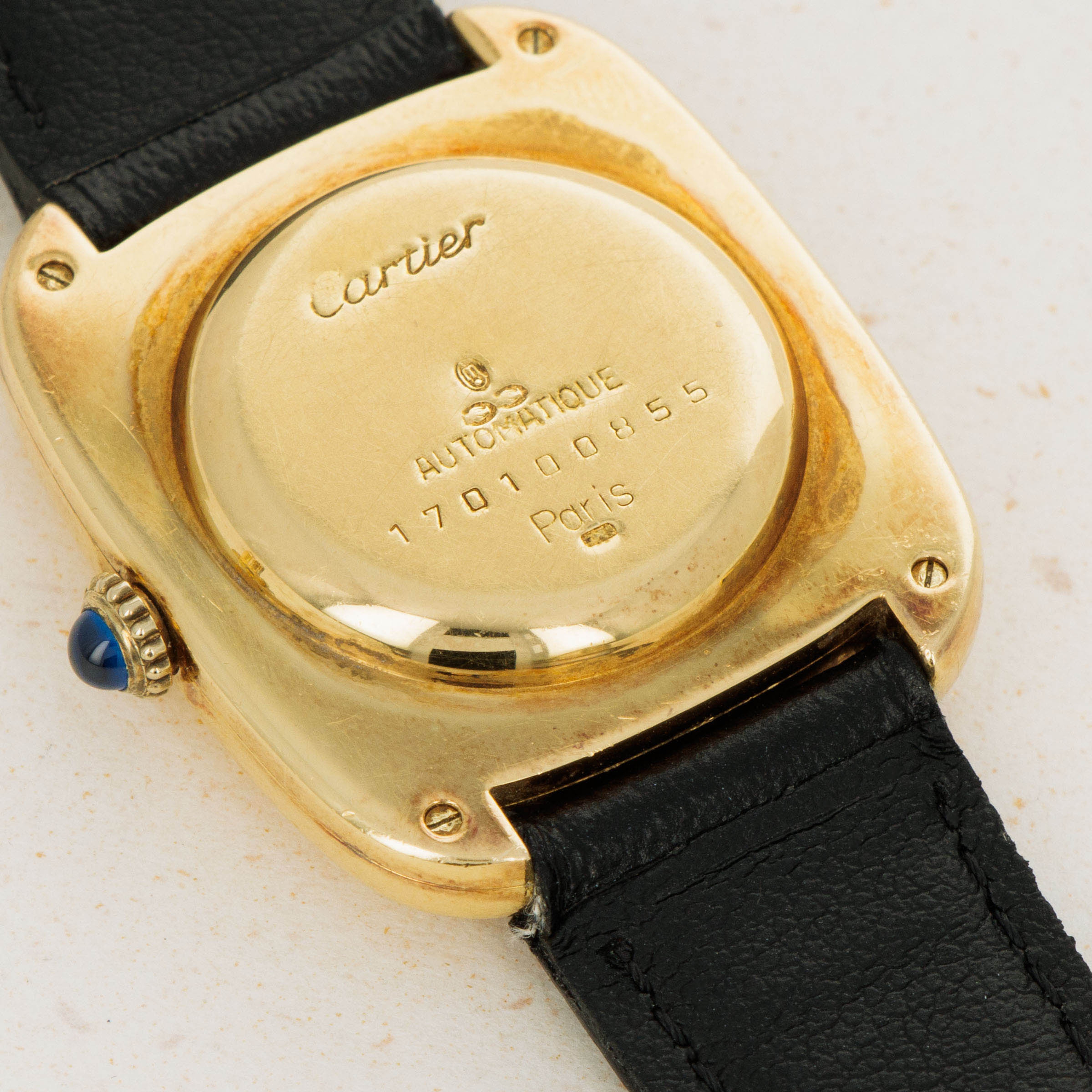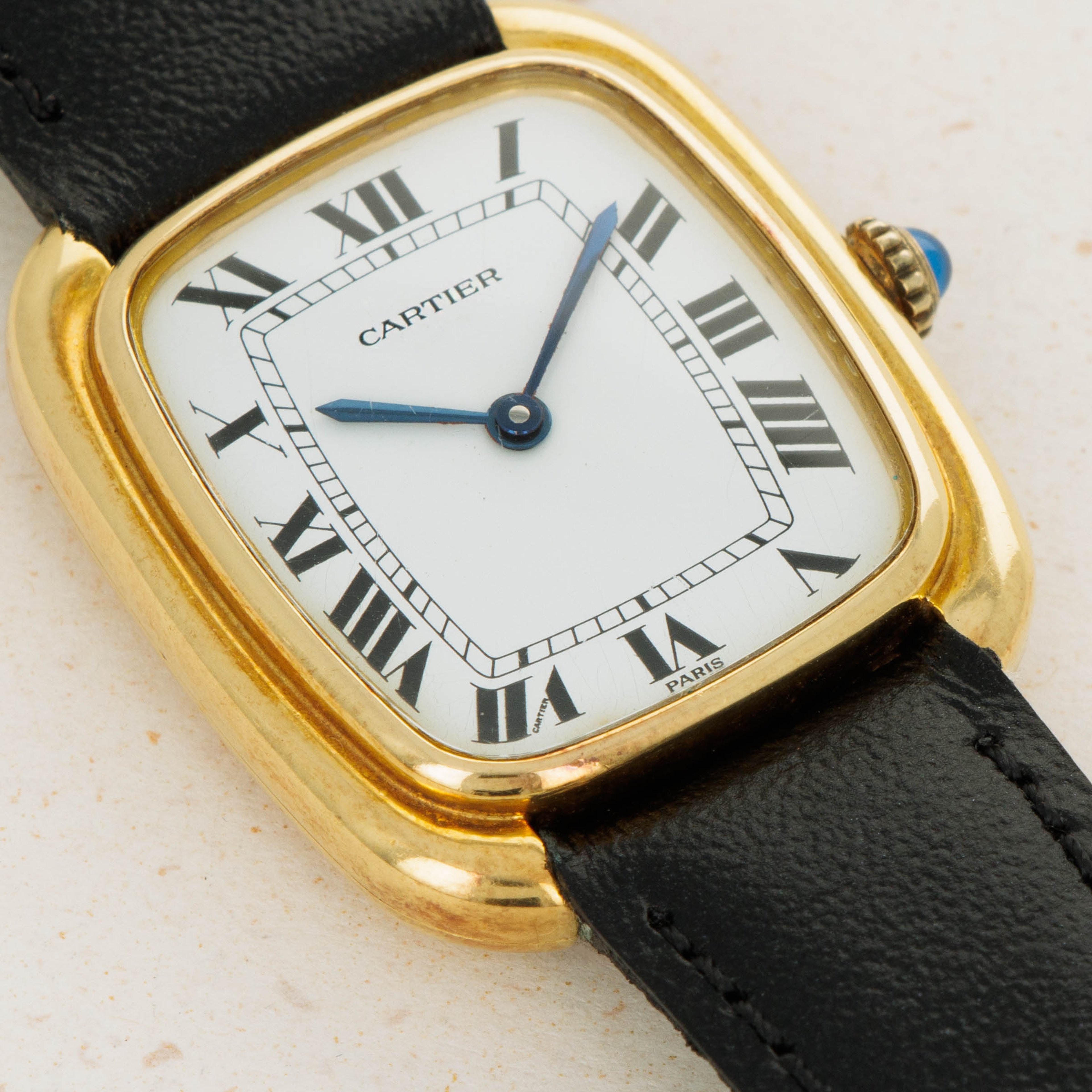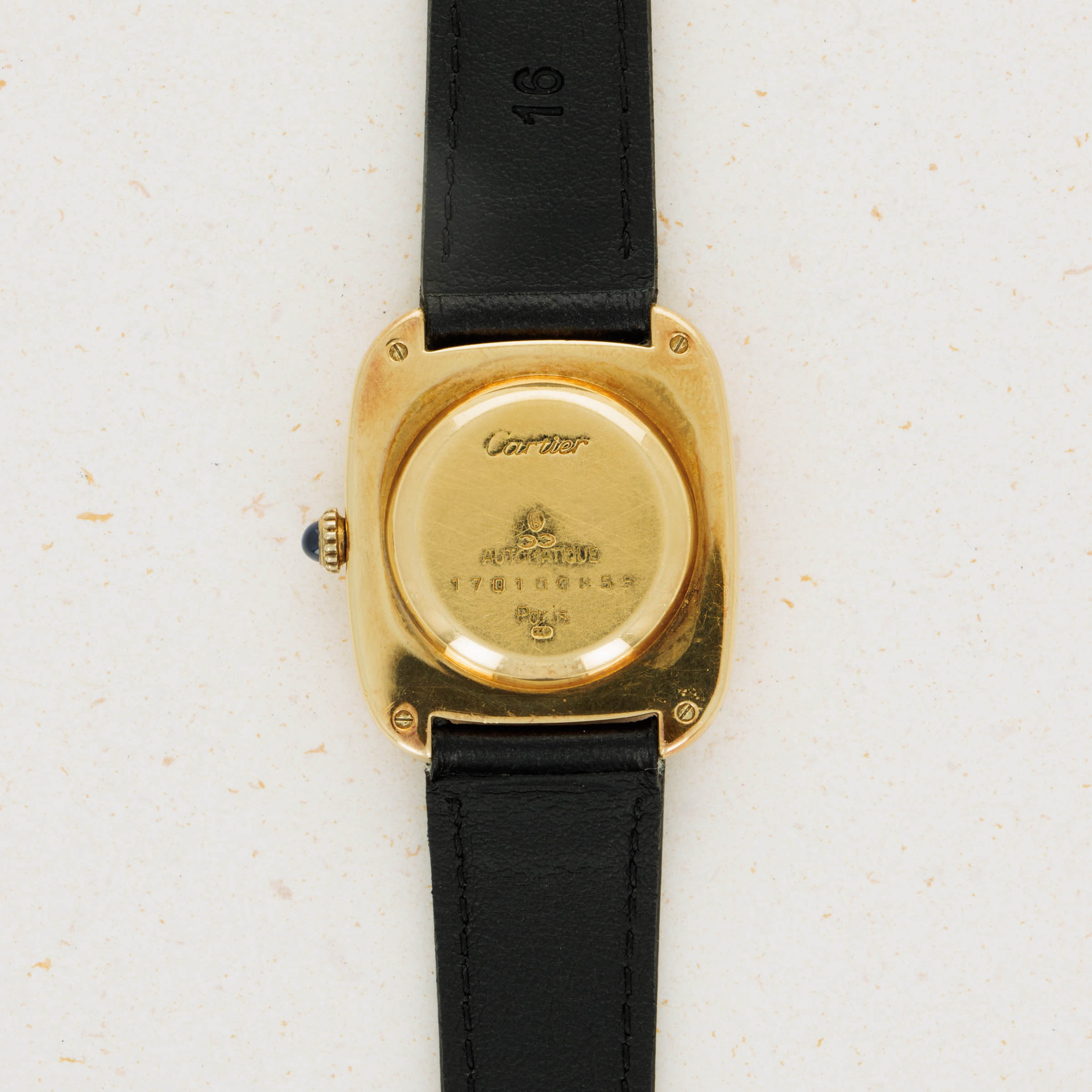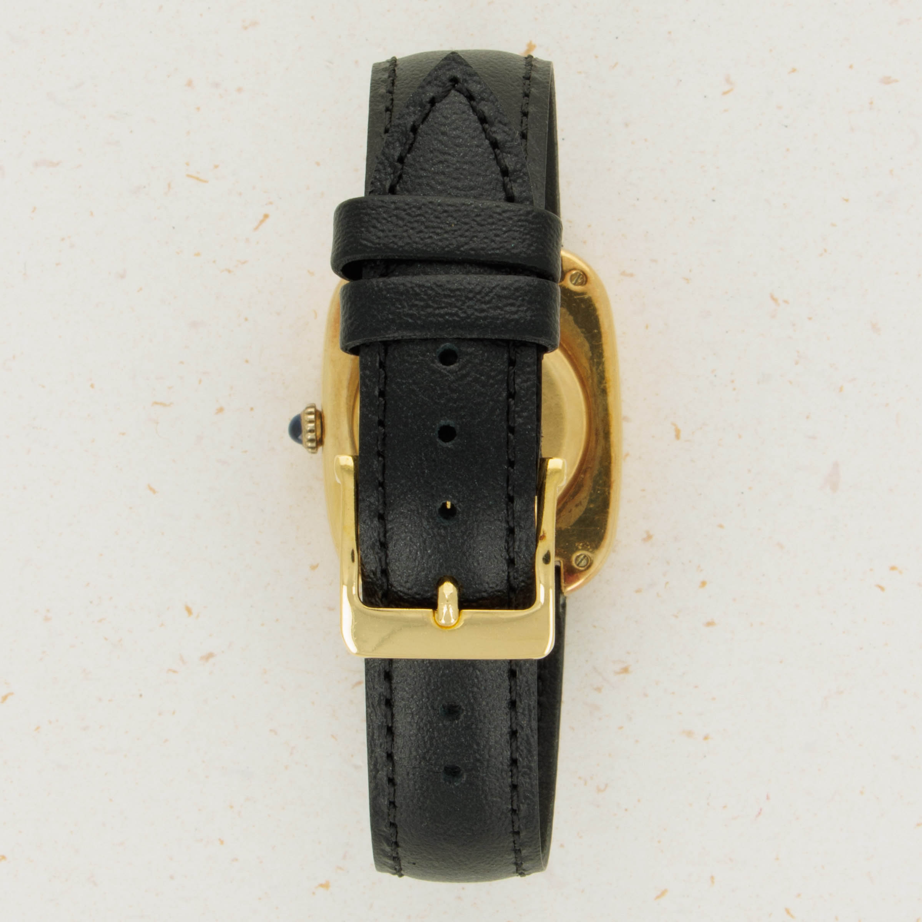 Watch in very good overall condition. Case shows moderate signs of wear, with some rounded edges and some loss of definition on the case. Engravings and stampings on caseback are worn but fully visible. Dial is very good, with some crazing visible along the surface. There is some spotting and darkening along the edge. Watch comes on a non-Cartier strap with a plated Camille Fournet buckle.