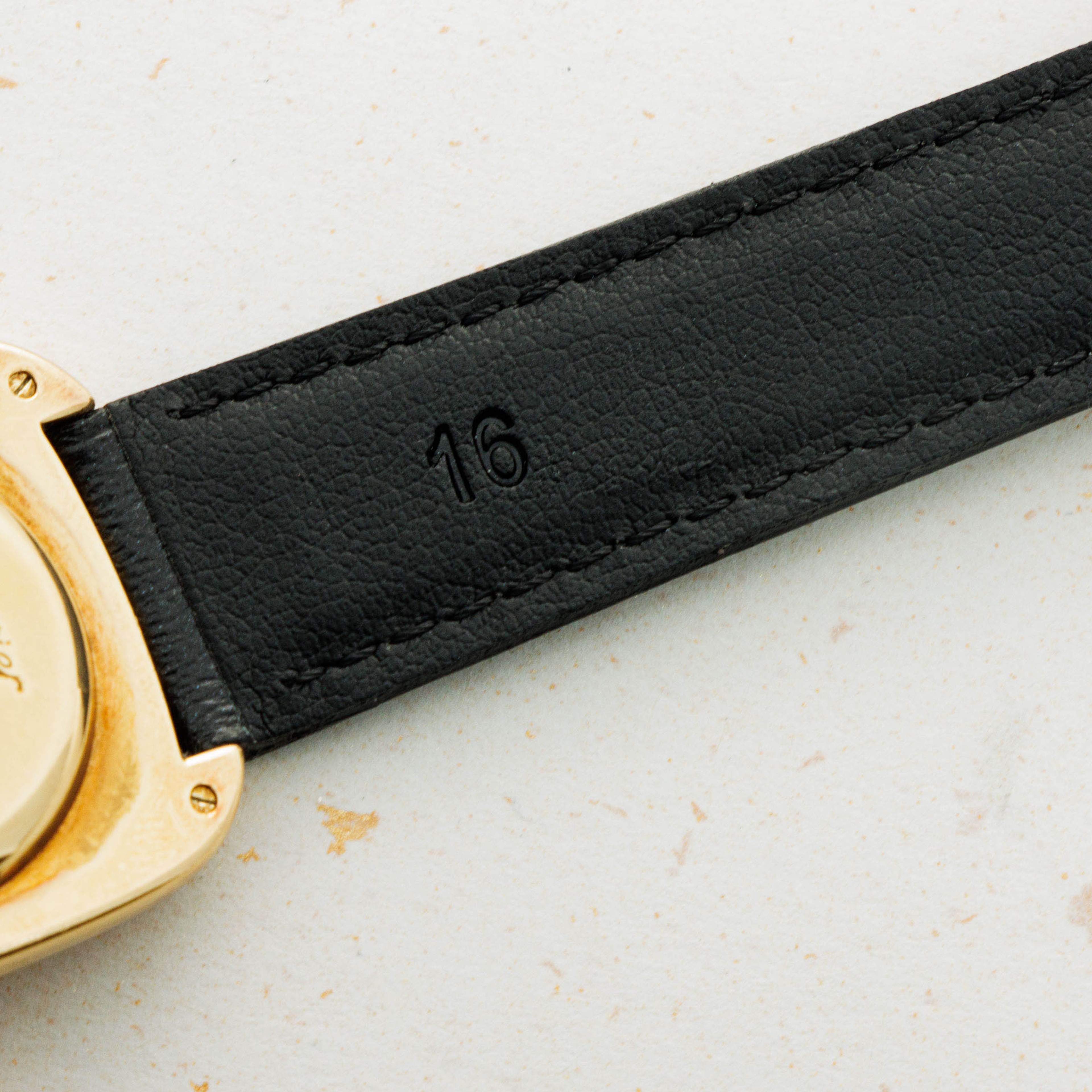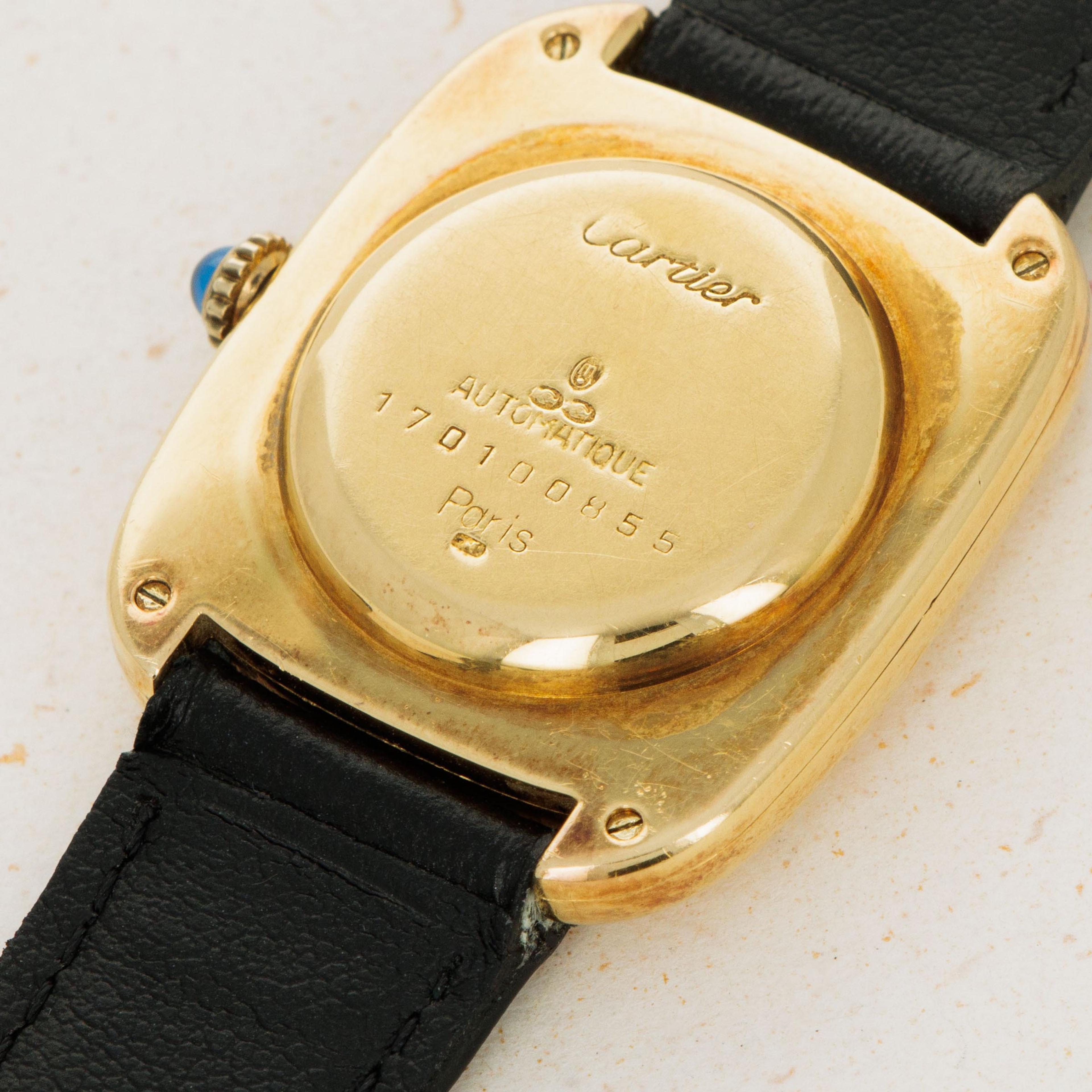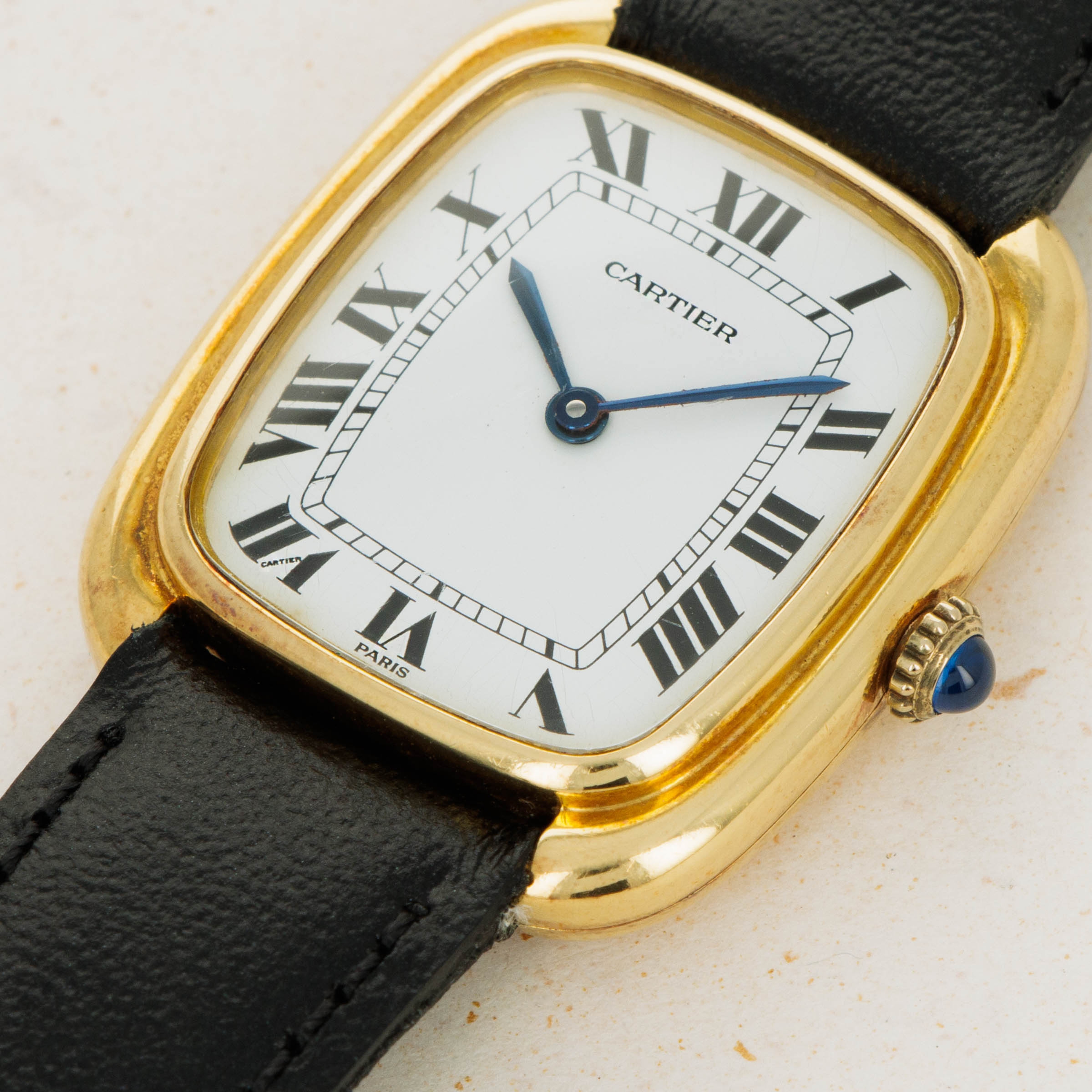 Watch in very good overall condition. Case shows moderate signs of wear, with some rounded edges and some loss of definition on the case. Engravings and stampings on caseback are worn but fully visible. Dial is very good, with some crazing visible along the surface. There is some spotting and darkening along the edge. Watch comes on a non-Cartier strap with a plated Camille Fournet buckle.