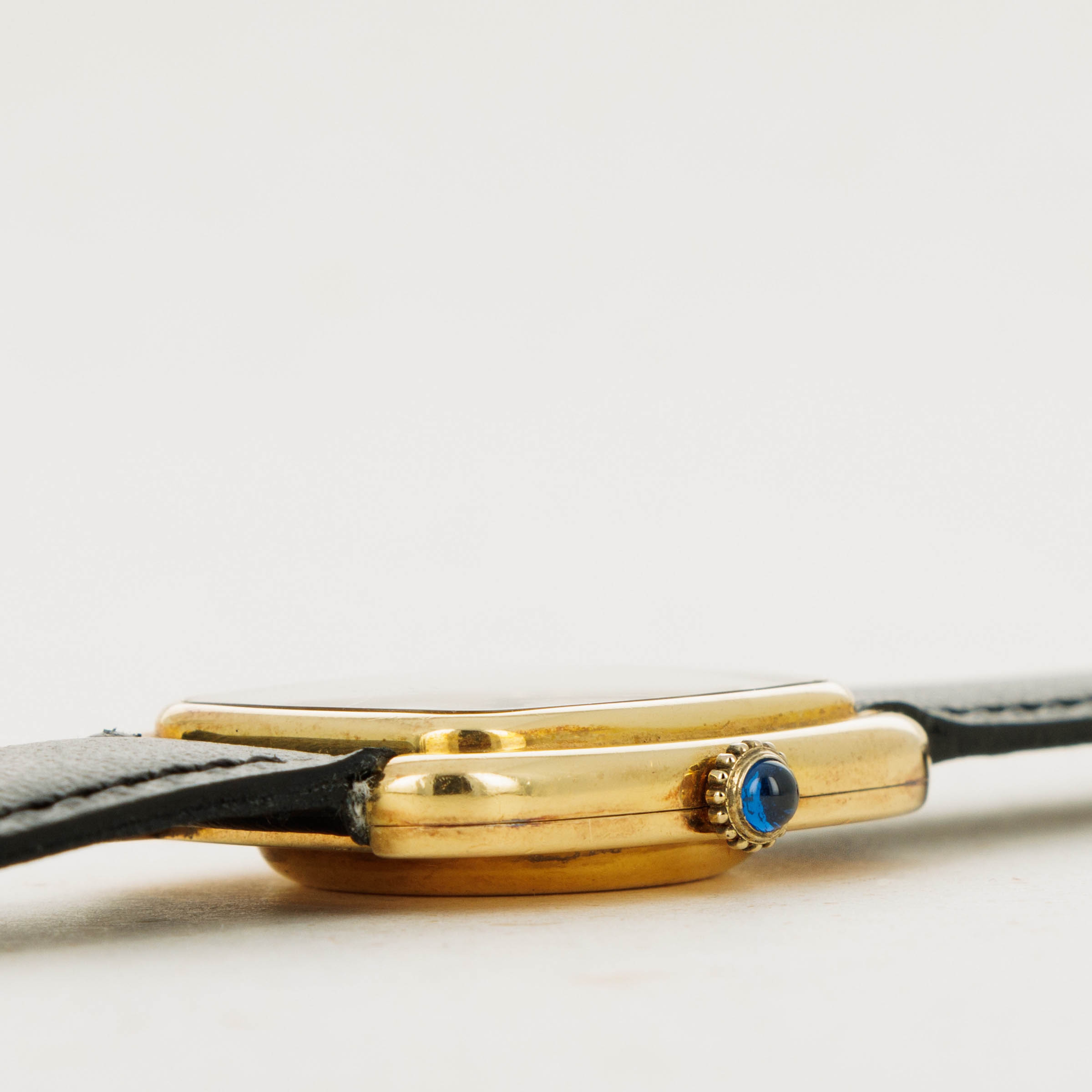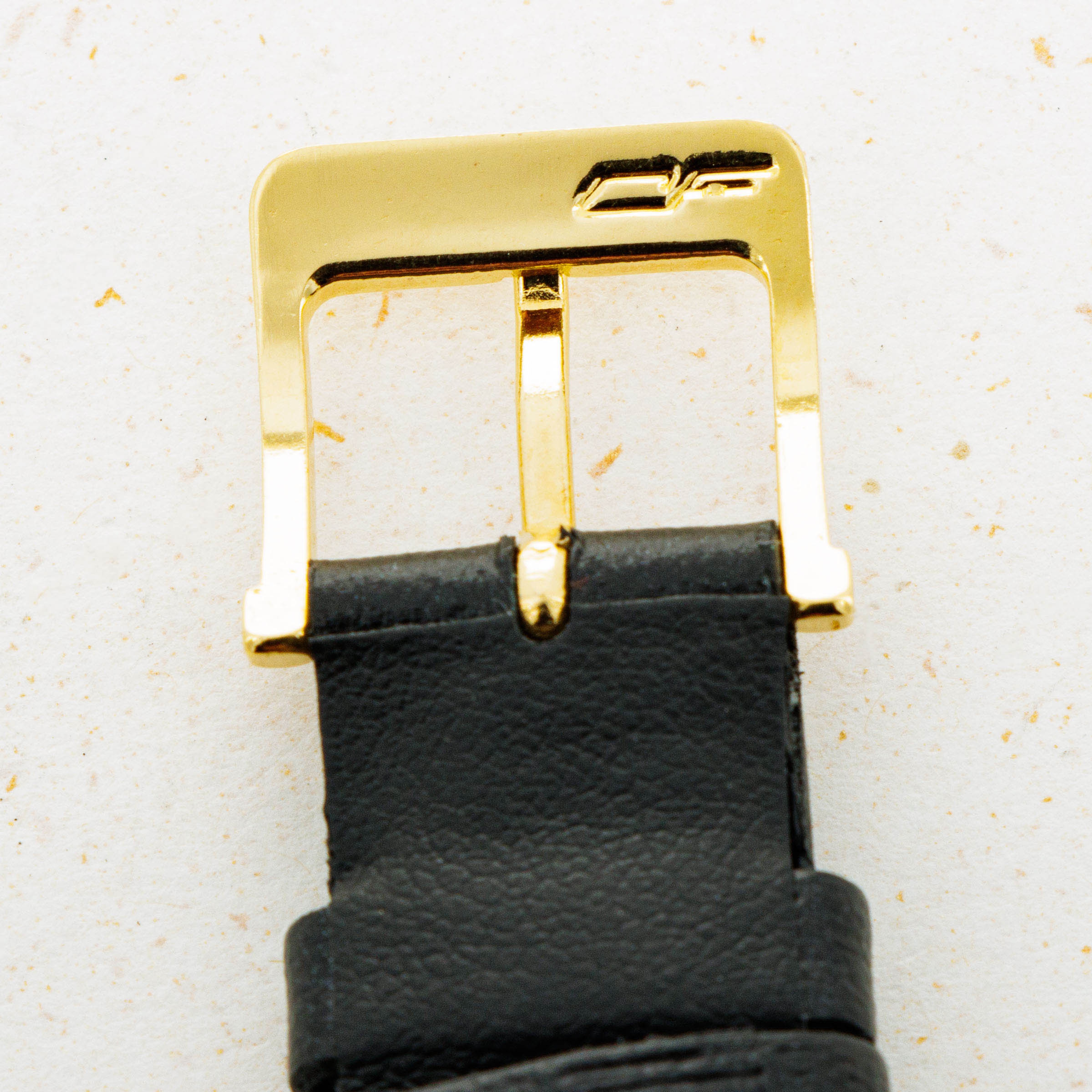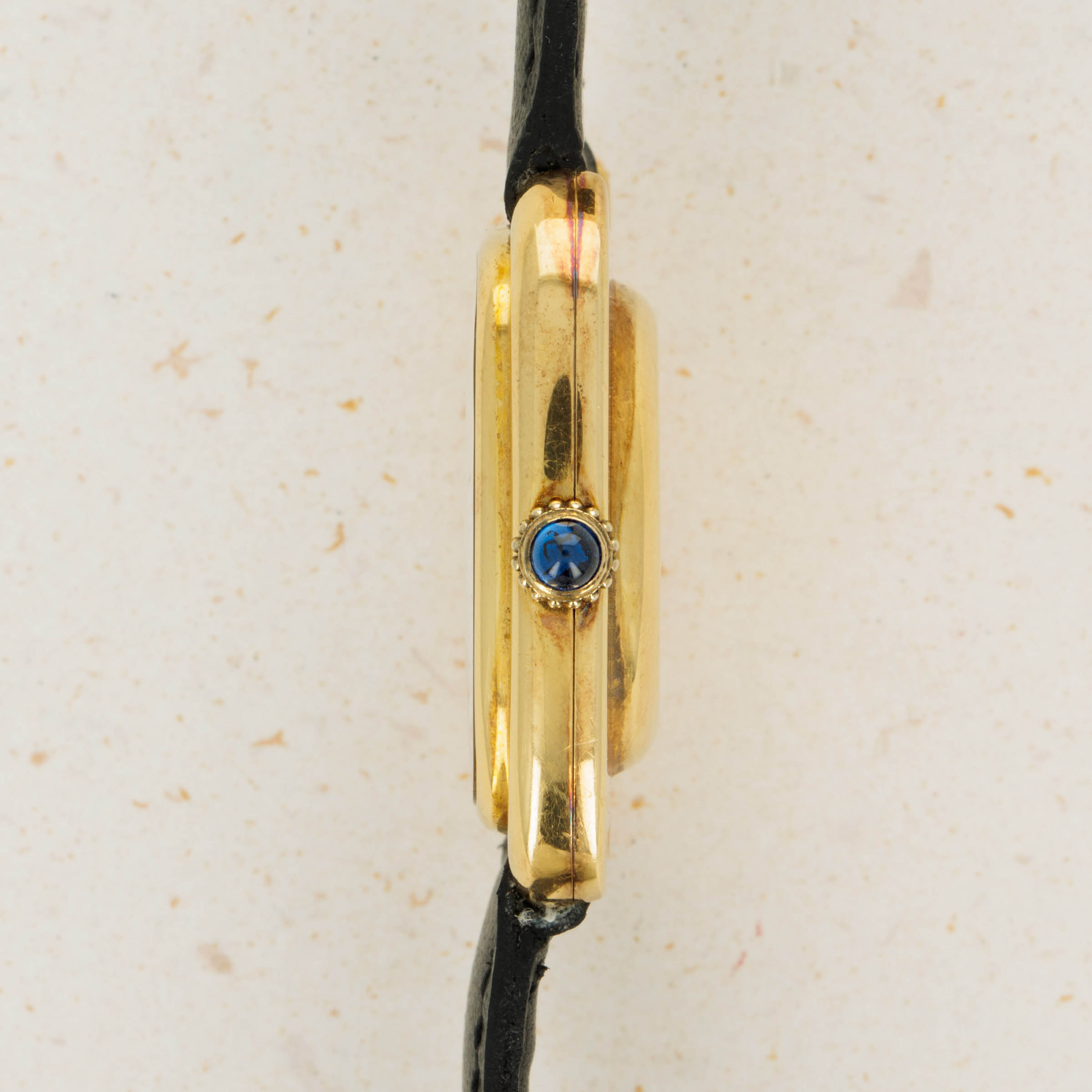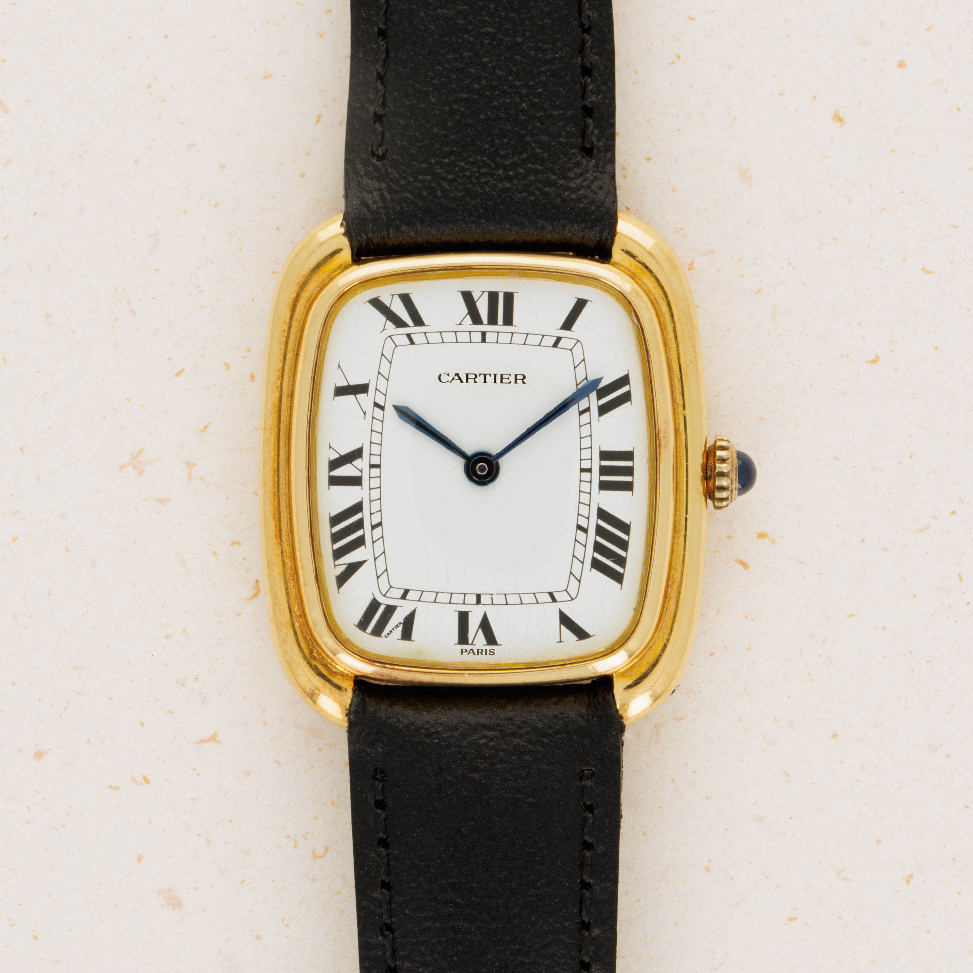 Watch in very good overall condition. Case shows moderate signs of wear, with some rounded edges and some loss of definition on the case. Engravings and stampings on caseback are worn but fully visible. Dial is very good, with some crazing visible along the surface. There is some spotting and darkening along the edge. Watch comes on a non-Cartier strap with a plated Camille Fournet buckle.