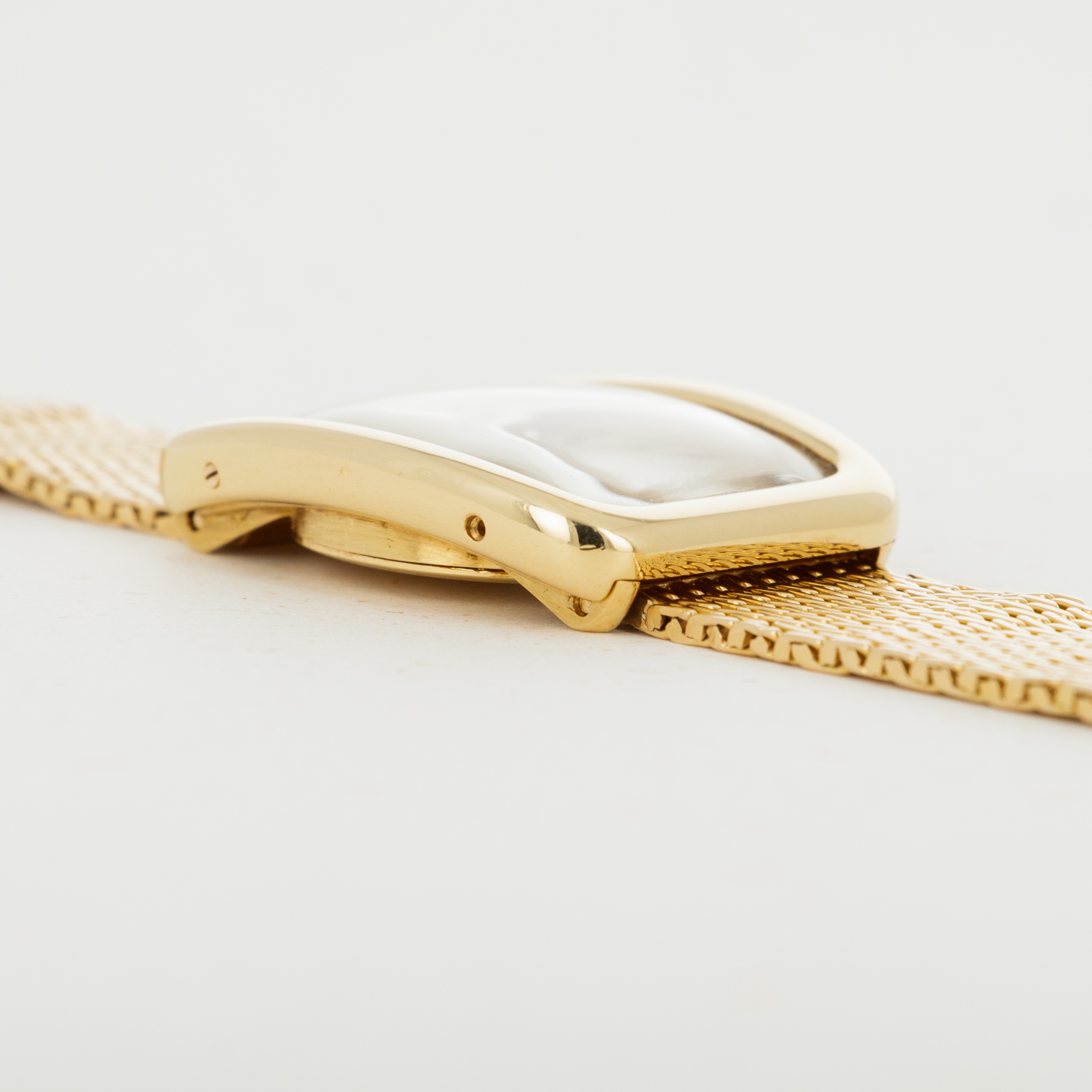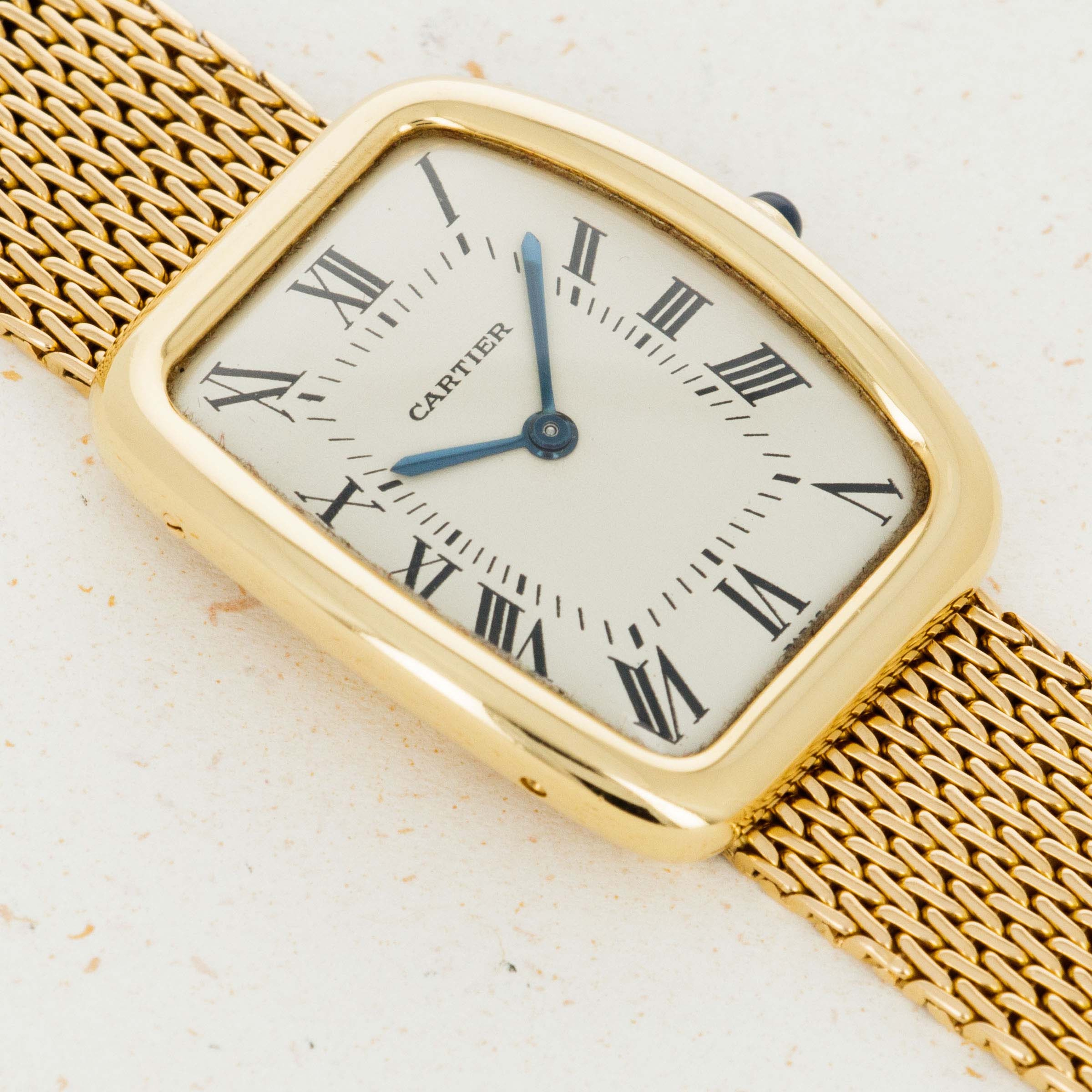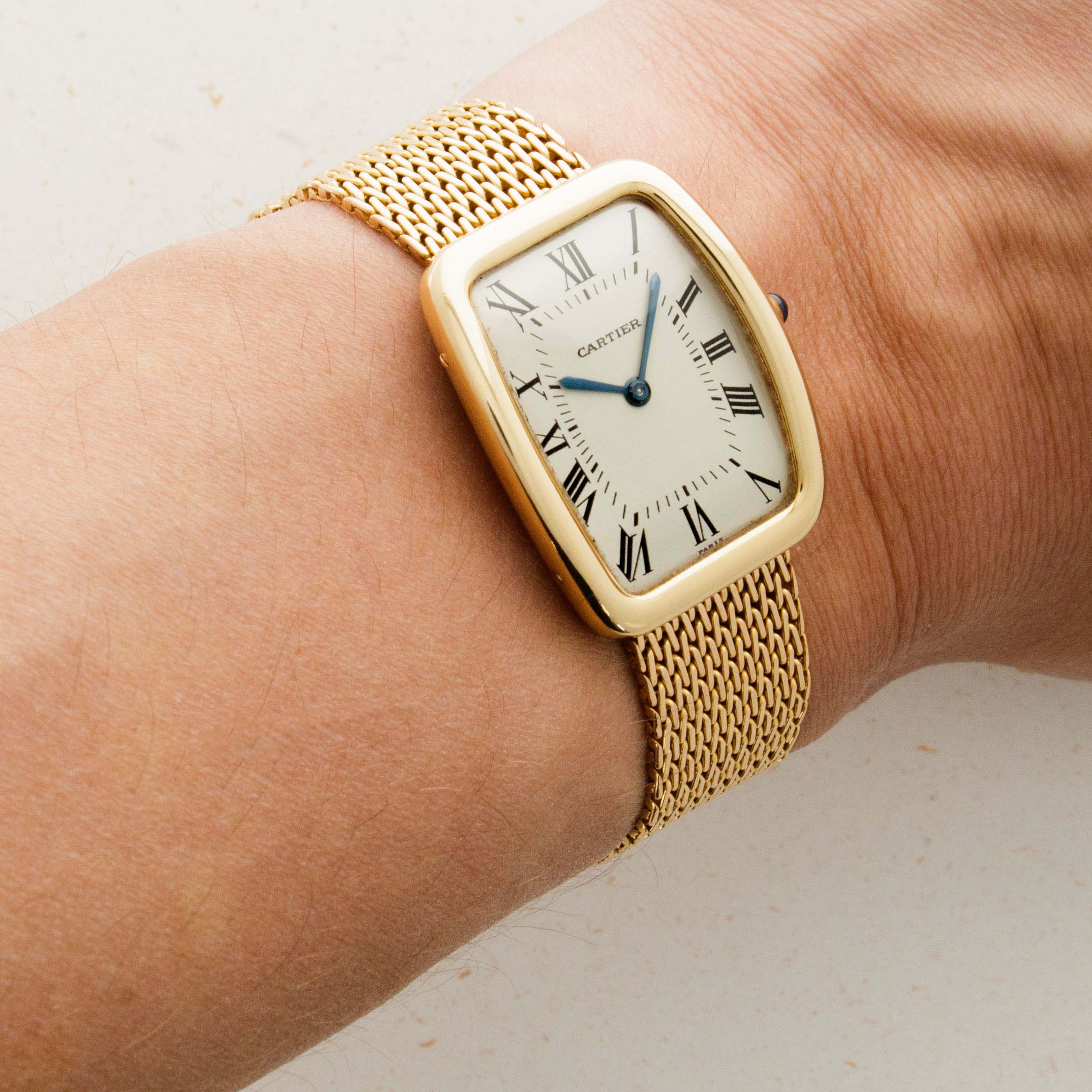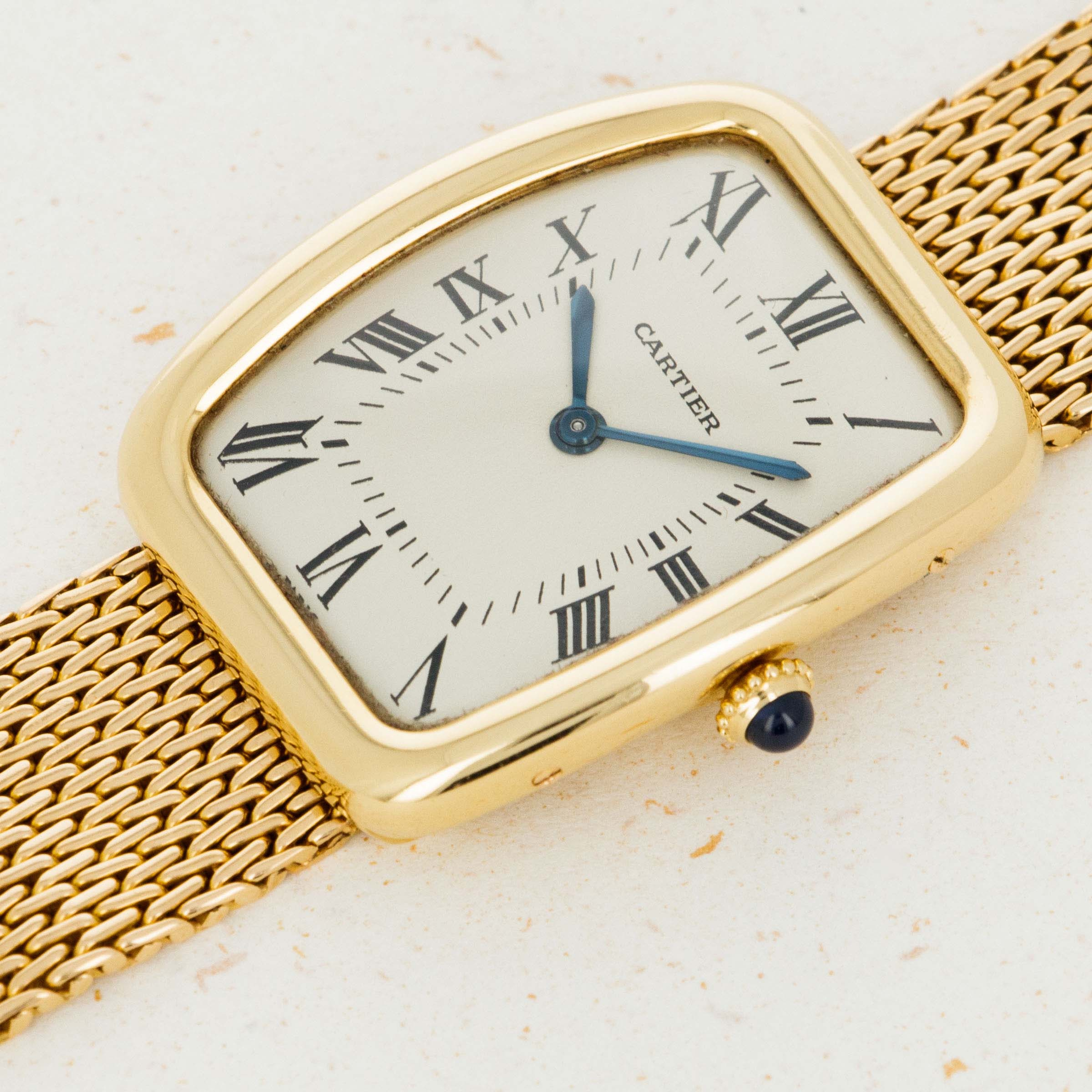 Released in 1919, the Cartier Tank was designed by Louis Cartier in 1917 after he was inspired by the shape of the Renault tanks he saw on the Western Front during WWI. Perhaps one of the most recognizable pieces of horological design to ever be created, the Tank’s rectangular shape, svelte proportions, and timeless aesthetic have enabled it to earn a top spot within the horological hall of fame. Designed and released in the 1960s, the Cartier Tank Square Incurvée, or Tank Faberge as it is also known is a rare variant of the Tank which features a tonneau-shaped case with rounded corners and a simple white dial with Cartier's signature black Roman numerals and railroad-style minute track. Fitted to an 18k gold bracelet that matches its case, this timepiece is a stunning example of Cartier's stylish design and exquisite craftsmanship.