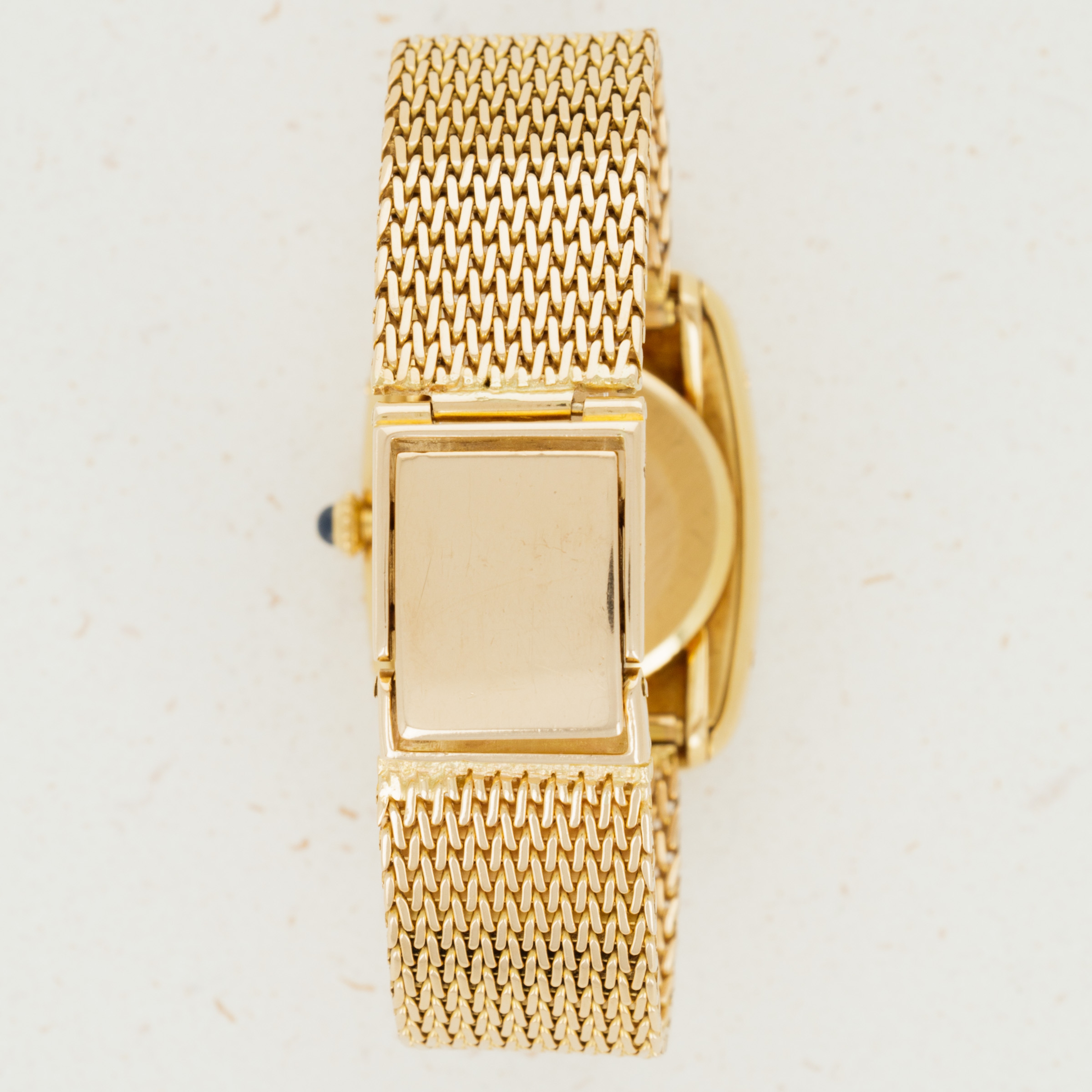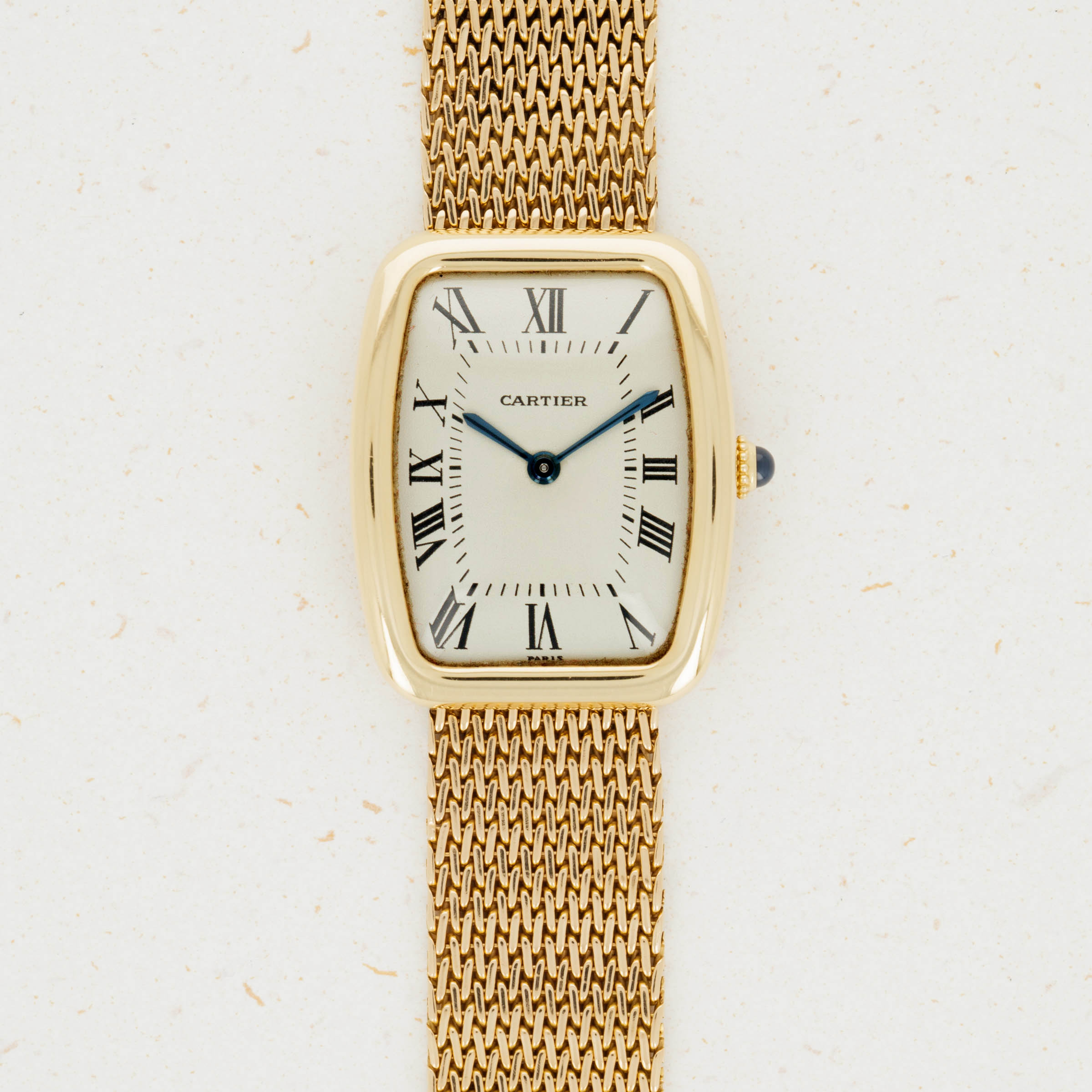 With its slightly off-white aged color, black Roman numerals, and blued steel hands, this Tank Faberge's dial is immediately recognizable as the purest distillation of Cartier's style and aesthetic.