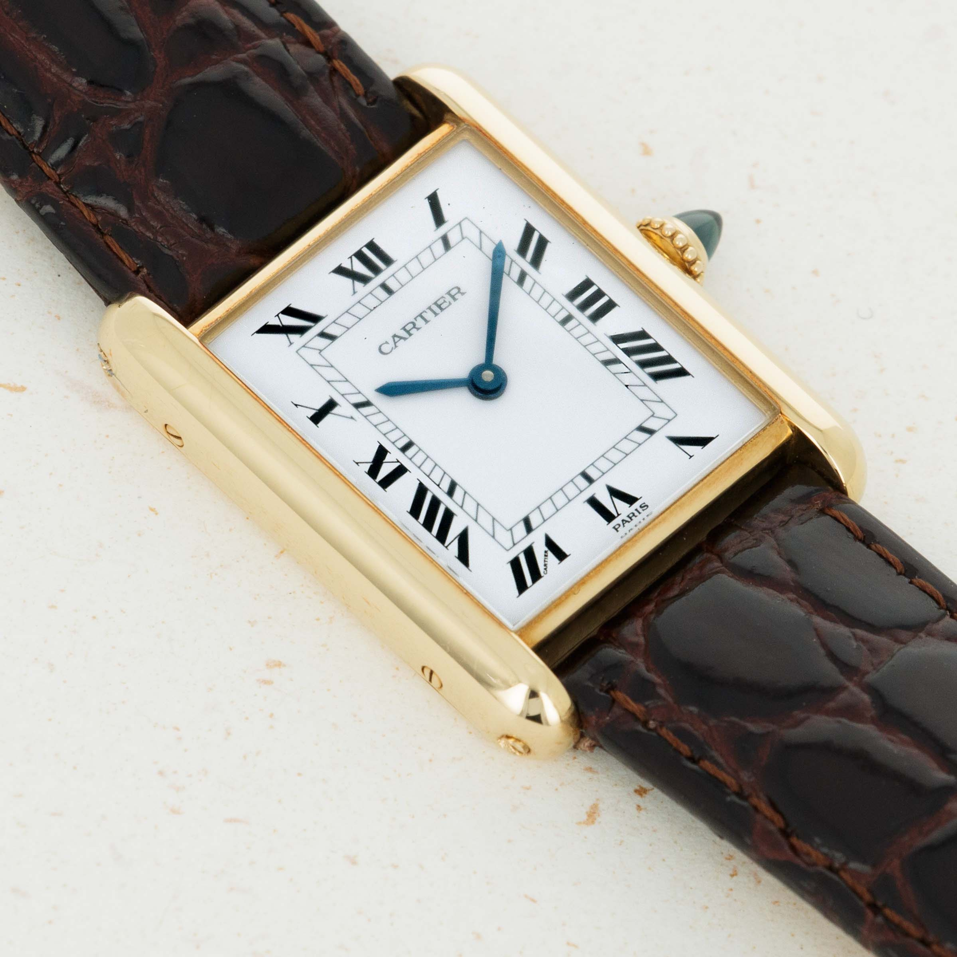 Featuring the Tank's signature crisp white dial with black Roman numerals and blued steel hands, this example's secret is its "Paris" inscription at 6 o'clock denoting its rarity and collectability over more common "Swiss" signed examples.