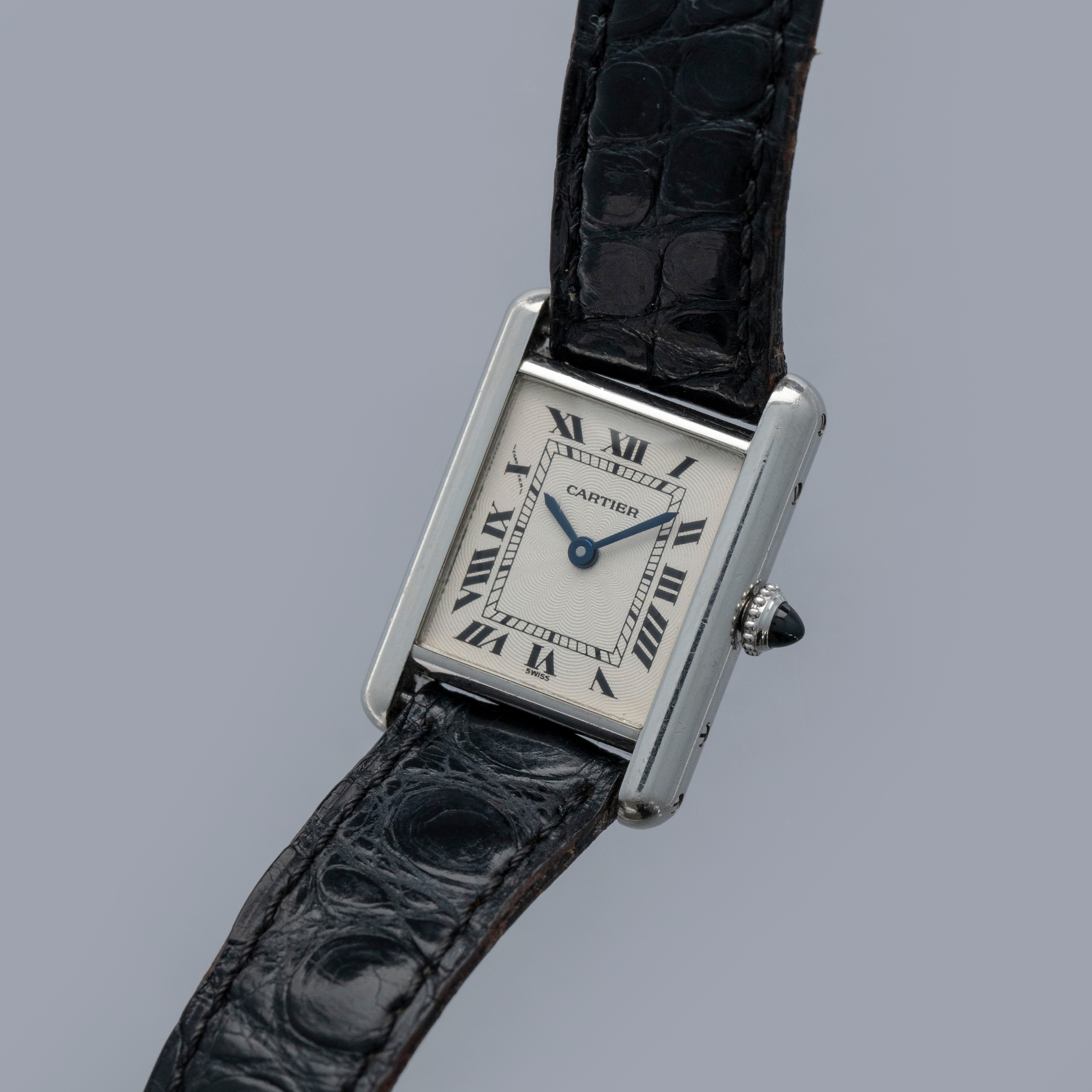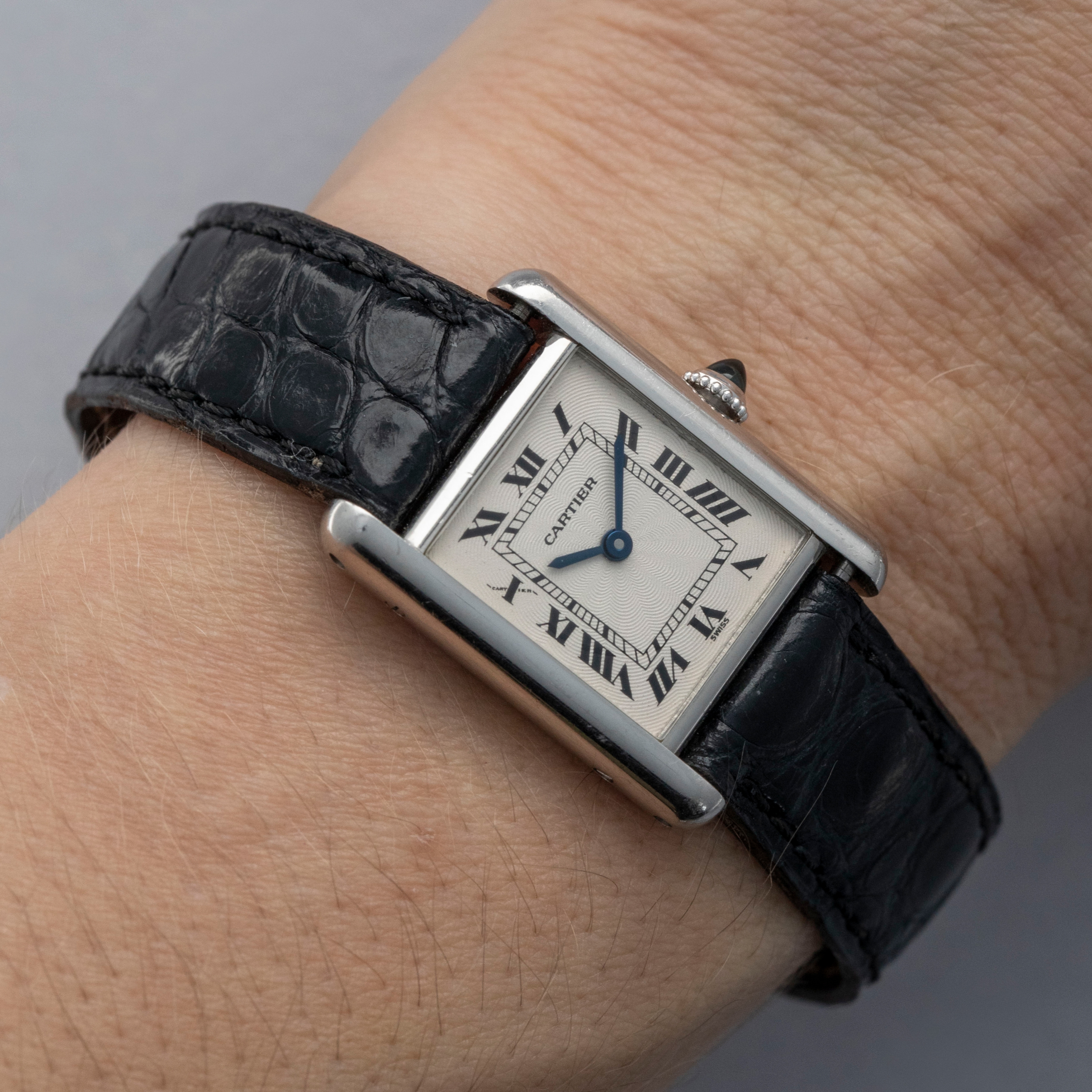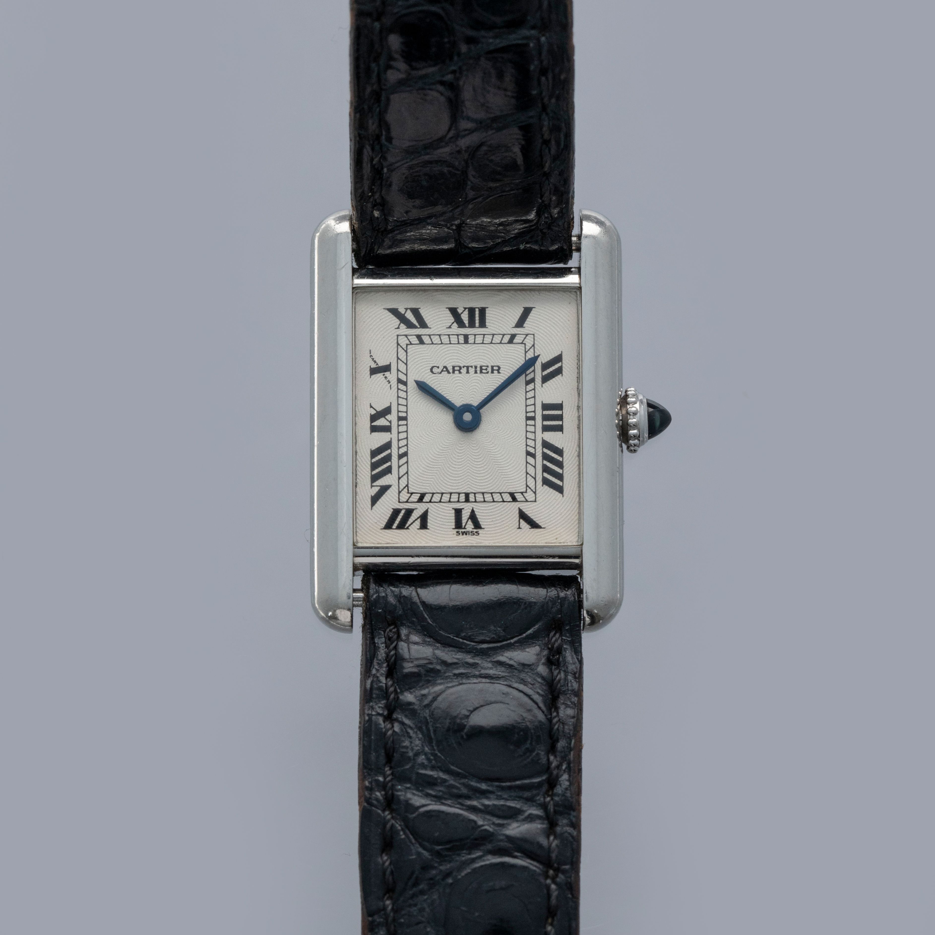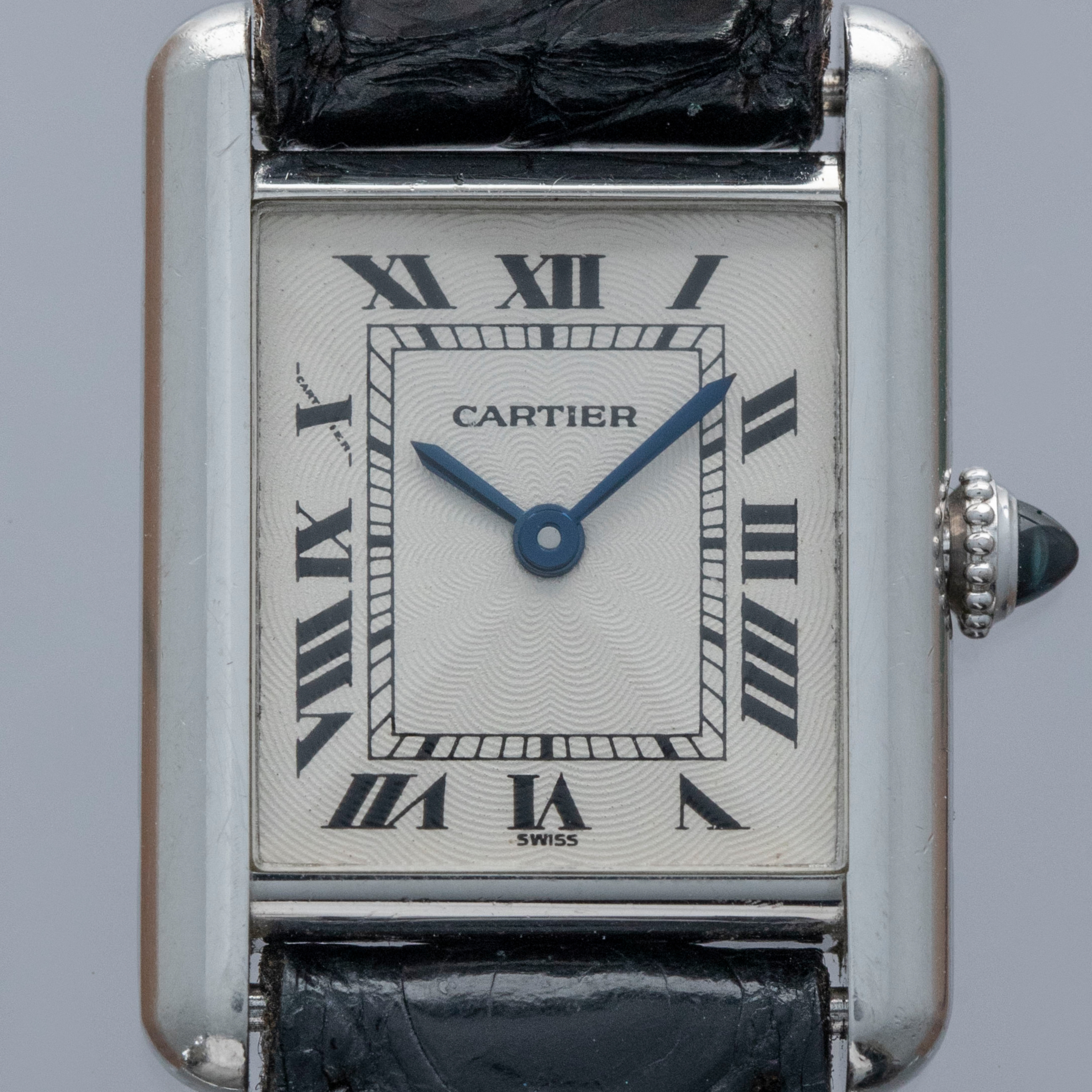 Featuring Cartier's signature crisp white dial with their iconic combination of black Roman numerals, blued steel hands, and a rosette-pattern guilloche engraving, this Tank's dial design has become a lynchpin of the brand's aesthetic.