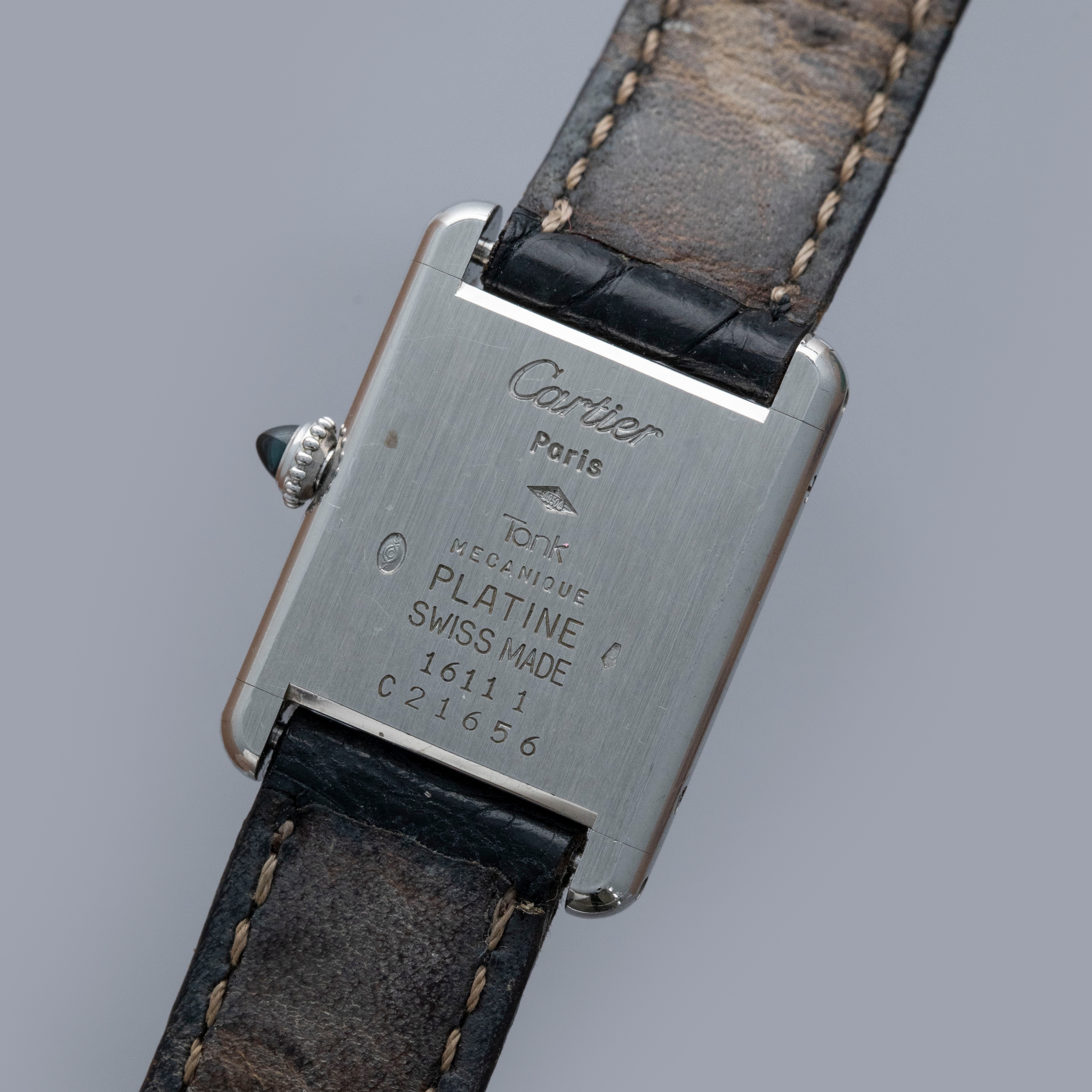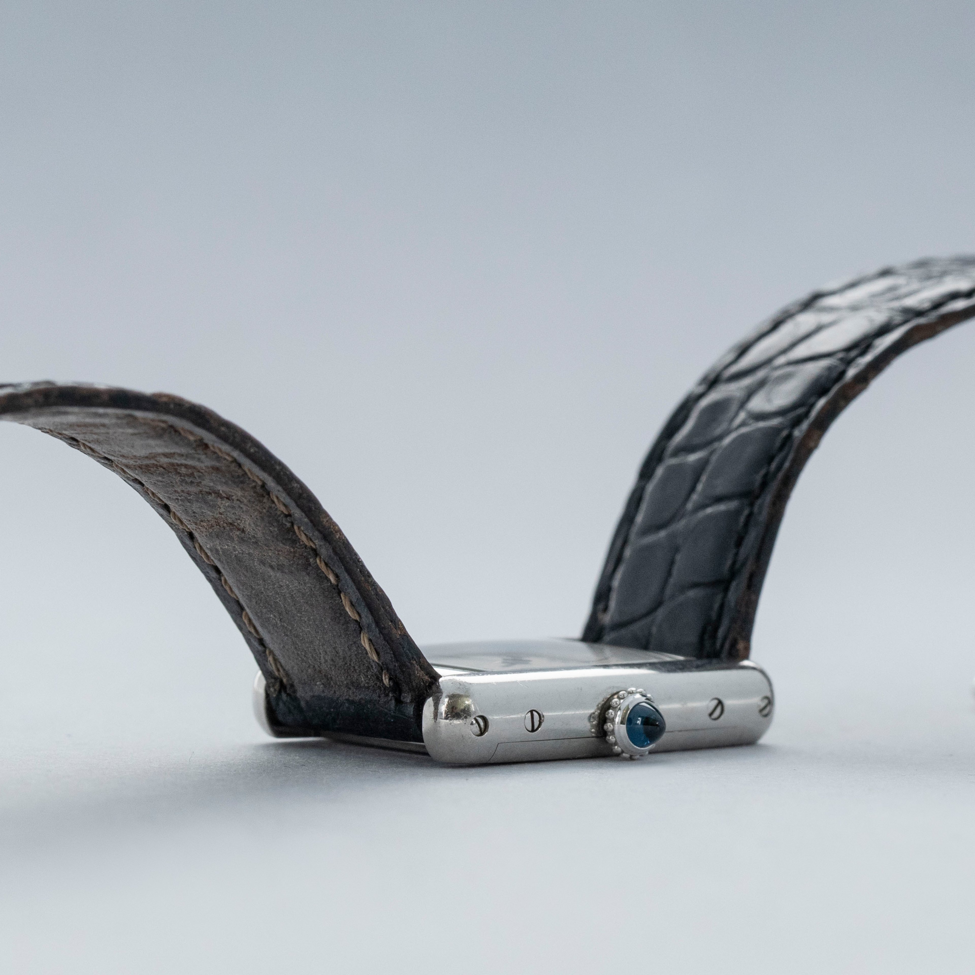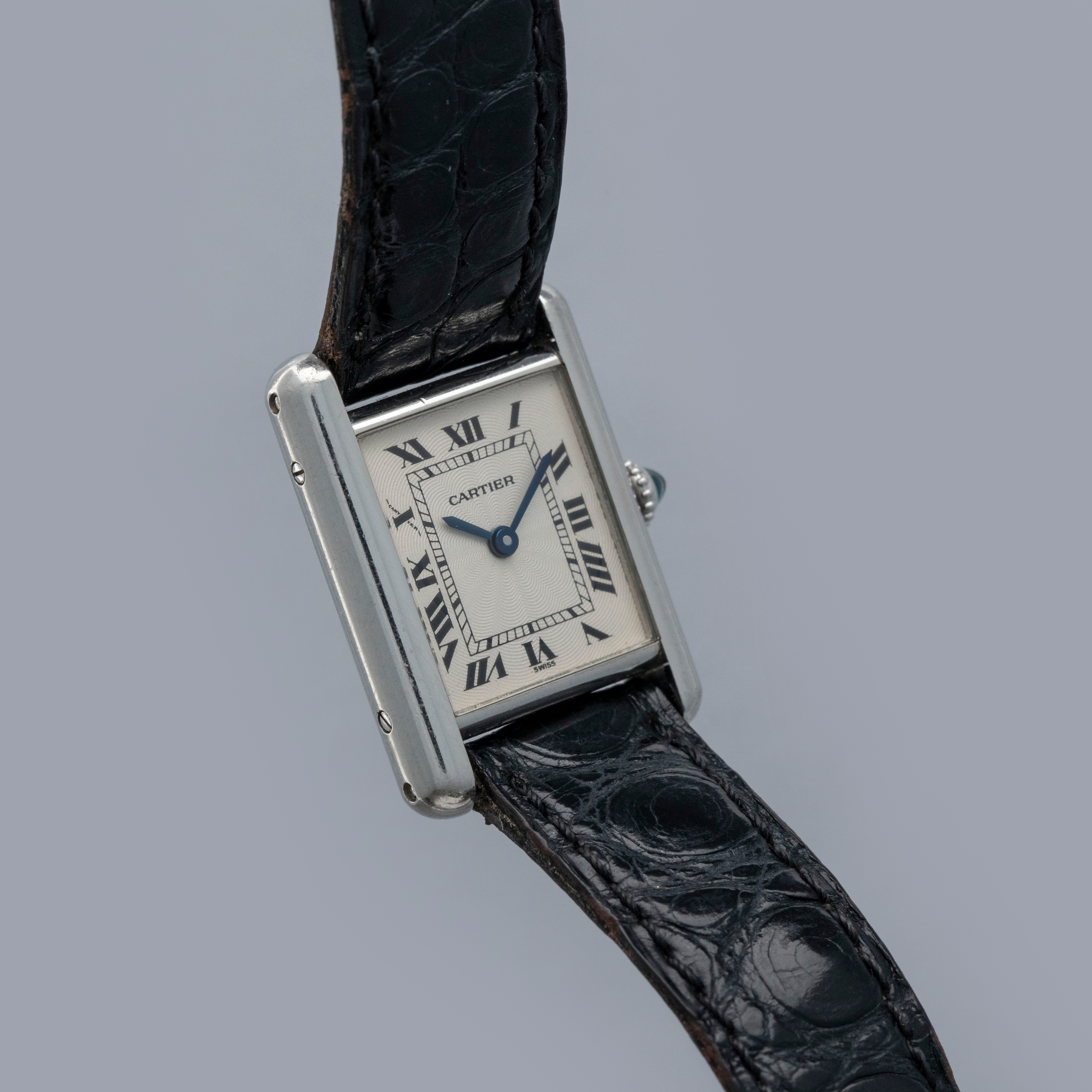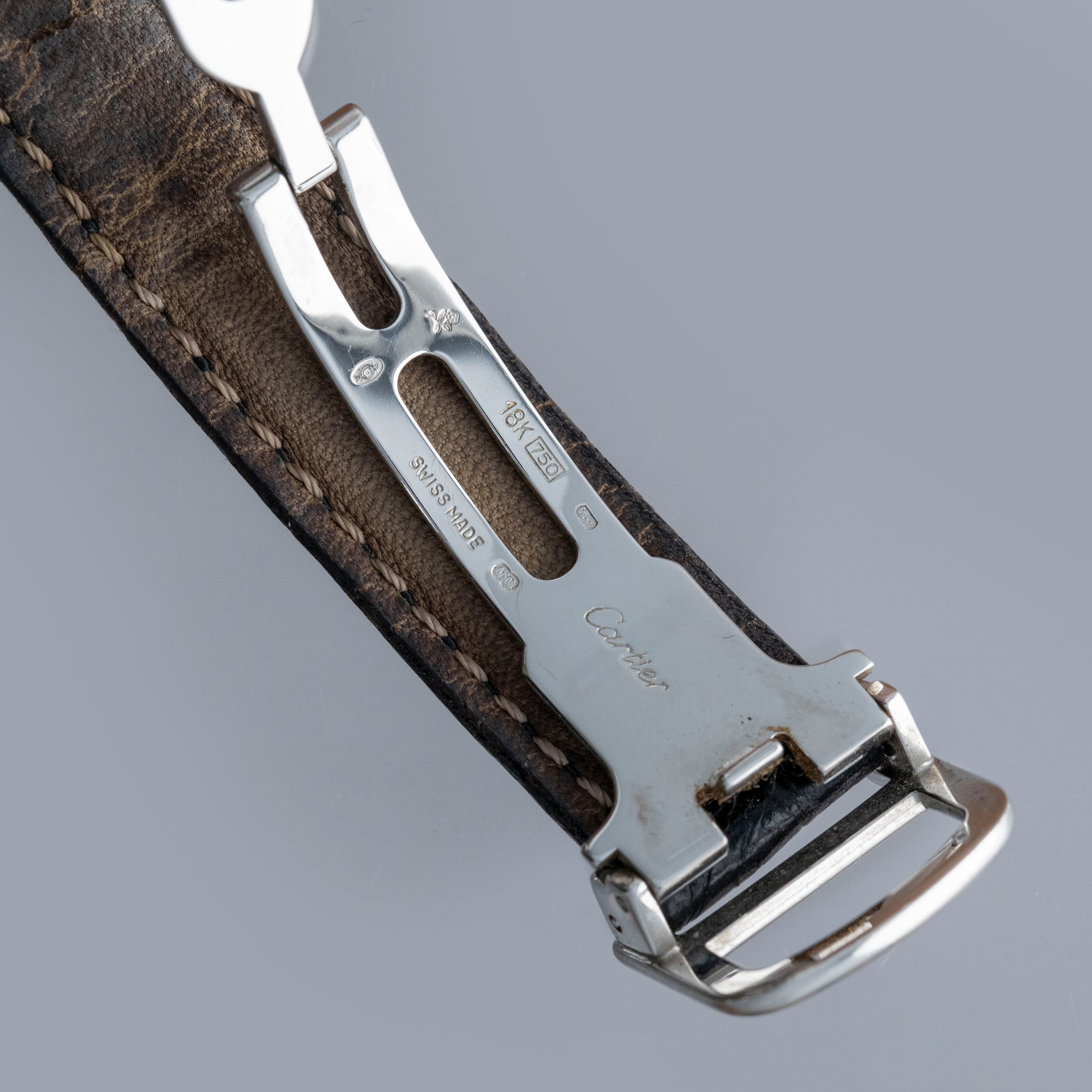 Watch is in overall excellent condition. The platinum case shows light surface scratches and marks, while the case back retains well-defined engravings and hallmarks. The cabochon winding crown remains excellent. The guilloché dial, with hidden signature at 10, remains in excellent condition with a few small marks around the edge, while the blued hands remain very clean. It is fitted with a black alligator strap in good condition and an excellent platinum Cartier deployant clasp. Please note that the watch ticks at time of cataloging, but timekeeping is poor and a service is recommended.