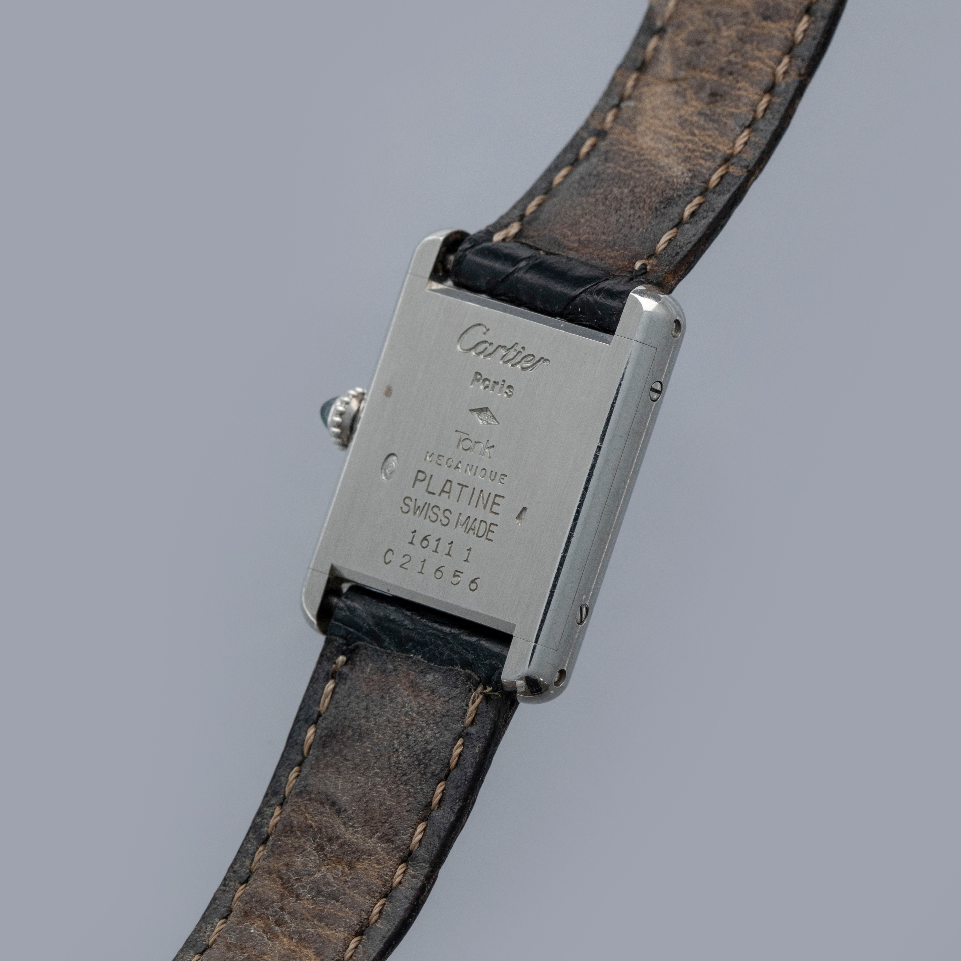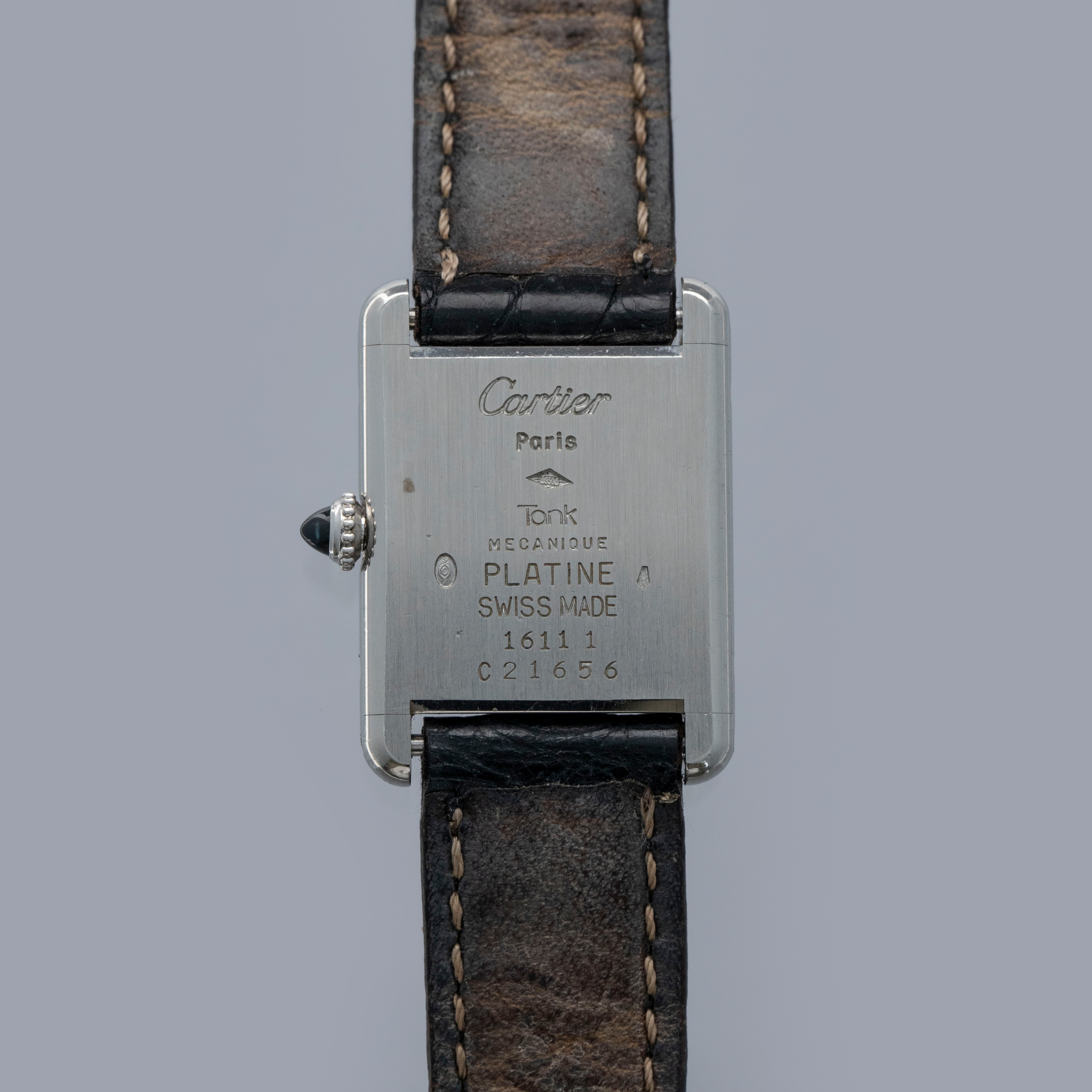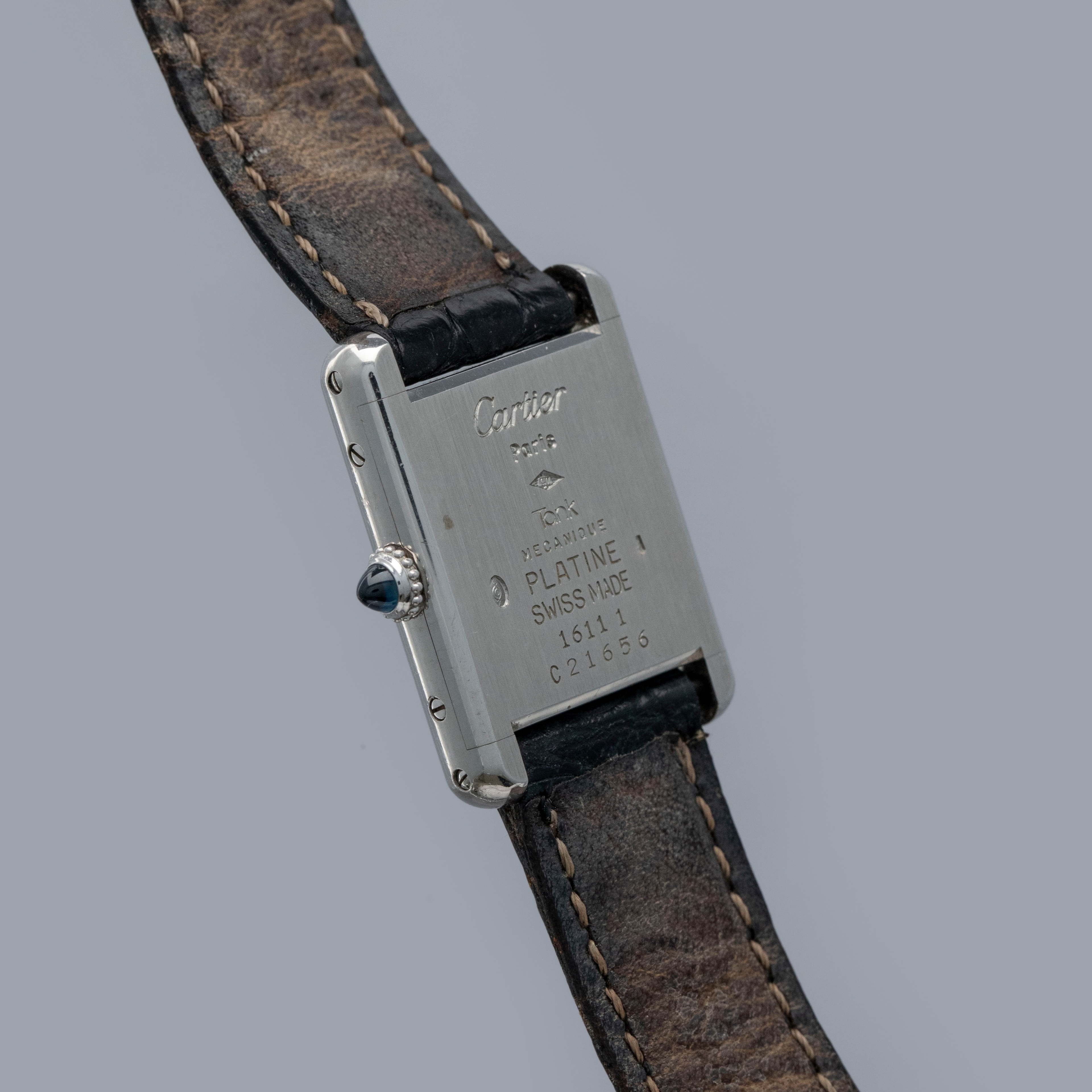 Watch is in overall excellent condition. The platinum case shows light surface scratches and marks, while the case back retains well-defined engravings and hallmarks. The cabochon winding crown remains excellent. The guilloché dial, with hidden signature at 10, remains in excellent condition with a few small marks around the edge, while the blued hands remain very clean. It is fitted with a black alligator strap in good condition and an excellent platinum Cartier deployant clasp. Please note that the watch ticks at time of cataloging, but timekeeping is poor and a service is recommended.