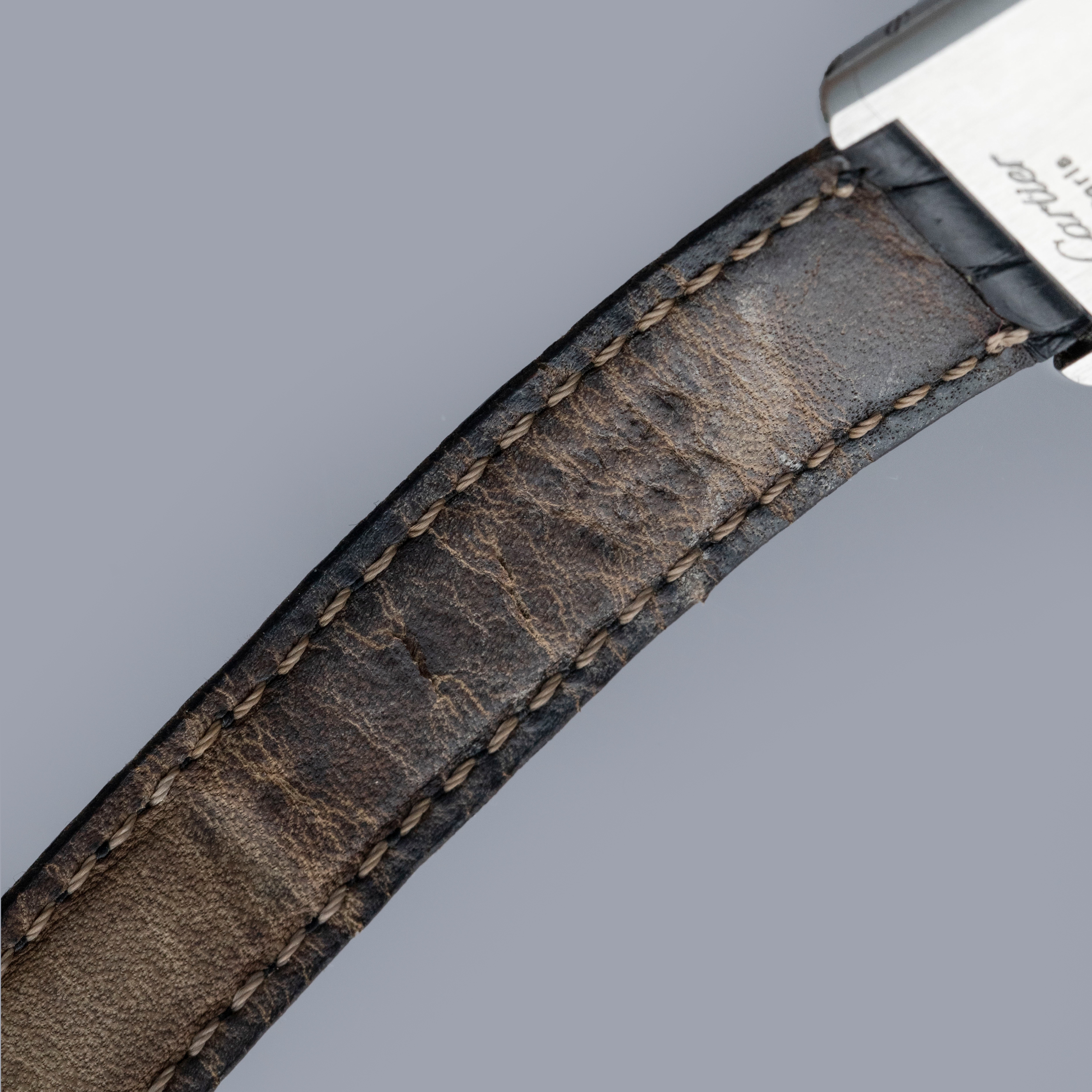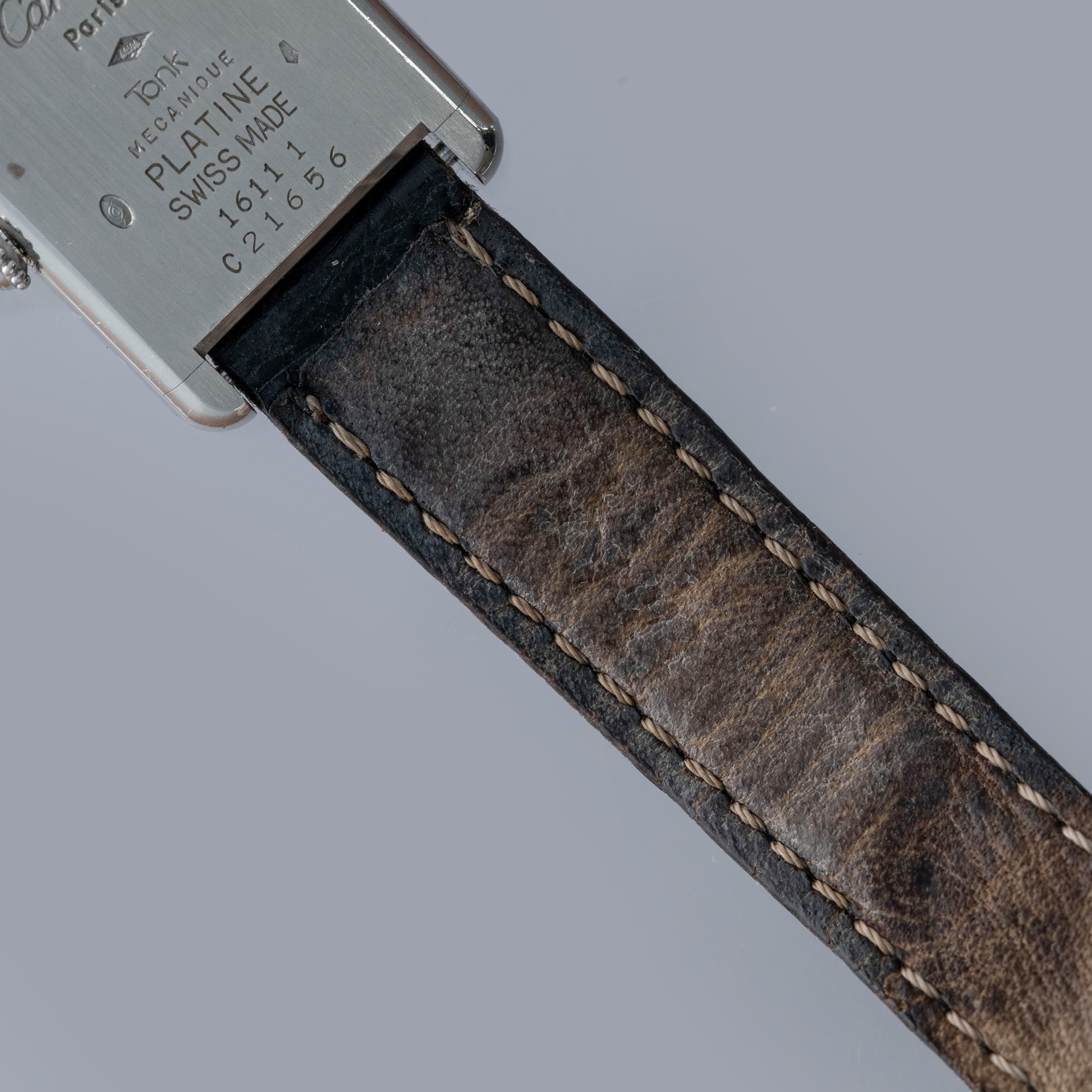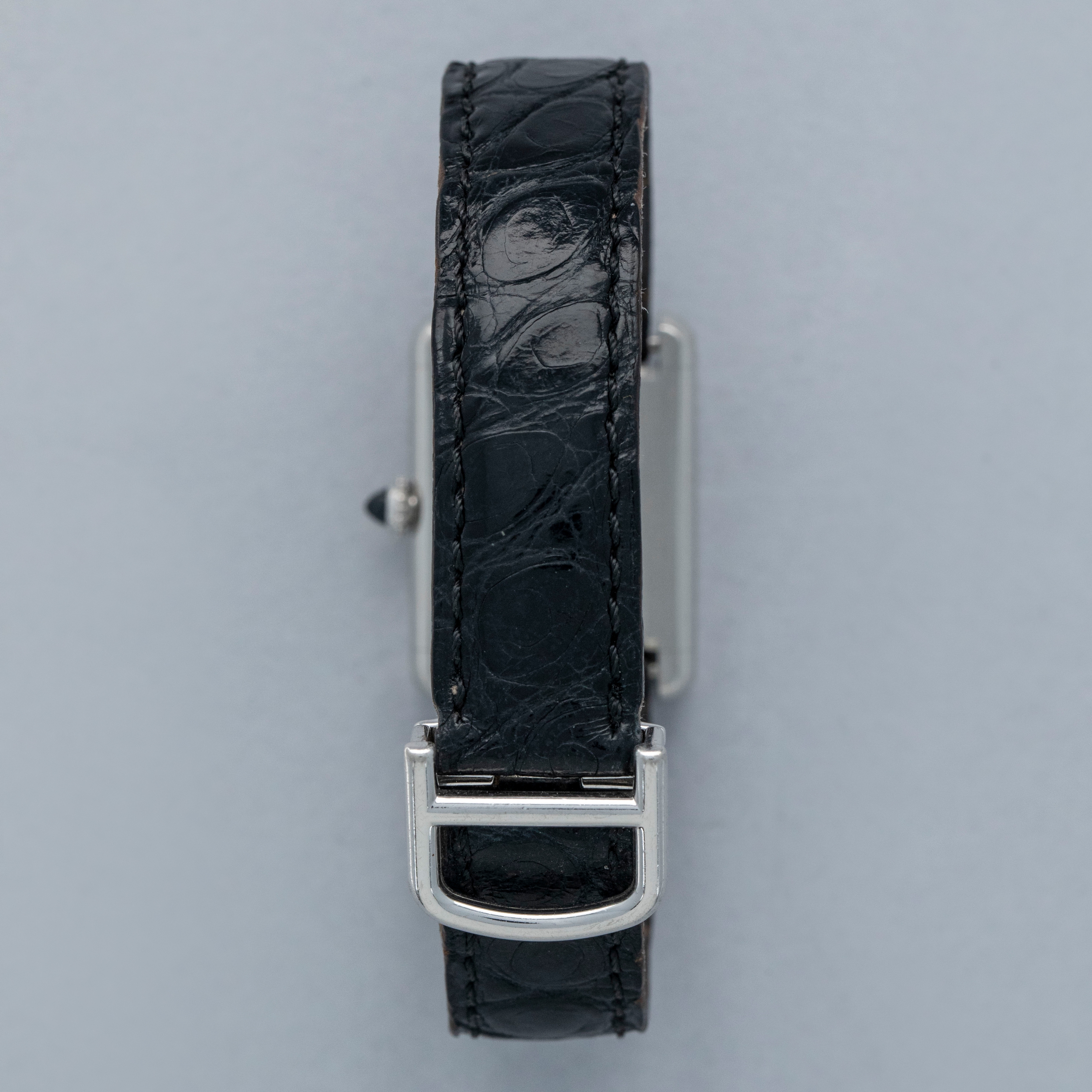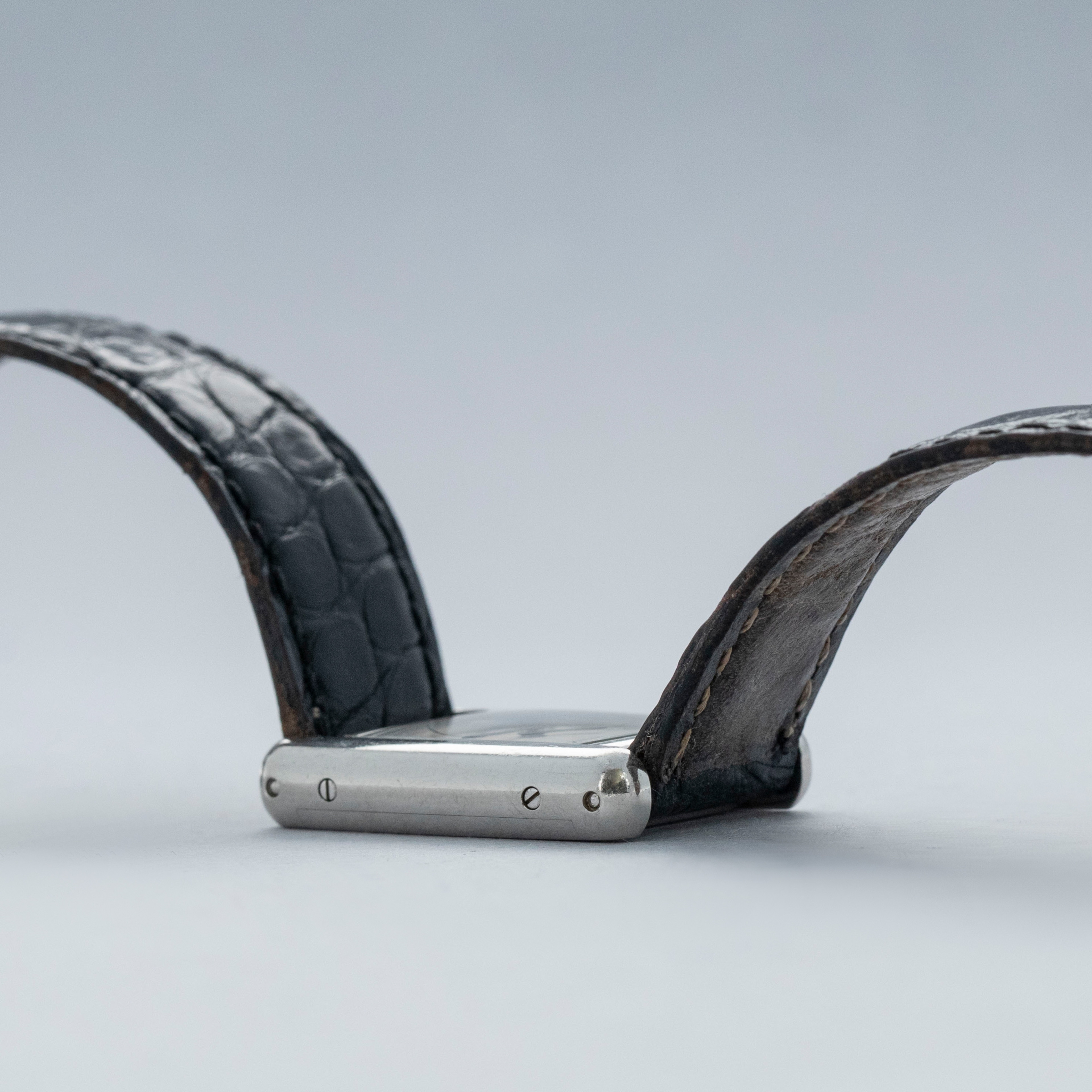 Watch is in overall excellent condition. The platinum case shows light surface scratches and marks, while the case back retains well-defined engravings and hallmarks. The cabochon winding crown remains excellent. The guilloché dial, with hidden signature at 10, remains in excellent condition with a few small marks around the edge, while the blued hands remain very clean. It is fitted with a black alligator strap in good condition and an excellent platinum Cartier deployant clasp. Please note that the watch ticks at time of cataloging, but timekeeping is poor and a service is recommended.