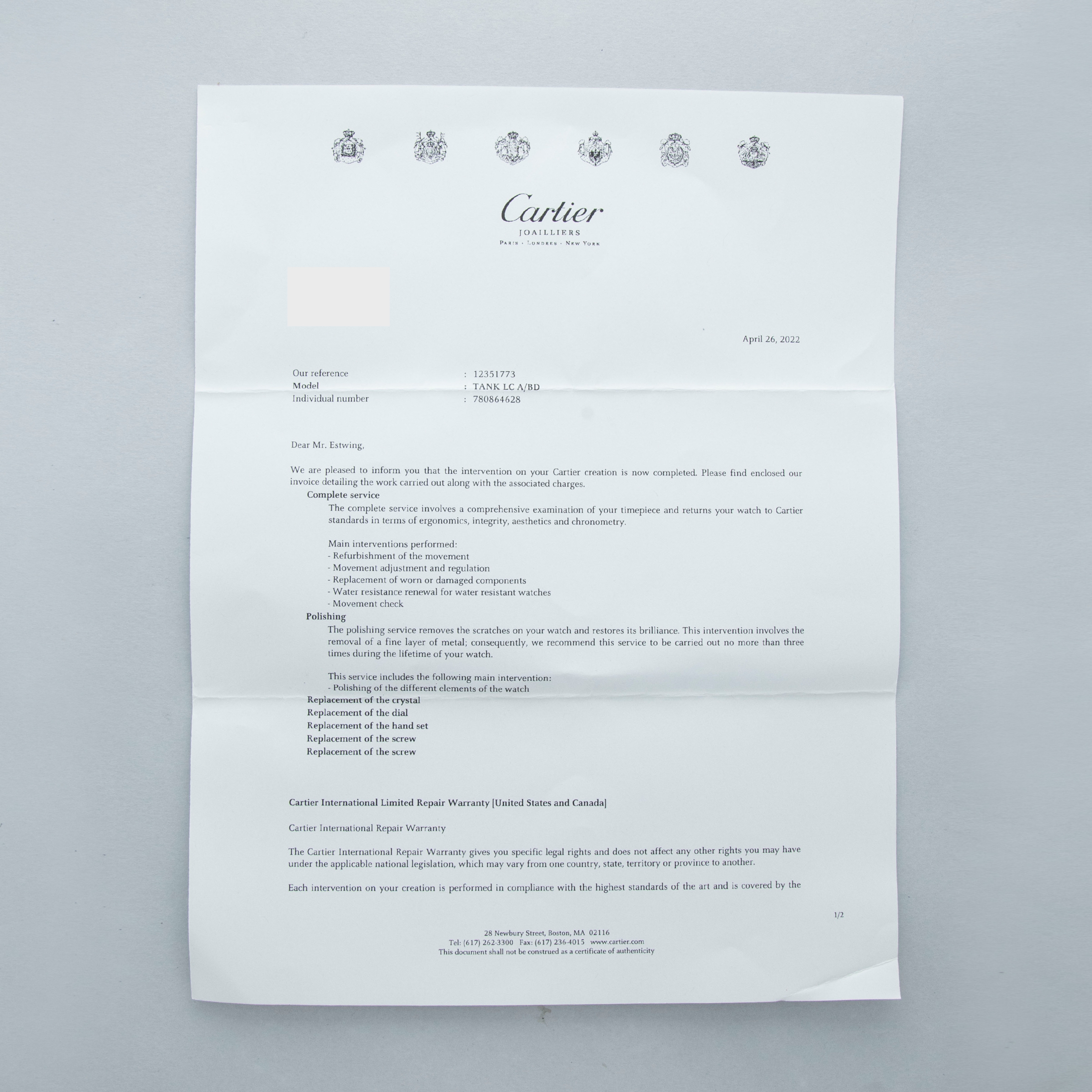 Watch, 2022-dated Cartier service invoice, and service pouch