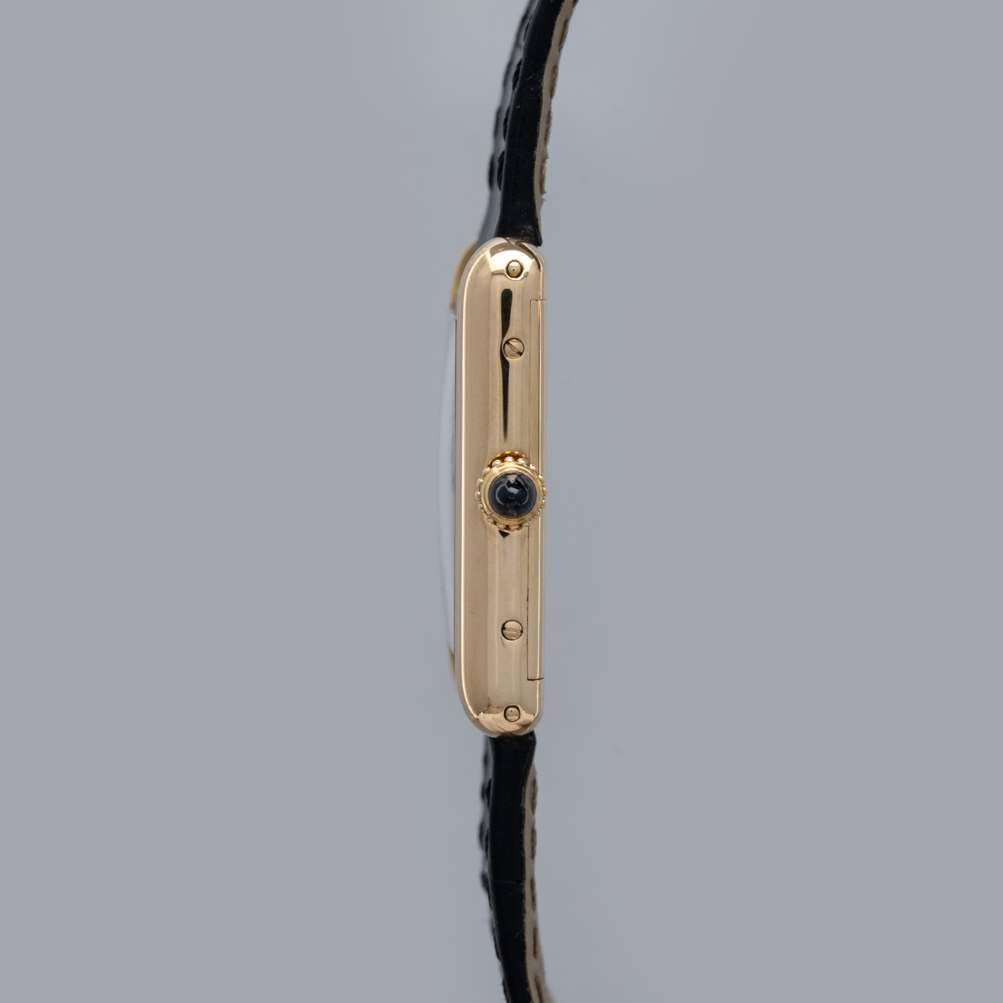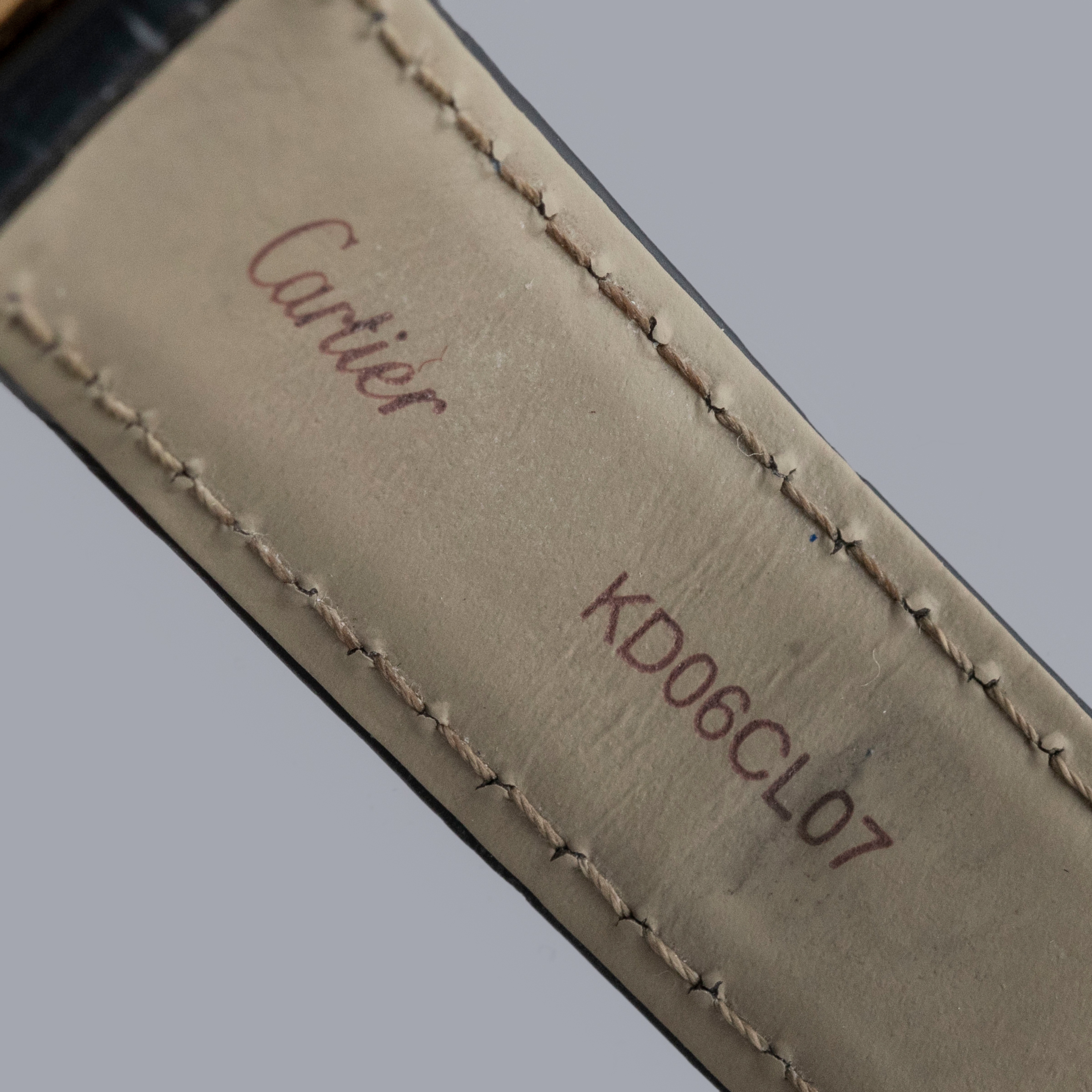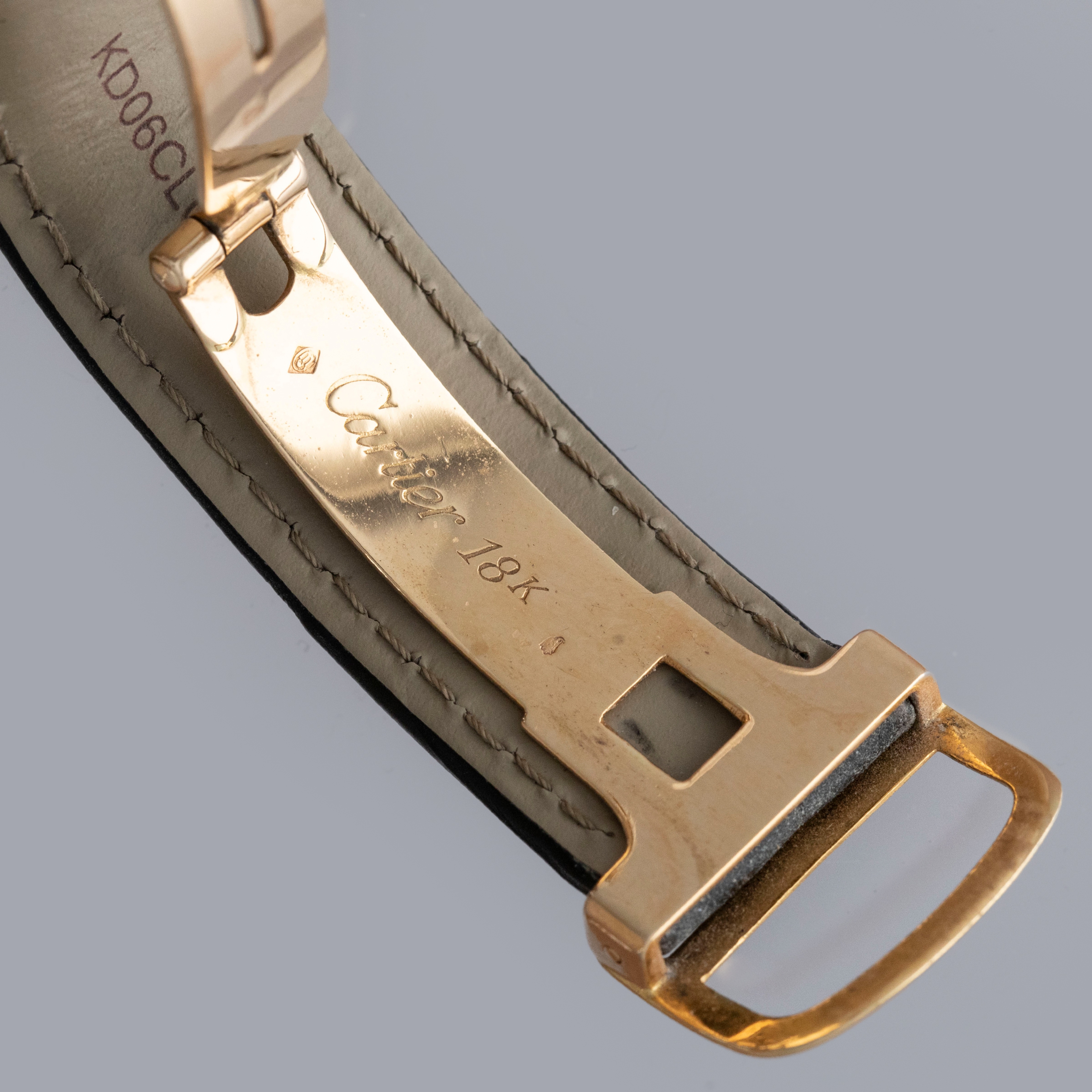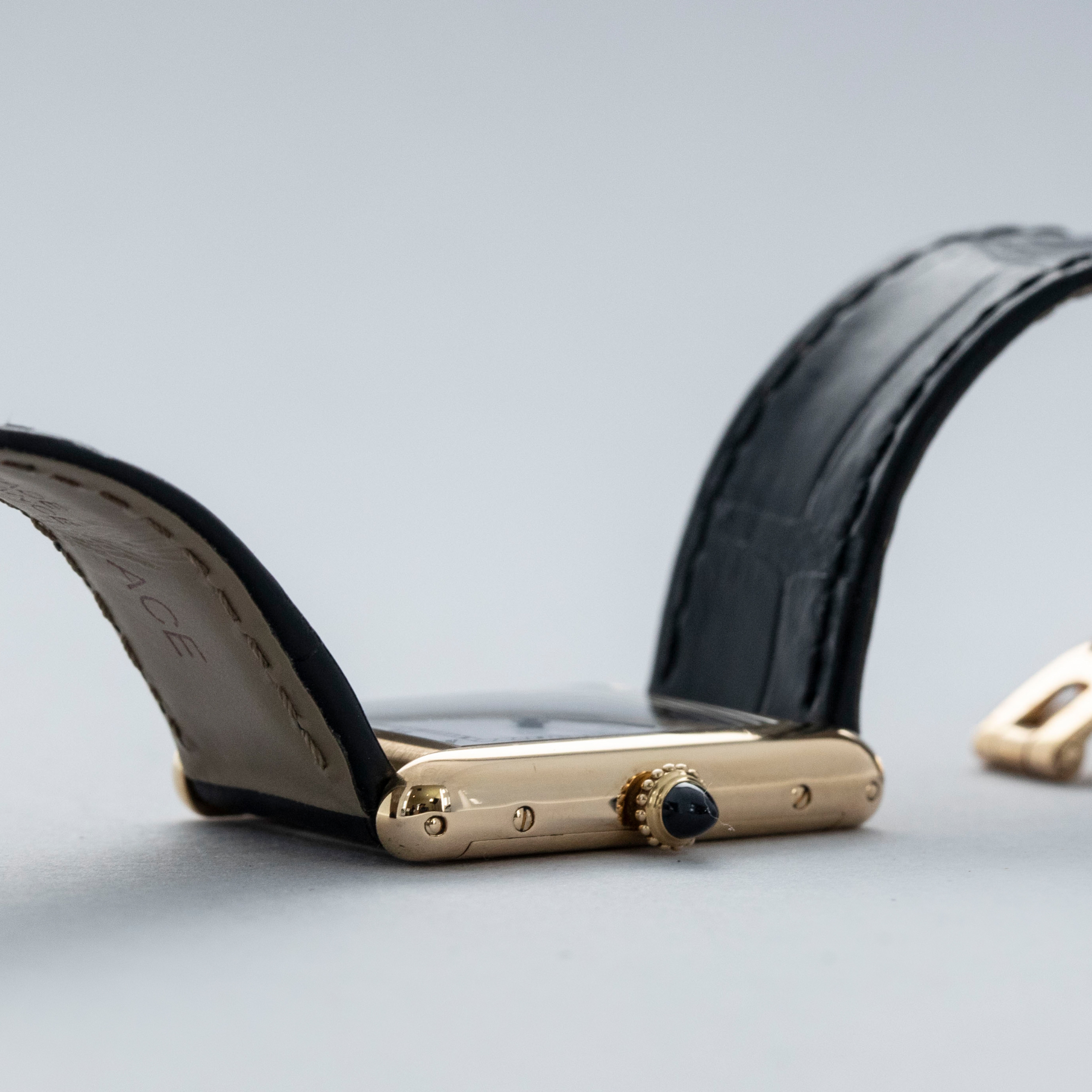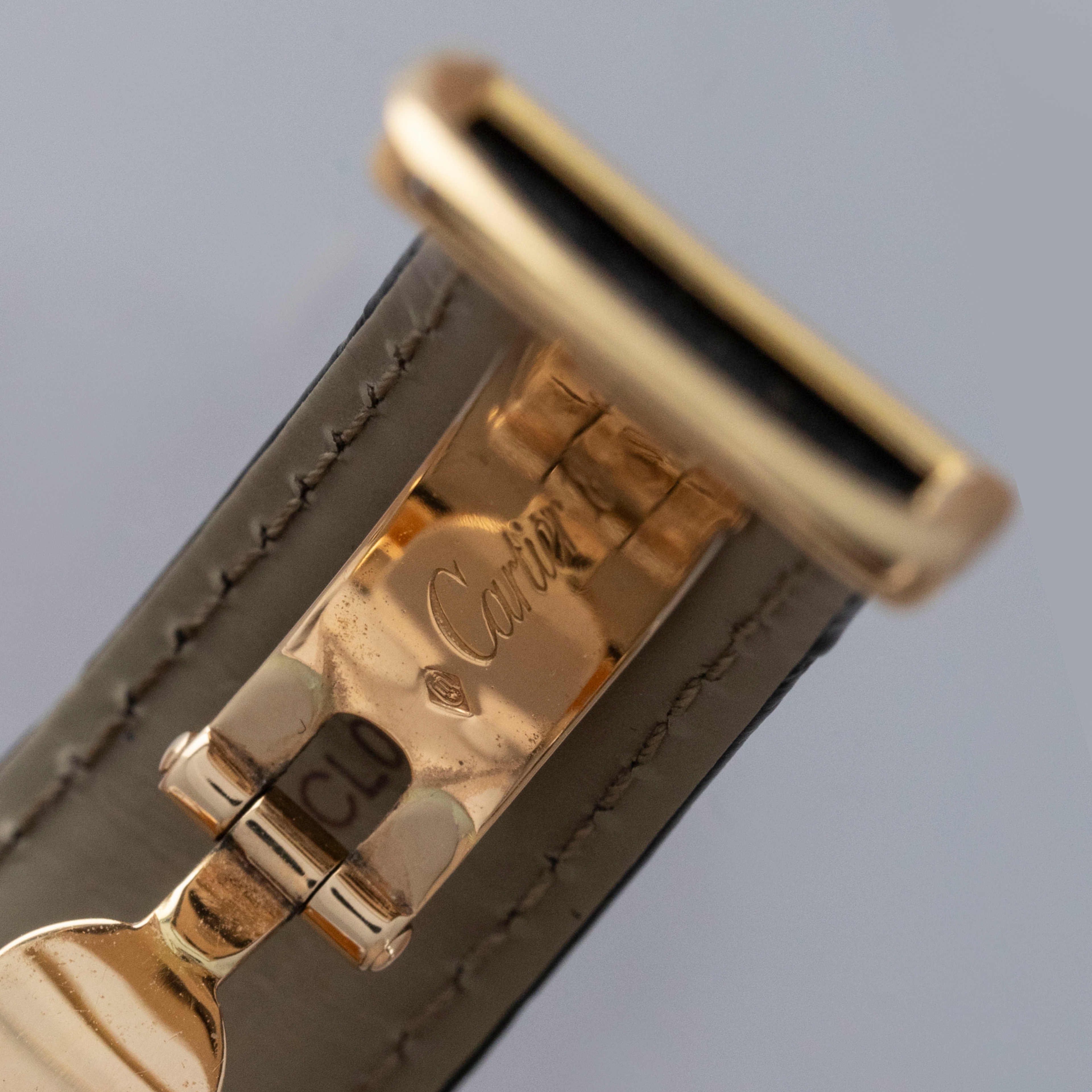 The watch is in overall excellent condition. It presents very well following a comprehensive service in 2022. The yellow gold case has some light marks, and the case back has crisp engravings and hallmarks with some light scratches. The screw heads for the strap bars show some wear. The dial and hands were replaced at service and appear as new. The cabochon crown has some light scuffs. The watch is fitted with a black alligator strap with a yellow gold Cartier deployant clasp in excellent condition. It comes with a Cartier pouch and service letter.