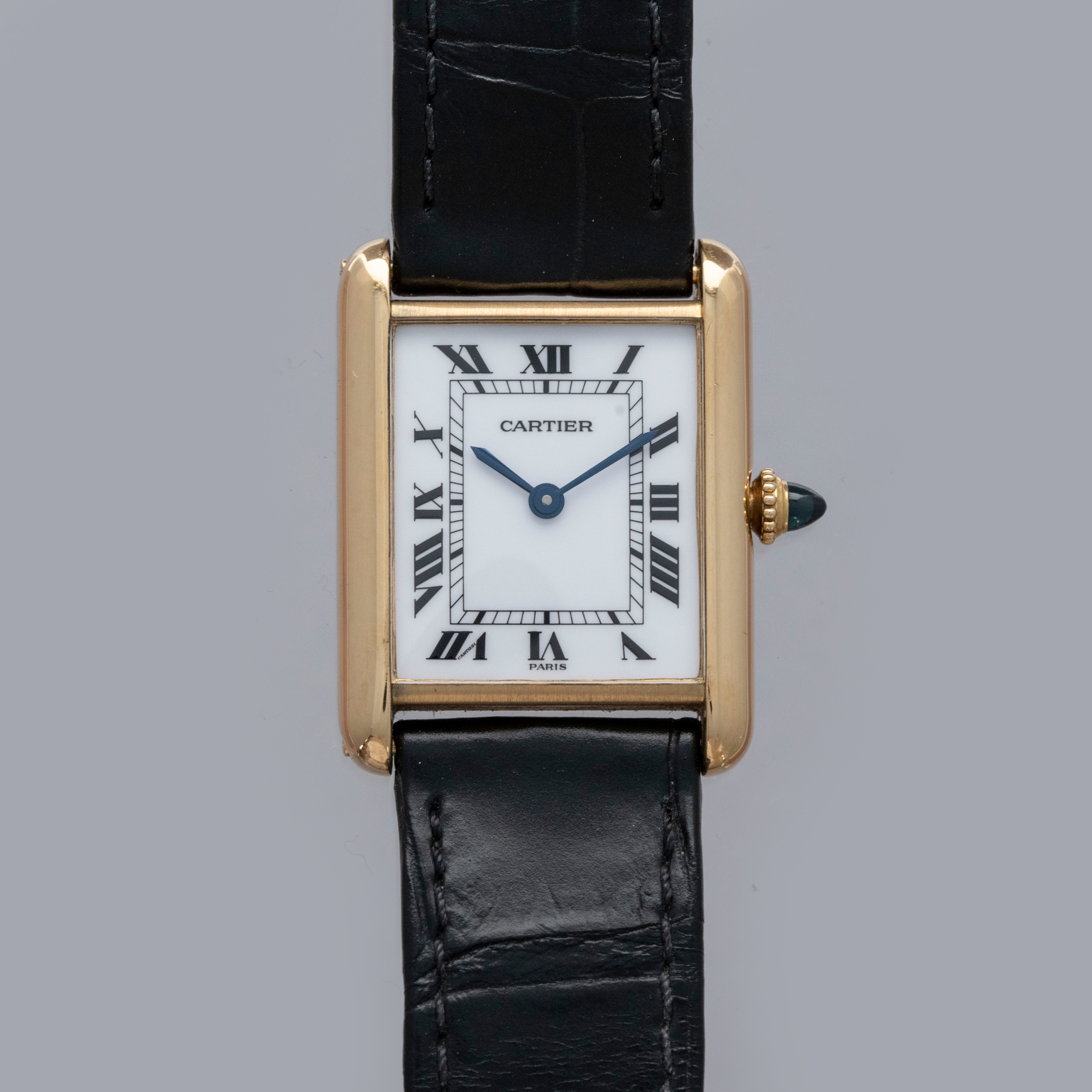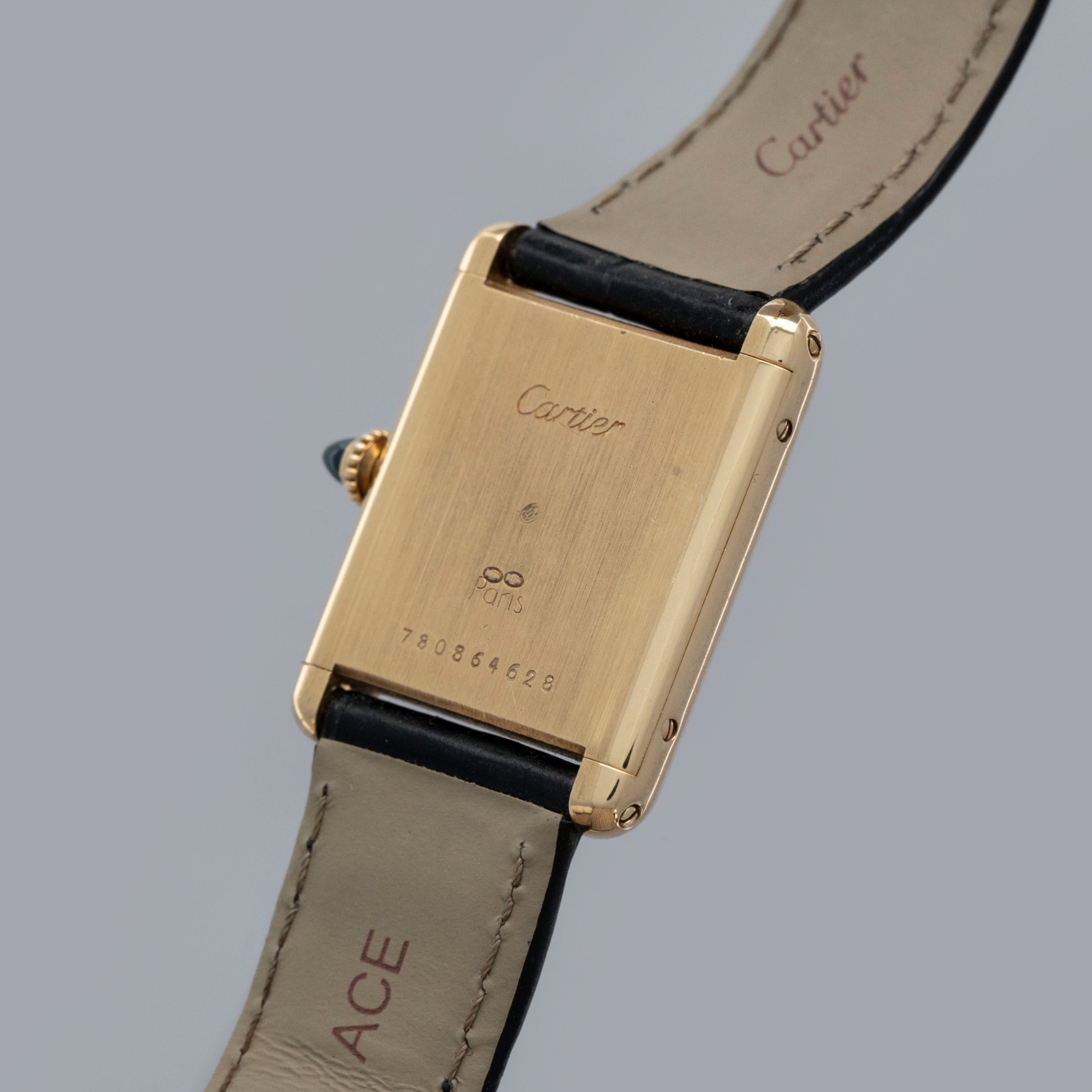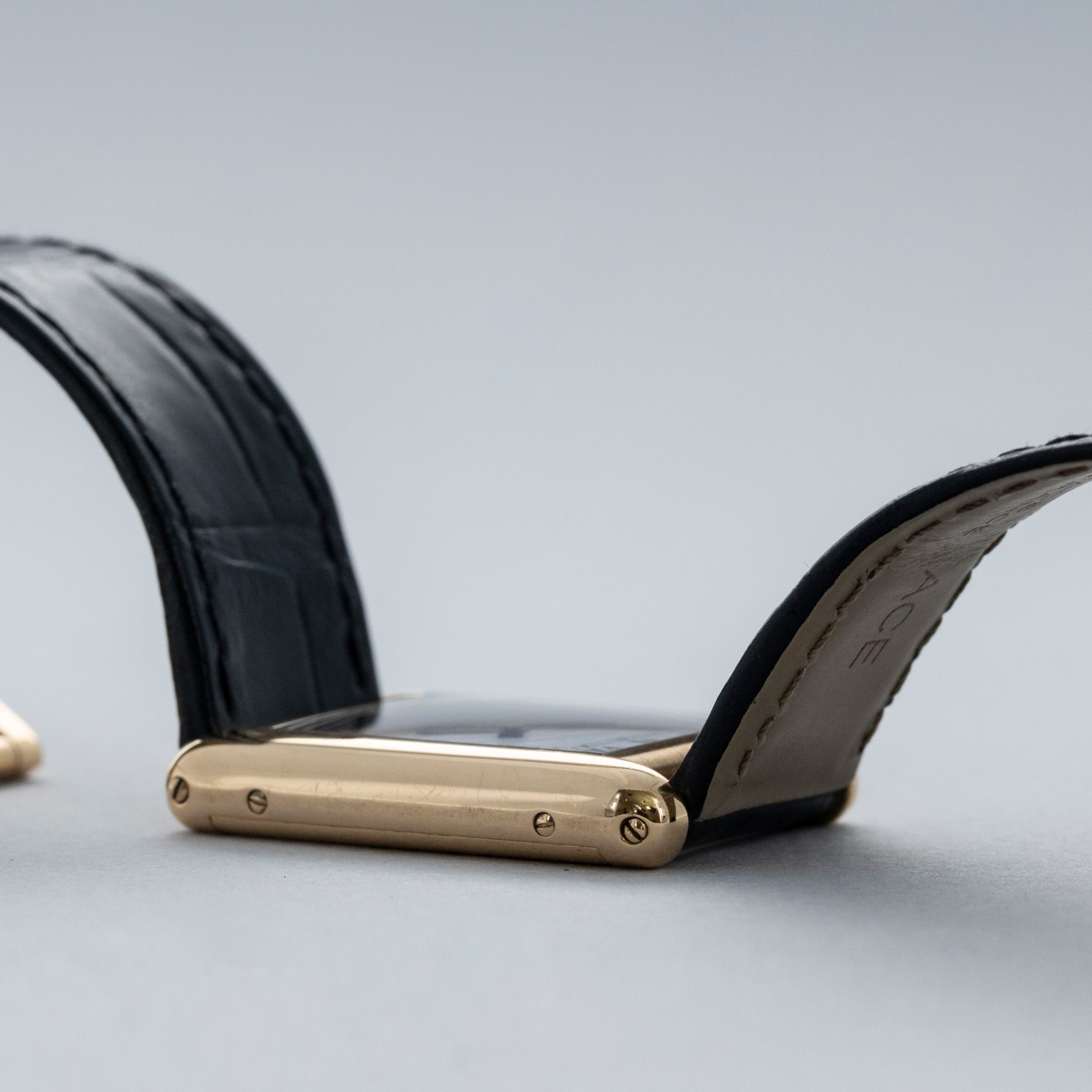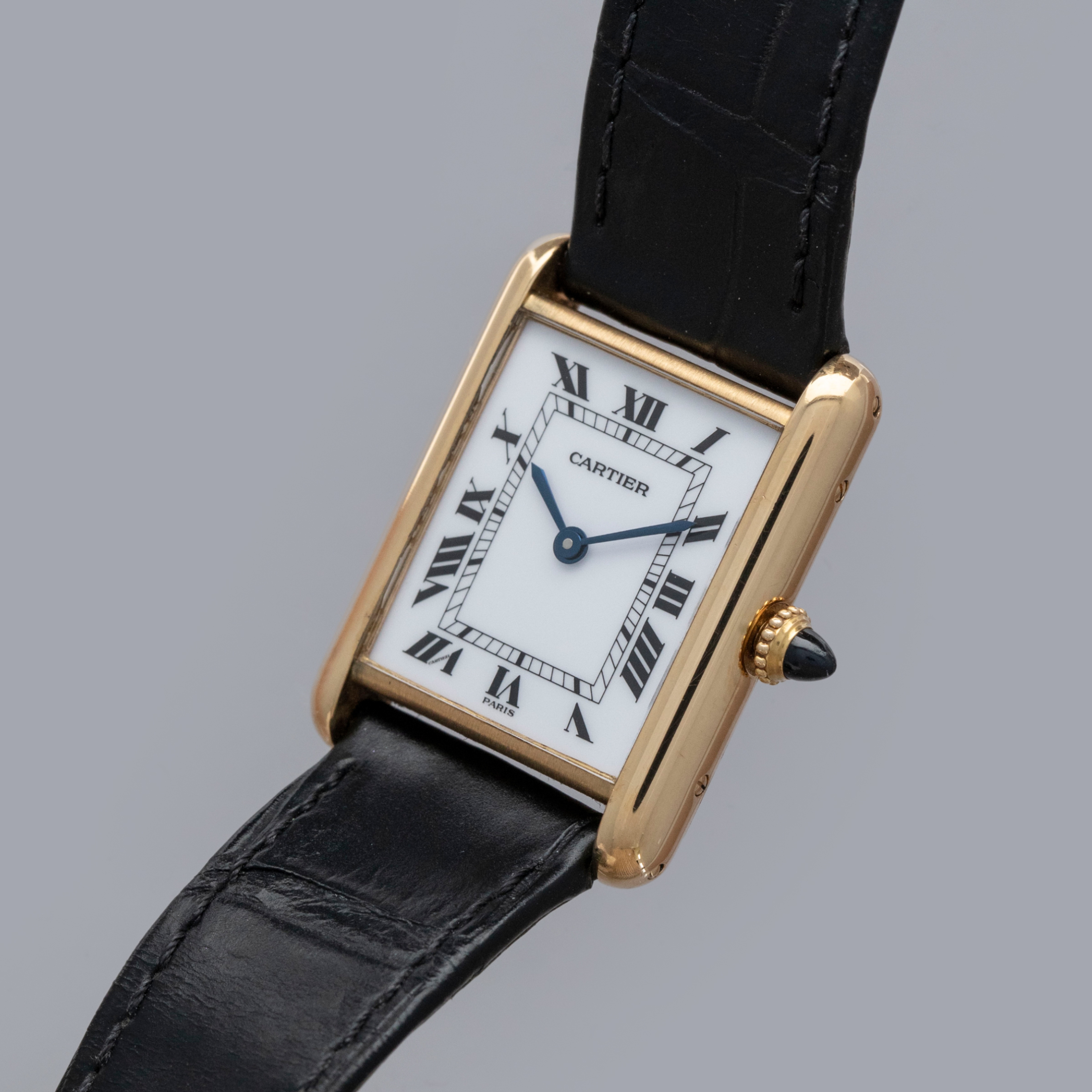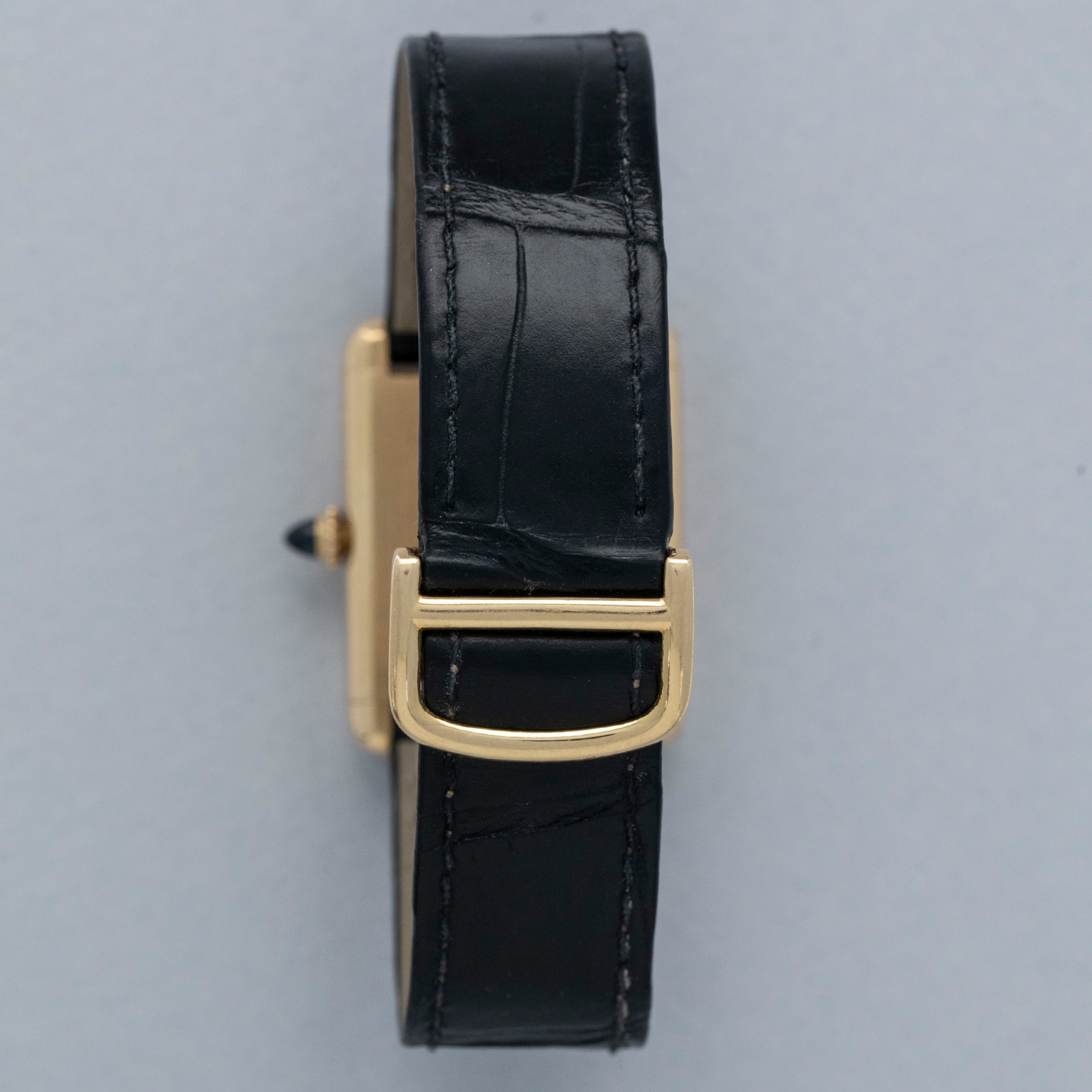 The watch is in overall excellent condition. It presents very well following a comprehensive service in 2022. The yellow gold case has some light marks, and the case back has crisp engravings and hallmarks with some light scratches. The screw heads for the strap bars show some wear. The dial and hands were replaced at service and appear as new. The cabochon crown has some light scuffs. The watch is fitted with a black alligator strap with a yellow gold Cartier deployant clasp in excellent condition. It comes with a Cartier pouch and service letter.