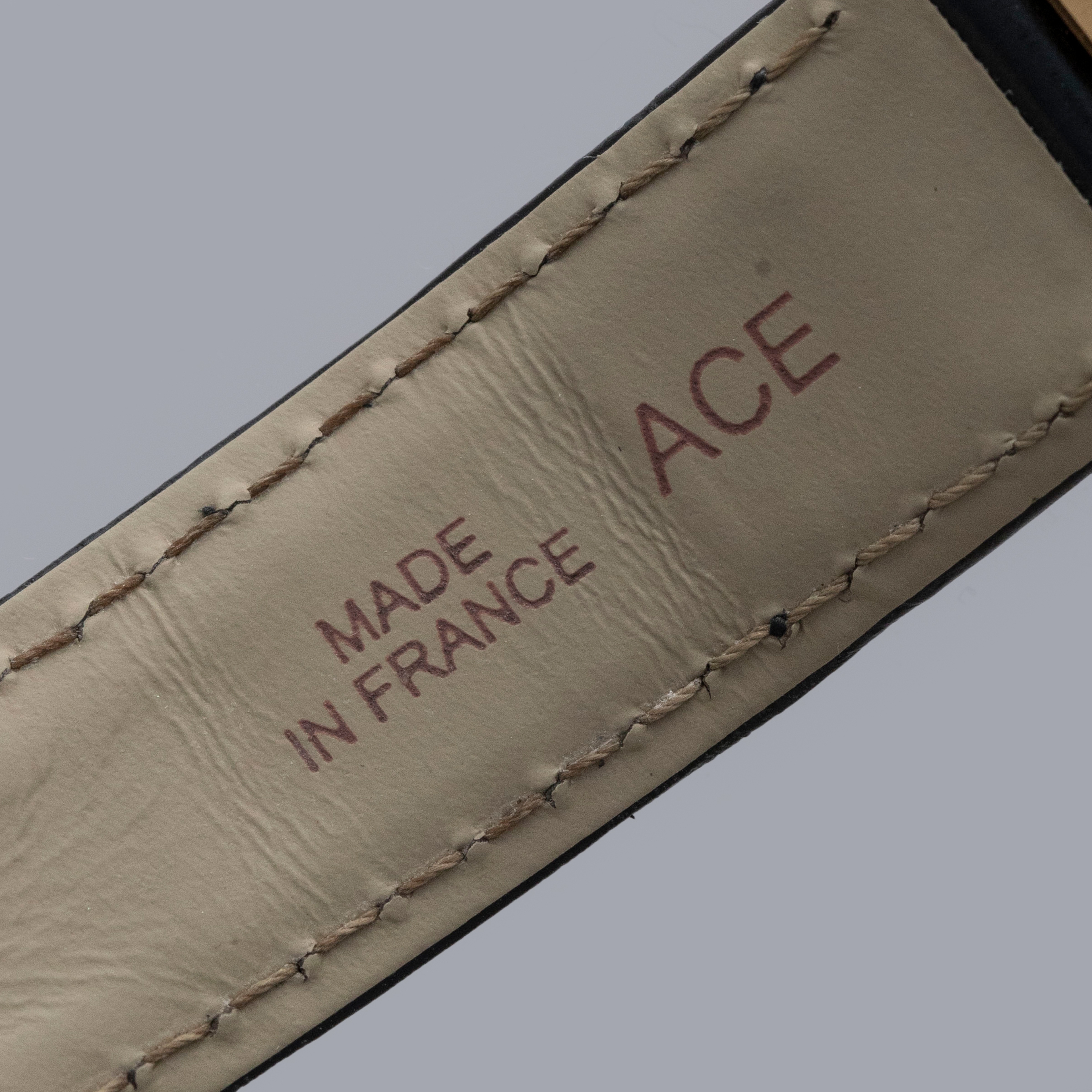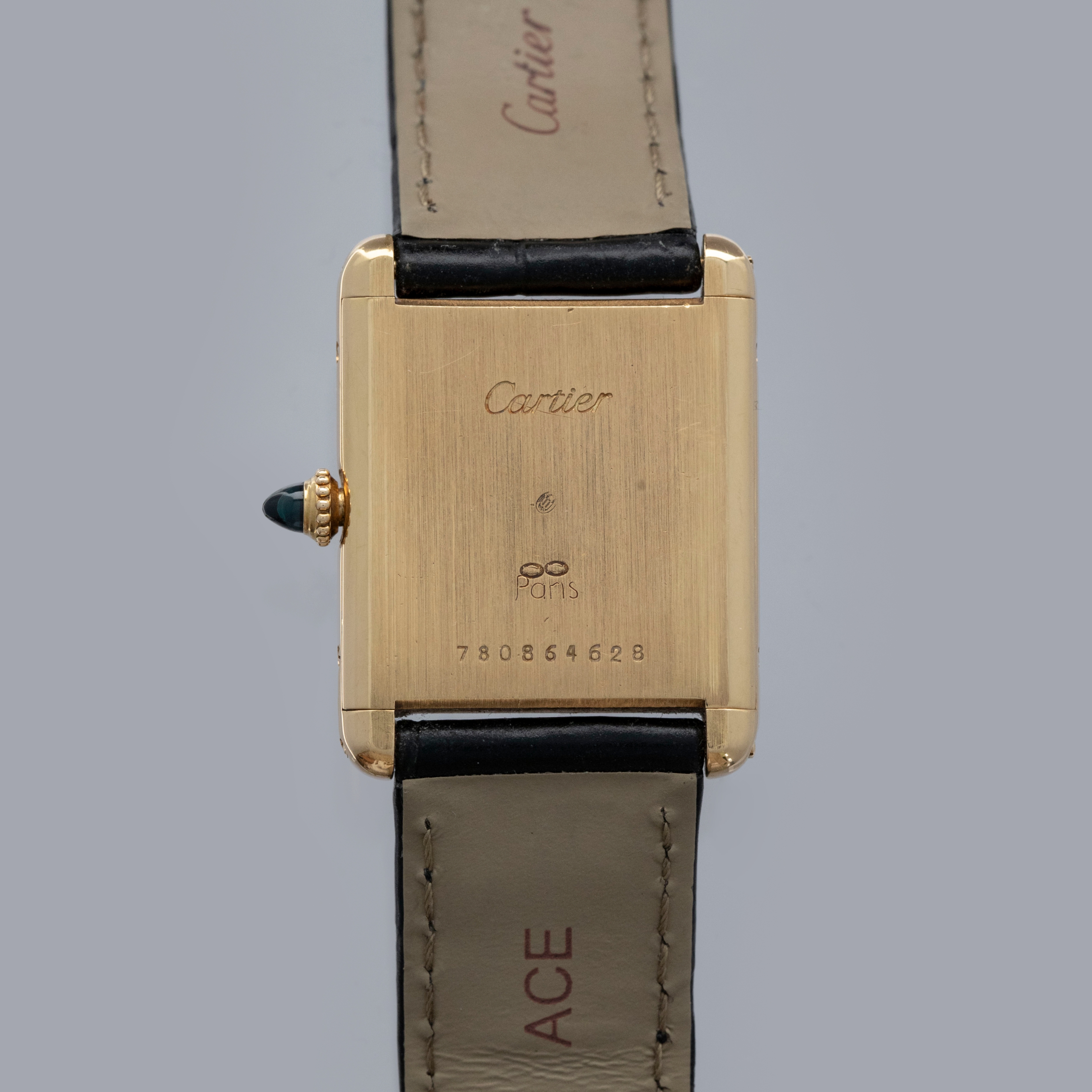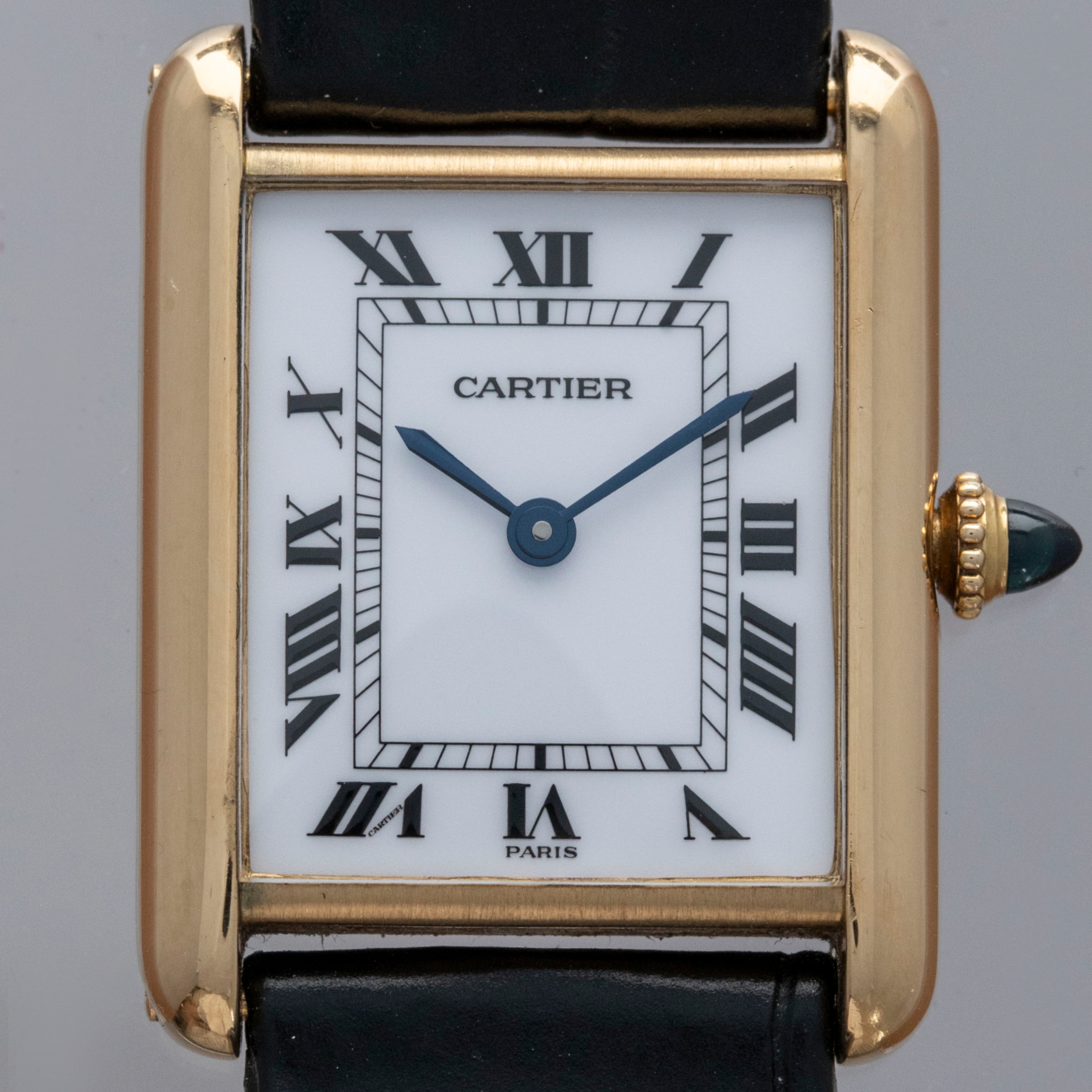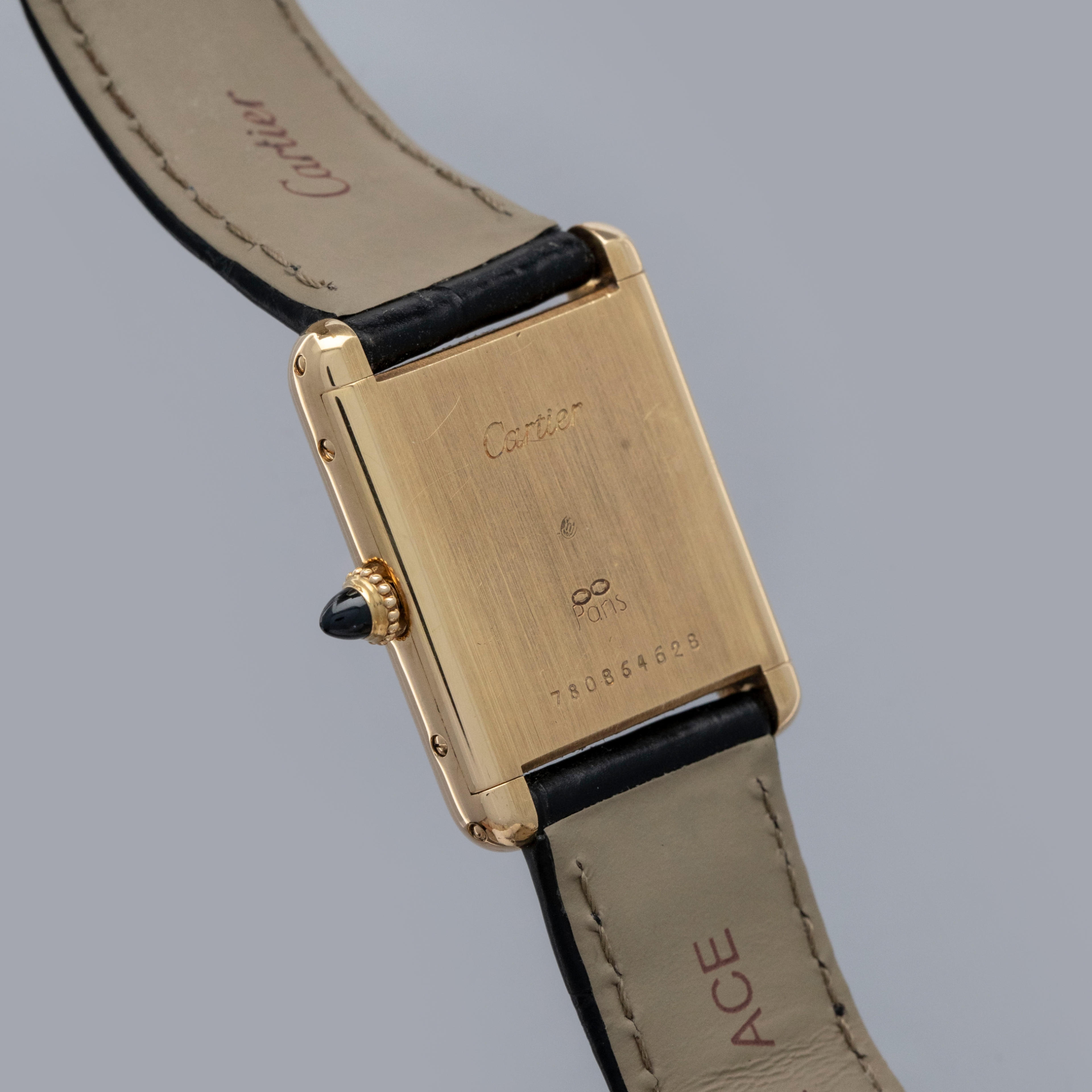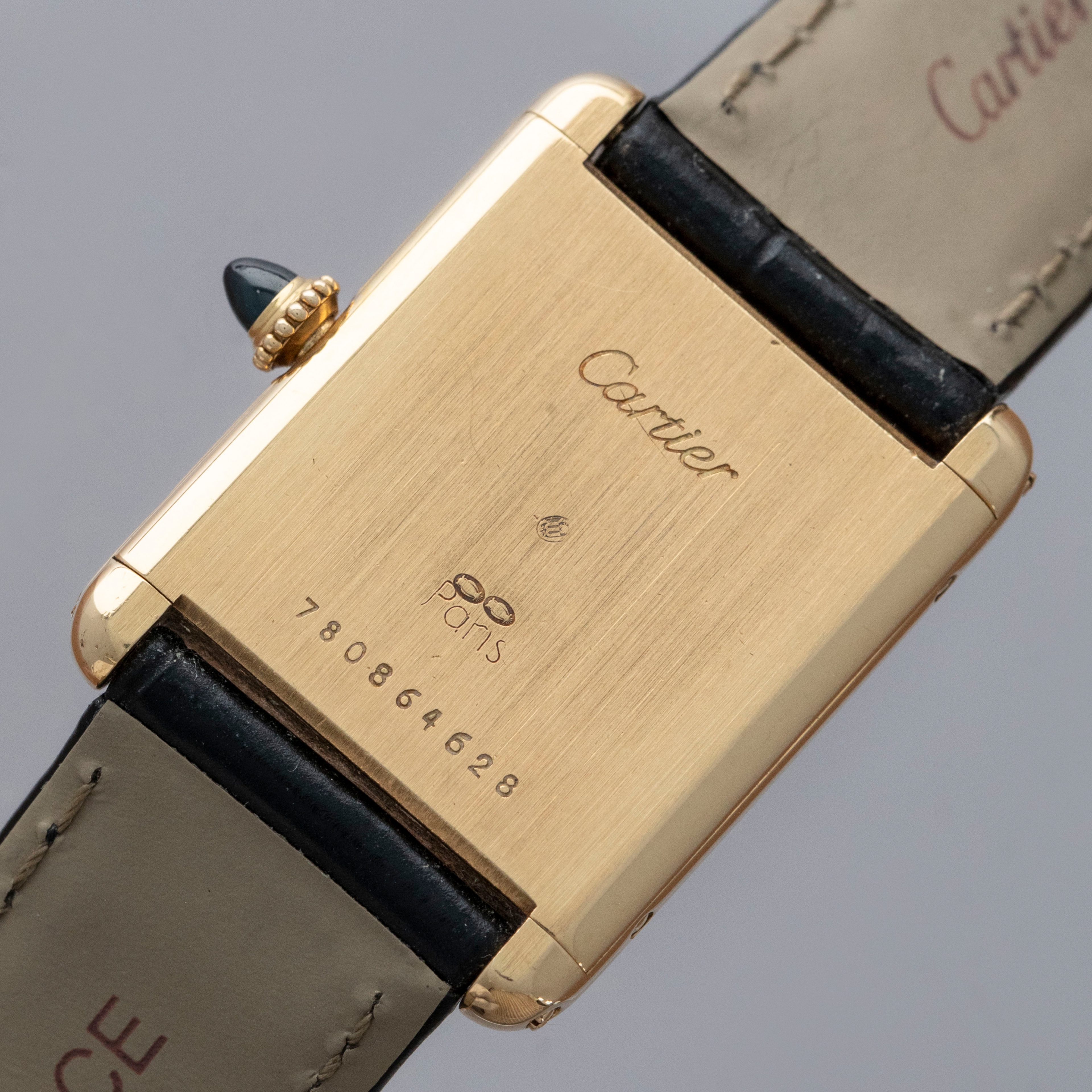 The watch is in overall excellent condition. It presents very well following a comprehensive service in 2022. The yellow gold case has some light marks, and the case back has crisp engravings and hallmarks with some light scratches. The screw heads for the strap bars show some wear. The dial and hands were replaced at service and appear as new. The cabochon crown has some light scuffs. The watch is fitted with a black alligator strap with a yellow gold Cartier deployant clasp in excellent condition. It comes with a Cartier pouch and service letter.