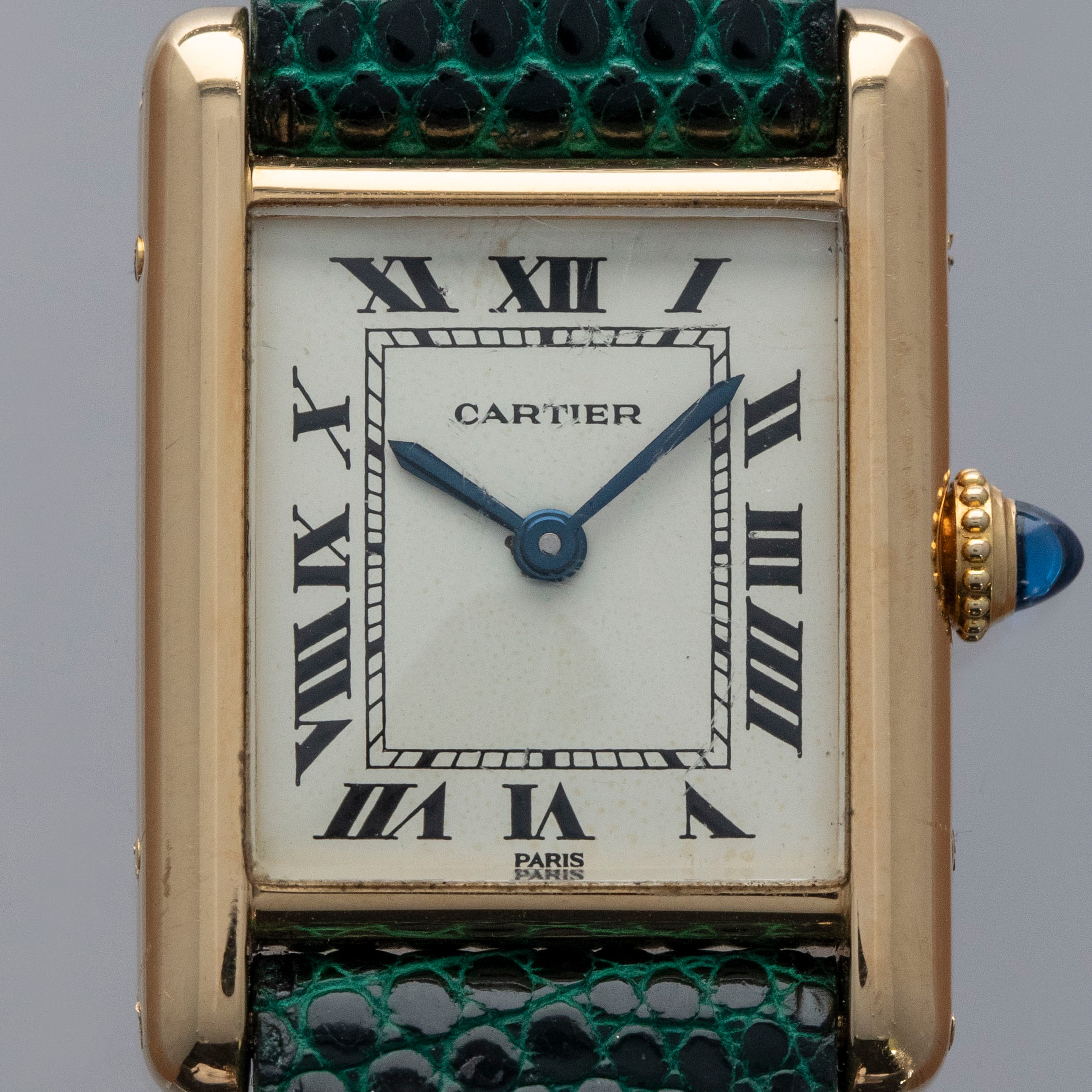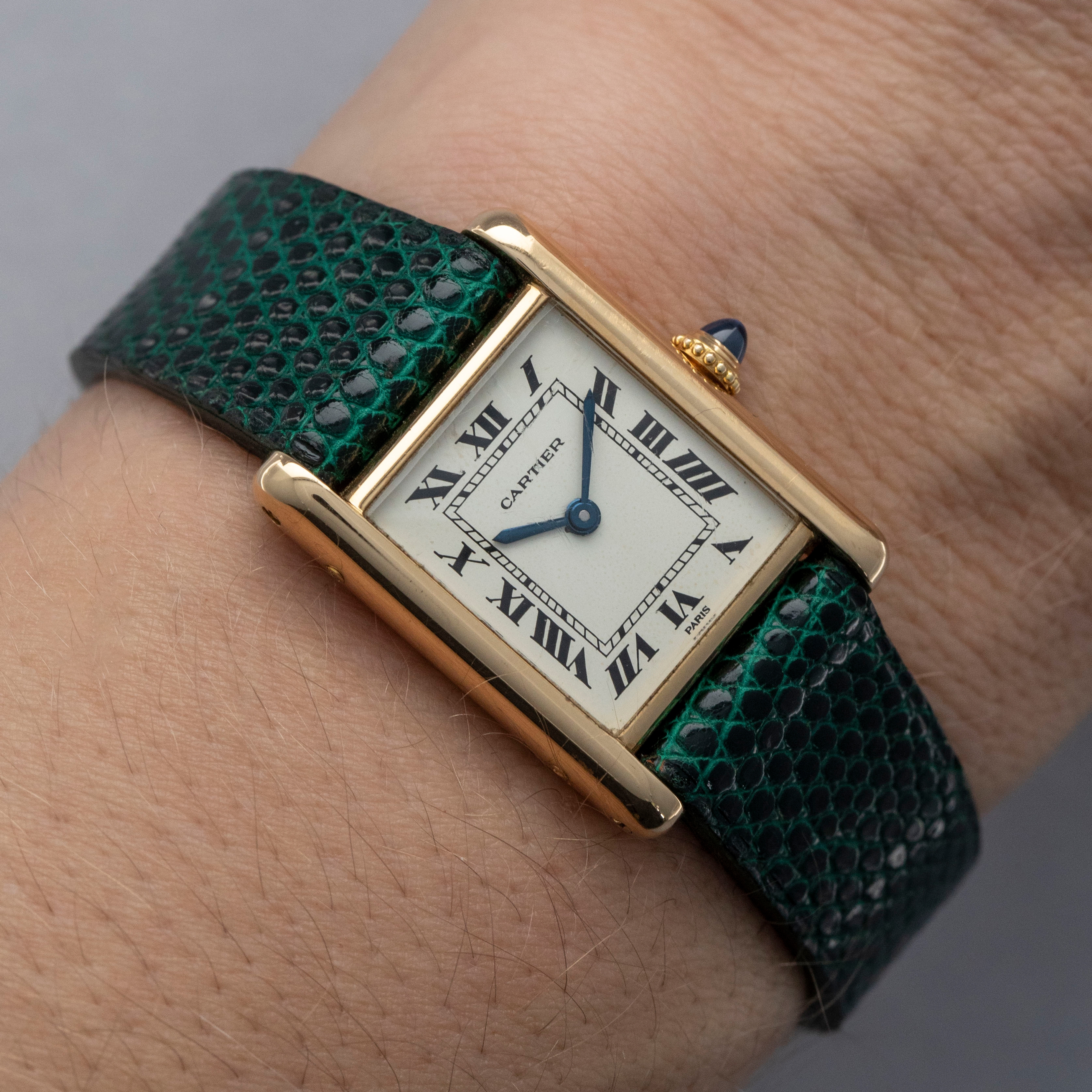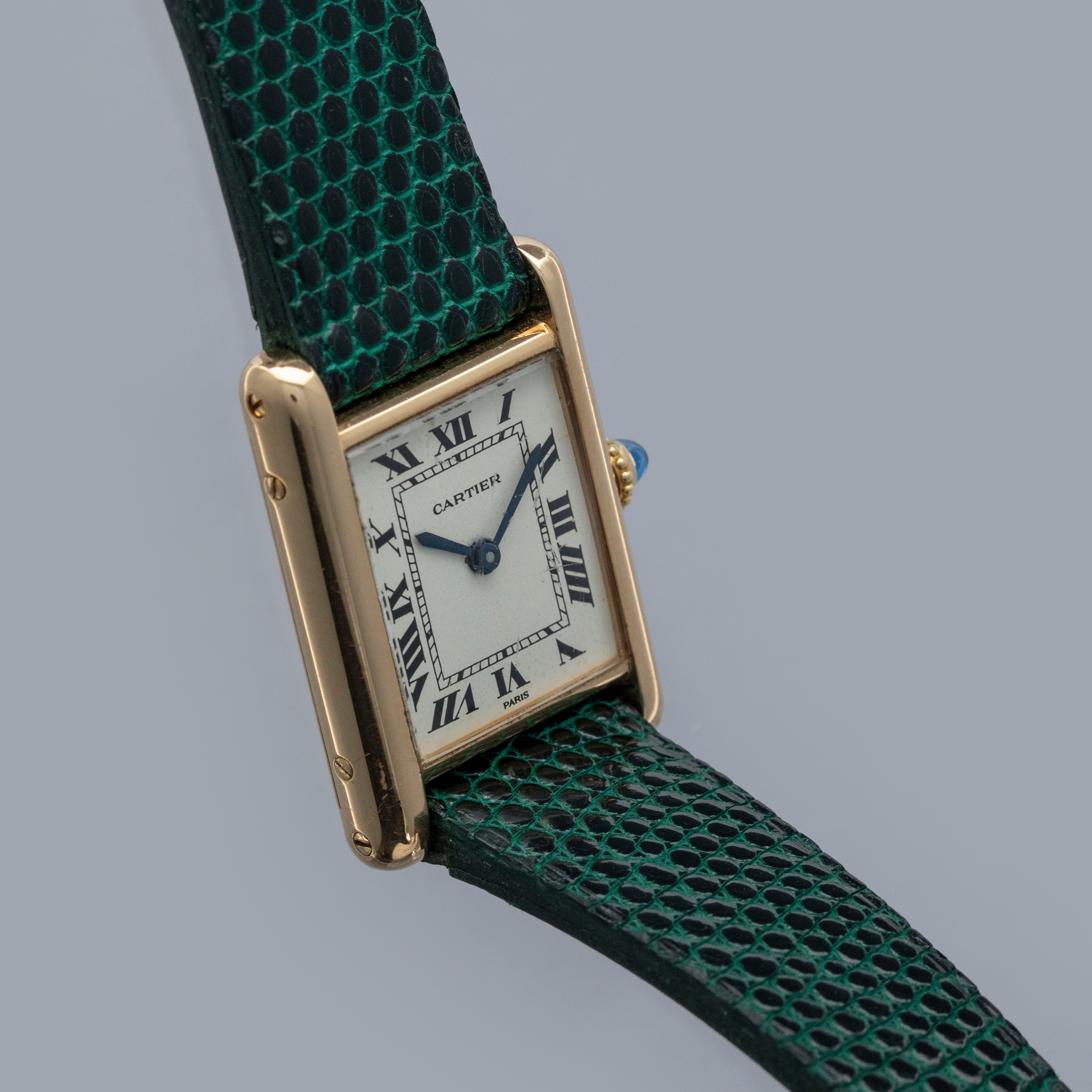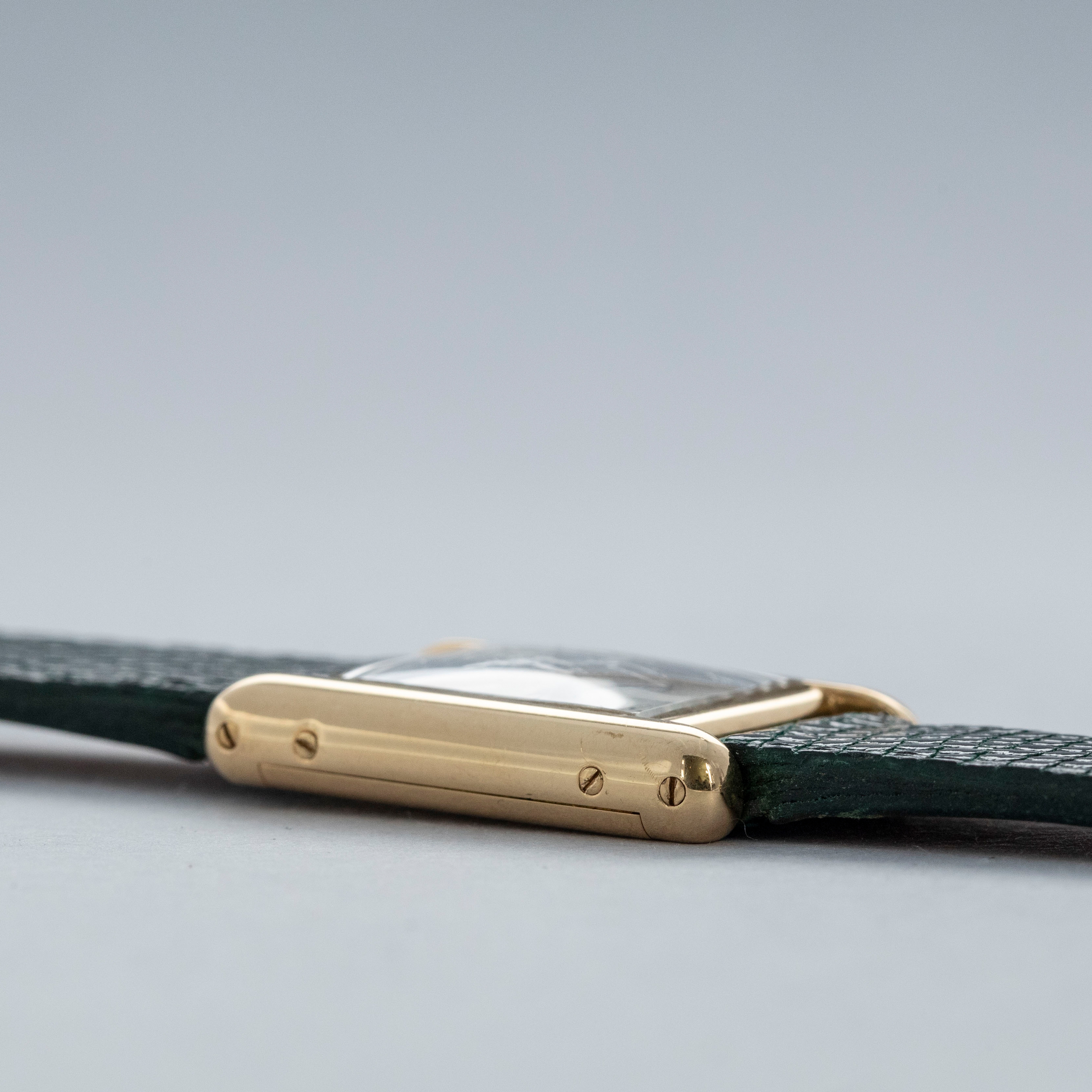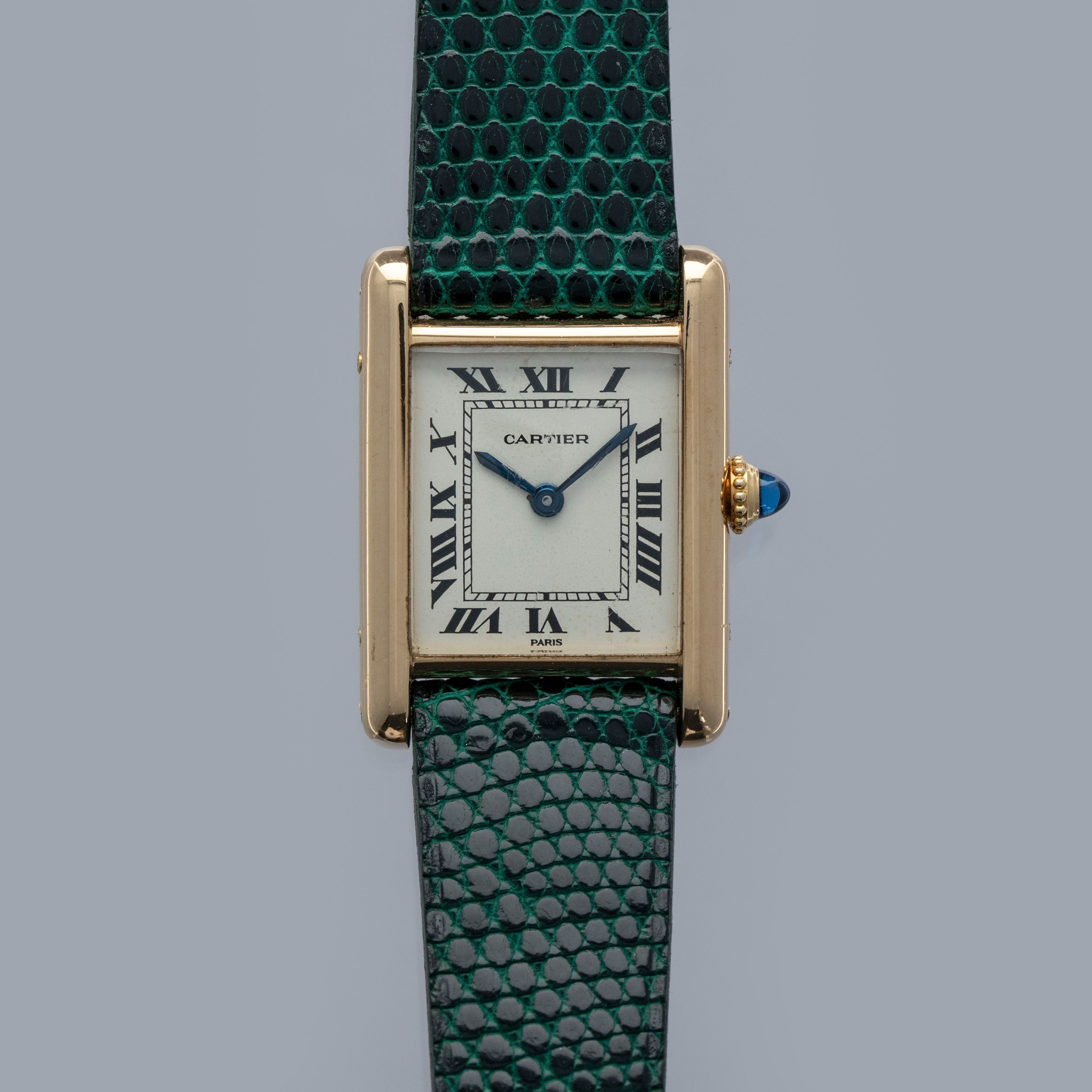 Watch is in overall excellent condition. The yellow gold case shows surface scratches and scuffs consistent with age, while the screws on the case sides display some signs of wear. The case back retains legible engravings and a clear hallmark. The dial shows some surface marks, and the blued hands exhibit light oxidation. The crystal has a number of surface scratches. It is fitted with a new green lizard strap and a Cartier deployant clasp, both remaining in excellent condition.