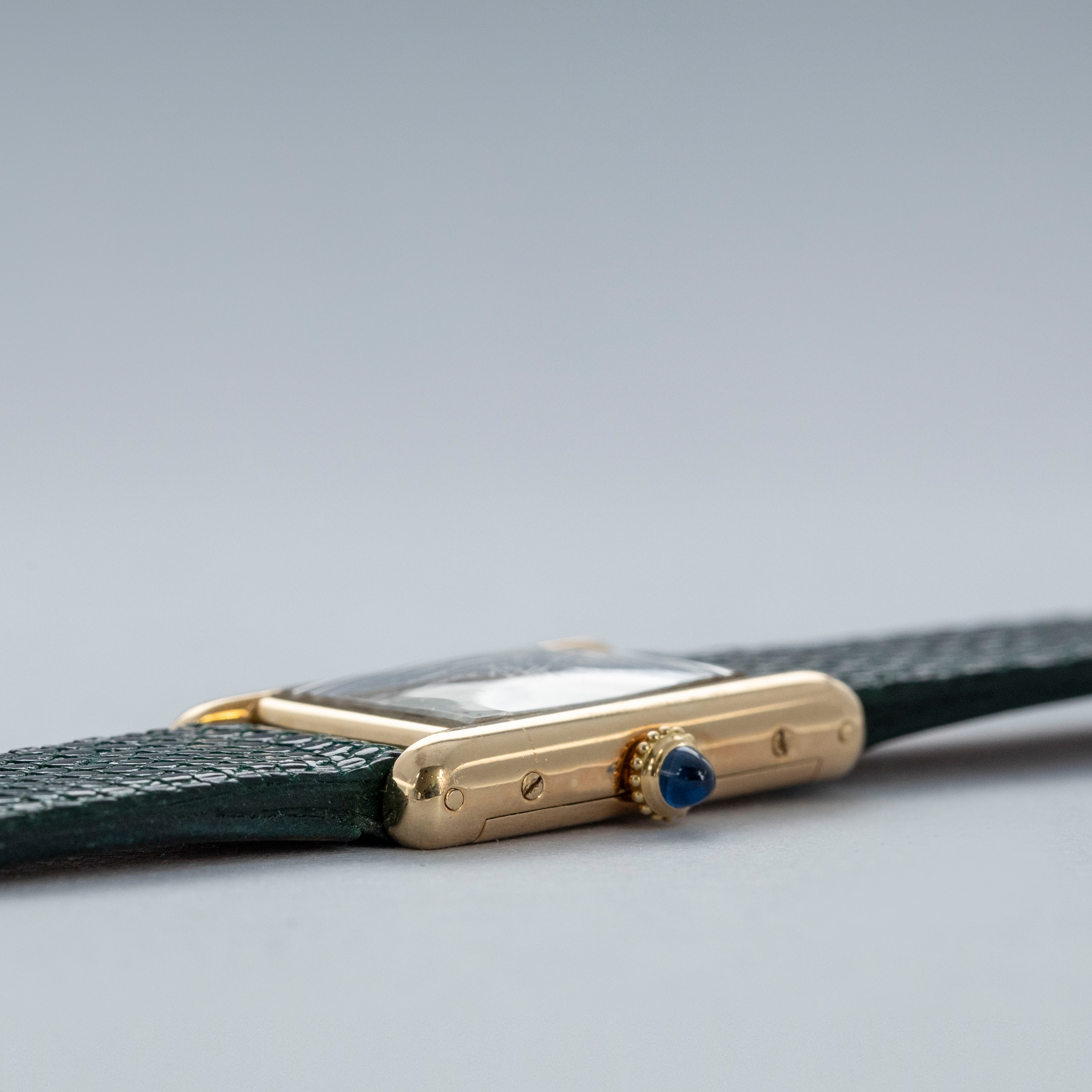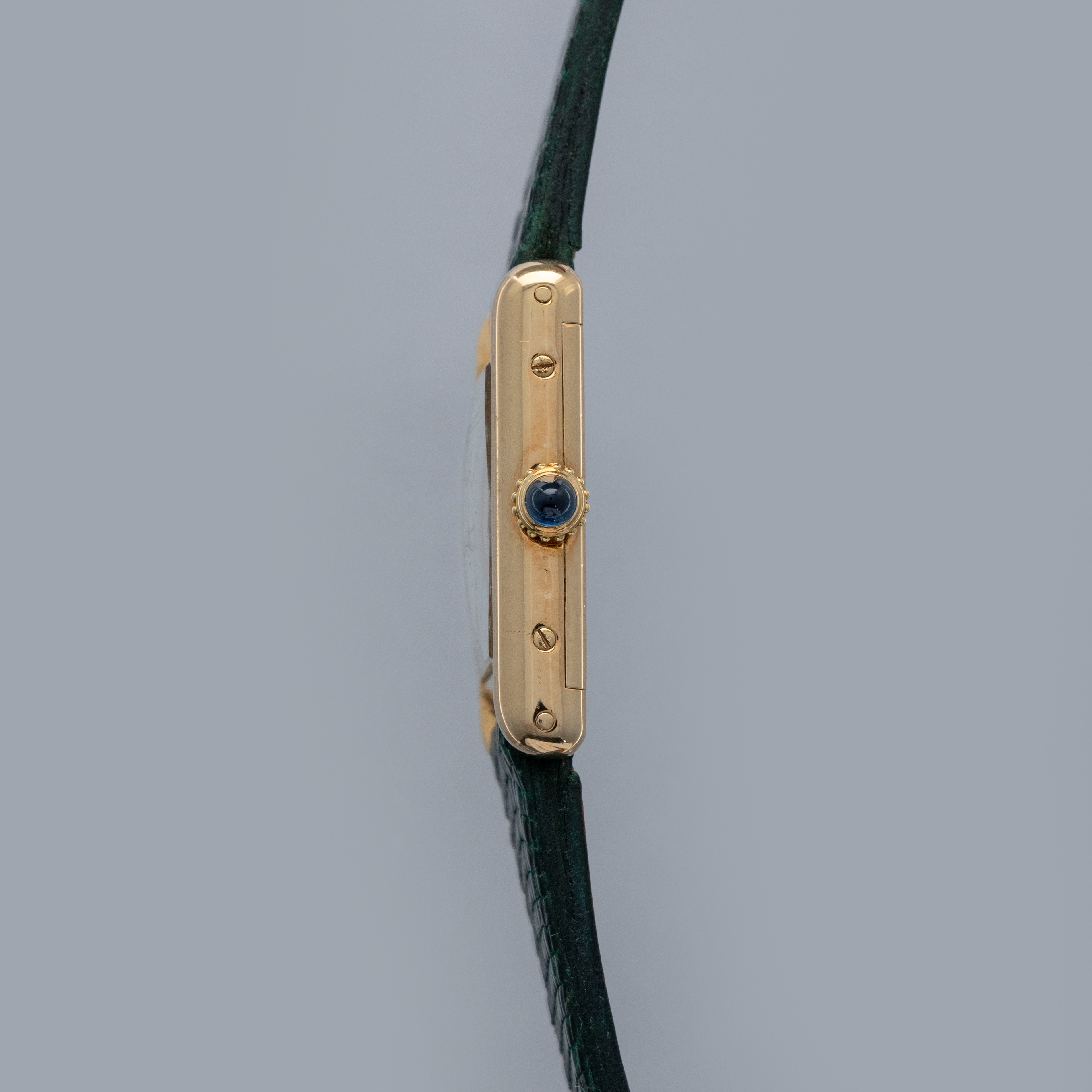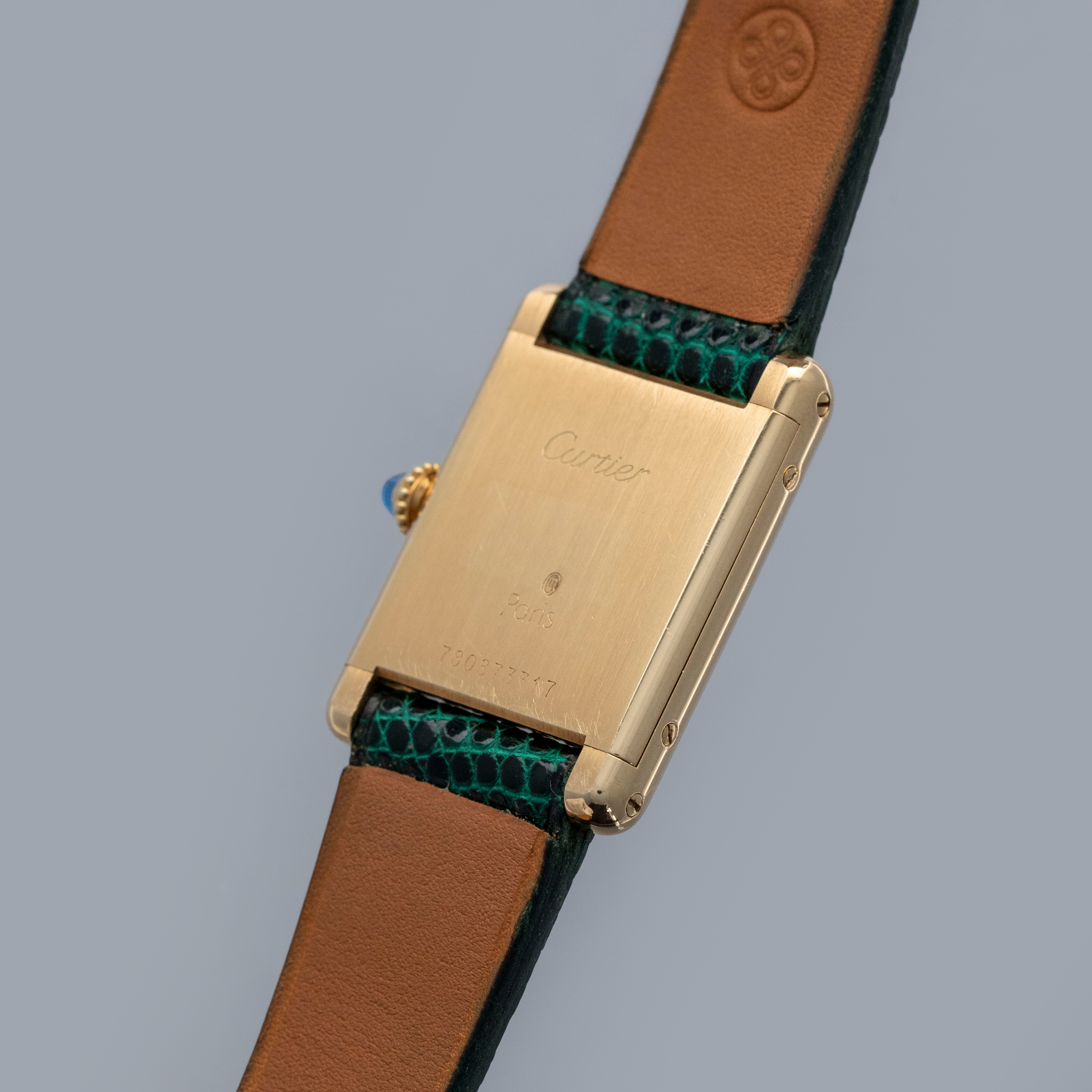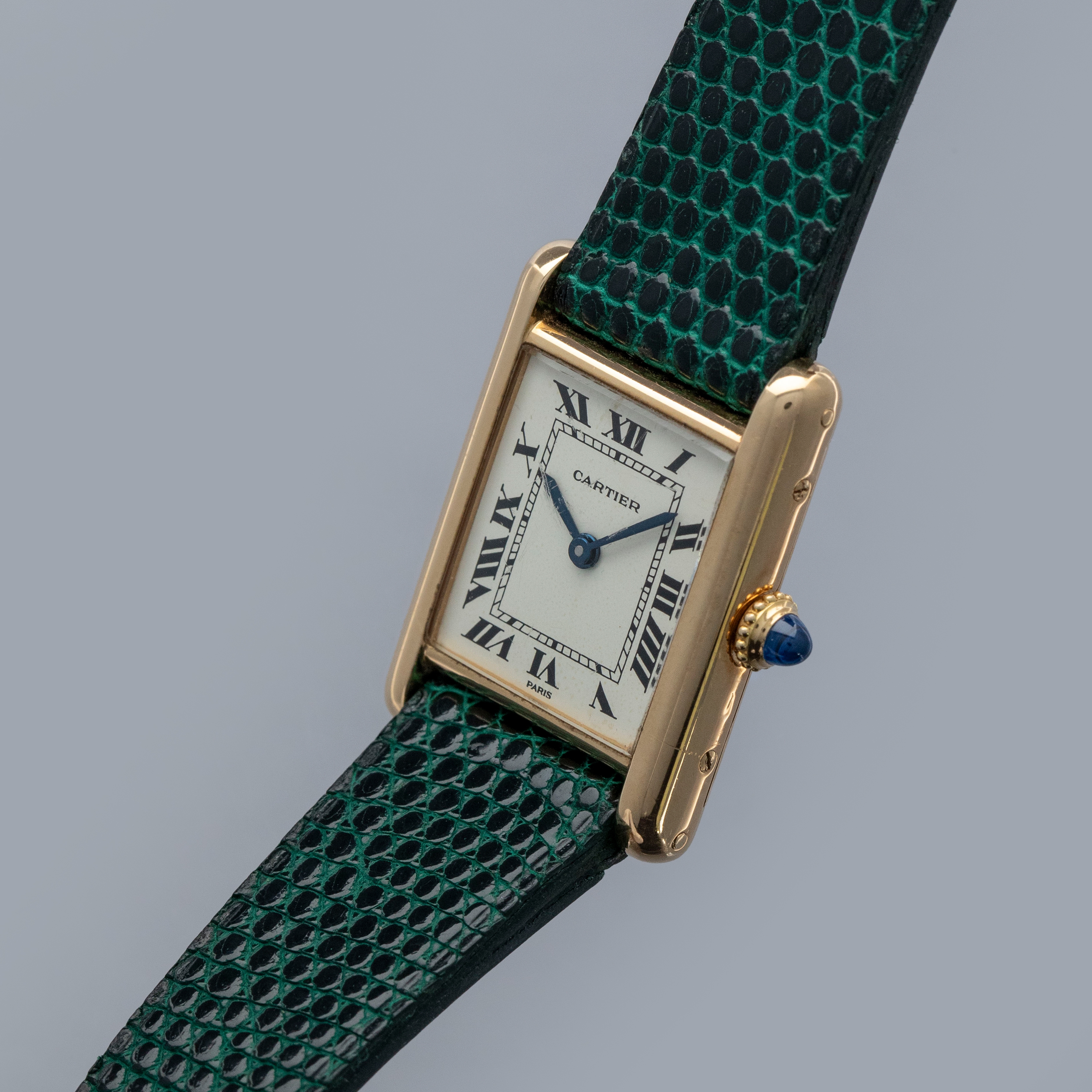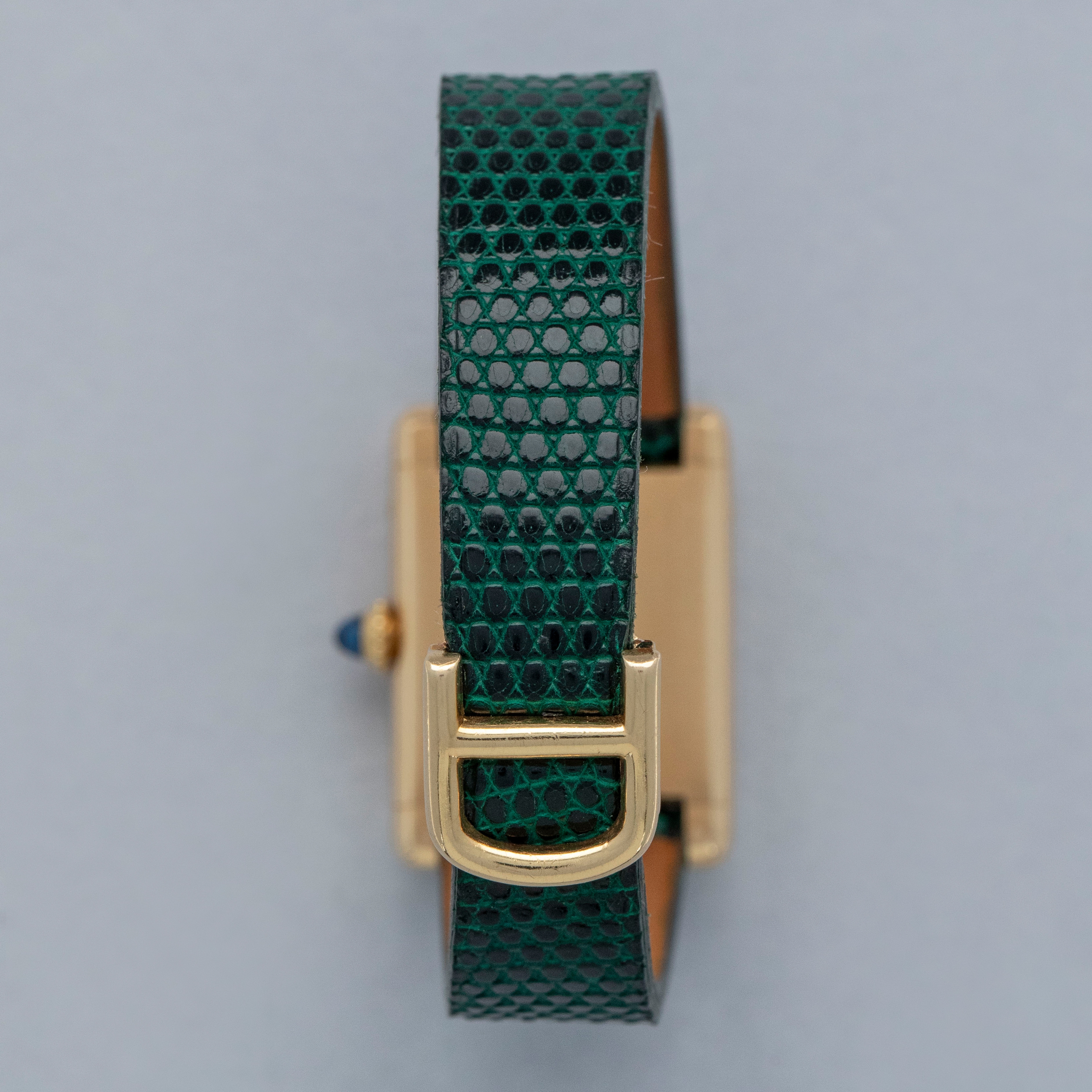 Watch is in overall excellent condition. The yellow gold case shows surface scratches and scuffs consistent with age, while the screws on the case sides display some signs of wear. The case back retains legible engravings and a clear hallmark. The dial shows some surface marks, and the blued hands exhibit light oxidation. The crystal has a number of surface scratches. It is fitted with a new green lizard strap and a Cartier deployant clasp, both remaining in excellent condition.