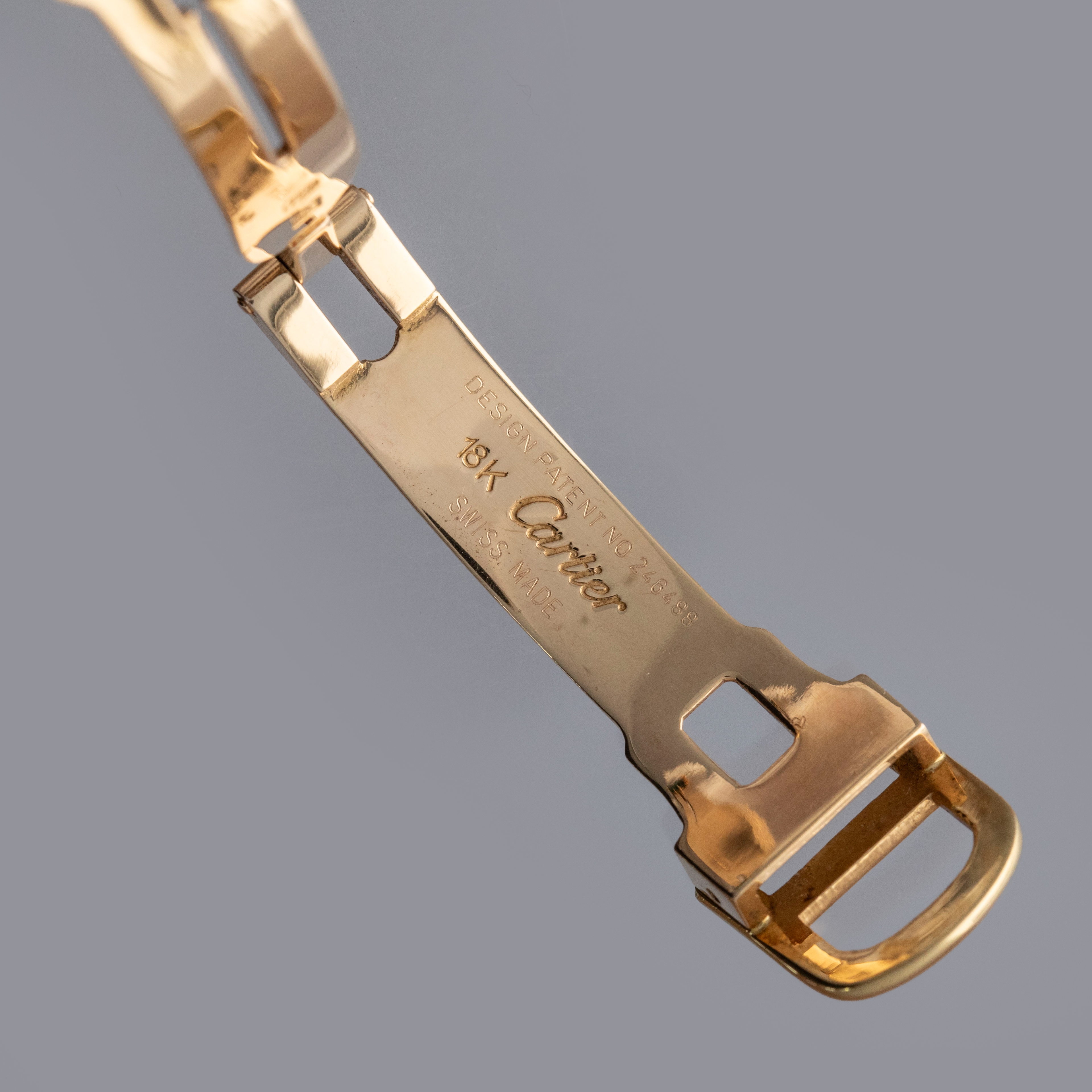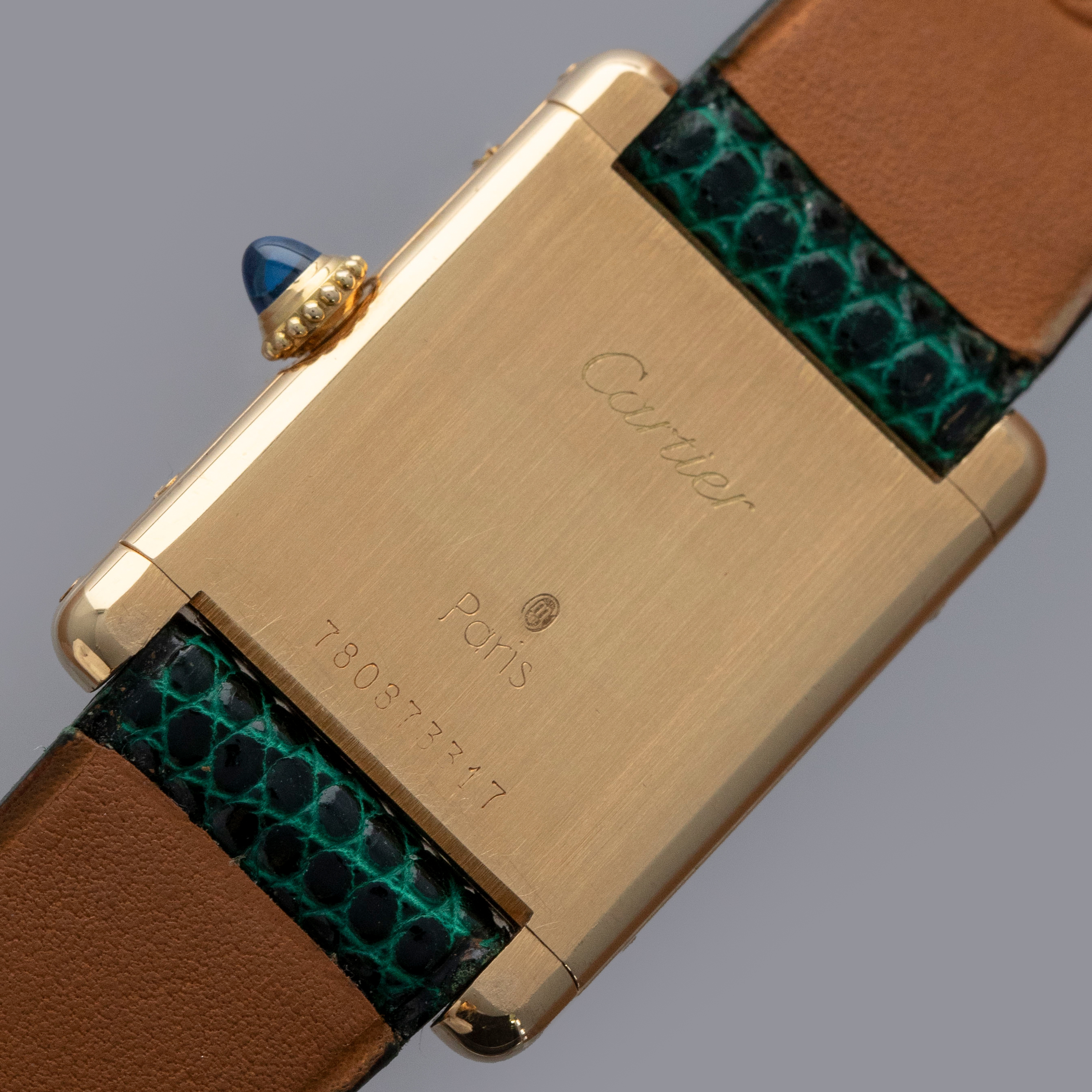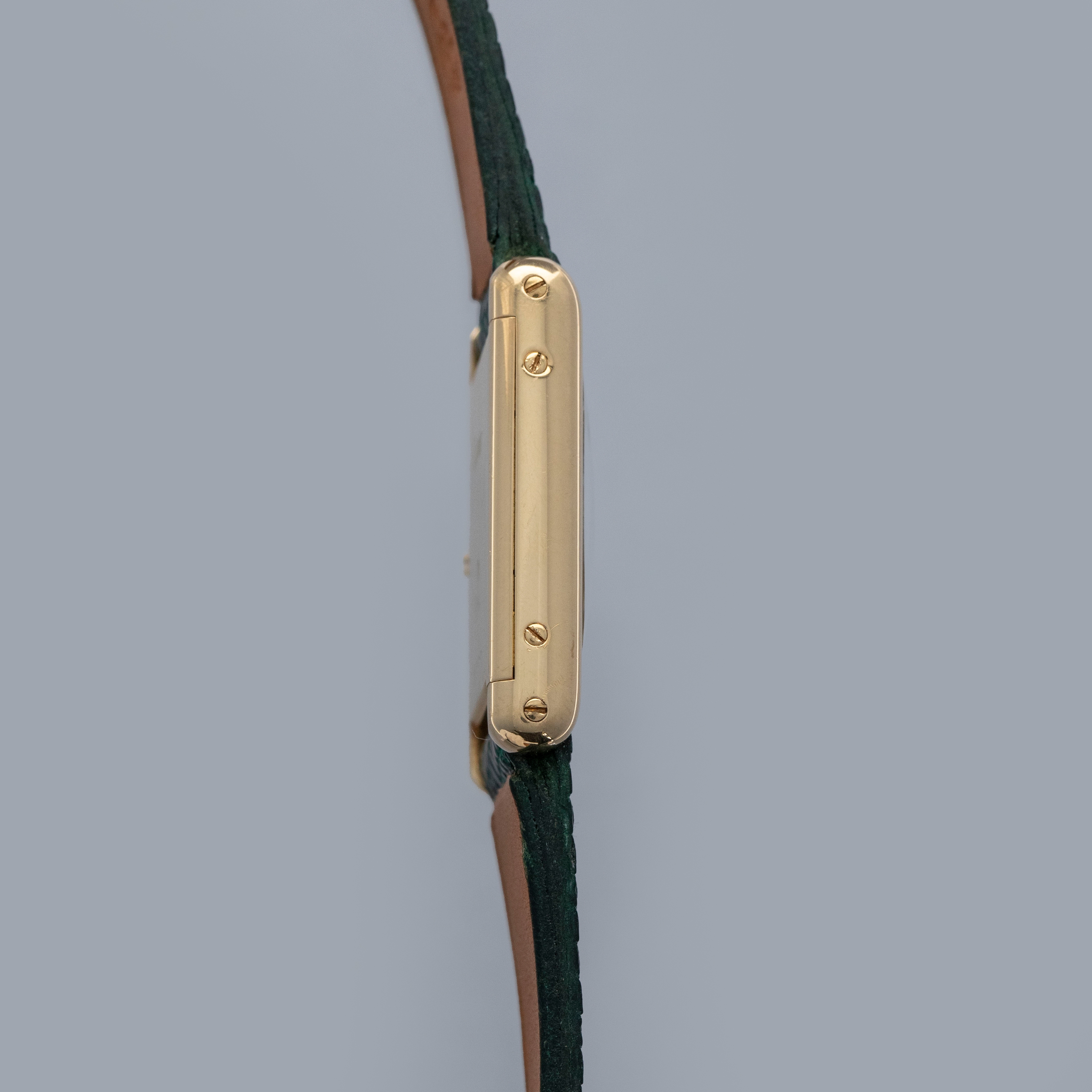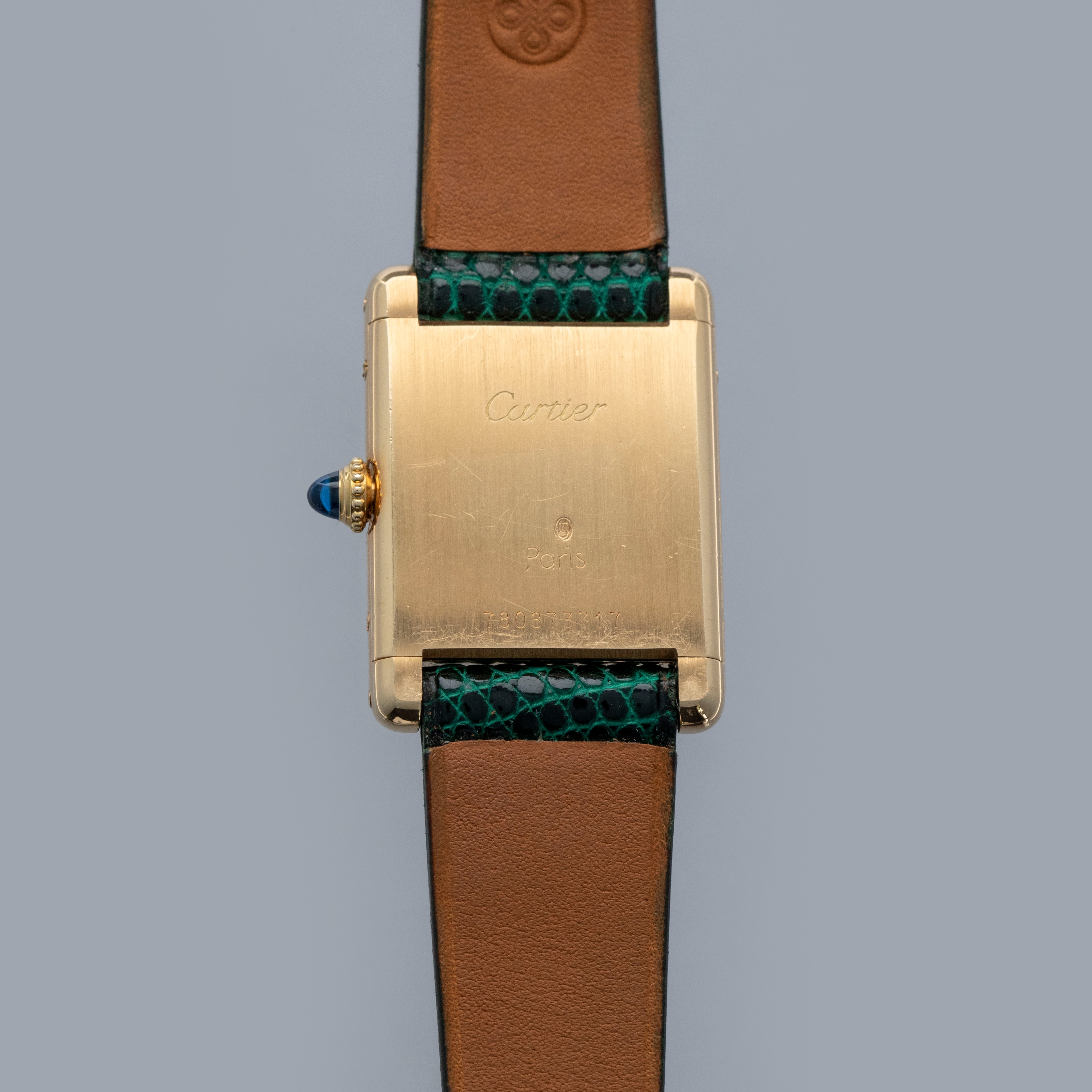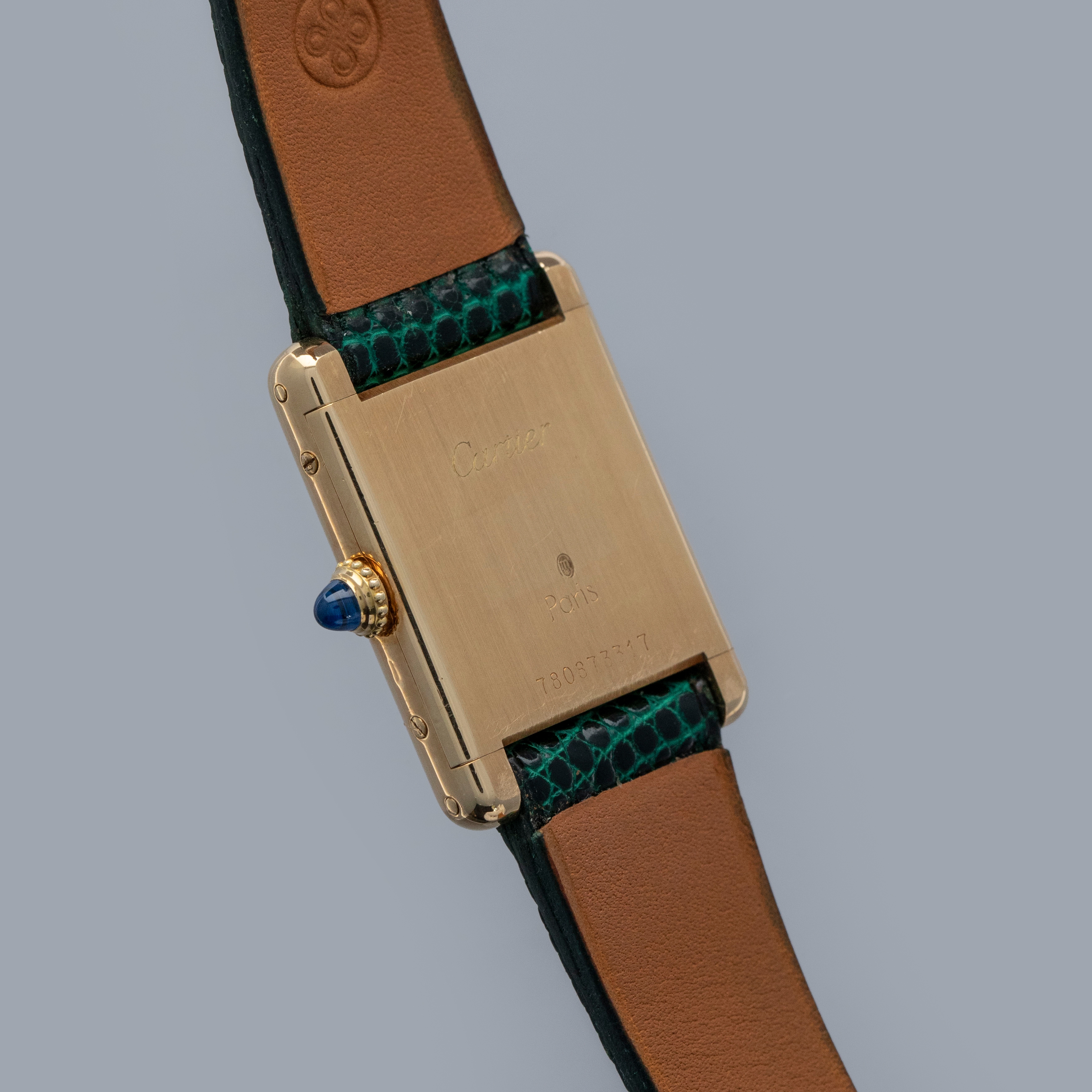 Watch is in overall excellent condition. The yellow gold case shows surface scratches and scuffs consistent with age, while the screws on the case sides display some signs of wear. The case back retains legible engravings and a clear hallmark. The dial shows some surface marks, and the blued hands exhibit light oxidation. The crystal has a number of surface scratches. It is fitted with a new green lizard strap and a Cartier deployant clasp, both remaining in excellent condition.